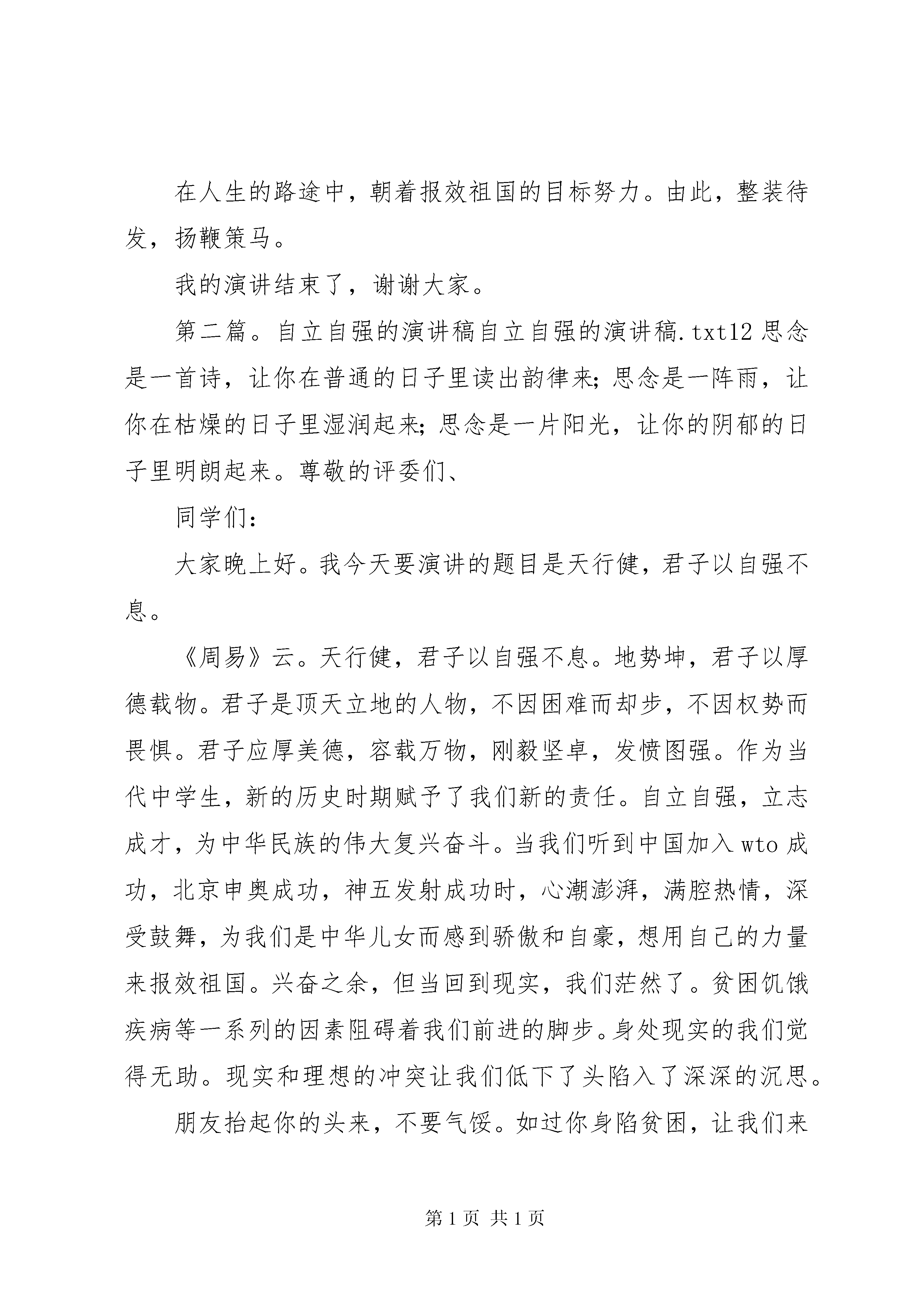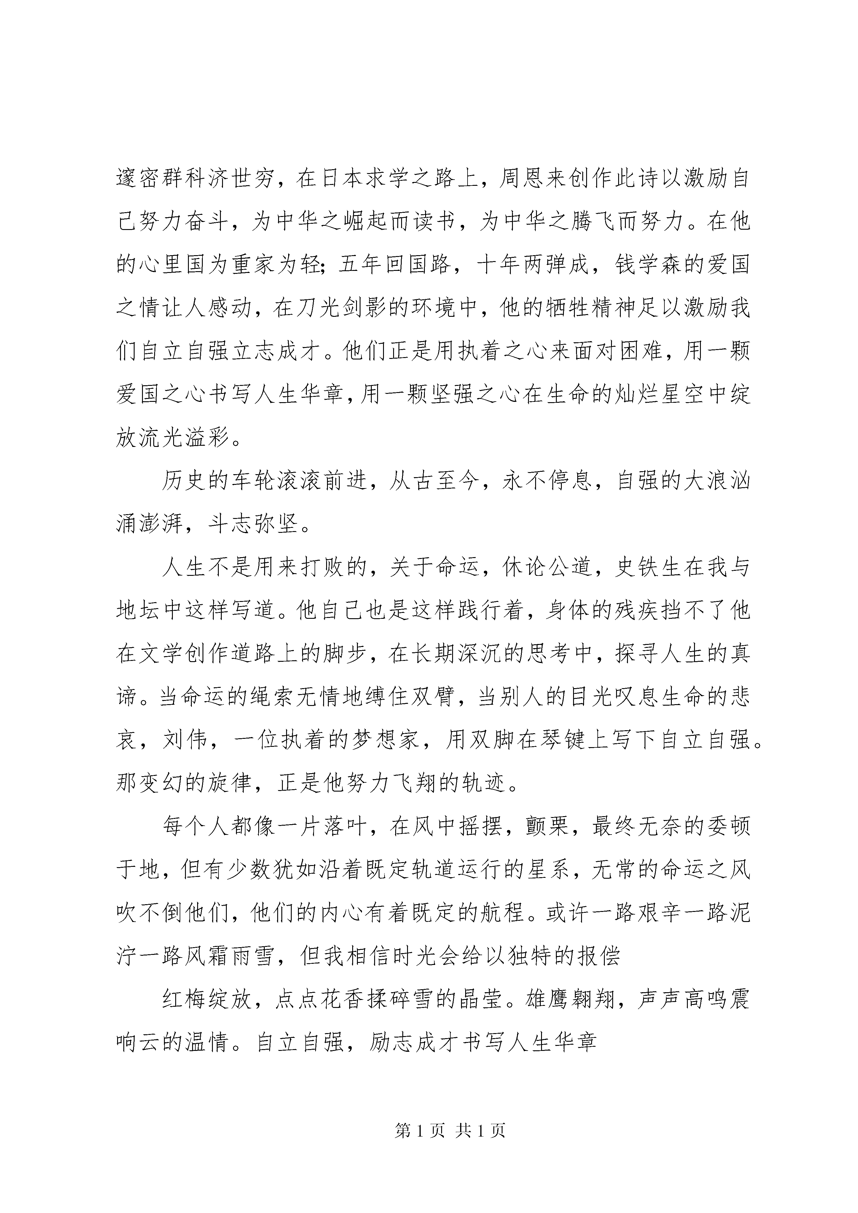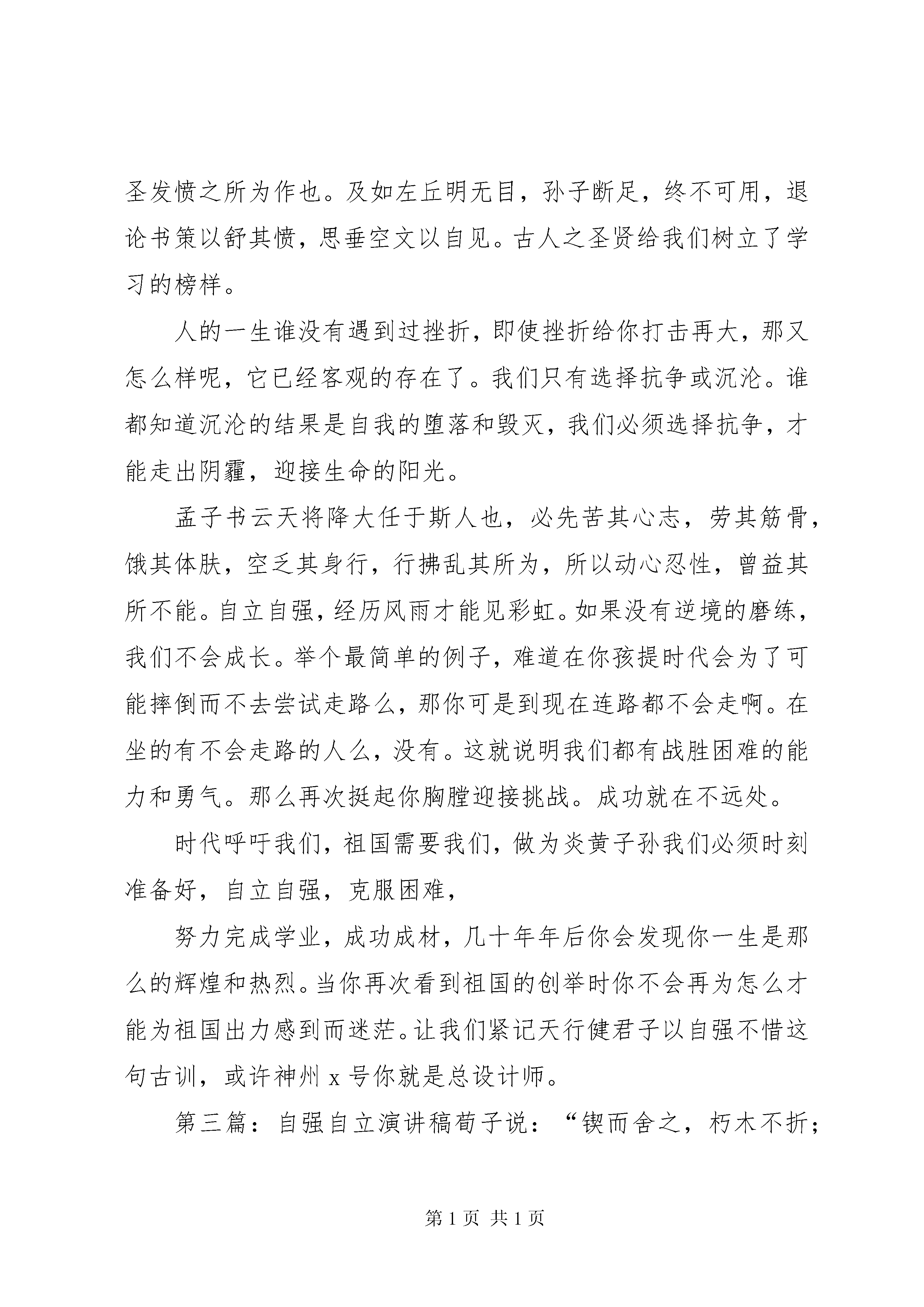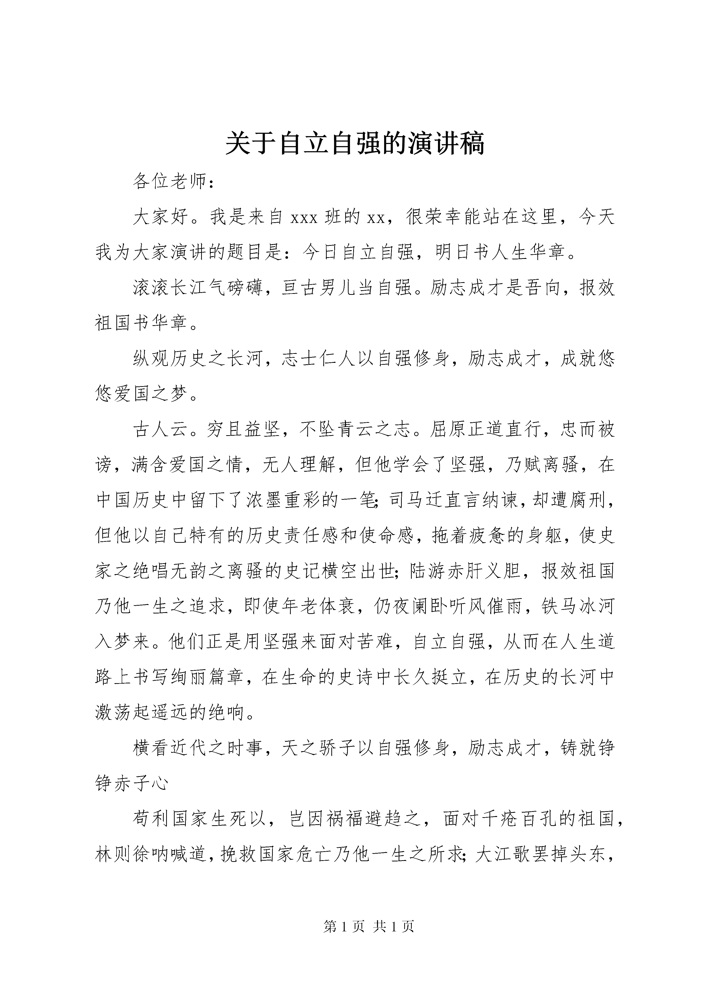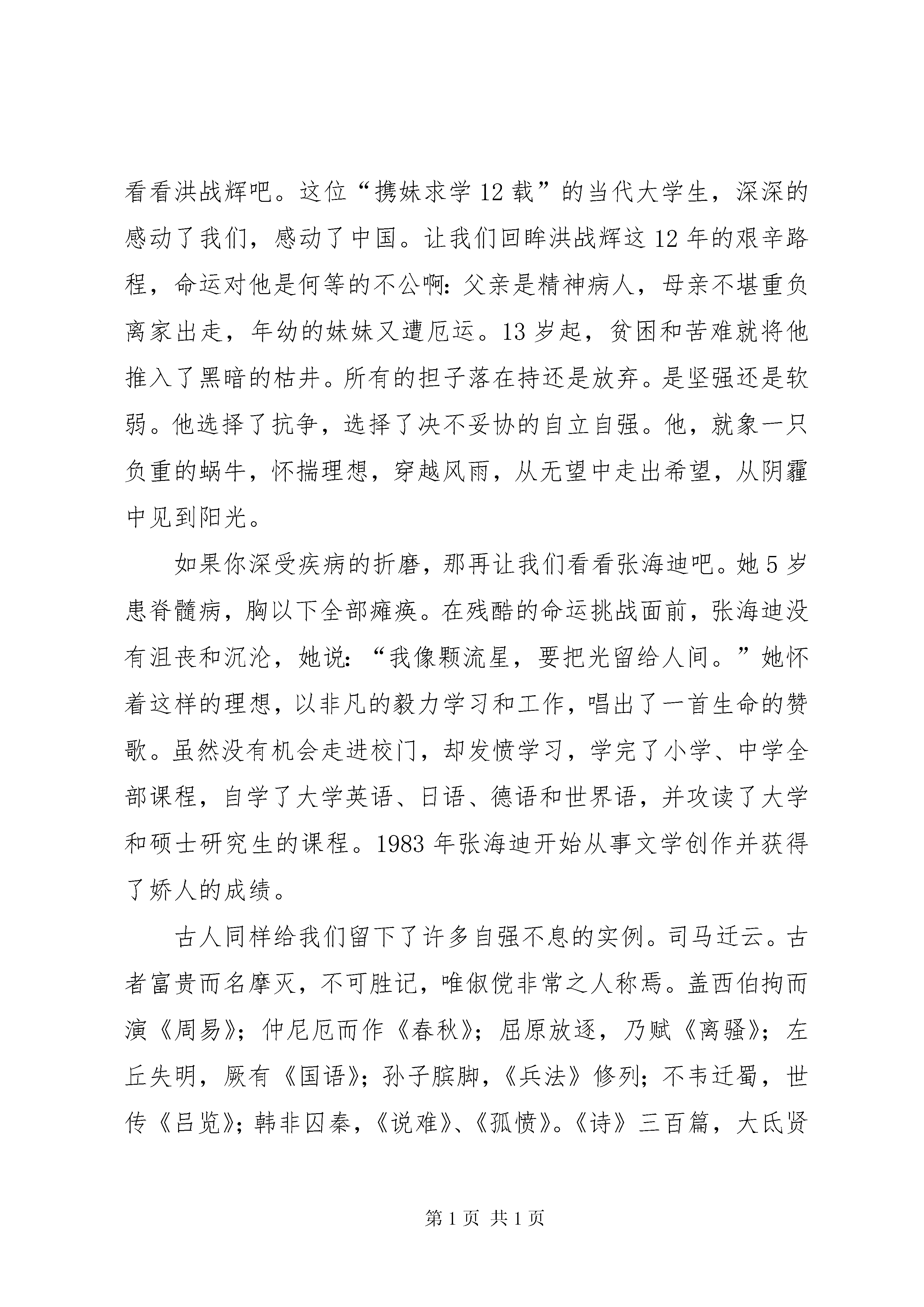 关于自立自强的演讲稿各位老师:大家好。我是来自xxx班的xx,很荣幸能站在这里,今天我为大家演讲的题目是:今日自立自强,明日书人生华章。滚滚长江气磅礴,亘古男儿当自强。励志成才是吾向,报效祖国书华章。纵观历史之长河,志士仁人以自强修身,励志成才,成就悠悠爱国之梦。古人云。穷且益坚,不坠青云之志。屈原正道直行,忠而被谤,满含爱国之情,无人理解,但他学会了坚强,乃赋离骚,在中国历史中留下了浓墨重彩的一笔;司马迁直言纳谏,却遭腐刑,但他以自己特有的历史责任感和使命感,拖着疲惫的身躯,使史家之绝唱无韵之离骚的史记横空出世;陆游赤肝义胆,报效祖国乃他一生之追求,即使年老体衰,仍夜阑卧听风催雨,铁马冰河入梦来。他们正是用坚强来面对苦难,自立自强,从而在人生道路上书写绚丽篇章,在生命的史诗中长久挺立,在历史的长河中激荡起遥远的绝响。横看近代之时事,天之骄子以自强修身,励志成才,铸就铮铮赤子心苟利国家生死以,岂因祸福避趋之,面对千疮百孔的祖国,林则徐呐喊道,挽救国家危亡乃他一生之所求;大江歌罢掉头东,邃密群科济世穷,在日本求学之路上,周恩来创作此诗以激励自己努力奋斗,为中华之崛起而读书,为中华之腾飞而努力。在他的心里国为重家为轻;五年回国路,十年两弹成,钱学森的爱国之情让人感动,在刀光剑影的环境中,他的牺牲精神足以激励我们自立自强立志成才。他们正是用执着之心来面对困难,用一颗爱国之心书写人生华章,用一颗坚强之心在生命的灿烂星空中绽放流光溢彩。历史的车轮滚滚前进,从古至今,永不停息,自强的大浪汹涌澎湃,斗志弥坚。人生不是用来打败的,关于命运,休论公道,史铁生在我与地坛中这样写道。他自己也是这样践行着,身体的残疾挡不了他在文学创作道路上的脚步,在长期深沉的思考中,探寻人生的真谛。当命运的绳索无情地缚住双臂,当别人的目光叹息生命的悲哀,刘伟,一位执着的梦想家,用双脚在琴键上写下自立自强。那变幻的旋律,正是他努力飞翔的轨迹。每个人都像一片落叶,在风中摇摆,颤栗,最终无奈的委顿于地,但有少数犹如沿着既定轨道运行的星系,无常的命运之风吹不倒他们,他们的内心有着既定的航程。或许一路艰辛一路泥泞一路风霜雨雪,但我相信时光会给以独特的报偿红梅绽放,点点花香揉碎雪的晶莹。雄鹰翱翔,声声高鸣震响云的温情。自立自强,励志成才书写人生华章在人生的路途中,朝着报效祖国的目标努力。由此,整装待发,扬鞭策马。我的演讲结束了,谢谢大家。第二篇。自立自强的演讲稿自立自强的演讲稿.txt12思念是一首诗,让你在普通的日子里读出韵律来;思念是一阵雨,让你在枯燥的日子里湿润起来;思念是一片阳光,让你的阴郁的日子里明朗起来。尊敬的评委们、同学们:大家晚上好。我今天要演讲的题目是天行健,君子以自强不息。《周易》云。天行健,君子以自强不息。地势坤,君子以厚德载物。君子是顶天立地的人物,不因困难而却步,不因权势而畏惧。君子应厚美德,容载万物,刚毅坚卓,发愤图强。作为当代中学生,新的历史时期赋予了我们新的责任。自立自强,立志成才,为中华民族的伟大复兴奋斗。当我们听到中国加入wto成功,北京申奥成功,神五发射成功时,心潮澎湃,满腔热情,深受鼓舞,为我们是中华儿女而感到骄傲和自豪,想用自己的力量来报效祖国。兴奋之余,但当回到现实,我们茫然了。贫困饥饿疾病等一系列的因素阻碍着我们前进的脚步。身处现实的我们觉得无助。现实和理想的冲突让我们低下了头陷入了深深的沉思。朋友抬起你的头来,不要气馁。如过你身陷贫困,让我们来看看洪战辉吧。这位“携妹求学12载”的当代大学生,深深的感动了我们,感动了中国。让我们回眸洪战辉这12年的艰辛路程,命运对他是何等的不公啊:父亲是精神病人,母亲不堪重负离家出走,年幼的妹妹又遭厄运。13岁起,贫困和苦难就将他推入了黑暗的枯井。所有的担子落在持还是放弃。是坚强还是软弱。他选择了抗争,选择了决不妥协的自立自强。他,就象一只负重的蜗牛,怀揣理想,穿越风雨,从无望中走出希望,从阴霾中见到阳光。如果你深受疾病的折磨,那再让我们看看张海迪吧。她5岁患脊髓病,胸以下全部瘫痪。在残酷的命运挑战面前,张海迪没有沮丧和沉沦,她说:“我像颗流星,要把光留给人间。”她怀着这样的理想,以非凡的毅力学习和工作,唱出了一首生命的赞歌。虽然没有机会走进校门,却发愤学习,学完了小学、中学全部课程,自学了大学英语、日语、德语和世界语,并攻读了大学和硕士研究生的课程。1983年张海迪开始从事文学创作并获得了娇人的成绩。古人同样给我们留下了许多自强不息的实例。司马迁云。古者富贵而名摩灭,不可胜记,唯俶傥非常之人称焉。盖西伯拘而演《周易》;仲尼厄而作《春秋》;屈原放逐,乃赋《离骚》;左丘失明,厥有《国语》;孙子膑脚,《兵法》修列;不韦迁蜀,世传《吕览》;韩非囚秦,《说难》、《孤愤》。《诗》三