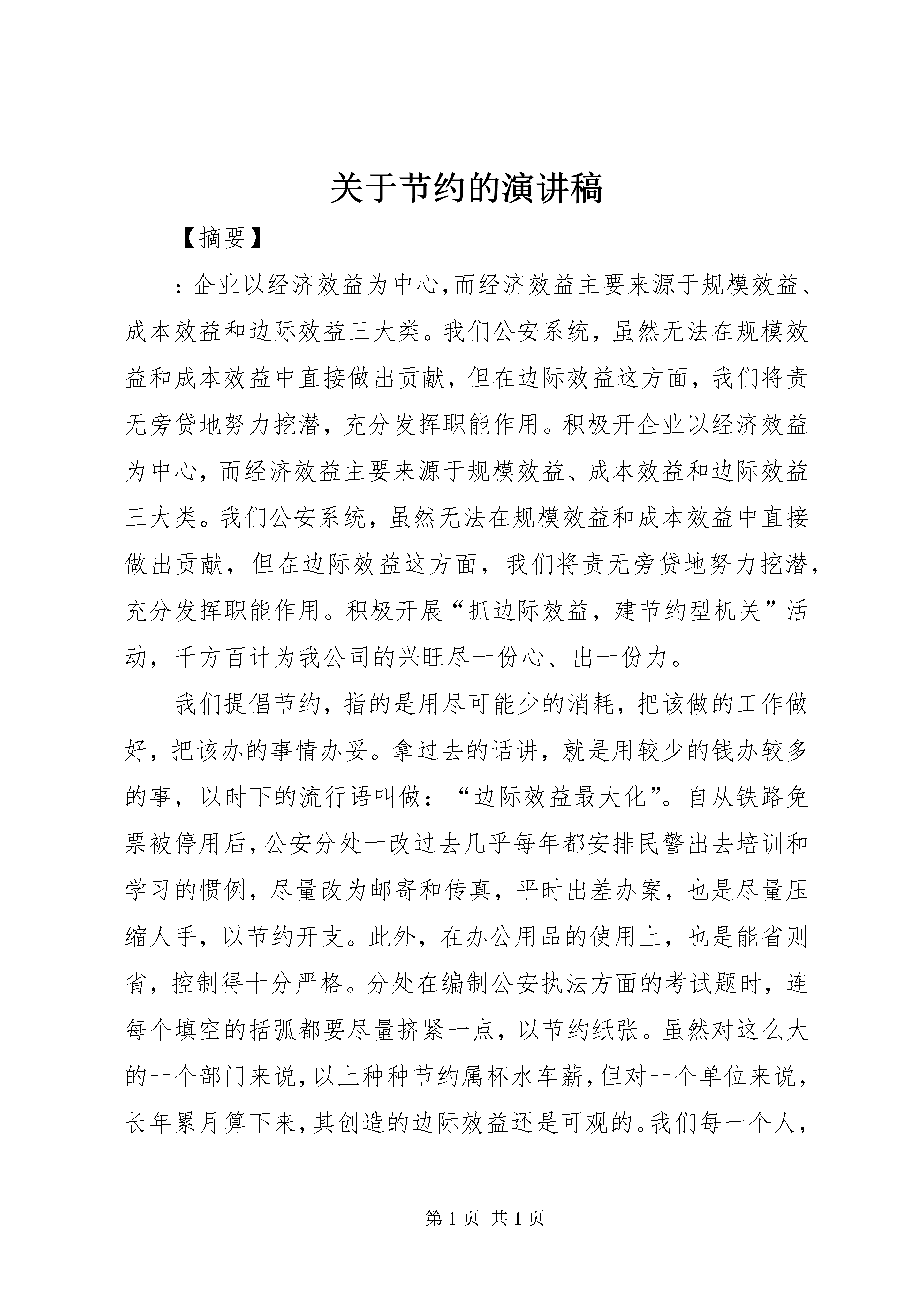 关于节约的演讲稿【摘要】:企业以经济效益为中心,而经济效益主要来源于规模效益、成本效益和边际效益三大类。我们公安系统,虽然无法在规模效益和成本效益中直接做出贡献,但在边际效益这方面,我们将责无旁贷地努力挖潜,充分发挥职能作用。积极开企业以经济效益为中心,而经济效益主要来源于规模效益、成本效益和边际效益三大类。我们公安系统,虽然无法在规模效益和成本效益中直接做出贡献,但在边际效益这方面,我们将责无旁贷地努力挖潜,充分发挥职能作用。积极开展“抓边际效益,建节约型机关”活动,千方百计为我公司的兴旺尽一份心、出一份力。我们提倡节约,指的是用尽可能少的消耗,把该做的工作做好,把该办的事情办妥。拿过去的话讲,就是用较少的钱办较多的事,以时下的流行语叫做:“边际效益最大化”。自从铁路免票被停用后,公安分处一改过去几乎每年都安排民警出去培训和学习的惯例,尽量改为邮寄和传真,平时出差办案,也是尽量压缩人手,以节约开支。此外,在办公用品的使用上,也是能省则省,控制得十分严格。分处在编制公安执法方面的考试题时,连每个填空的括弧都要尽量挤紧一点,以节约纸张。虽然对这么大的一个部门来说,以上种种节约属杯水车薪,但对一个单位来说,长年累月算下来,其创造的边际效益还是可观的。我们每一个人,无论在家里,还是在单位,都应该树立起科学的节约观。当然,节约不是不办事,不花钱,不消耗,而是要讲究消耗的适度和效益,达到做事与节约的辩证统一。抓边际效益并不仅仅是节约,更要充分发挥各部门每个员工的主观能动性,在挖潜、改造和创新上下功夫,通过努力挖潜和创新,来创造边际效益,降低工作成本。我们公安分处在明年的工作中,将重点开展:“节约每一度电、每一分钱、每一张纸”的活动,在努力做好为企业服务的同时,尽量降低成本和费用,为公司创造节约型机关做出一份应有的贡献。
