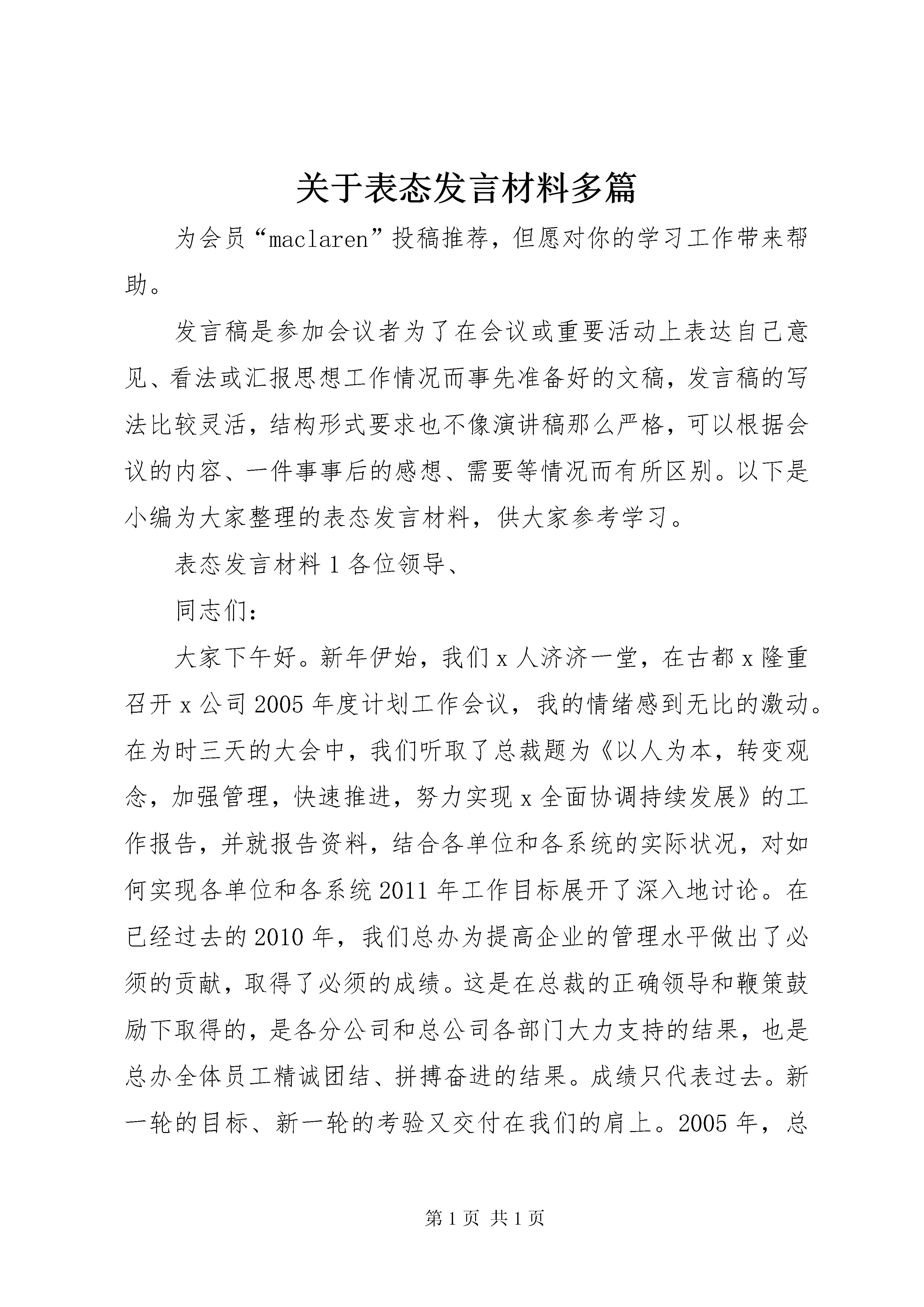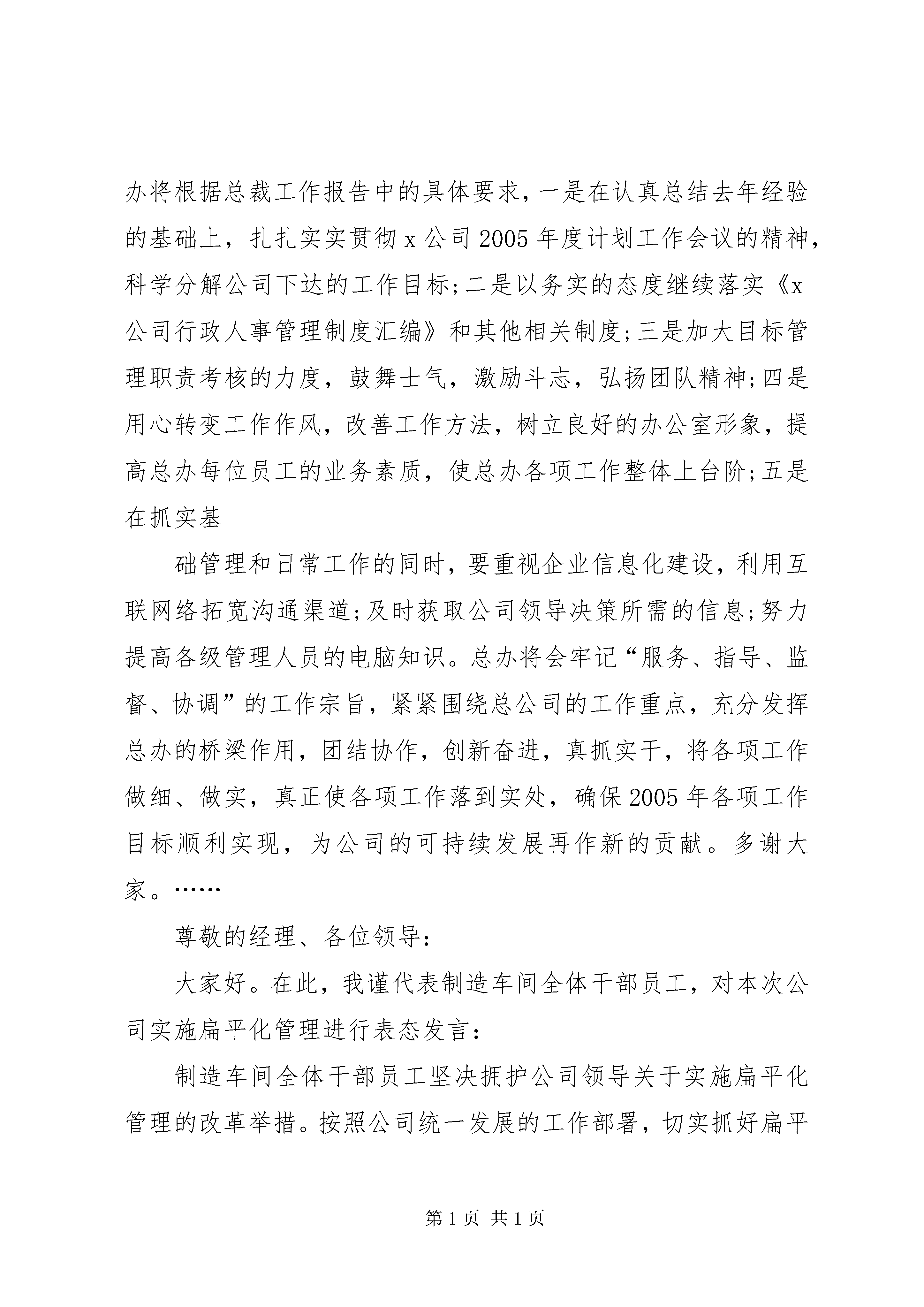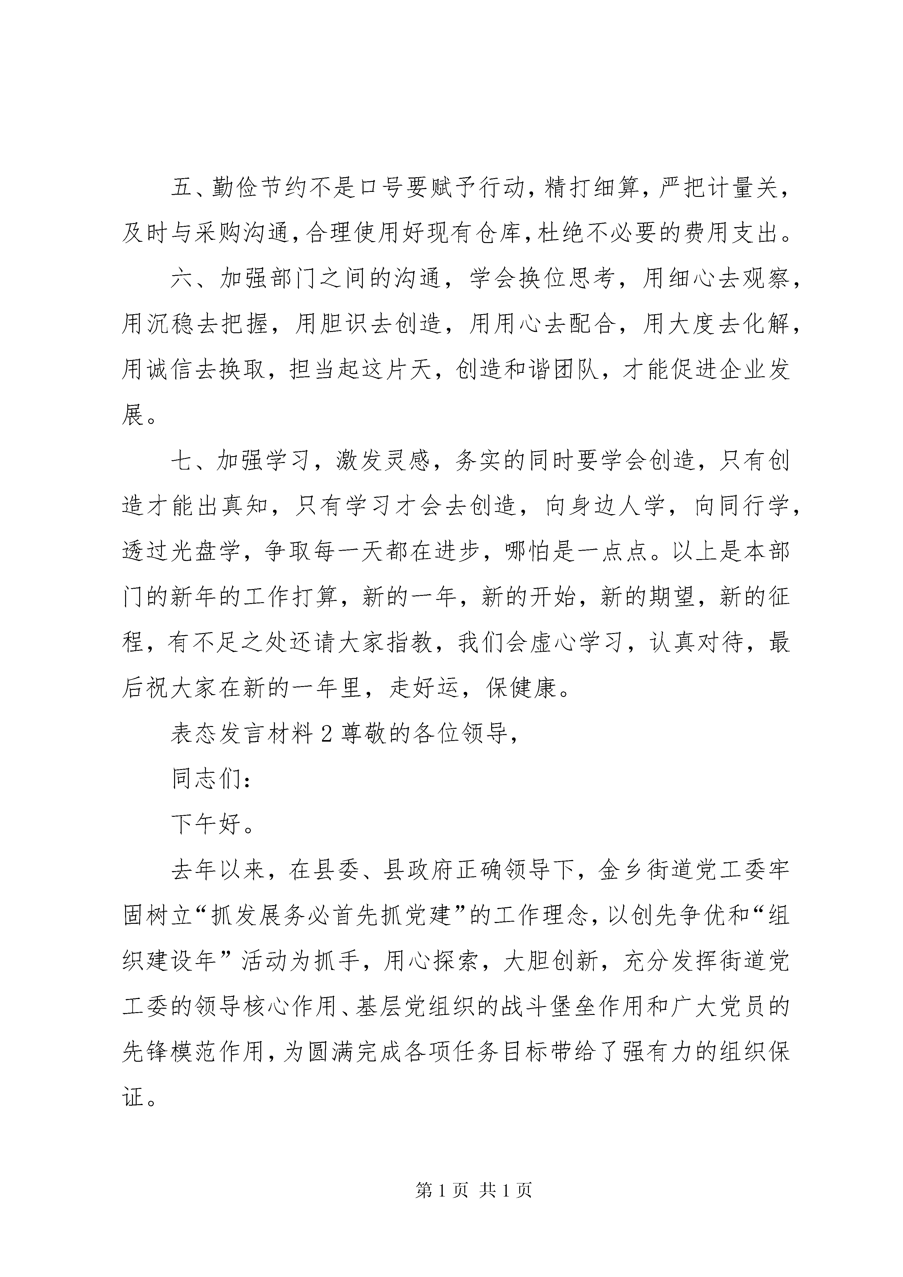 关于表态发言材料多篇为会员“maclaren”投稿推荐,但愿对你的学习工作带来帮助。发言稿是参加会议者为了在会议或重要活动上表达自己意见、看法或汇报思想工作情况而事先准备好的文稿,发言稿的写法比较灵活,结构形式要求也不像演讲稿那么严格,可以根据会议的内容、一件事事后的感想、需要等情况而有所区别。以下是小编为大家整理的表态发言材料,供大家参考学习。表态发言材料1各位领导、同志们:大家下午好。新年伊始,我们x人济济一堂,在古都x隆重召开x公司2005年度计划工作会议,我的情绪感到无比的激动。在为时三天的大会中,我们听取了总裁题为《以人为本,转变观念,加强管理,快速推进,努力实现x全面协调持续发展》的工作报告,并就报告资料,结合各单位和各系统的实际状况,对如何实现各单位和各系统2011年工作目标展开了深入地讨论。在已经过去的2010年,我们总办为提高企业的管理水平做出了必须的贡献,取得了必须的成绩。这是在总裁的正确领导和鞭策鼓励下取得的,是各分公司和总公司各部门大力支持的结果,也是总办全体员工精诚团结、拼搏奋进的结果。成绩只代表过去。新一轮的目标、新一轮的考验又交付在我们的肩上。2005年,总办将根据总裁工作报告中的具体要求,一是在认真总结去年经验的基础上,扎扎实实贯彻x公司2005年度计划工作会议的精神,科学分解公司下达的工作目标;二是以务实的态度继续落实《x公司行政人事管理制度汇编》和其他相关制度;三是加大目标管理职责考核的力度,鼓舞士气,激励斗志,弘扬团队精神;四是用心转变工作作风,改善工作方法,树立良好的办公室形象,提高总办每位员工的业务素质,使总办各项工作整体上台阶;五是在抓实基础管理和日常工作的同时,要重视企业信息化建设,利用互联网络拓宽沟通渠道;及时获取公司领导决策所需的信息;努力提高各级管理人员的电脑知识。总办将会牢记“服务、指导、监督、协调”的工作宗旨,紧紧围绕总公司的工作重点,充分发挥总办的桥梁作用,团结协作,创新奋进,真抓实干,将各项工作做细、做实,真正使各项工作落到实处,确保2005年各项工作目标顺利实现,为公司的可持续发展再作新的贡献。多谢大家。……尊敬的经理、各位领导:大家好。在此,我谨代表制造车间全体干部员工,对本次公司实施扁平化管理进行表态发言:制造车间全体干部员工坚决拥护公司领导关于实施扁平化管理的改革举措。按照公司统一发展的工作部署,切实抓好扁平化管理工作在基层车间的推进和落实,充分发挥基层车间的保障职能,我们要坚决做好四个方面的工作。1、严格落实集团公司及公司qhse管理要求,深化基层车间安全管理,认真执行操作规程,进一步深化“强三基、反三违”活动。牢记基层管理者身上背负的安全使命,把职工安全放在心上,将安全生产贯彻在生产工作的始终。为公司生产建设服好务。2、抓好基层建设,严细现场管理,促进管理创新和技术创新。强化基层建设,进一步明确基层建设的目标和重点,透过狠抓建章立制,强化技能培训,实施政策引导,提升基层队伍素质和装备水平,改善基层生产、生活条件,夯实基层工作基础。3、抓好员工素质教育,用高素质的基层员工队伍保障企业持续发展。抓好“导师带徒”活动的落实,结合岗位需求,重点强化以应知应会、岗位技能、安全环保、操作规程等为主要资料的基础性培训,使全体岗位操作人员的基本素质迈上一个新的台阶。针对近期改造过程中,生产车间里不断增加的新设备、新工艺,我们将进一步强化关键岗位的培训,加强基层重点设备、重点工艺管理人员的培训,不断提高基层技术人员综合素质,以满足新设备、新工艺实施后所产生的新岗位的技术要求。4、为了开展好生产线产能扩建和隐患治理工作,我们将按照公司安排,排好工期,严格按照工作流程,搞好近期生产线改造工作和隐患治理工作,将设备安装、后续技术的跟进等基础工作做稳、做实。公司本次实施扁平化管理,是适应市场发展、创新机制和公司持续、稳定、健康发展的需要,请公司领导放心,我们制造车间全体干部员工将以公司发展需要为己任,按照公司预定目标,努力做好本职工作,为共同实现企业的持久发展贡献自我的全部力量。采取的措施是:一、落实部门每个人针对自我的工作进行认真的总结,细致的反思,找出工作中的不足,应对新时期的目标,加以改善完善,并制定出自我的工作目标以及发展方向。二、针对每项工作要从新制定合理可行性标准,要有量化指标,结合考核制度来衡量每个人的工作业绩,从而到达日清日高的效果。三、现场管理职责到人,纳入工作业绩一并考核,要持之以恒,直到养成一种习惯。四、要求各环节每一天都要对所管理的物资进行盘点,与电脑进行核对,特殊物品能够分期核对,要做到心中有数,帐物相符。五、勤俭节约不是口号要赋予行动,精打细算,严把计量关,及时与采购沟通,合理使用好现有仓库,杜绝不必要的费用支出。六、加强部门之