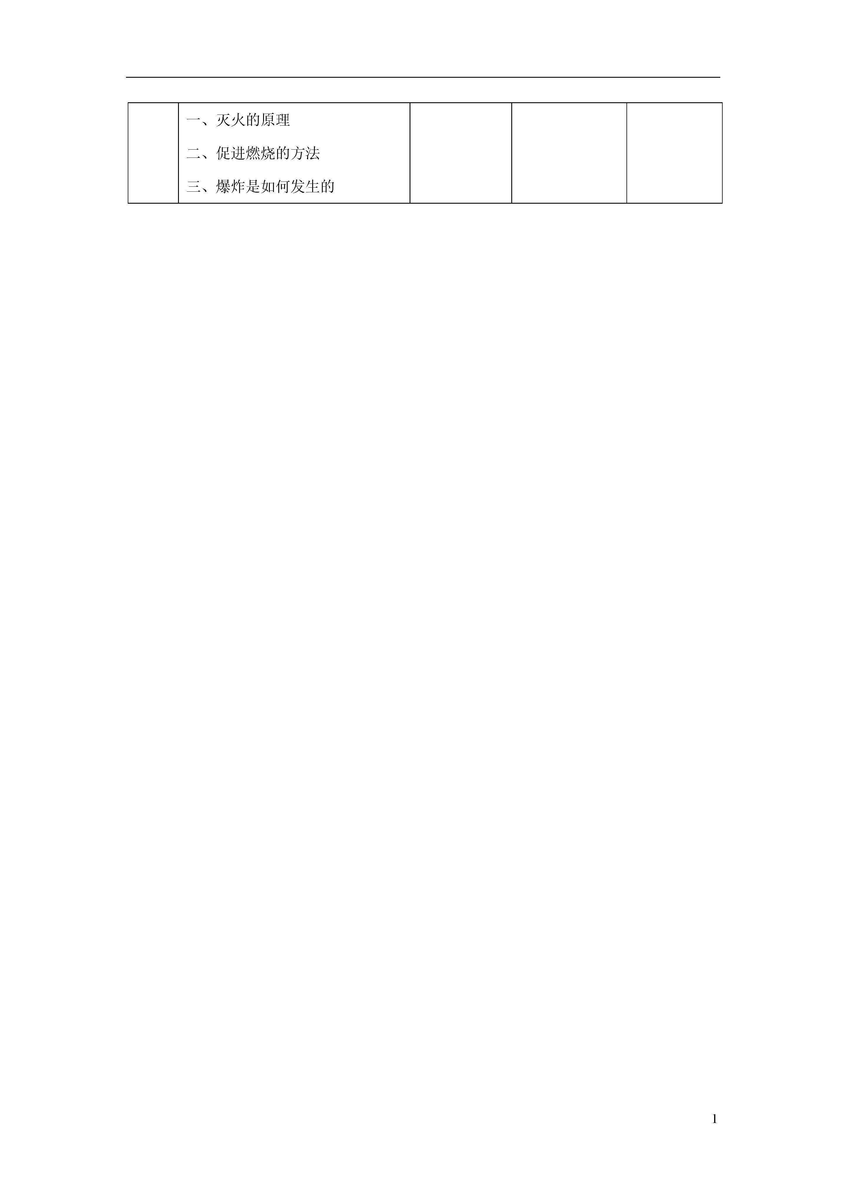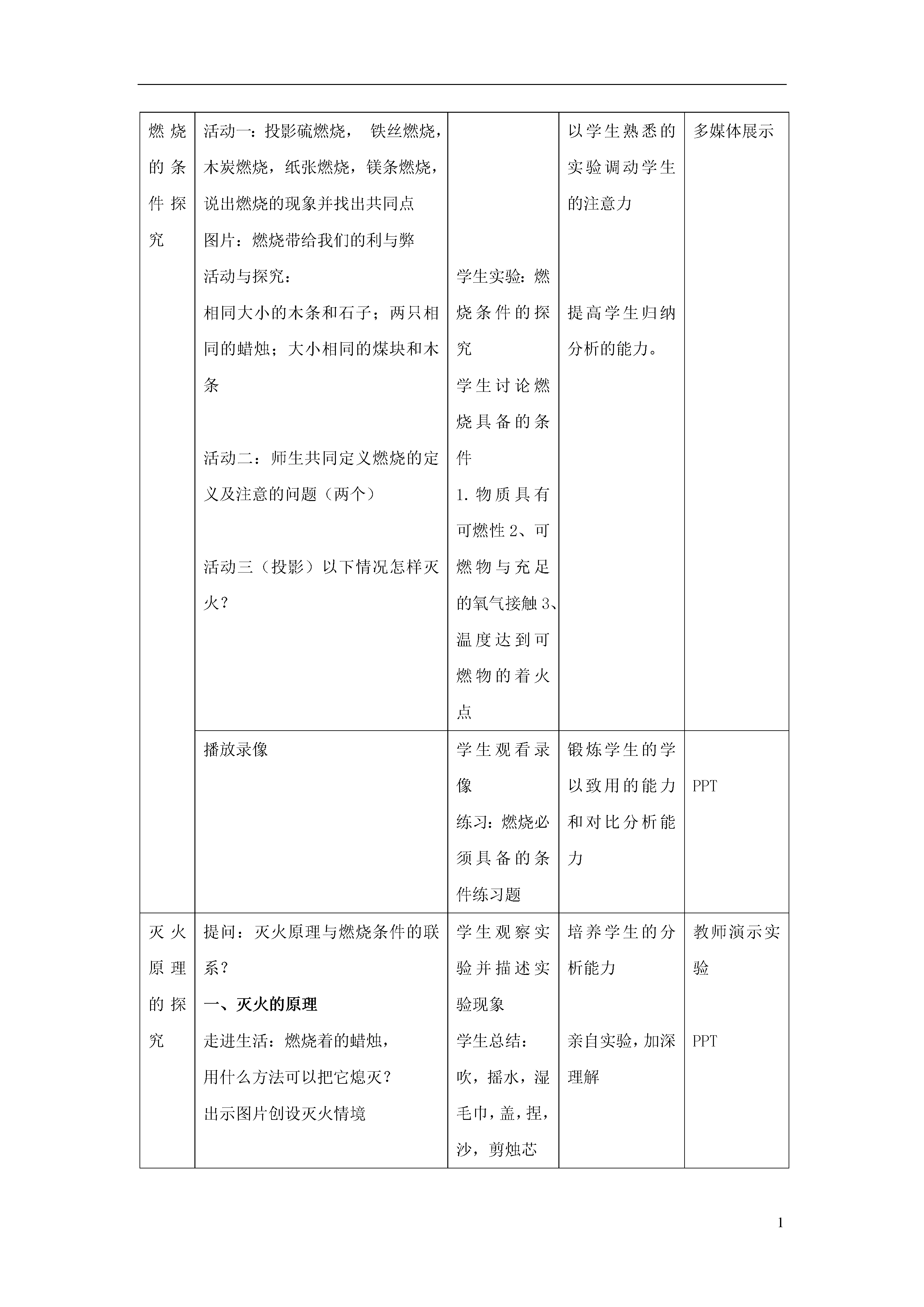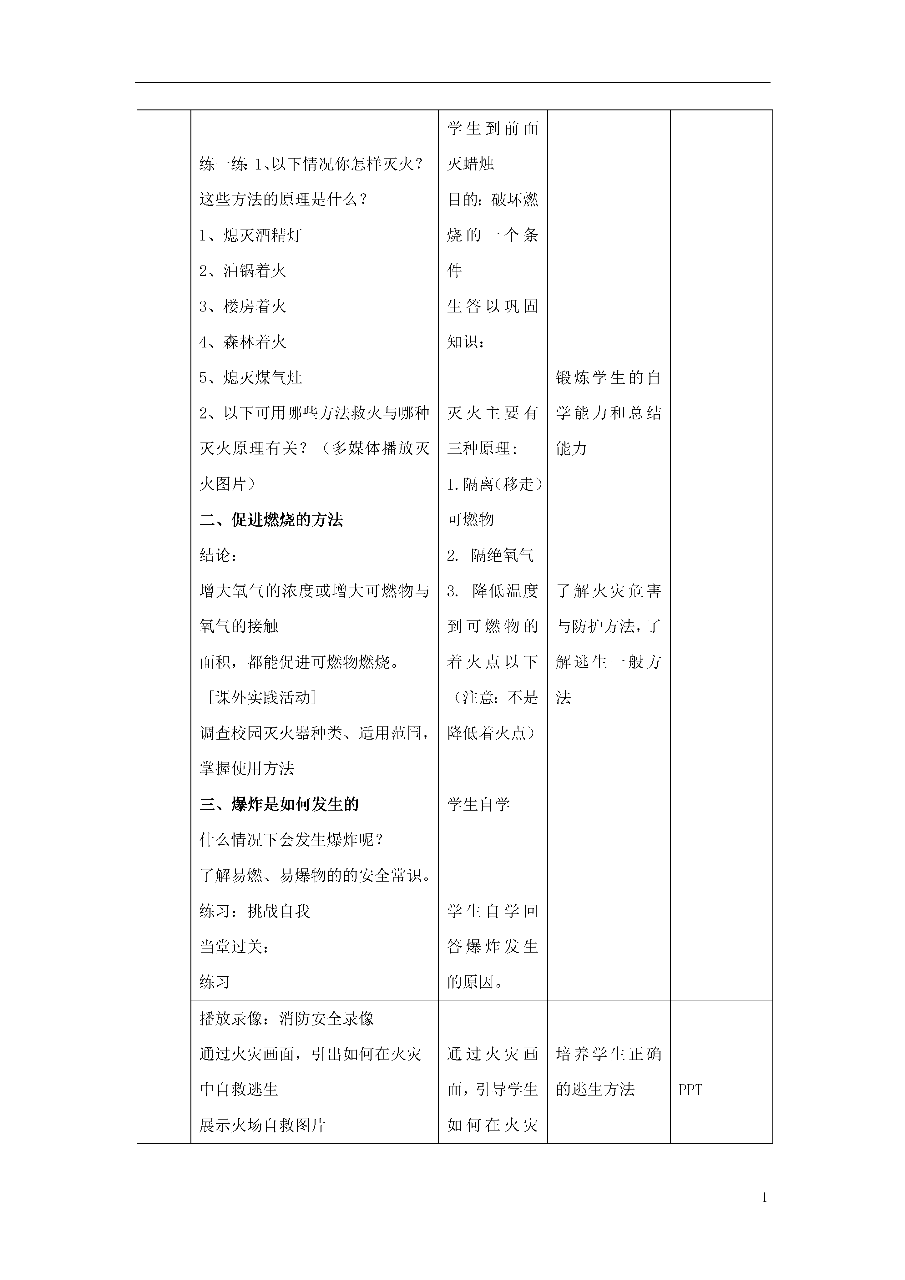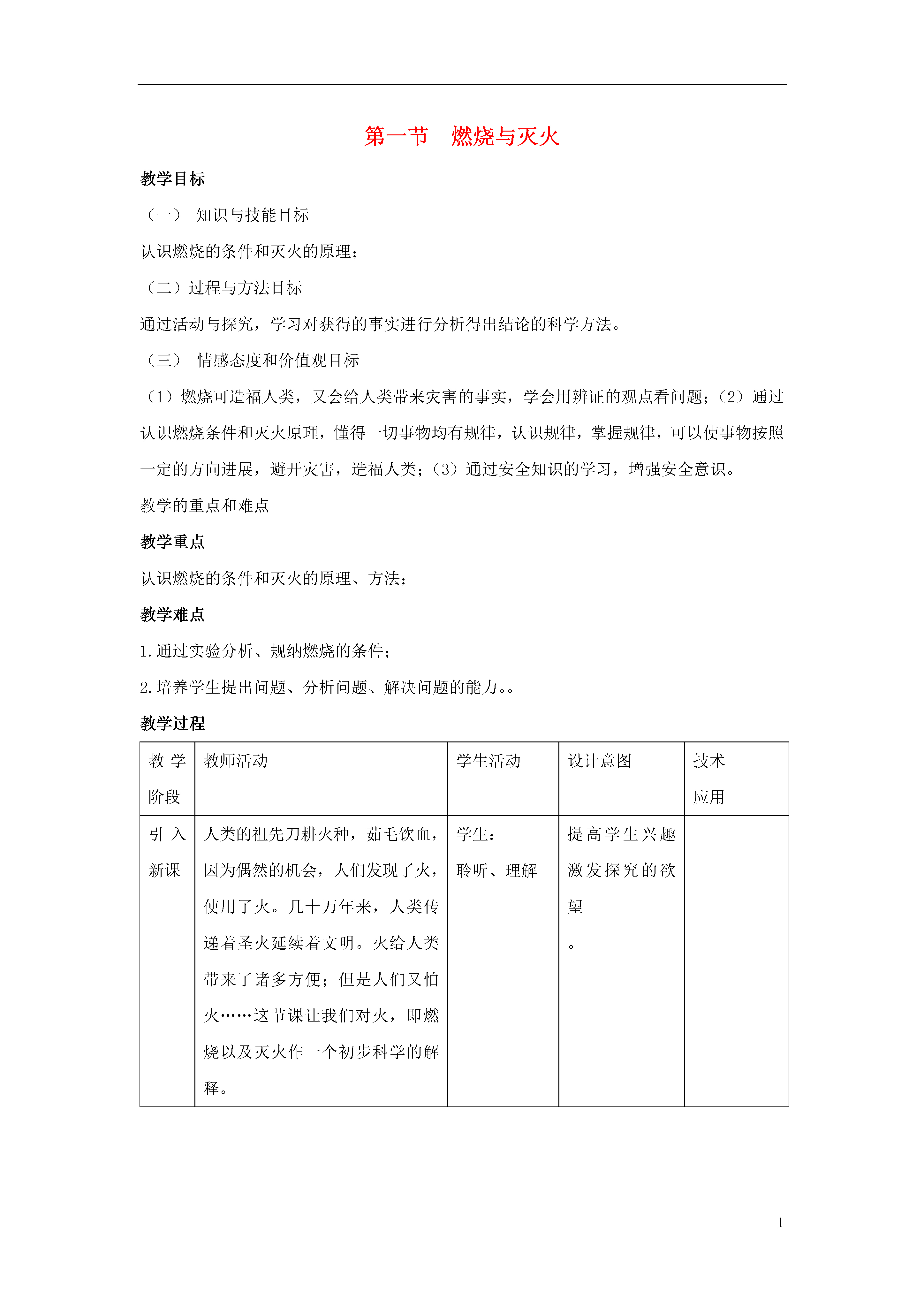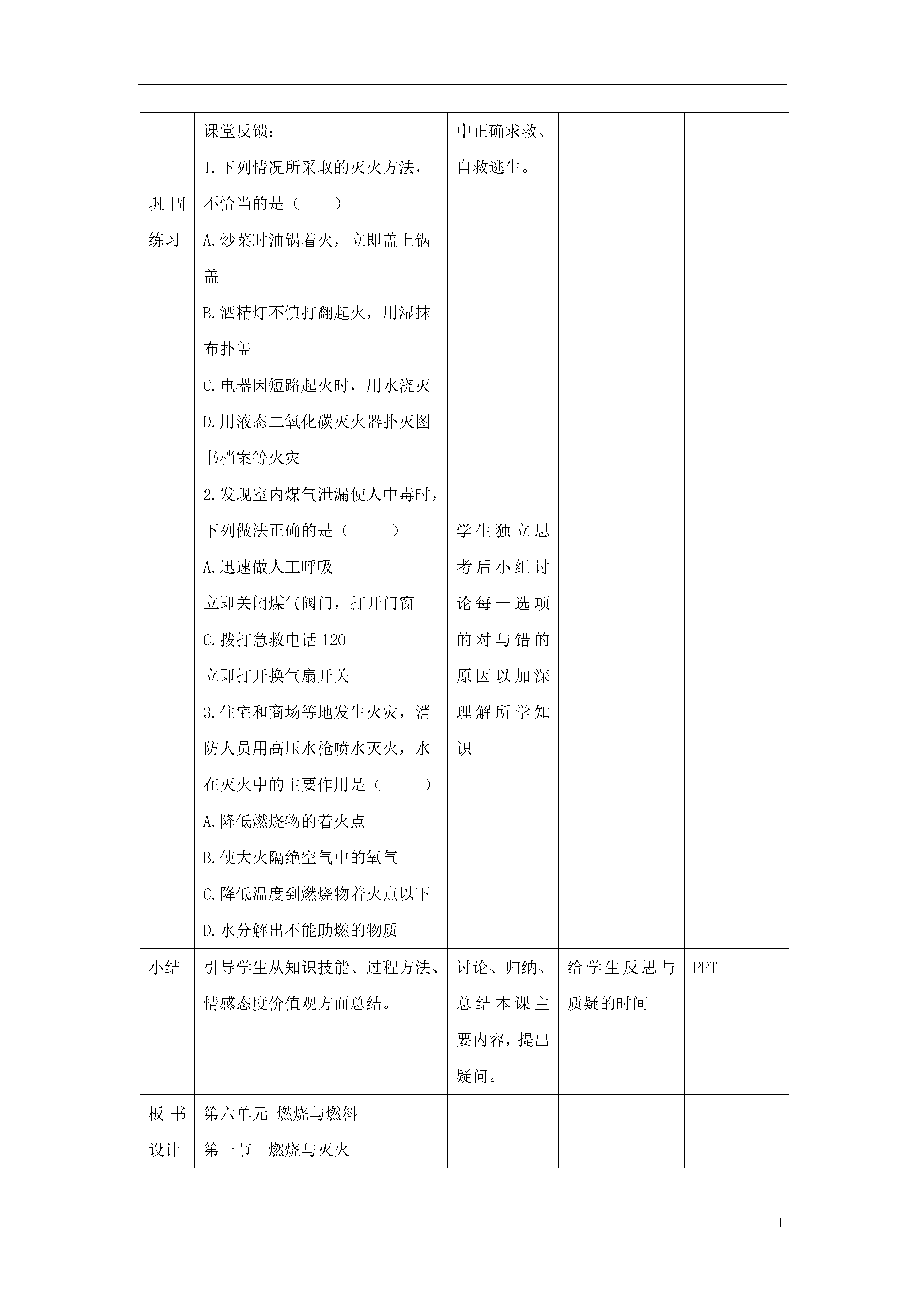 1第一节燃烧与灭火教学目标知识与技能目标认识燃烧的条件和灭火的原理;(二)过程与方法目标通过活动与探究,学习对获得的事实进行分析得出结论的科学方法。(三)情感态度和价值观目标(1)燃烧可造福人类,又会给人类带来灾害的事实,学会用辨证的观点看问题;(2)通过认识燃烧条件和灭火原理,懂得一切事物均有规律,认识规律,掌握规律,可以使事物按照一定的方向进展,避开灾害,造福人类;(3)通过安全知识的学习,增强安全意识。教学的重点和难点教学重点认识燃烧的条件和灭火的原理、方法;教学难点1.通过实验分析、规纳燃烧的条件;2.培养学生提出问题、分析问题、解决问题的能力。。教学过程教学阶段教师活动学生活动设计意图技术应用引入新课人类的祖先刀耕火种,茹毛饮血,因为偶然的机会,人们发现了火,使用了火。几十万年来,人类传递着圣火延续着文明。火给人类带来了诸多方便;但是人们又怕火……这节课让我们对火,即燃烧以及灭火作一个初步科学的解释。学生:聆听、理解提高学生兴趣激发探究的欲望。燃烧的条件探究活动一:投影硫燃烧,铁丝燃烧,木炭燃烧,纸张燃烧,镁条燃烧,说出燃烧的现象并找出共同点图片:燃烧带给我们的利与弊活动与探究:相同大小的木条和石子;两只相同的蜡烛;大小相同的煤块和木条活动二:师生共同定义燃烧的定义及注意的问题(两个)活动三(投影)以下情况怎样灭火?学生实验:燃烧条件的探究学生讨论燃烧具备的条件1.物质具有可燃性2、可燃物与充足的氧气接触3、温度达到可燃物的着火点以学生熟悉的实验调动学生的注意力提高学生归纳分析的能力。多媒体展示播放录像学生观看录像练习:燃烧必须具备的条件练习题锻炼学生的学以致用的能力和对比分析能力PPT灭火原理的探究巩固练习提问:灭火原理与燃烧条件的联系?一、灭火的原理走进生活:燃烧着的蜡烛,用什么方法可以把它熄灭?出示图片创设灭火情境练一练:1、以下情况你怎样灭火?这些方法的原理是什么?1、熄灭酒精灯2、油锅着火3、楼房着火4、森林着火5、熄灭煤气灶2、以下可用哪些方法救火与哪种灭火原理有关?(多媒体播放灭火图片)二、促进燃烧的方法结论:增大氧气的浓度或增大可燃物与氧气的接触面积,都能促进可燃物燃烧。[课外实践活动]调查校园灭火器种类、适用范围,掌握使用方法三、爆炸是如何发生的什么情况下会发生爆炸呢?了解易燃、易爆物的的安全常识。练习:挑战自我当堂过关:练习学生观察实验并描述实验现象学生总结:吹,摇水,湿毛巾,盖,捏,沙,剪烛芯学生到前面灭蜡烛目的:破坏燃烧的一个条件生答以巩固知识:灭火主要有三种原理:1.隔离(移走)可燃物2.隔绝氧气3.降低温度到可燃物的着火点以下(注意:不是降低着火点)学生自学学生自学回答爆炸发生的原因。培养学生的分析能力亲自实验,加深理解锻炼学生的自学能力和总结能力了解火灾危害与防护方法,了解逃生一般方法教师演示实验PPT播放录像:消防安全录像通过火灾画面,引出如何在火灾中自救逃生展示火场自救图片课堂反馈:1.下列情况所采取的灭火方法,不恰当的是()A.炒菜时油锅着火,立即盖上锅盖B.酒精灯不慎打翻起火,用湿抹布扑盖C.电器因短路起火时,用水浇灭D.用液态二氧化碳灭火器扑灭图书档案等火灾2.发现室内煤气泄漏使人中毒时,下列做法正确的是()A.迅速做人工呼吸B.立即关闭煤气阀门,打开门窗C.拨打急救电话120D.立即打开换气扇开关3.住宅和商场等地发生火灾,消防人员用高压水枪喷水灭火,水在灭火中的主要作用是()A.降低燃烧物的着火点B.使大火隔绝空气中的氧气C.降低温度到燃烧物着火点以下D.水分解出不能助燃的物质通过火灾画面,引导学生如何在火灾中正确求救、自救逃生。学生独立思考后小组讨论每一选项的对与错的原因以加深理解所学知识培养学生正确的逃生方法PPT小结引导学生从知识技能、过程方法、情感态度价值观方面总结。讨论、归纳、总结本课主要内容,提出疑问。给学生反思与质疑的时间PPT板书设计第六单元燃烧与燃料第一节燃烧与灭火一、灭火的原理二、促进燃烧的方法特征:均一、稳定的混合物三、爆炸是如何发生的