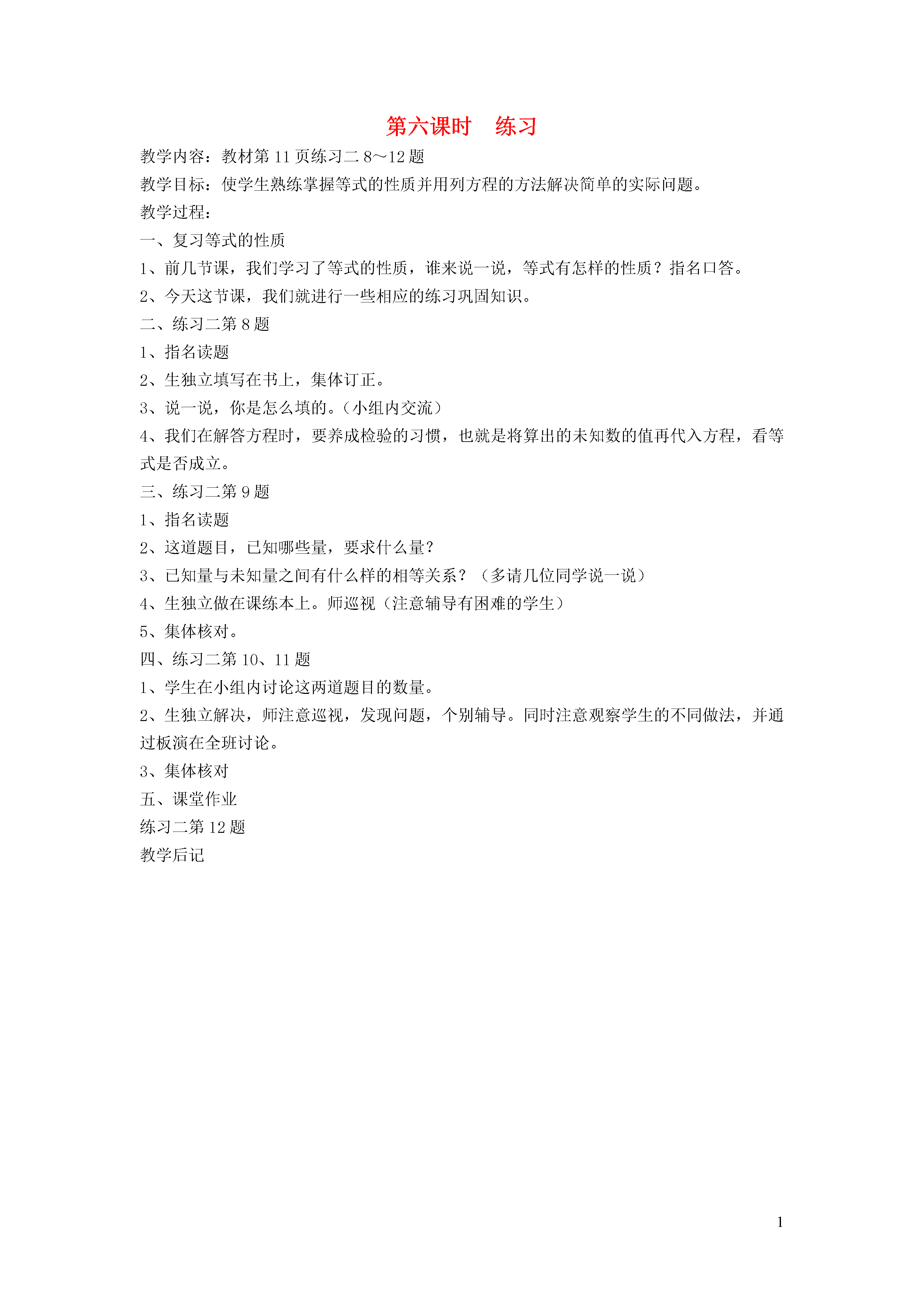 1第六课时练习教学内容:教材练习二8~12题教学目标:使学生熟练掌握等式的性质并用列方程的方法解决简单的实际问题。教学过程:一、复习等式的性质1、前几节课,我们学习了等式的性质,谁来说一说,等式有怎样的性质?指名口答。2、今天这节课,我们就进行一些相应的练习巩固知识。二、练习二第8题1、指名读题2、生独立填写在书上,集体订正。3、说一说,你是怎么填的。(小组内交流)4、我们在解答方程时,要养成检验的习惯,也就是将算出的未知数的值再代入方程,看等式是否成立。三、练习二第9题1、指名读题2、这道题目,已知哪些量,要求什么量?3、已知量与未知量之间有什么样的相等关系?(多请几位同学说一说)4、生独立做在课练本上。师巡视(注意辅导有困难的学生)5、集体核对。四、练习二第10、11题1、学生在小组内讨论这两道题目的数量。2、生独立解决,师注意巡视,发现问题,个别辅导。同时注意观察学生的不同做法,并通过板演在全班讨论。3、集体核对五、课堂作业练习二第12题教学后记