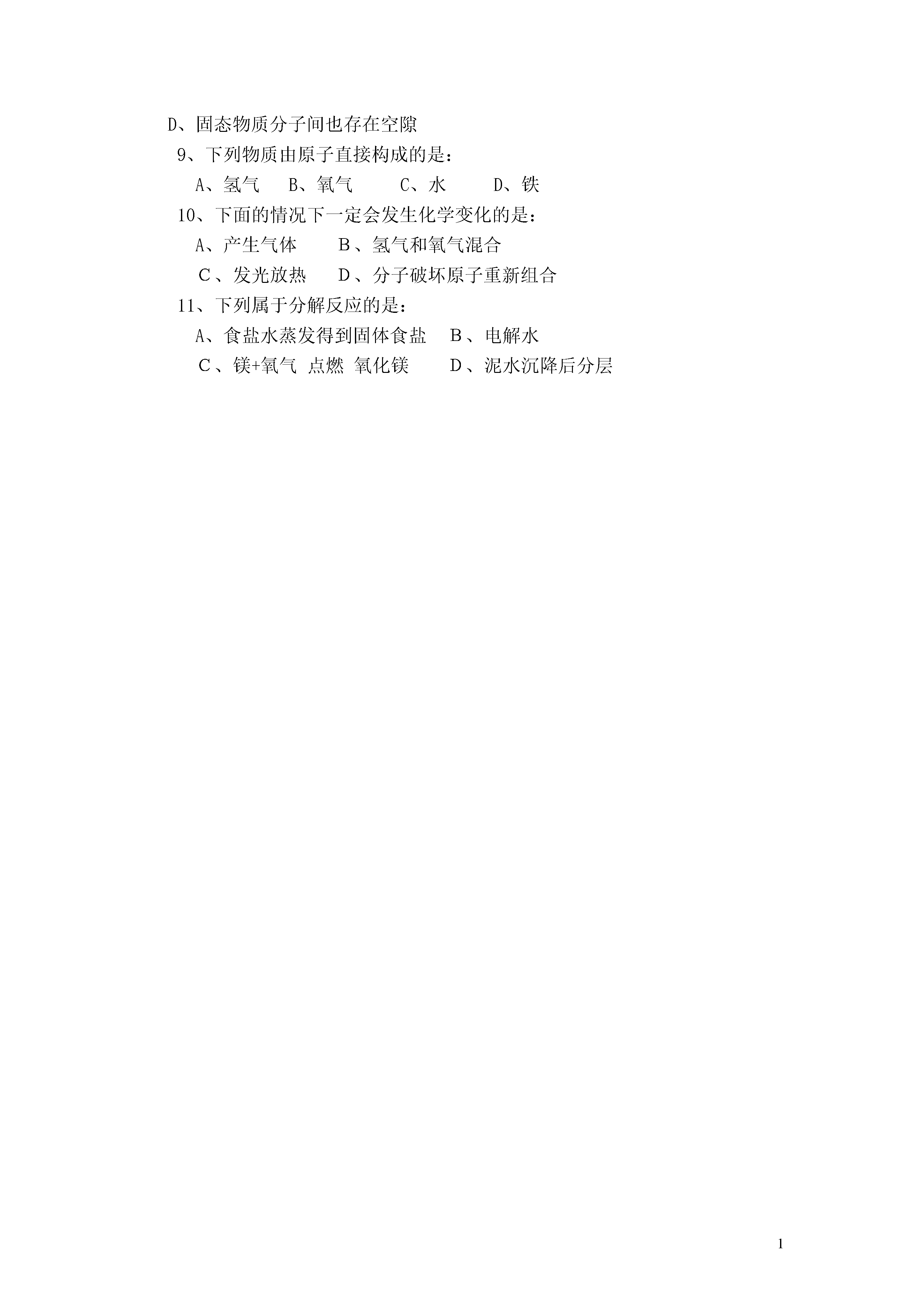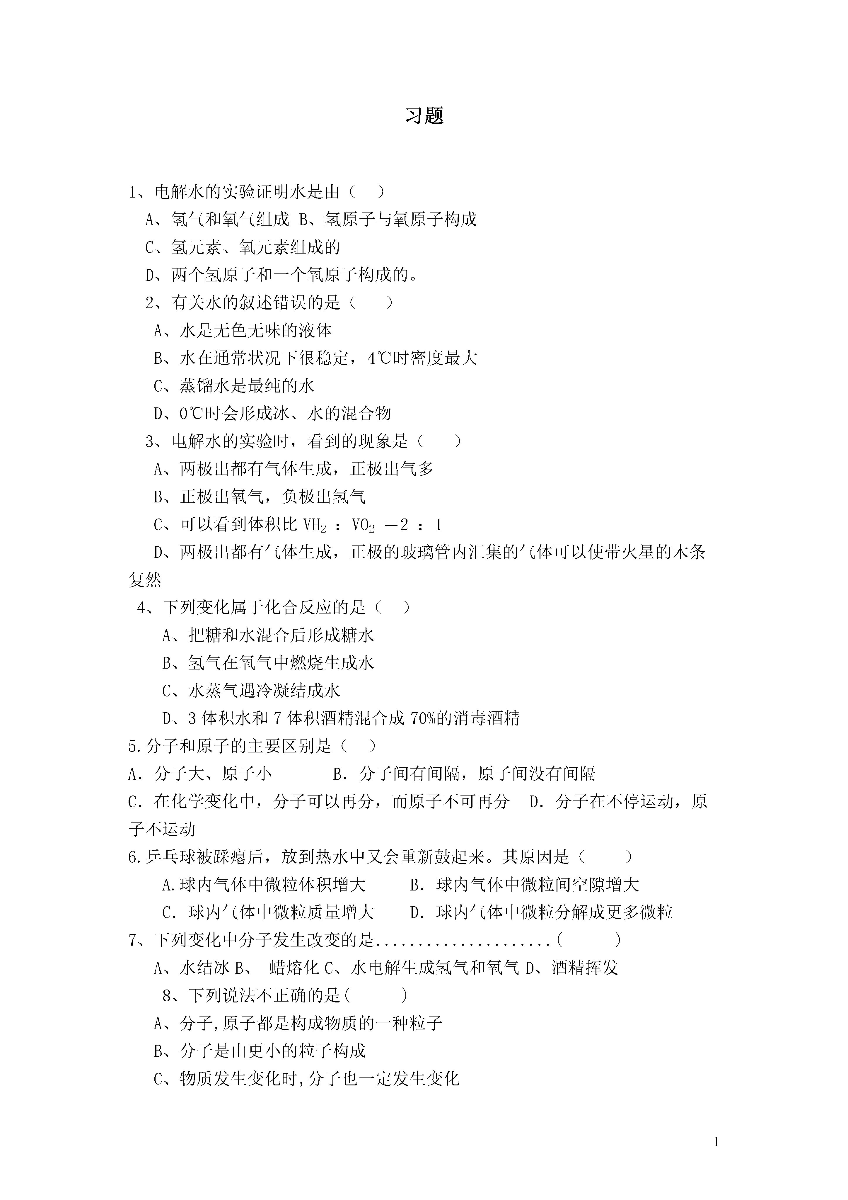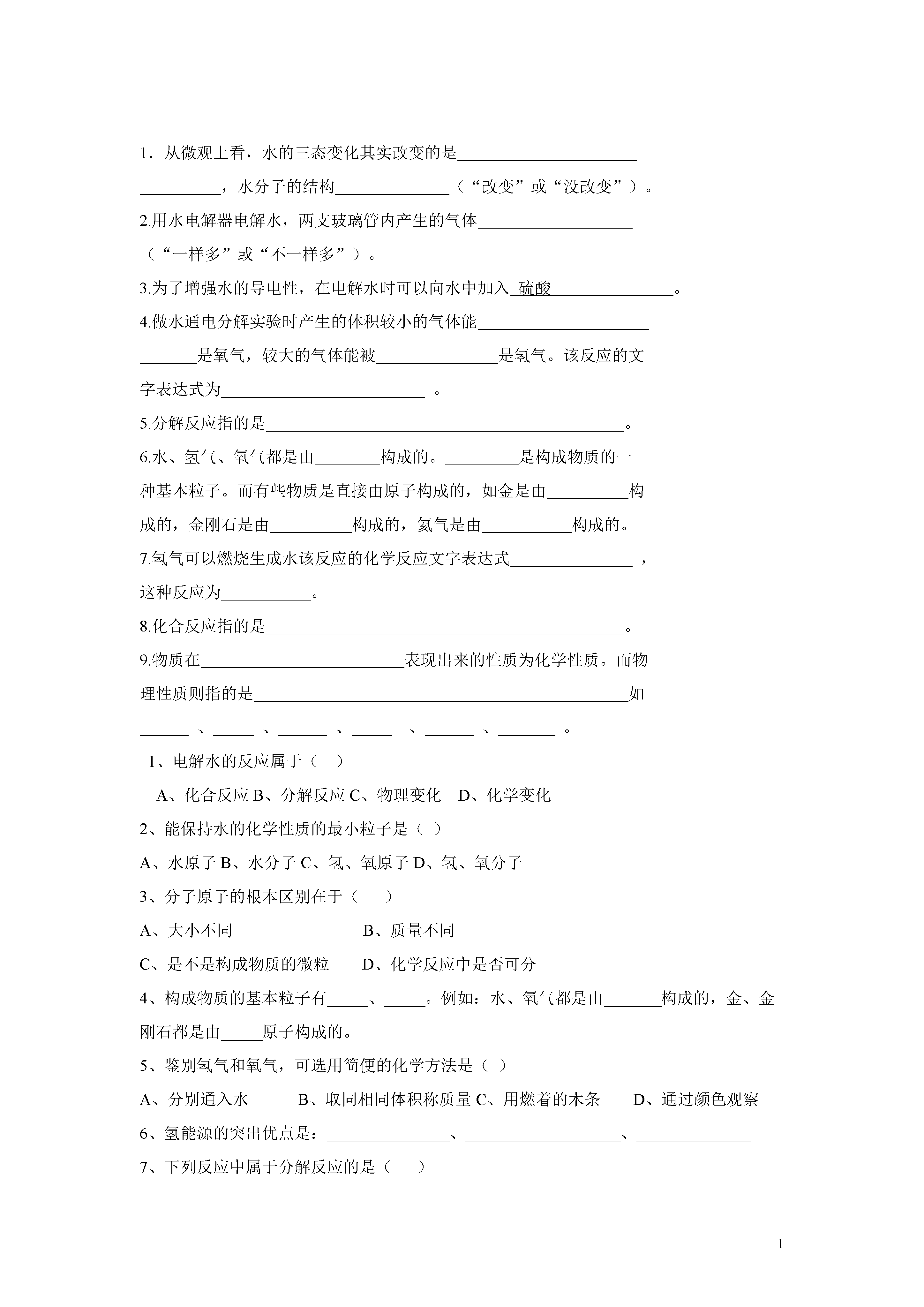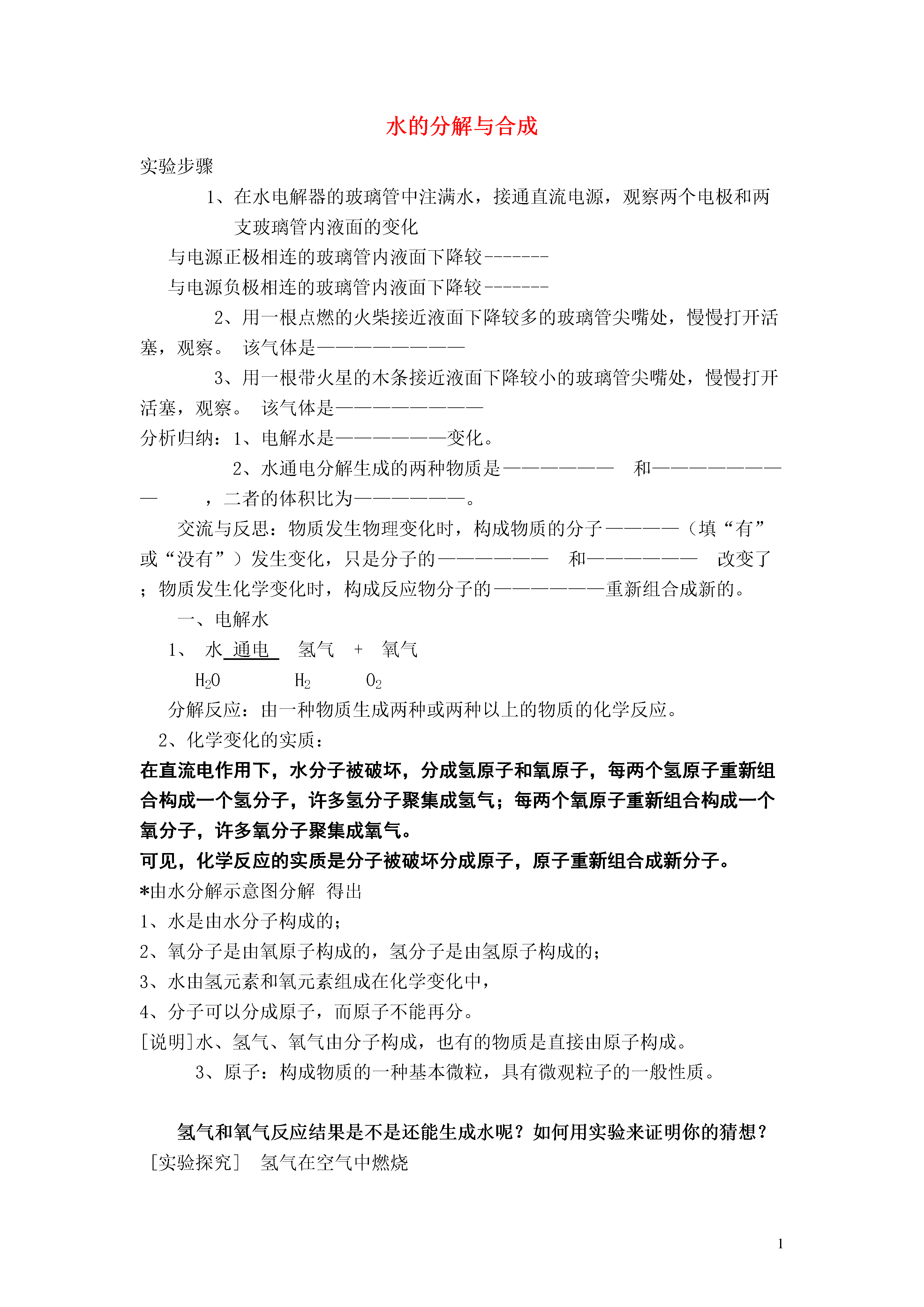 1水的分解与合成实验步骤在水电解器的玻璃管中注满水,接通直流电源,观察两个电极和两支玻璃管内液面的变化与电源正极相连的玻璃管内液面下降较-------与电源负极相连的玻璃管内液面下降较-------2、用一根点燃的火柴接近液面下降较多的玻璃管尖嘴处,慢慢打开活塞,观察。该气体是————————3、用一根带火星的木条接近液面下降较小的玻璃管尖嘴处,慢慢打开活塞,观察。该气体是————————分析归纳:1、电解水是——————变化。2、水通电分解生成的两种物质是——————和————————,二者的体积比为——————。交流与反思:物质发生物理变化时,构成物质的分子————(填“有”或“没有”)发生变化,只是分子的——————和——————改变了;物质发生化学变化时,构成反应物分子的——————重新组合成新的。一、电解水1、水通电氢气+氧气H2OH2O2分解反应:由一种物质生成两种或两种以上的物质的化学反应。2、化学变化的实质:在直流电作用下,水分子被破坏,分成氢原子和氧原子,每两个氢原子重新组合构成一个氢分子,许多氢分子聚集成氢气;每两个氧原子重新组合构成一个氧分子,许多氧分子聚集成氧气。可见,化学反应的实质是分子被破坏分成原子,原子重新组合成新分子。*由水分解示意图分解得出水是由水分子构成的;氧分子是由氧原子构成的,氢分子是由氢原子构成的;水由氢元素和氧元素组成在化学变化中,分子可以分成原子,而原子不能再分。[说明]水、氢气、氧气由分子构成,也有的物质是直接由原子构成。3、原子:构成物质的一种基本微粒,具有微观粒子的一般性质。氢气和氧气反应结果是不是还能生成水呢?如何用实验来证明你的猜想?[实验探究]氢气在空气中燃烧[观察]发生的现象,然后用手轻轻触摸烧杯[友情提示]本实验导管点火的一端不要用普通玻璃管,最好用铁管、铝管或瓷管、石英管,这样才能看到氢气燃烧时的淡兰色火焰。氢气+氧气→水H2O2H2O该反应是否是分解反应?化合反应:由两种或两种以上的物质生成一种物质的化学反应。从分子变化的角度分析氢气和氧气化合生成水的反应。化学反应的本质:分子分割为原子,原子重新组合成新的分子。化学性质:物质在化学变化中表现出来的性质。习题1、电解水的实验证明水是由()A、氢气和氧气组成B、氢原子与氧原子构成C、氢元素、氧元素组成的D、两个氢原子和一个氧原子构成的。2、有关水的叙述错误的是()A、水是无色无味的液体B、水在通常状况下很稳定,4℃时密度最大C、蒸馏水是最纯的水D、0℃时会形成冰、水的混合物3、电解水的实验时,看到的现象是()A、两极出都有气体生成,正极出气多B、正极出氧气,负极出氢气C、可以看到体积比VH2:VO2=2:1D、两极出都有气体生成,正极的玻璃管内汇集的气体可以使带火星的木条复然4、下列变化属于化合反应的是()A、把糖和水混合后形成糖水B、氢气在氧气中燃烧生成水C、水蒸气遇冷凝结成水D、3体积水和7体积酒精混合成70%的消毒酒精5.分子和原子的主要区别是()A.分子大、原子小B.分子间有间隔,原子间没有间隔C.在化学变化中,分子可以再分,而原子不可再分D.分子在不停运动,原子不运动6.乒乓球被踩瘪后,放到热水中又会重新鼓起来。其原因是()A.球内气体中微粒体积增大B.球内气体中微粒间空隙增大C.球内气体中微粒质量增大D.球内气体中微粒分解成更多微粒7、下列变化中分子发生改变的是.....................()A、水结冰B、蜡熔化C、水电解生成氢气和氧气D、酒精挥发8、下列说法不正确的是()A、分子,原子都是构成物质的一种粒子B、分子是由更小的粒子构成C、物质发生变化时,分子也一定发生变化D、固态物质分子间也存在空隙9、下列物质由原子直接构成的是:A、氢气B、氧气C、水D、铁10、下面的情况下一定会发生化学变化的是:A、产生气体B、氢气和氧气混合C、发光放热D、分子破坏原子重新组合11、下列属于分解反应的是:A、食盐水蒸发得到固体食盐B、电解水C、镁+氧气点燃氧化镁D、泥水沉降后分层1.从微观上看,水的三态变化其实改变的是,水分子的结构(“改变”或“没改变”)。2.用水电解器电解水,两支玻璃管内产生的气体(“一样多”或“不一样多”)。3.为了增强水的导电性,在电解水时可以向水中加入硫酸。4.做水通电分解实验时产生的体积较小的气体能是氧气,较大的气体能被是氢气。该反应的文字表达式为。5.分解反应指的是。6.水、氢气、氧气都是由构成的