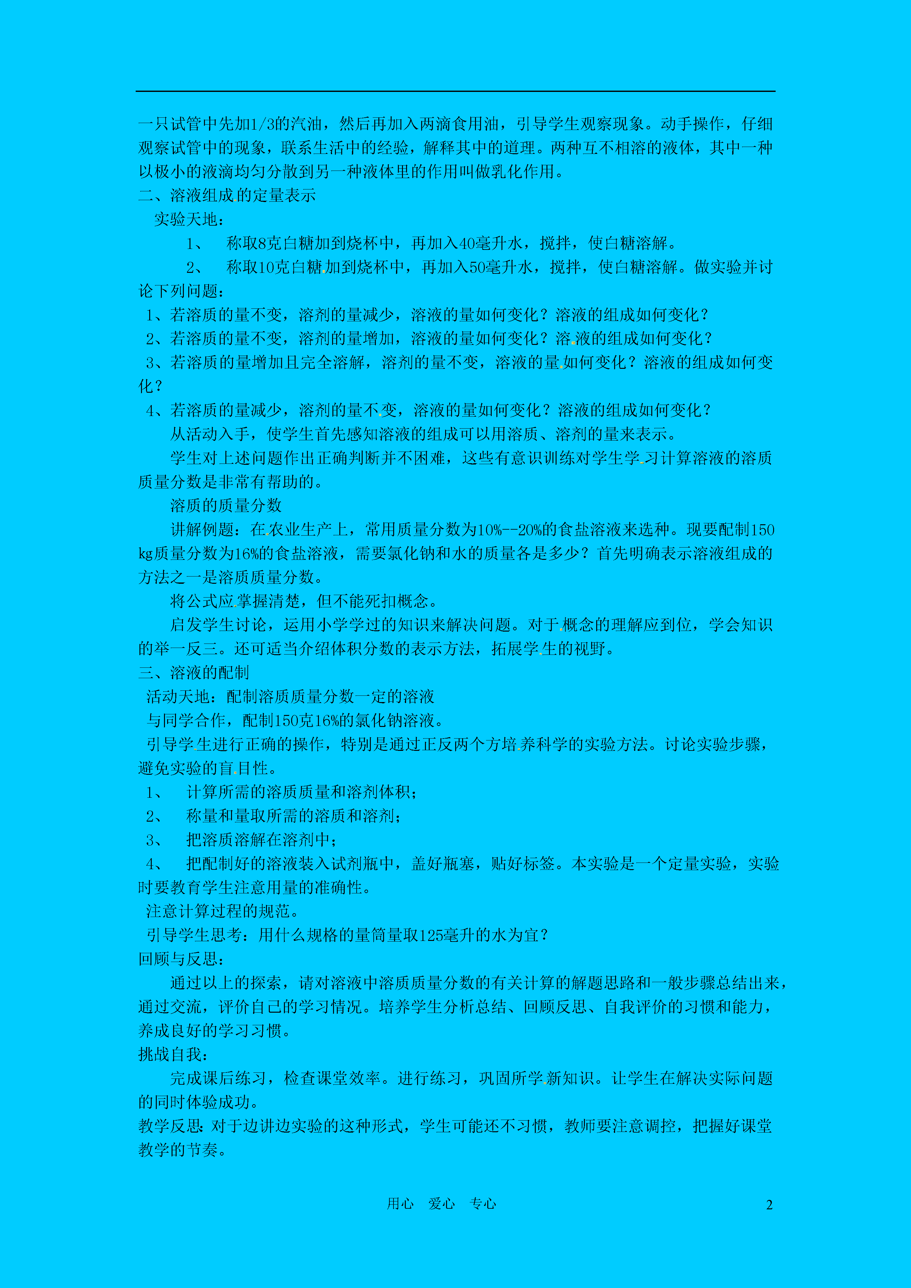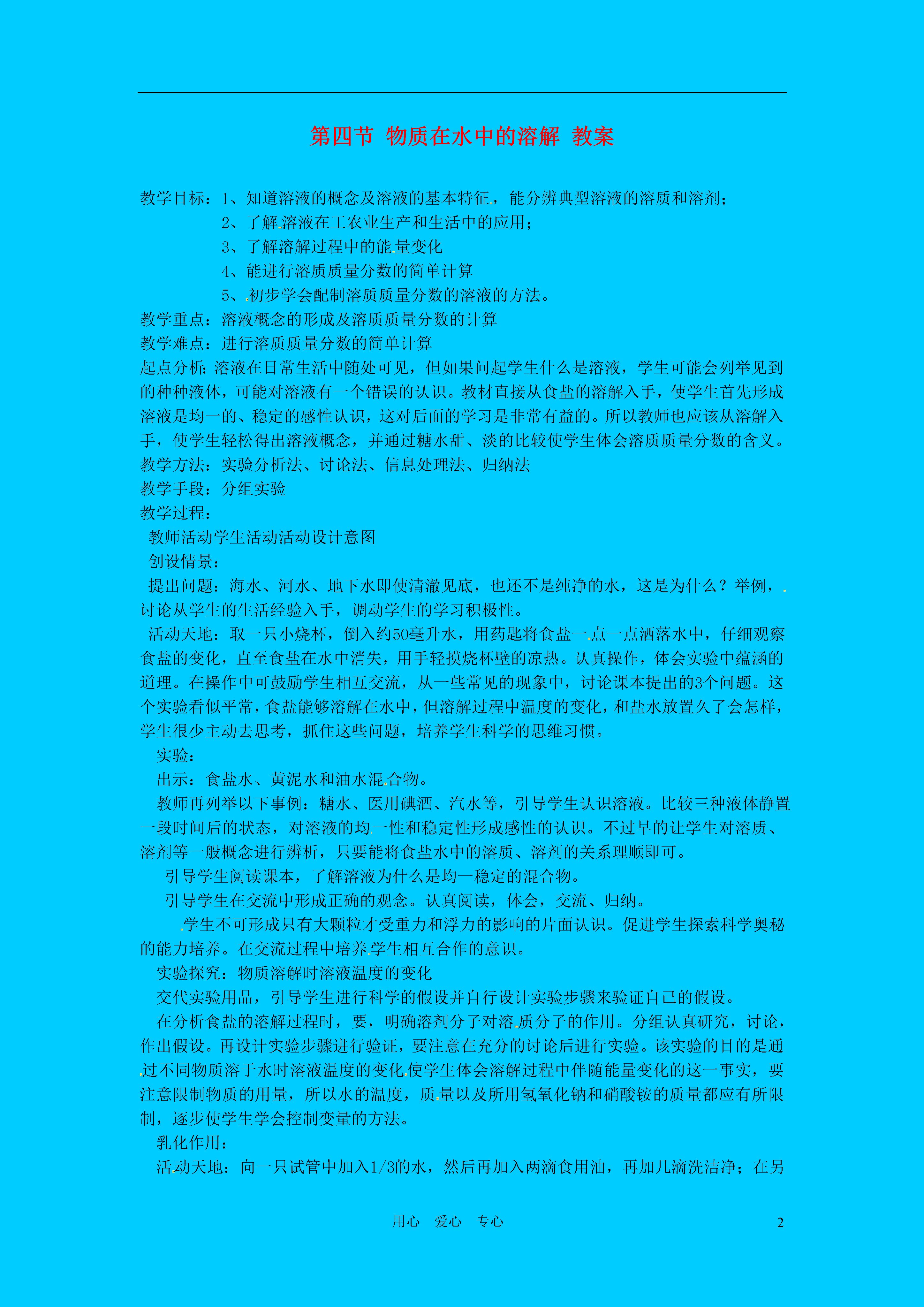 2用心爱心专心第四节物质在水中的溶解教案教学目标:1、知道溶液的概念及溶液的基本特征,能分辨典型溶液的溶质和溶剂;2、了解溶液在工农业生产和生活中的应用;3、了解溶解过程中的能量变化4、能进行溶质质量分数的简单计算5、初步学会配制溶质质量分数的溶液的方法。教学重点:溶液概念的形成及溶质质量分数的计算教学难点:进行溶质质量分数的简单计算起点分析:溶液在日常生活中随处可见,但如果问起学生什么是溶液,学生可能会列举见到的种种液体,可能对溶液有一个错误的认识。教材直接从食盐的溶解入手,使学生首先形成溶液是均一的、稳定的感性认识,这对后面的学习是非常有益的。所以教师也应该从溶解入手,使学生轻松得出溶液概念,并通过糖水甜、淡的比较使学生体会溶质质量分数的含义。教学方法:实验分析法、讨论法、信息处理法、归纳法教学手段:分组实验教学过程:教师活动学生活动活动设计意图创设情景:提出问题:海水、河水、地下水即使清澈见底,也还不是纯净的水,这是为什么?举例,讨论从学生的生活经验入手,调动学生的学习积极性。活动天地:取一只小烧杯,倒入约50毫升水,用药匙将食盐一点一点洒落水中,仔细观察食盐的变化,直至食盐在水中消失,用手轻摸烧杯壁的凉热。认真操作,体会实验中蕴涵的道理。在操作中可鼓励学生相互交流,从一些常见的现象中,讨论课本提出的3个问题。这个实验看似平常,食盐能够溶解在水中,但溶解过程中温度的变化,和盐水放置久了会怎样,学生很少主动去思考,抓住这些问题,培养学生科学的思维习惯。实验:出示:食盐水、黄泥水和油水混合物。教师再列举以下事例:糖水、医用碘酒、汽水等,引导学生认识溶液。比较三种液体静置一段时间后的状态,对溶液的均一性和稳定性形成感性的认识。不过早的让学生对溶质、溶剂等一般概念进行辨析,只要能将食盐水中的溶质、溶剂的关系理顺即可。引导学生阅读课本,了解溶液为什么是均一稳定的混合物。引导学生在交流中形成正确的观念。认真阅读,体会,交流、归纳。学生不可形成只有大颗粒才受重力和浮力的影响的片面认识。促进学生探索科学奥秘的能力培养。在交流过程中培养学生相互合作的意识。实验探究:物质溶解时溶液温度的变化交代实验用品,引导学生进行科学的假设并自行设计实验步骤来验证自己的假设。在分析食盐的溶解过程时,要,明确溶剂分子对溶质分子的作用。分组认真研究,讨论,作出假设。再设计实验步骤进行验证,要注意在充分的讨论后进行实验。该实验的目的是通过不同物质溶于水时溶液温度的变化使学生体会溶解过程中伴随能量变化的这一事实,要注意限制物质的用量,所以水的温度,质量以及所用氢氧化钠和硝酸铵的质量都应有所限制,逐步使学生学会控制变量的方法。乳化作用:活动天地:向一只试管中加入1/3的水,然后再加入两滴食用油,再加几滴洗洁净;在另一只试管中先加1/3的汽油,然后再加入两滴食用油,引导学生观察现象。动手操作,仔细观察试管中的现象,联系生活中的经验,解释其中的道理。两种互不相溶的液体,其中一种以极小的液滴均匀分散到另一种液体里的作用叫做乳化作用。二、溶液组成的定量表示实验天地:1、称取8克白糖加到烧杯中,再加入40毫升水,搅拌,使白糖溶解。2、称取10克白糖加到烧杯中,再加入50毫升水,搅拌,使白糖溶解。做实验并讨论下列问题:1、若溶质的量不变,溶剂的量减少,溶液的量如何变化?溶液的组成如何变化?2、若溶质的量不变,溶剂的量增加,溶液的量如何变化?溶液的组成如何变化?3、若溶质的量增加且完全溶解,溶剂的量不变,溶液的量如何变化?溶液的组成如何变化?4、若溶质的量减少,溶剂的量不变,溶液的量如何变化?溶液的组成如何变化?从活动入手,使学生首先感知溶液的组成可以用溶质、溶剂的量来表示。学生对上述问题作出正确判断并不困难,这些有意识训练对学生学习计算溶液的溶质质量分数是非常有帮助的。溶质的质量分数讲解例题:在农业生产上,常用质量分数为10%--20%的食盐溶液来选种。现要配制150㎏质量分数为16%的食盐溶液,需要氯化钠和水的质量各是多少?首先明确表示溶液组成的方法之一是溶质质量分数。将公式应掌握清楚,但不能死扣概念。启发学生讨论,运用小学学过的知识来解决问题。对于概念的理解应到位,学会知识的举一反三。还可适当介绍体积分数的表示方法,拓展学生的视野。三、溶液的配制活动天地:配制溶质质量分数一定的溶液与同学合作,配制150克16%的氯化钠溶液。引导学生进行正确的操作,特别是通过正反两个方培养科学的实验方法。讨论实验步骤,避免实验的盲目性。1、计算所需的溶质质量和溶剂体积;2、称量和量取所需的溶质和溶剂;3、把溶质溶解在溶剂中;4、把配制好的溶液装入试剂瓶中,盖好瓶塞,贴好标签。本