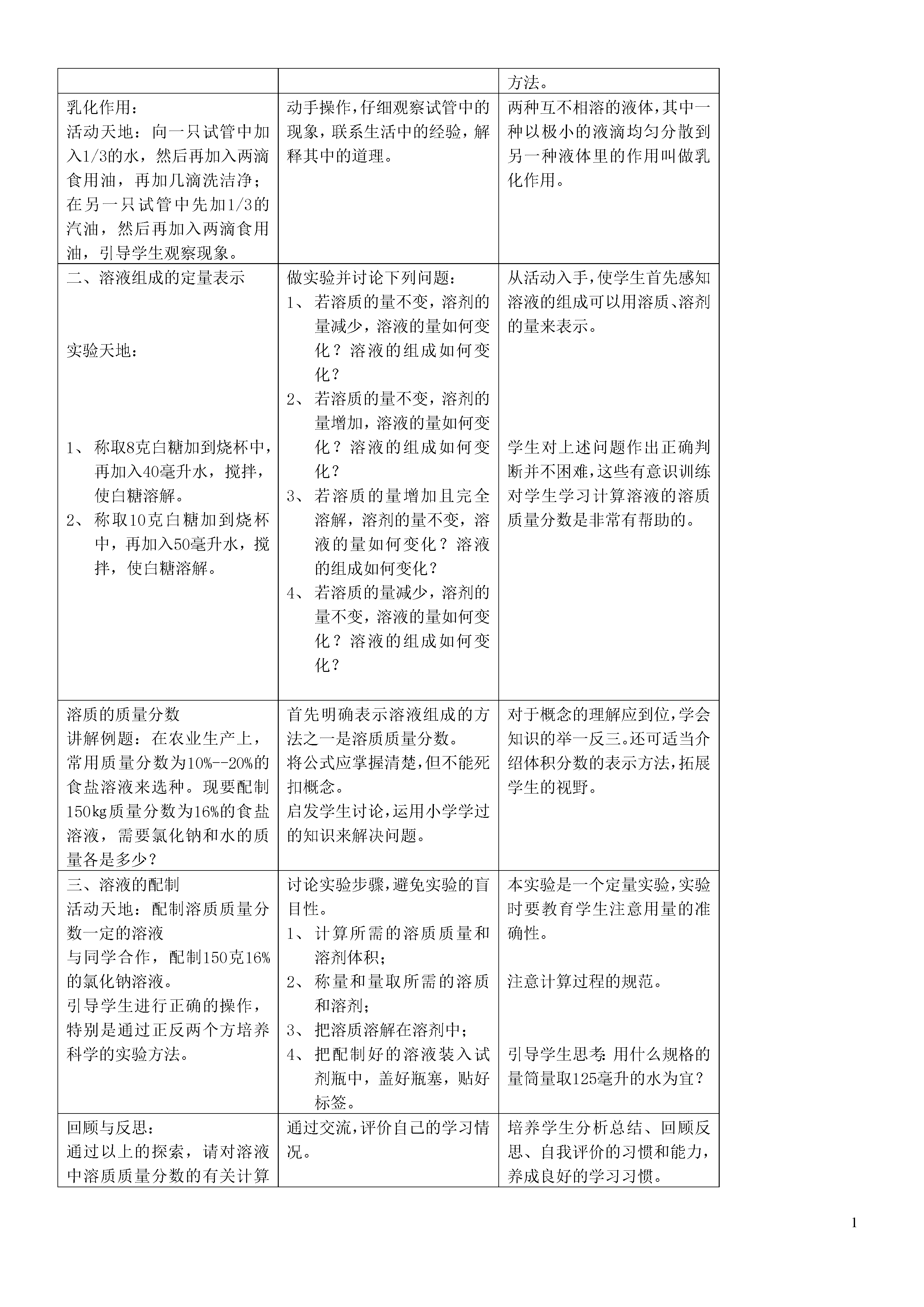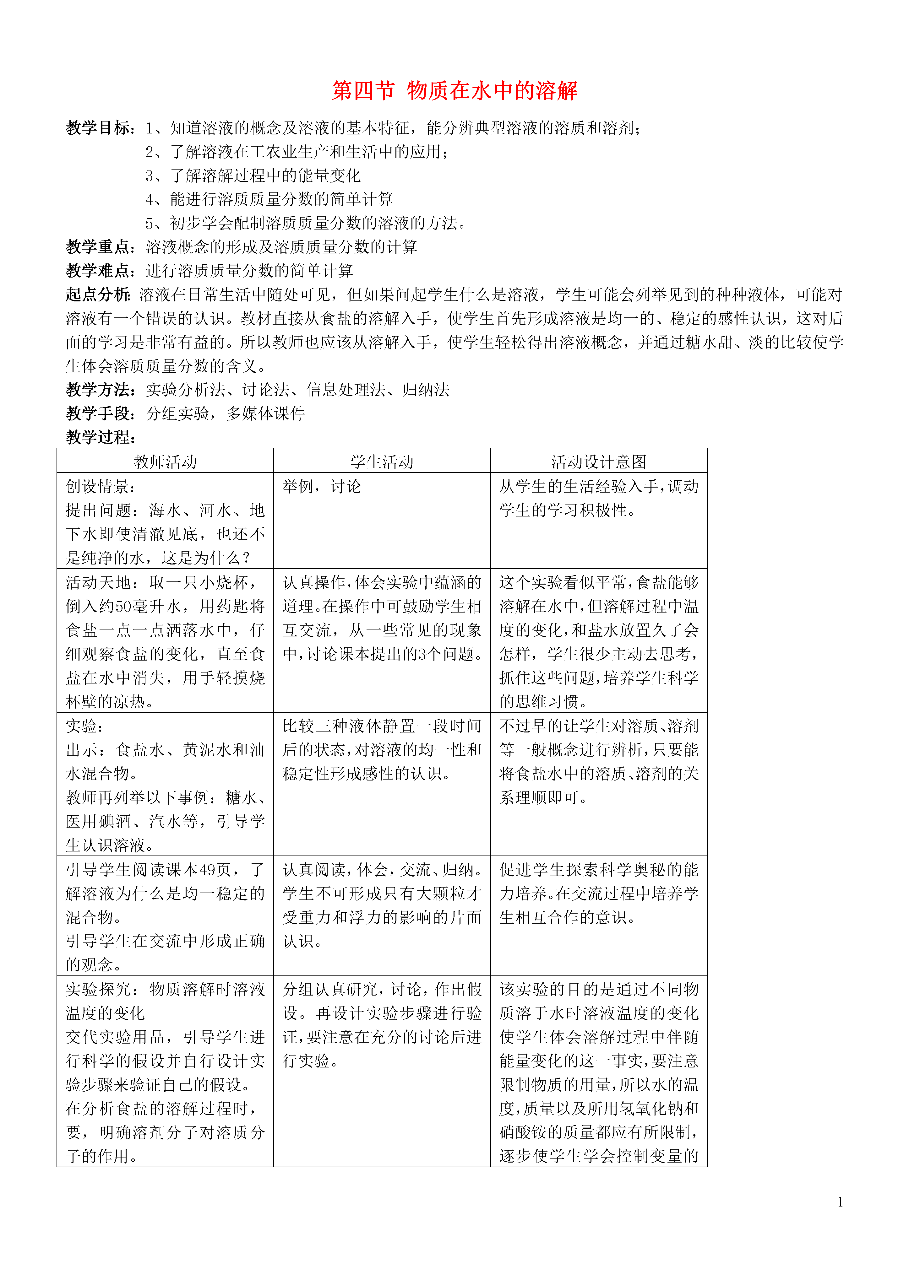 1第四节物质在水中的溶解教学目标:1、知道溶液的概念及溶液的基本特征,能分辨典型溶液的溶质和溶剂;2、了解溶液在工农业生产和生活中的应用;3、了解溶解过程中的能量变化4、能进行溶质质量分数的简单计算5、初步学会配制溶质质量分数的溶液的方法。教学重点:溶液概念的形成及溶质质量分数的计算教学难点:进行溶质质量分数的简单计算起点分析:溶液在日常生活中随处可见,但如果问起学生什么是溶液,学生可能会列举见到的种种液体,可能对溶液有一个错误的认识。教材直接从食盐的溶解入手,使学生首先形成溶液是均一的、稳定的感性认识,这对后面的学习是非常有益的。所以教师也应该从溶解入手,使学生轻松得出溶液概念,并通过糖水甜、淡的比较使学生体会溶质质量分数的含义。教学方法:实验分析法、讨论法、信息处理法、归纳法教学手段:分组实验,多媒体课件教学过程:教师活动学生活动活动设计意图创设情景:提出问题:海水、河水、地下水即使清澈见底,也还不是纯净的水,这是为什么?举例,讨论从学生的生活经验入手,调动学生的学习积极性。活动天地:取一只小烧杯,倒入约50毫升水,用药匙将食盐一点一点洒落水中,仔细观察食盐的变化,直至食盐在水中消失,用手轻摸烧杯壁的凉热。认真操作,体会实验中蕴涵的道理。在操作中可鼓励学生相互交流,从一些常见的现象中,讨论课本提出的3个问题。这个实验看似平常,食盐能够溶解在水中,但溶解过程中温度的变化,和盐水放置久了会怎样,学生很少主动去思考,抓住这些问题,培养学生科学的思维习惯。实验:出示:食盐水、黄泥水和油水混合物。教师再列举以下事例:糖水、医用碘酒、汽水等,引导学生认识溶液。比较三种液体静置一段时间后的状态,对溶液的均一性和稳定性形成感性的认识。不过早的让学生对溶质、溶剂等一般概念进行辨析,只要能将食盐水中的溶质、溶剂的关系理顺即可。引导学生阅读课本49页,了解溶液为什么是均一稳定的混合物。引导学生在交流中形成正确的观念。认真阅读,体会,交流、归纳。学生不可形成只有大颗粒才受重力和浮力的影响的片面认识。促进学生探索科学奥秘的能力培养。在交流过程中培养学生相互合作的意识。实验探究:物质溶解时溶液温度的变化交代实验用品,引导学生进行科学的假设并自行设计实验步骤来验证自己的假设。在分析食盐的溶解过程时,要,明确溶剂分子对溶质分子的作用。分组认真研究,讨论,作出假设。再设计实验步骤进行验证,要注意在充分的讨论后进行实验。该实验的目的是通过不同物质溶于水时溶液温度的变化使学生体会溶解过程中伴随能量变化的这一事实,要注意限制物质的用量,所以水的温度,质量以及所用氢氧化钠和硝酸铵的质量都应有所限制,逐步使学生学会控制变量的方法。乳化作用:活动天地:向一只试管中加入1/3的水,然后再加入两滴食用油,再加几滴洗洁净;在另一只试管中先加1/3的汽油,然后再加入两滴食用油,引导学生观察现象。动手操作,仔细观察试管中的现象,联系生活中的经验,解释其中的道理。两种互不相溶的液体,其中一种以极小的液滴均匀分散到另一种液体里的作用叫做乳化作用。二、溶液组成的定量表示实验天地:1、称取8克白糖加到烧杯中,再加入40毫升水,搅拌,使白糖溶解。2、称取10克白糖加到烧杯中,再加入50毫升水,搅拌,使白糖溶解。做实验并讨论下列问题:1、若溶质的量不变,溶剂的量减少,溶液的量如何变化?溶液的组成如何变化?2、若溶质的量不变,溶剂的量增加,溶液的量如何变化?溶液的组成如何变化?3、若溶质的量增加且完全溶解,溶剂的量不变,溶液的量如何变化?溶液的组成如何变化?4、若溶质的量减少,溶剂的量不变,溶液的量如何变化?溶液的组成如何变化?从活动入手,使学生首先感知溶液的组成可以用溶质、溶剂的量来表示。学生对上述问题作出正确判断并不困难,这些有意识训练对学生学习计算溶液的溶质质量分数是非常有帮助的。溶质的质量分数讲解例题:在农业生产上,常用质量分数为10%--20%的食盐溶液来选种。现要配制150㎏质量分数为16%的食盐溶液,需要氯化钠和水的质量各是多少?首先明确表示溶液组成的方法之一是溶质质量分数。将公式应掌握清楚,但不能死扣概念。启发学生讨论,运用小学学过的知识来解决问题。对于概念的理解应到位,学会知识的举一反三。还可适当介绍体积分数的表示方法,拓展学生的视野。三、溶液的配制活动天地:配制溶质质量分数一定的溶液与同学合作,配制150克16%的氯化钠溶液。引导学生进行正确的操作,特别是通过正反两个方培养科学的实验方法。讨论实验步骤,避免实验的盲目性。1、计算所需的溶质质量和溶剂体积;2、称量和量取所需的溶质和溶剂;3、把溶质溶解在溶剂中;4、把配制好的溶液装入试剂瓶中,盖好瓶塞,贴好标签。本