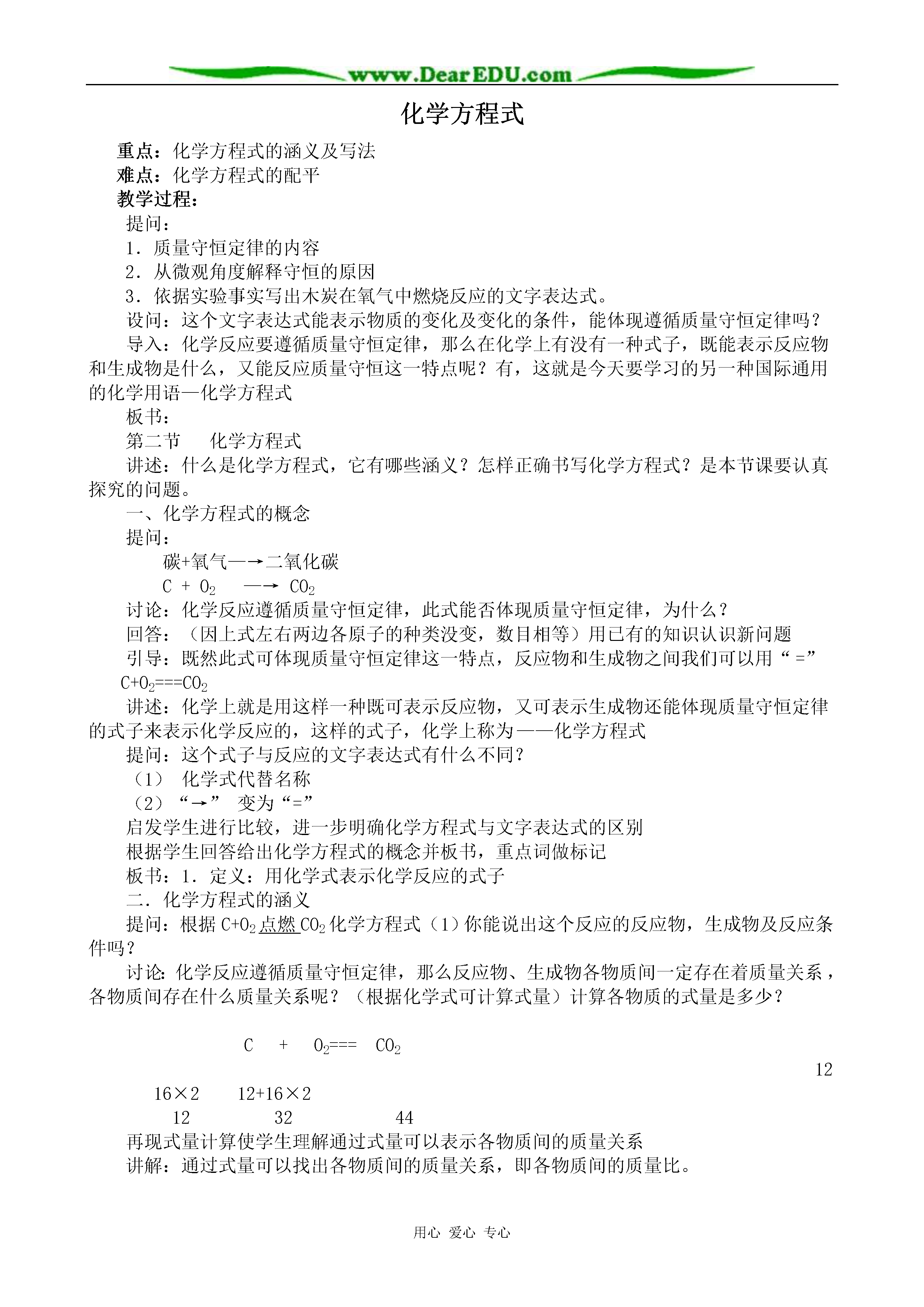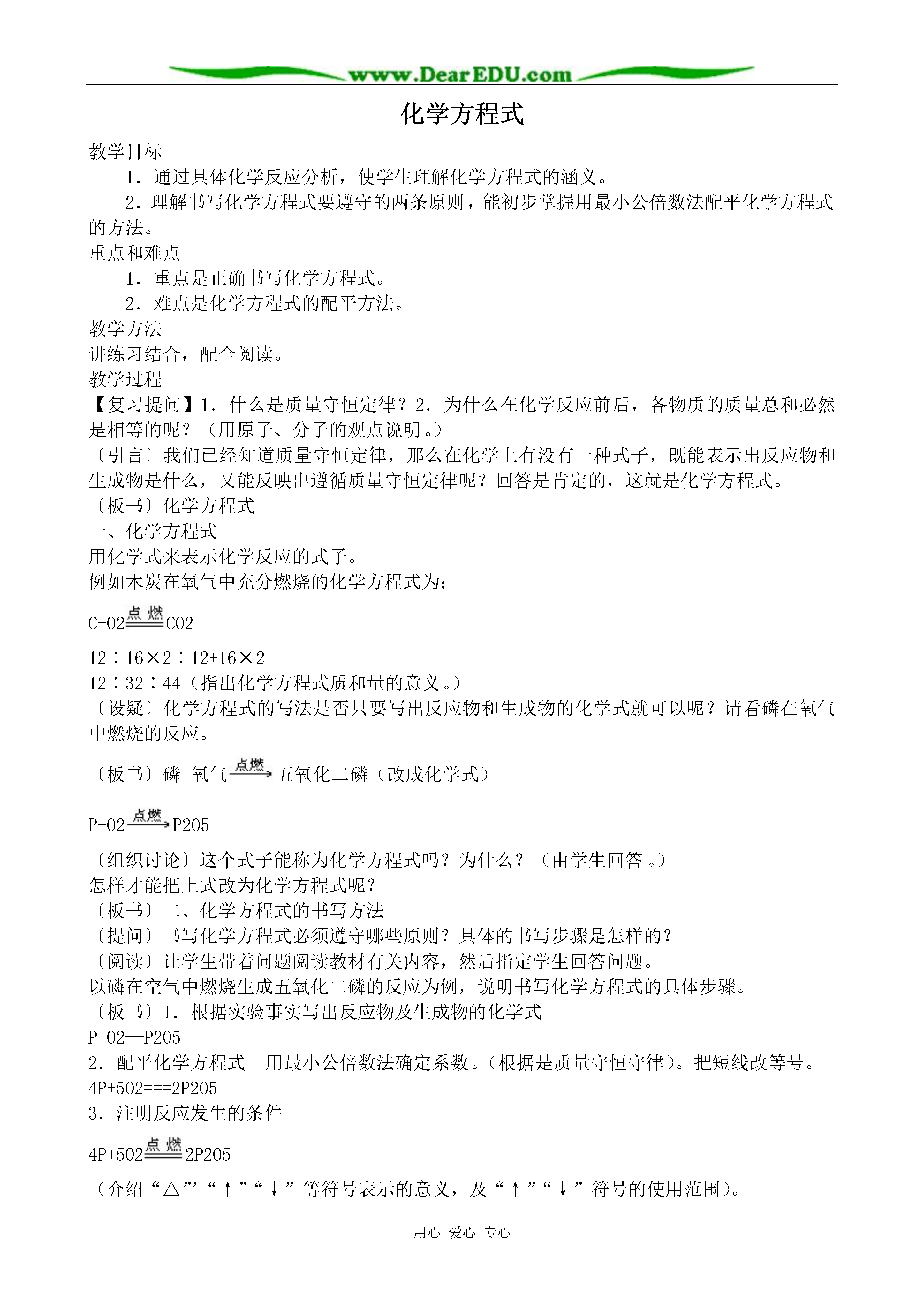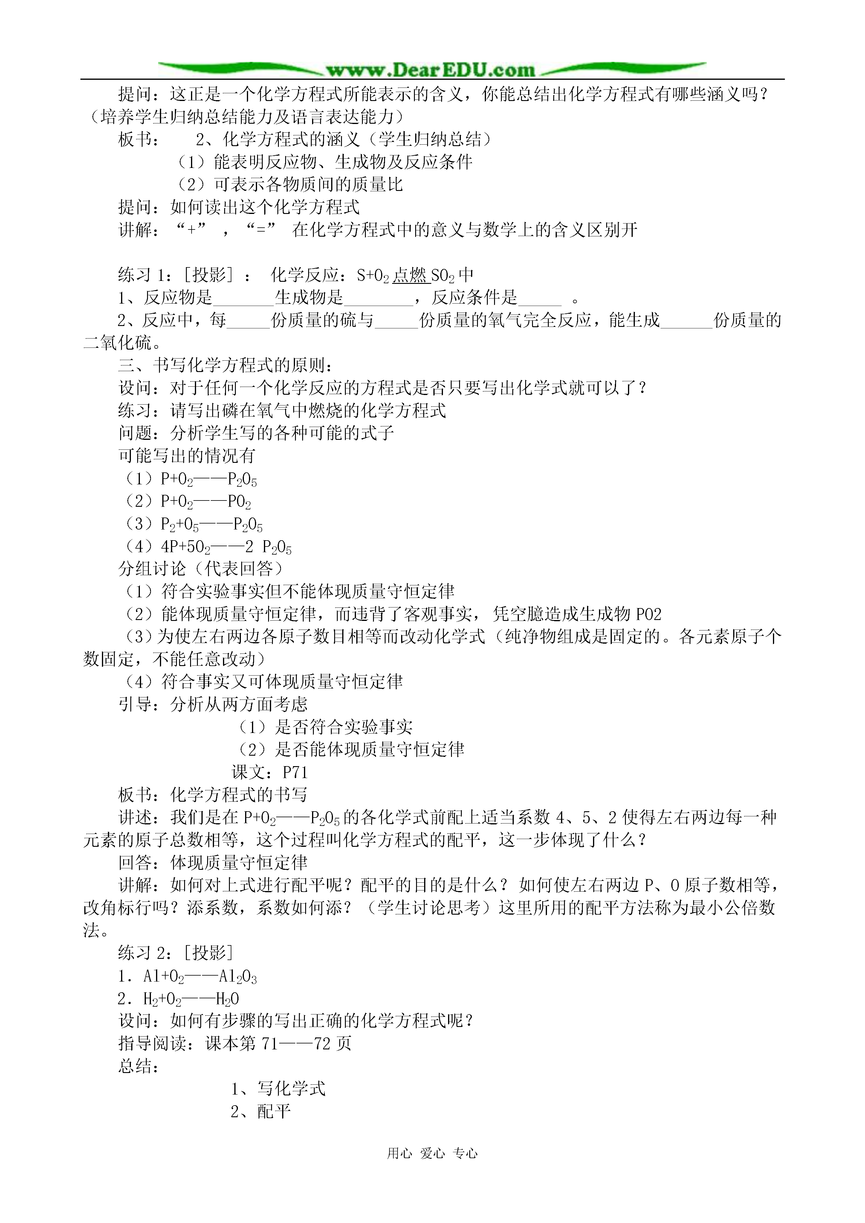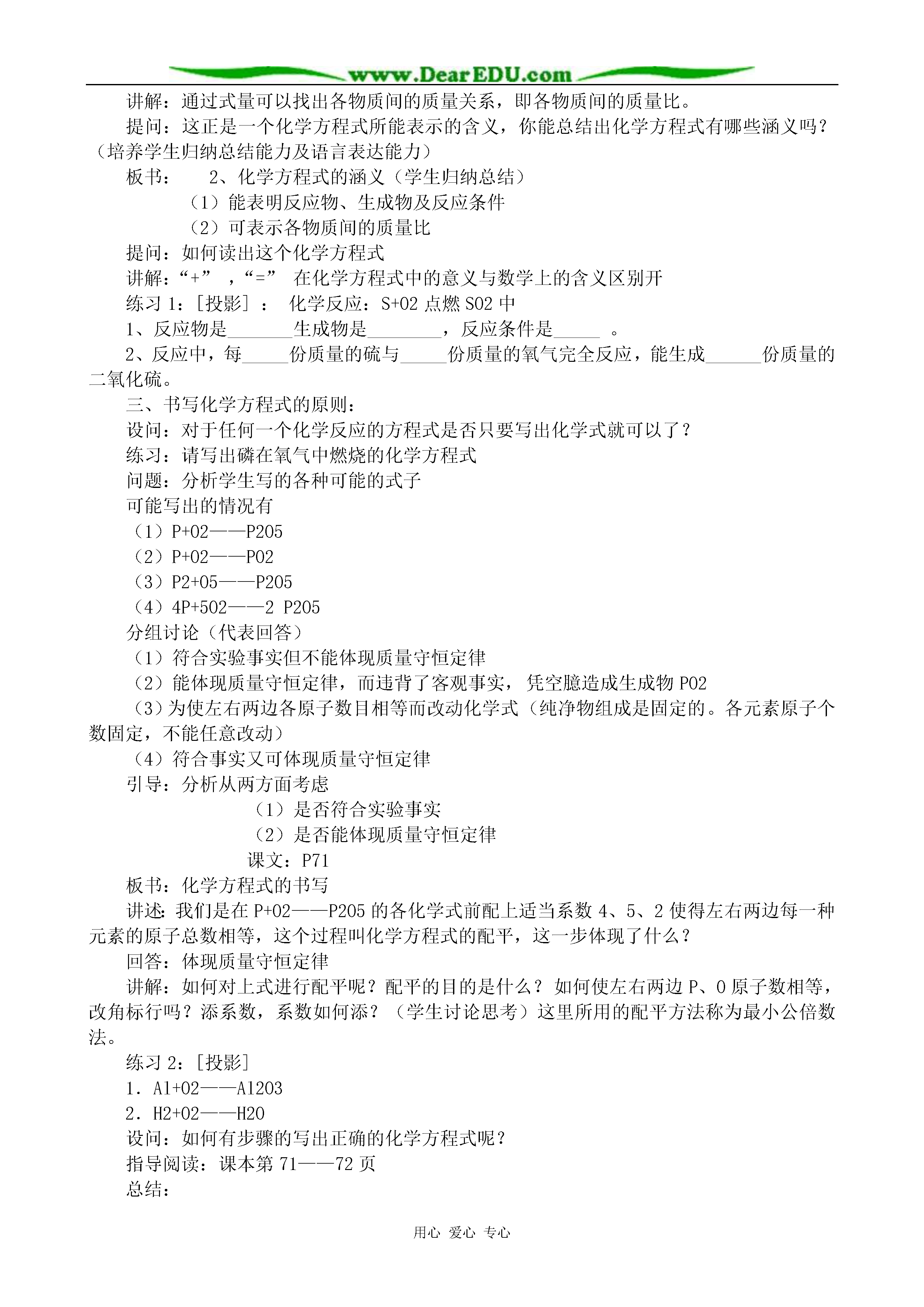 用心爱心专心化学方程式重点:化学方程式的涵义及写法难点:化学方程式的配平教学过程:提问:1.质量守恒定律的内容2.从微观角度解释守恒的原因3.依据实验事实写出木炭在氧气中燃烧反应的文字表达式。设问:这个文字表达式能表示物质的变化及变化的条件,能体现遵循质量守恒定律吗?导入:化学反应要遵循质量守恒定律,那么在化学上有没有一种式子,既能表示反应物和生成物是什么,又能反应质量守恒这一特点呢?有,这就是今天要学习的另一种国际通用的化学用语—化学方程式板书:第二节化学方程式讲述:什么是化学方程式,它有哪些涵义?怎样正确书写化学方程式?是本节课要认真探究的问题。一、化学方程式的概念提问:碳+氧气—→二氧化碳C+O2—→CO2讨论:化学反应遵循质量守恒定律,此式能否体现质量守恒定律,为什么?回答:(因上式左右两边各原子的种类没变,数目相等)用已有的知识认识新问题引导:既然此式可体现质量守恒定律这一特点,反应物和生成物之间我们可以用“=”C+O2===CO2讲述:化学上就是用这样一种既可表示反应物,又可表示生成物还能体现质量守恒定律的式子来表示化学反应的,这样的式子,化学上称为——化学方程式提问:这个式子与反应的文字表达式有什么不同?(1)化学式代替名称(2)“→”变为“=”启发学生进行比较,进一步明确化学方程式与文字表达式的区别根据学生回答给出化学方程式的概念并板书,重点词做标记板书:1.定义:用化学式表示化学反应的式子二.化学方程式的涵义提问:根据C+O2点燃CO2化学方程式(1)你能说出这个反应的反应物,生成物及反应条件吗?讨论:化学反应遵循质量守恒定律,那么反应物、生成物各物质间一定存在着质量关系,各物质间存在什么质量关系呢?(根据化学式可计算式量)计算各物质的式量是多少?C+O2===CO21216×212+16×2123244再现式量计算使学生理解通过式量可以表示各物质间的质量关系讲解:通过式量可以找出各物质间的质量关系,即各物质间的质量比。提问:这正是一个化学方程式所能表示的含义,你能总结出化学方程式有哪些涵义吗?(培养学生归纳总结能力及语言表达能力)板书:2、化学方程式的涵义(学生归纳总结)(1)能表明反应物、生成物及反应条件(2)可表示各物质间的质量比提问:如何读出这个化学方程式讲解:“+”,“=”在化学方程式中的意义与数学上的含义区别开练习1:[投影]:化学反应:S+O2点燃SO2中1、反应物是_______生成物是________,反应条件是_____。2、反应中,每_____份质量的硫与_____份质量的氧气完全反应,能生成______份质量的二氧化硫。三、书写化学方程式的原则:设问:对于任何一个化学反应的方程式是否只要写出化学式就可以了?练习:请写出磷在氧气中燃烧的化学方程式问题:分析学生写的各种可能的式子可能写出的情况有(1)P+O2——P2O5(2)P+O2——PO2(3)P2+O5——P2O5(4)4P+5O2——2P2O5分组讨论(代表回答)(1)符合实验事实但不能体现质量守恒定律(2)能体现质量守恒定律,而违背了客观事实,凭空臆造成生成物PO2(3)为使左右两边各原子数目相等而改动化学式(纯净物组成是固定的。各元素原子个数固定,不能任意改动)(4)符合事实又可体现质量守恒定律引导:分析从两方面考虑(1)是否符合实验事实(2)是否能体现质量守恒定律课文:P71板书:化学方程式的书写讲述:我们是在P+O2——P2O5的各化学式前配上适当系数4、5、2使得左右两边每一种元素的原子总数相等,这个过程叫化学方程式的配平,这一步体现了什么?回答:体现质量守恒定律讲解:如何对上式进行配平呢?配平的目的是什么?如何使左右两边P、O原子数相等,改角标行吗?添系数,系数如何添?(学生讨论思考)这里所用的配平方法称为最小公倍数法。练习2:[投影]1.Al+O2——Al2O32.H2+O2——H2O设问:如何有步骤的写出正确的