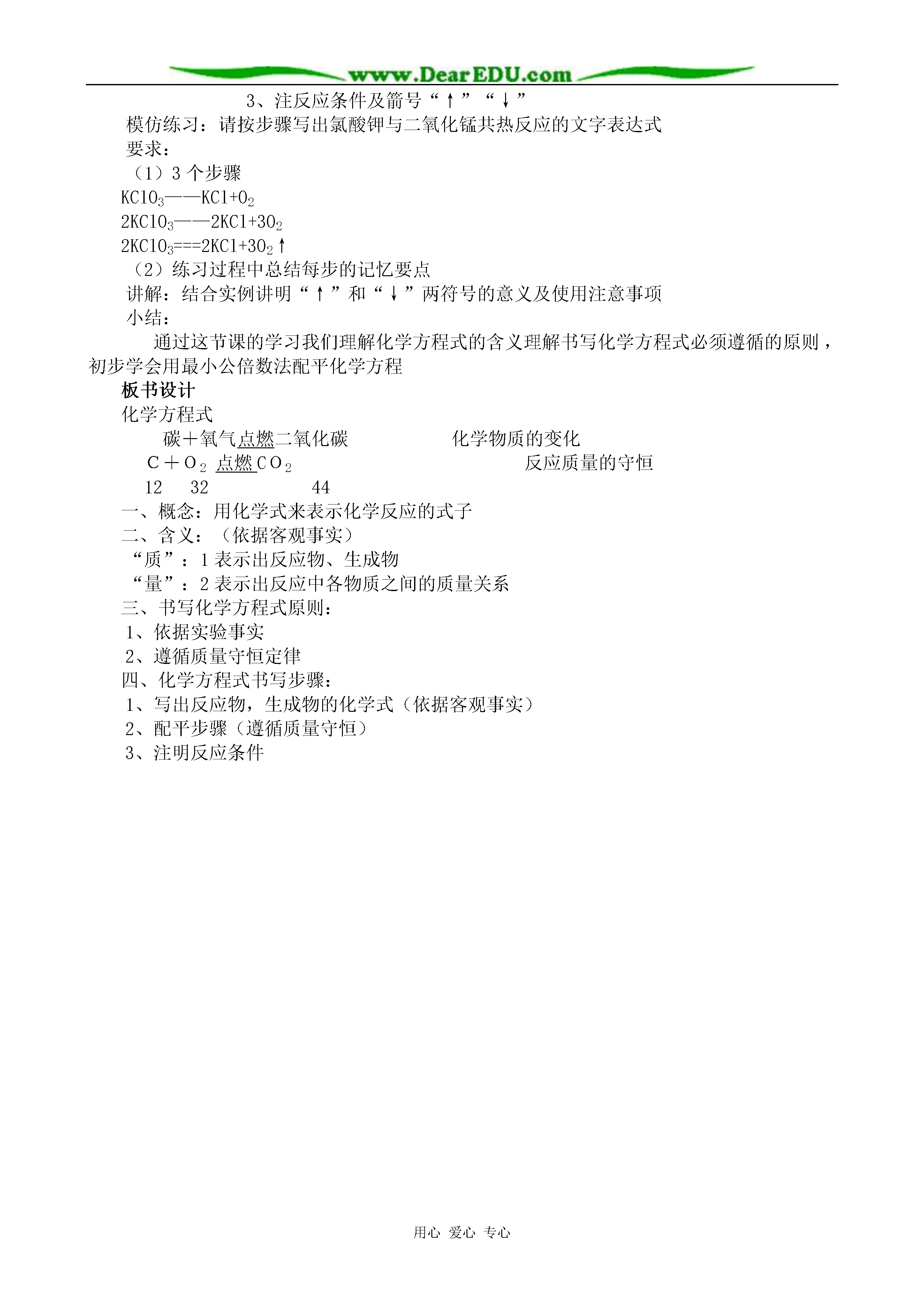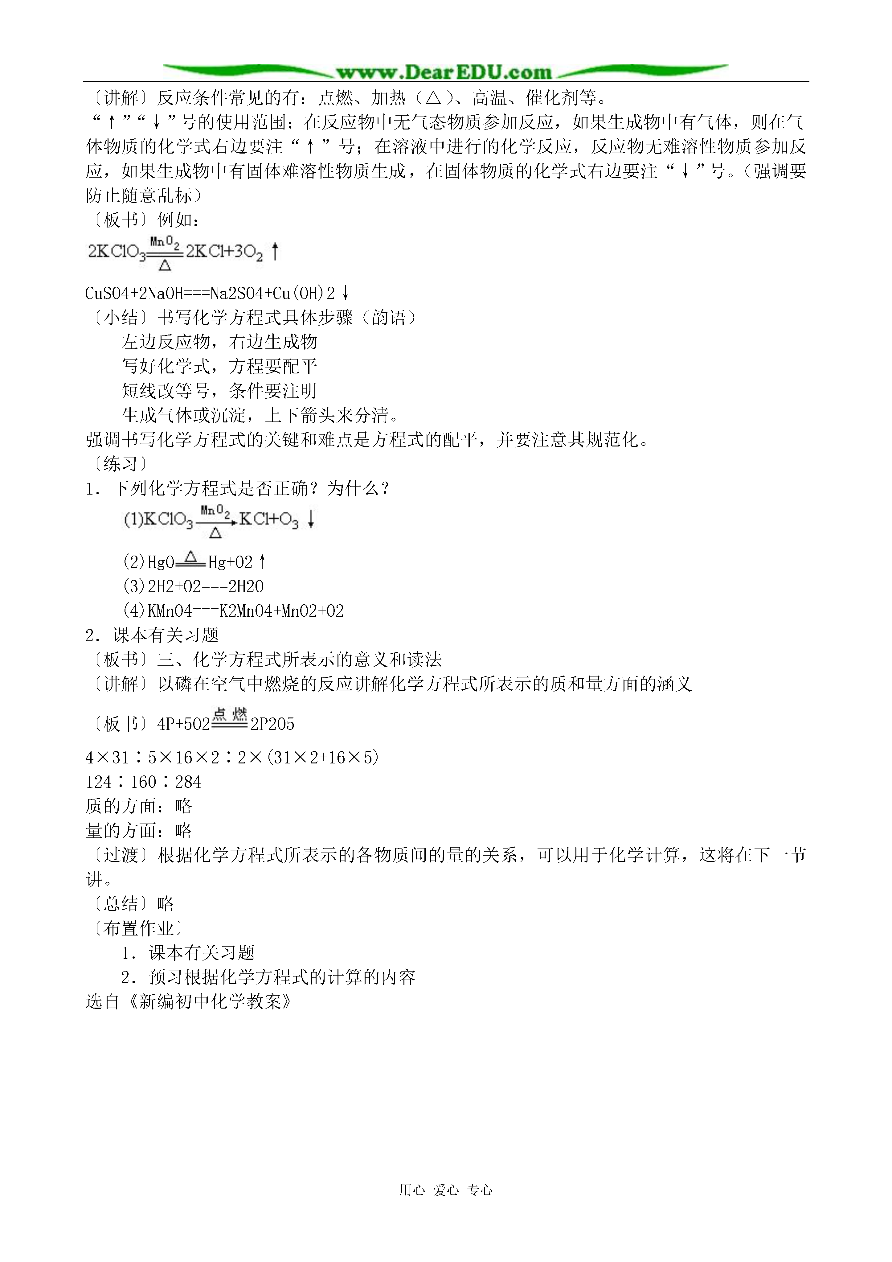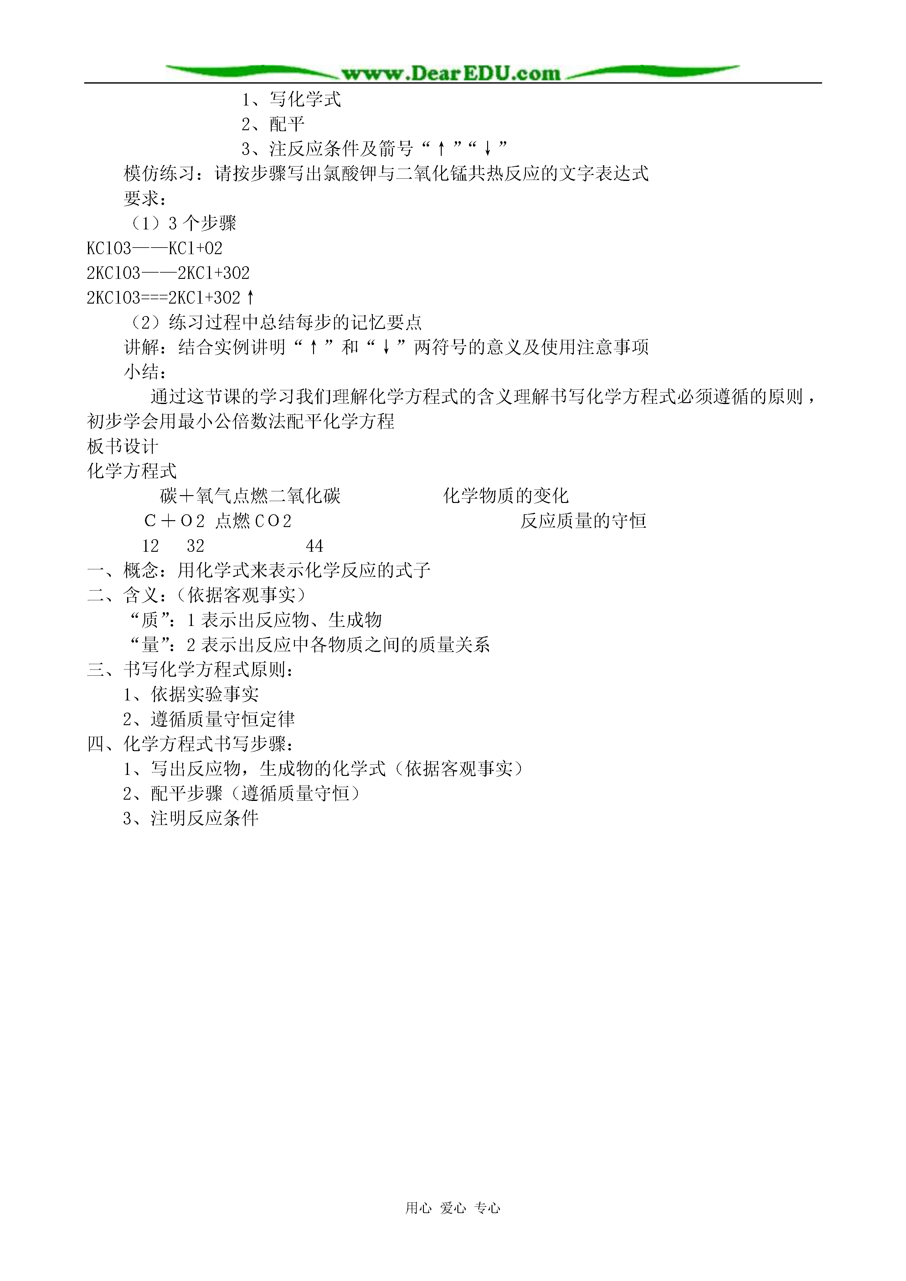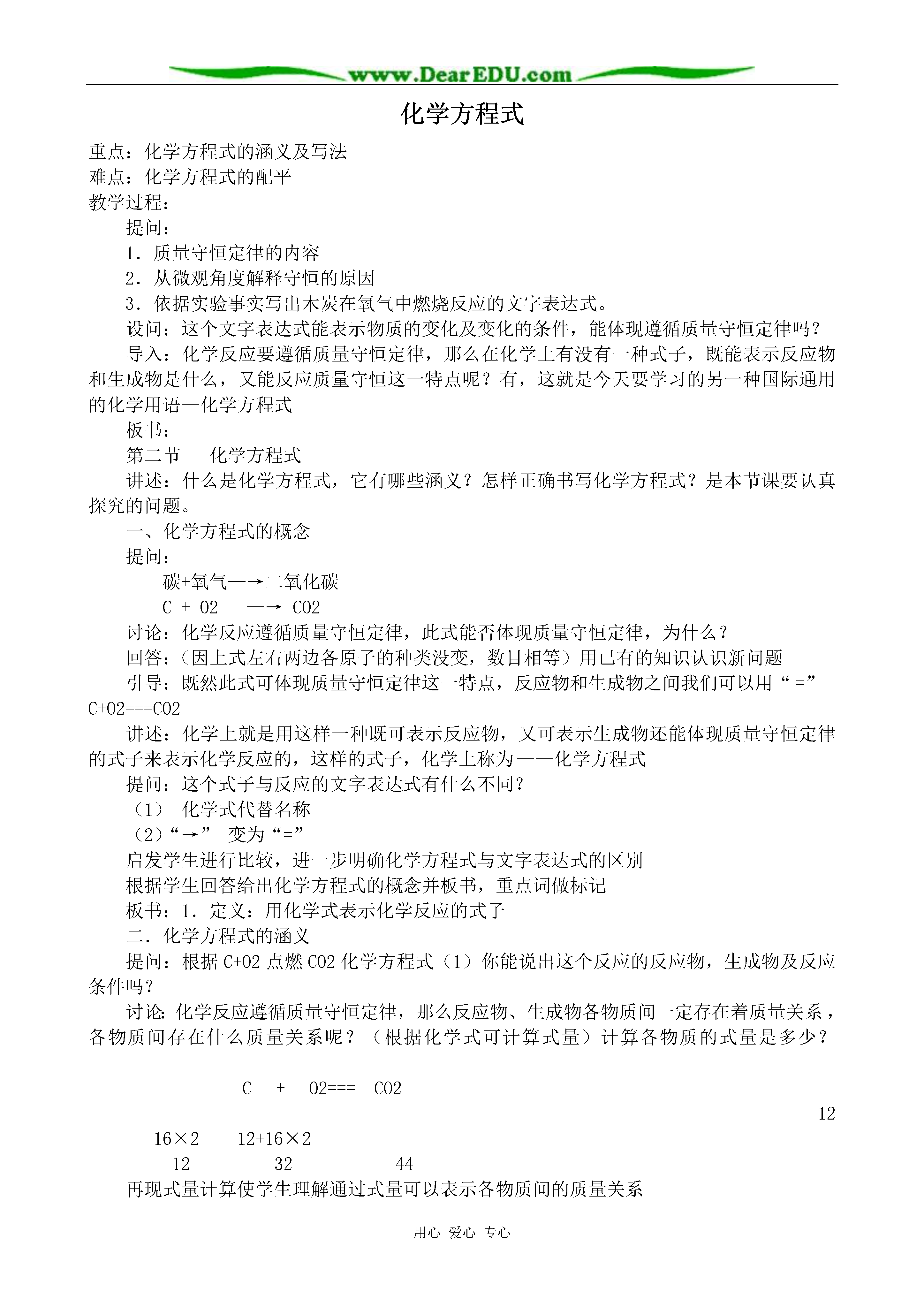用心爱心专心化学方程式重点:化学方程式的涵义及写法难点:化学方程式的配平教学过程:提问:1.质量守恒定律的内容2.从微观角度解释守恒的原因3.依据实验事实写出木炭在氧气中燃烧反应的文字表达式。设问:这个文字表达式能表示物质的变化及变化的条件,能体现遵循质量守恒定律吗?导入:化学反应要遵循质量守恒定律,那么在化学上有没有一种式子,既能表示反应物和生成物是什么,又能反应质量守恒这一特点呢?有,这就是今天要学习的另一种国际通用的化学用语—化学方程式板书:第二节化学方程式讲述:什么是化学方程式,它有哪些涵义?怎样正确书写化学方程式?是本节课要认真探究的问题。一、化学方程式的概念提问:碳+氧气—→二氧化碳C+O2—→CO2讨论:化学反应遵循质量守恒定律,此式能否体现质量守恒定律,为什么?回答:(因上式左右两边各原子的种类没变,数目相等)用已有的知识认识新问题引导:既然此式可体现质量守恒定律这一特点,反应物和生成物之间我们可以用“=”C+O2===CO2讲述:化学上就是用这样一种既可表示反应物,又可表示生成物还能体现质量守恒定律的式子来表示化学反应的,这样的式子,化学上称为——化学方程式提问:这个式子与反应的文字表达式有什么不同?(1)化学式代替名称(2)“→”变为“=”启发学生进行比较,进一步明确化学方程式与文字表达式的区别根据学生回答给出化学方程式的概念并板书,重点词做标记板书:1.定义:用化学式表示化学反应的式子二.化学方程式的涵义提问:根据C+O2点燃CO2化学方程式(1)你能说出这个反应的反应物,生成物及反应条件吗?讨论:化学反应遵循质量守恒定律,那么反应物、生成物各物质间一定存在着质量关系,各物质间存在什么质量关系呢?(根据化学式可计算式量)计算各物质的式量是多少?C+O2===CO21216×212+16×2123244再现式量计算使学生理解通过式量可以表示各物质间的质量关系讲解:通过式量可以找出各物质间的质量关系,即各物质间的质量比。提问:这正是一个化学方程式所能表示的含义,你能总结出化学方程式有哪些涵义吗?(培养学生归纳总结能力及语言表达能力)板书:2、化学方程式的涵义(学生归纳总结)(1)能表明反应物、生成物及反应条件(2)可表示各物质间的质量比提问:如何读出这个化学方程式讲解:“+”,“=”在化学方程式中的意义与数学上的含义区别开练习1:[投影]:化学反应:S+O2点燃SO2中1、反应物是_______生成物是________,反应条件是_____。2、反应中,每_____份质量的硫与_____份质量的氧气完全反应,能生成______份质量的二氧化硫。三、书写化学方程式的原则:设问:对于任何一个化学反应的方程式是否只要写出化学式就可以了?练习:请写出磷在氧气中燃烧的化学方程式问题:分析学生写的各种可能的式子可能写出的情况有(1)P+O2——P2O5(2)P+O2——PO2(3)P2+O5——P2O5(4)4P+5O2——2P2O5分组讨论(代表回答)(1)符合实验事实但不能体现质量守恒定律(2)能体现质量守恒定律,而违背了客观事实,凭空臆造成生成物PO2(3)为使左右两边各原子数目相等而改动化学式(纯净物组成是固定的。各元素原子个数固定,不能任意改动)(4)符合事实又可体现质量守恒定律引导:分析从两方面考虑(1)是否符合实验事实(2)是否能体现质量守恒定律课文:P71板书:化学方程式的书写讲述:我们是在P+O2——P2O5的各化学式前配上适当系数4、5、2使得左右两边每一种元素的原子总数相等,这个过程叫化学方程式的配平,这一步体现了什么?回答:体现质量守恒定律讲解:如何对上式进行配平呢?配平的目的是什么?如何使左右两边P、O原子数相等,改角标行吗?添系数,系数如何添?(学生讨论思考)这里所用的配平方法称为最小公倍数法。练习2:[投影]1.Al+O2——Al2O32.H2+O2——H2O设问:如何有步骤的写出正确的