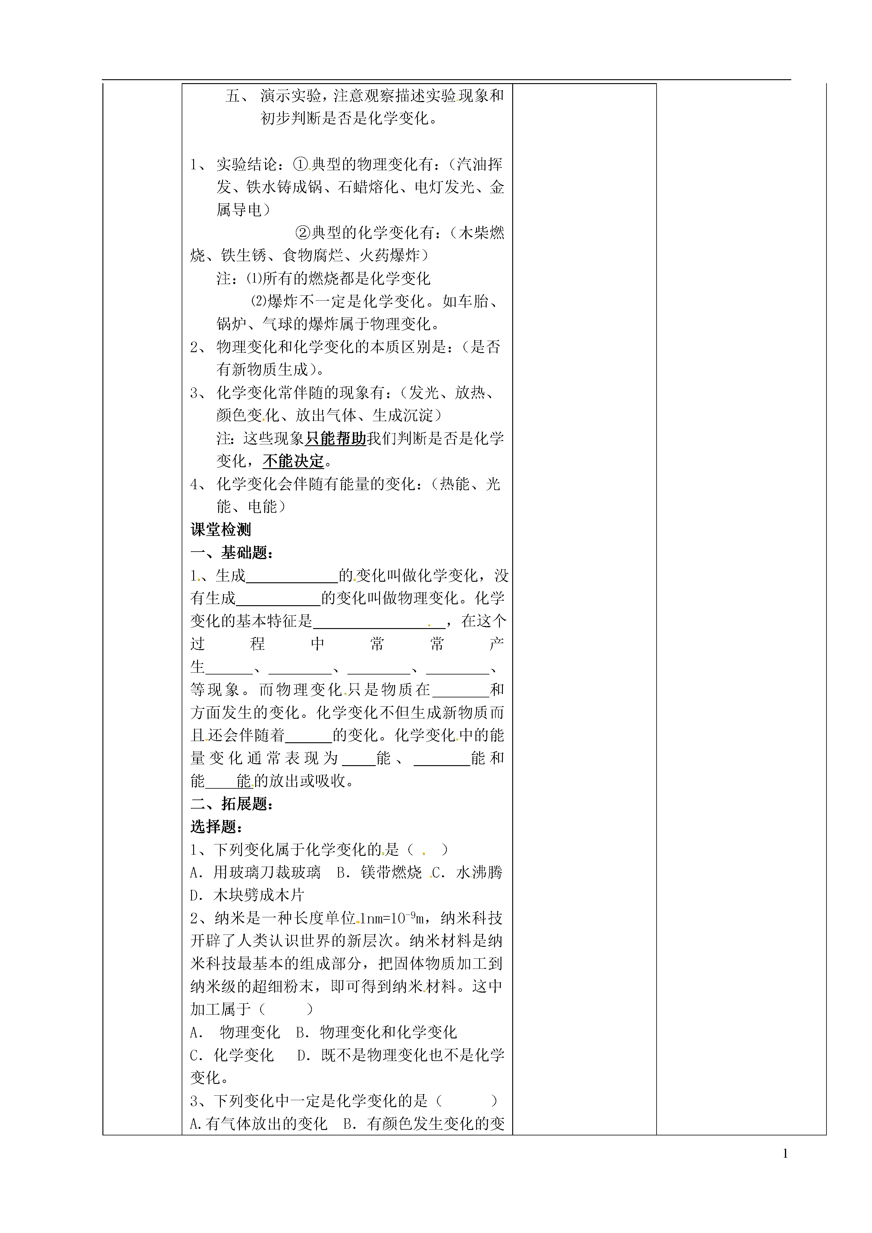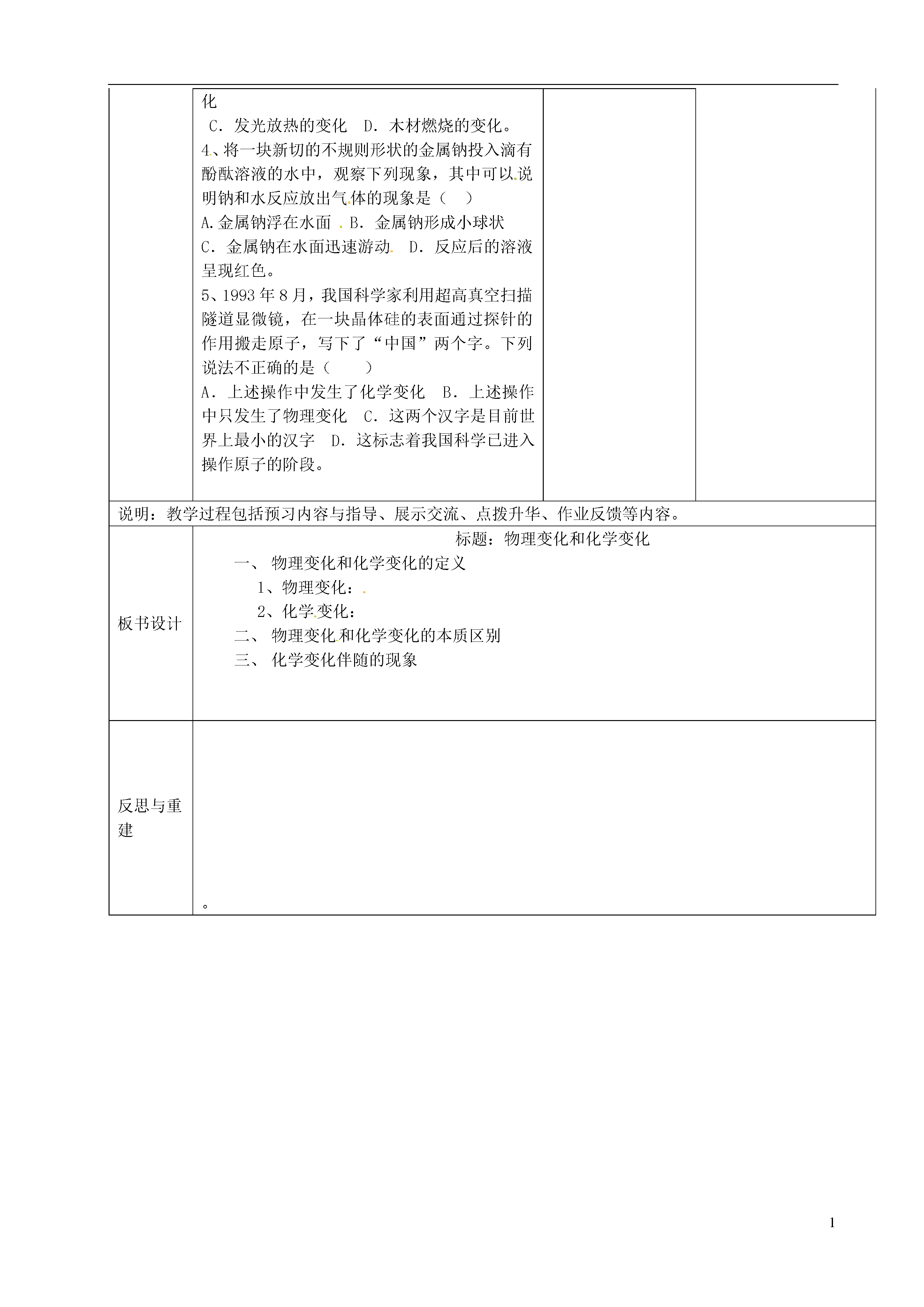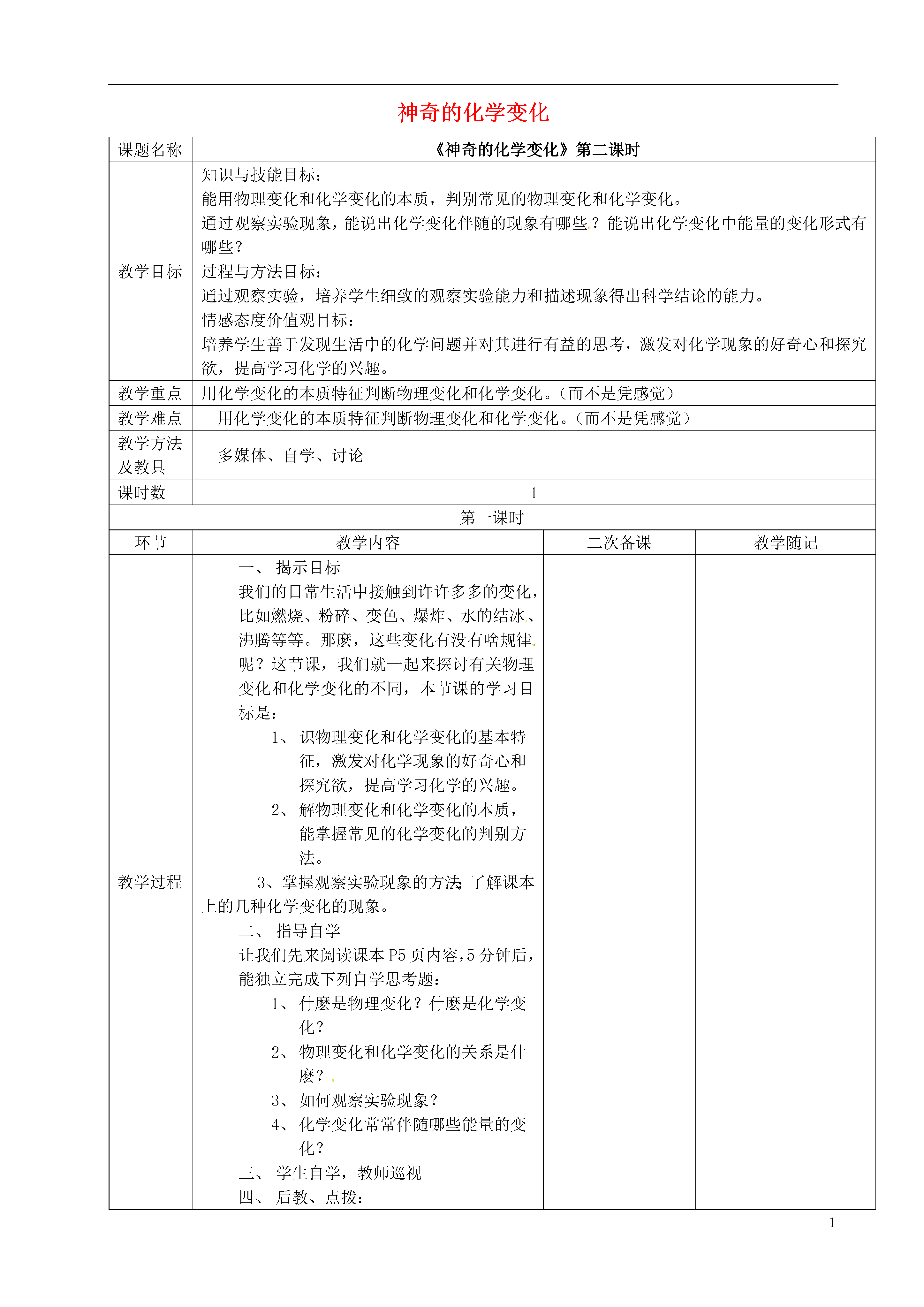 1神奇的化学变化课题名称《神奇的化学变化》第二课时教学目标知识与技能目标:能用物理变化和化学变化的本质,判别常见的物理变化和化学变化。通过观察实验现象,能说出化学变化伴随的现象有哪些?能说出化学变化中能量的变化形式有哪些?过程与方法目标:通过观察实验,培养学生细致的观察实验能力和描述现象得出科学结论的能力。情感态度价值观目标:培养学生善于发现生活中的化学问题并对其进行有益的思考,激发对化学现象的好奇心和探究欲,提高学习化学的兴趣。教学重点用化学变化的本质特征判断物理变化和化学变化。(而不是凭感觉)教学难点用化学变化的本质特征判断物理变化和化学变化。(而不是凭感觉)教学方法及教具多媒体、自学、讨论课时数1第一课时环节教学内容二次备课教学随记教学过程揭示目标我们的日常生活中接触到许许多多的变化,比如燃烧、粉碎、变色、爆炸、水的结冰、沸腾等等。那麽,这些变化有没有啥规律呢?这节课,我们就一起来探讨有关物理变化和化学变化的不同,本节课的学习目标是:识物理变化和化学变化的基本特征,激发对化学现象的好奇心和探究欲,提高学习化学的兴趣。解物理变化和化学变化的本质,能掌握常见的化学变化的判别方法。3、掌握观察实验现象的方法;了解课本上的几种化学变化的现象。指导自学让我们先来阅读课本P5页内容,5分钟后,能独立完成下列自学思考题:什麽是物理变化?什麽是化学变化?物理变化和化学变化的关系是什麽?如何观察实验现象?化学变化常常伴随哪些能量的变化?学生自学,教师巡视后教、点拨:演示实验,注意观察描述实验现象和初步判断是否是化学变化。实验结论:①典型的物理变化有:(汽油挥发、铁水铸成锅、石蜡熔化、电灯发光、金属导电)②典型的化学变化有:(木柴燃烧、铁生锈、食物腐烂、火药爆炸)注:⑴所有的燃烧都是化学变化⑵爆炸不一定是化学变化。如车胎、锅炉、气球的爆炸属于物理变化。物理变化和化学变化的本质区别是:(是否有新物质生成)。化学变化常伴随的现象有:(发光、放热、颜色变化、放出气体、生成沉淀)注:这些现象只能帮助我们判断是否是化学变化,不能决定。化学变化会伴随有能量的变化:(热能、光能、电能)课堂检测一、基础题:1、生成的变化叫做化学变化,没有生成的变化叫做物理变化。化学变化的基本特征是,在这个过程中常常产生、、、、等现象。而物理变化只是物质在和方面发生的变化。化学变化不但生成新物质而且还会伴随着的变化。化学变化中的能量变化通常表现为能、能和能能的放出或吸收。二、拓展题:选择题:1、下列变化属于化学变化的是()A.用玻璃刀裁玻璃B.镁带燃烧C.水沸腾D.木块劈成木片2、纳米是一种长度单位1nm=10-9m,纳米科技开辟了人类认识世界的新层次。纳米材料是纳米科技最基本的组成部分,把固体物质加工到纳米级的超细粉末,即可得到纳米材料。这中加工属于()物理变化B.物理变化和化学变化C.化学变化D.既不是物理变化也不是化学变化。3、下列变化中一定是化学变化的是()A.有气体放出的变化B.有颜色发生变化的变化C.发光放热的变化D.木材燃烧的变化。4、将一块新切的不规则形状的金属钠投入滴有酚酞溶液的水中,观察下列现象,其中可以说明钠和水反应放出气体的现象是()A.金属钠浮在水面B.金属钠形成小球状C.金属钠在水面迅速游动D.反应后的溶液呈现红色。5、1993年8月,我国科学家利用超高真空扫描隧道显微镜,在一块晶体硅的表面通过探针的作用搬走原子,写下了“中国”两个字。下列说法不正确的是()A.上述操作中发生了化学变化B.上述操作中只发生了物理变化C.这两个汉字是目前世界上最小的汉字D.这标志着我国科学已进入操作原子的阶段。说明:教学过程包括预习内容与指导、展示交流、点拨升华、作业反馈等内容。板书设计标题:物理变化和化学变化物理变化和化学变化的定义1、物理变化:2、化学变化:物理变化和化学变化的本质区别化学变化伴随的现象反思与重建。