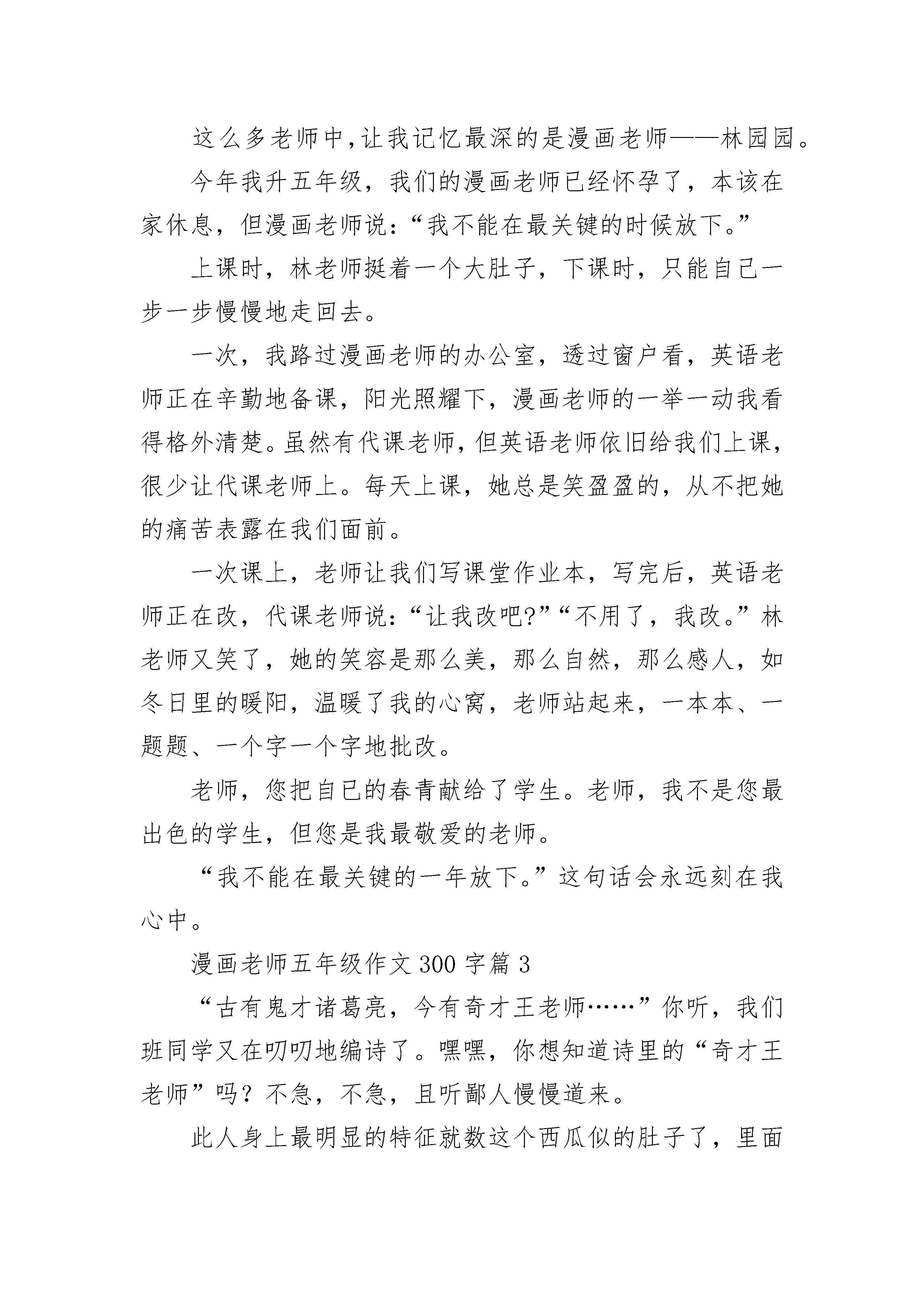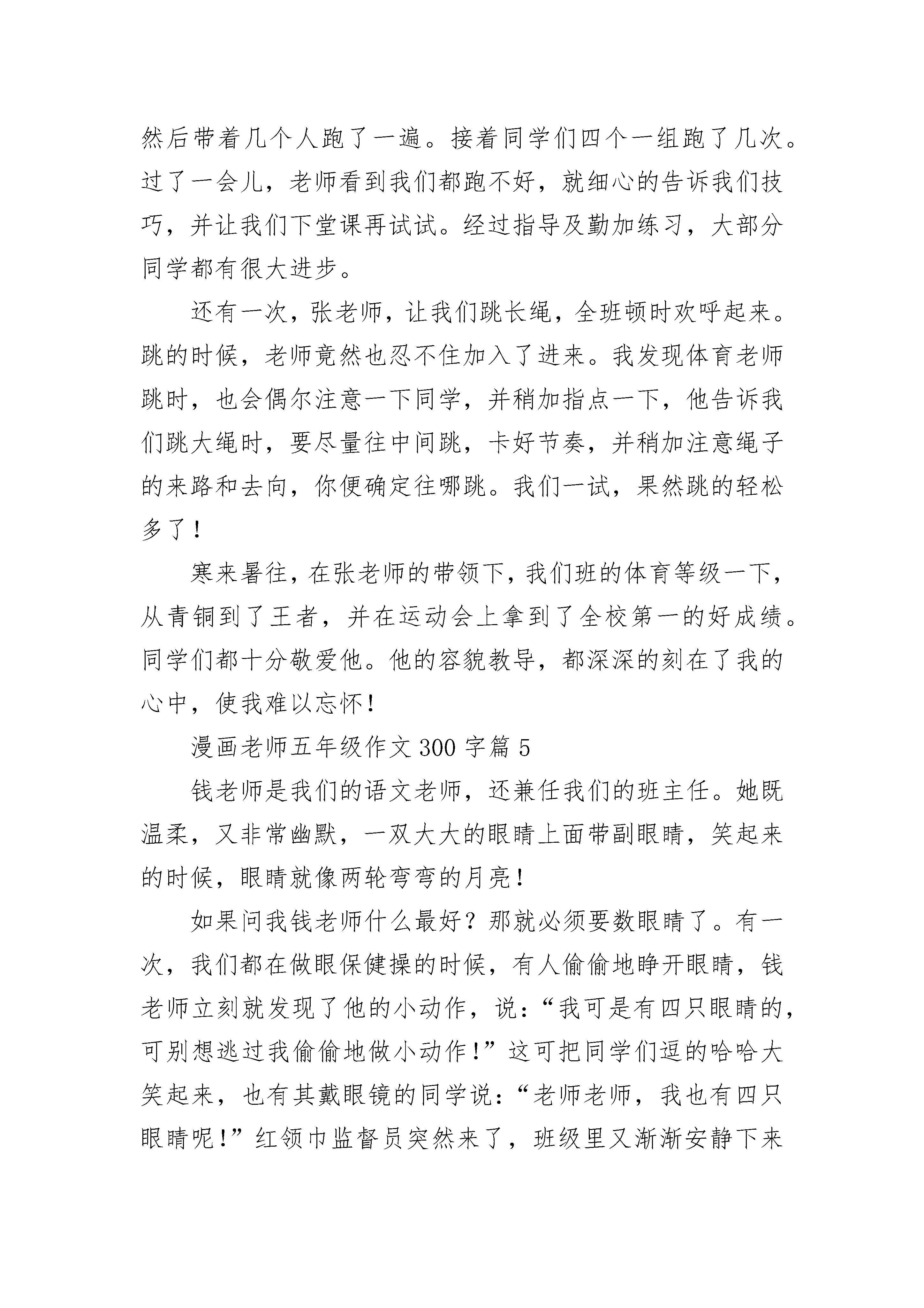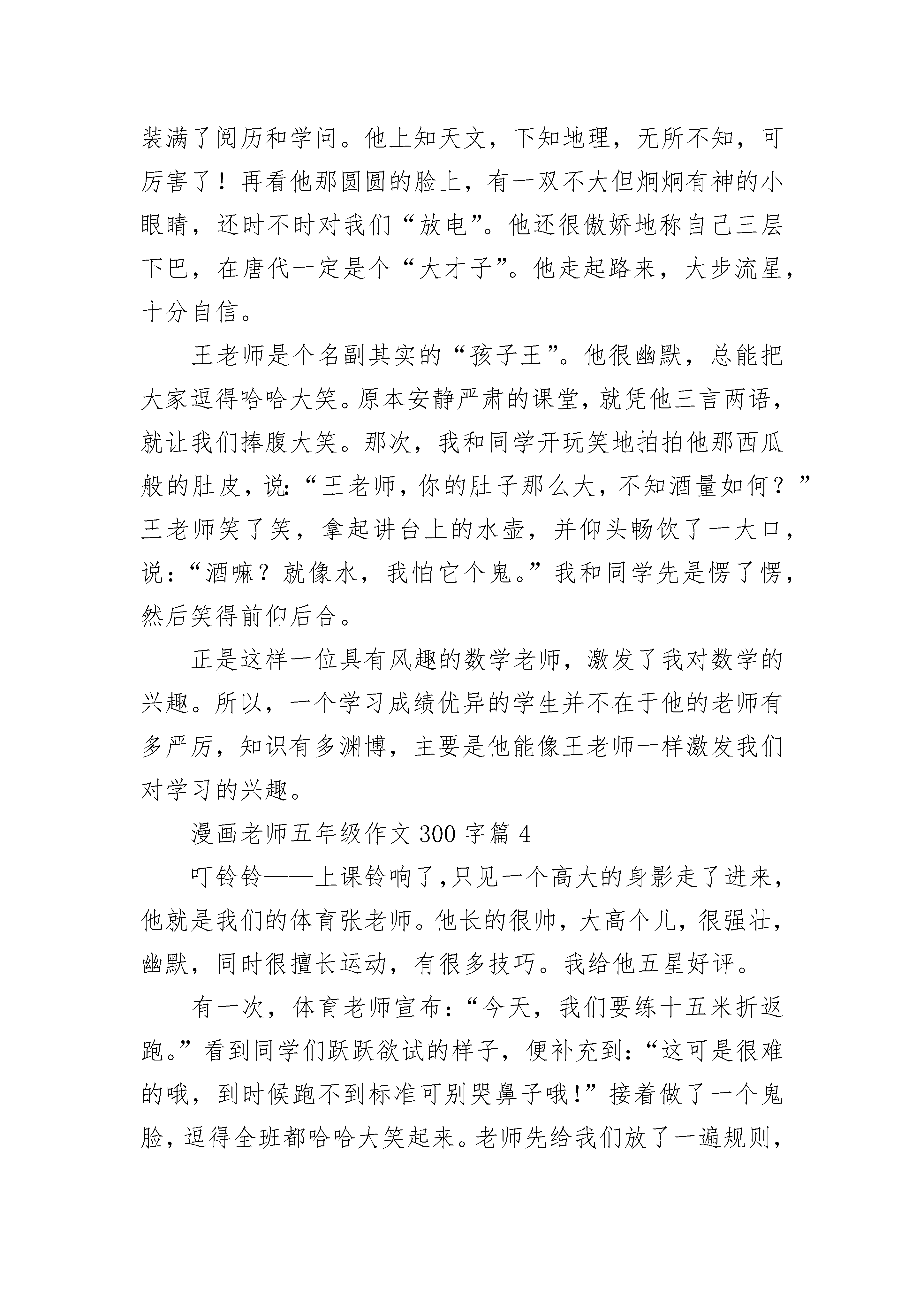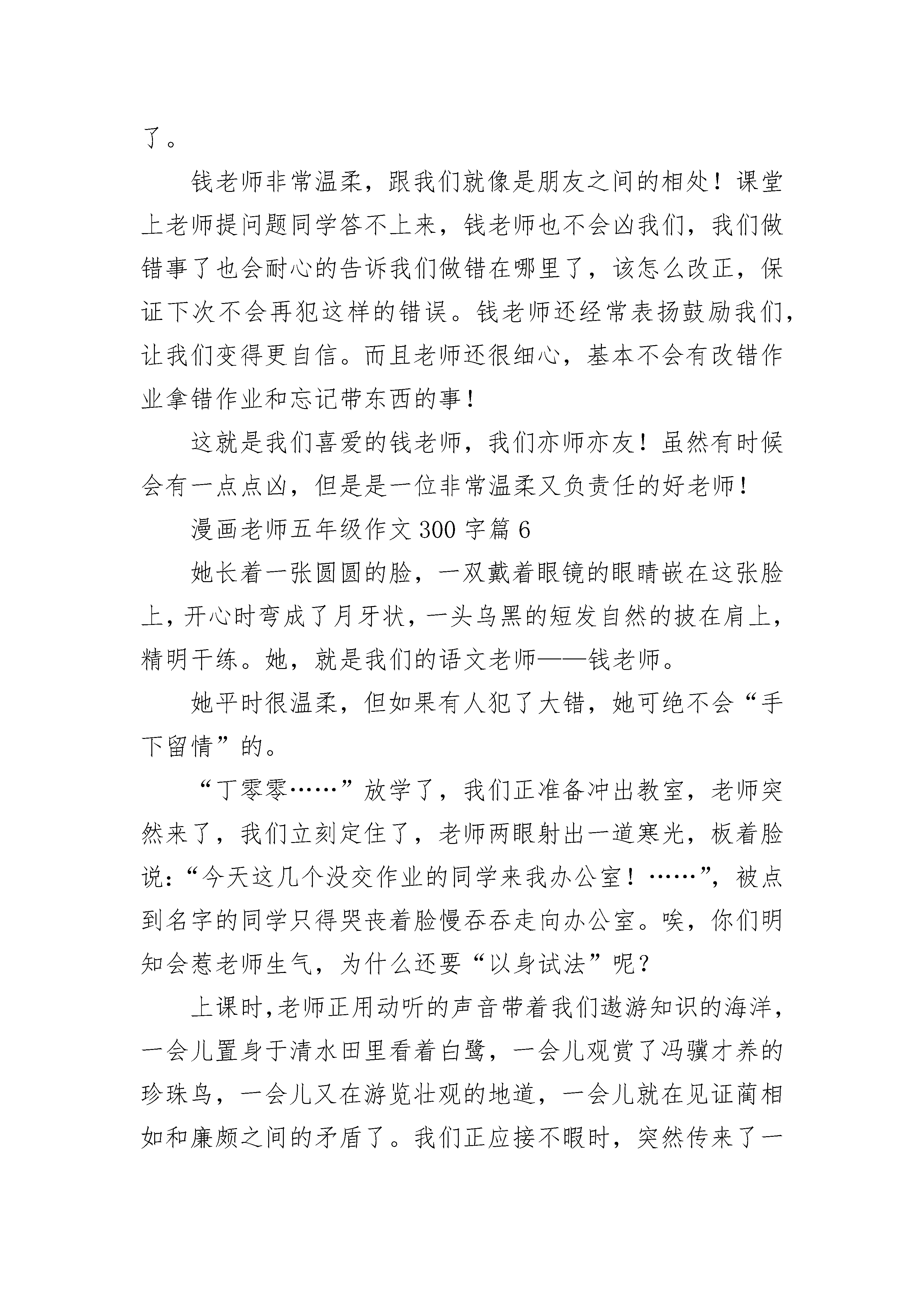 漫画老师五年级作文300字范文(通用10篇)蒋老师是我们的数学老师,中等个儿,脸上有一张能说会道的嘴,从这嘴里讲出的话语总是搞笑幽默。他像一个不怕苦不怕累的农民伯伯,不停地在我们心田上种下理想的知识;他又像清洁工人一样,用那大扫帚不停地将我们心灵上的灰尘扫去。蒋老师的眼睛特别明亮,就像从太上老君的火炉里练出来一样。我们每做一个小动作他都知道,简直就是火眼金睛。蒋老师还有两只顺风耳,讲台下的每一个同学说悄悄话他都能听见,我真是服了他了。蒋老师不像其他老师一样那么古板、严厉,他时常跟我们开一些小玩笑。有一次蒋老师报答案时报到了“我爱老师”,我脱口而出“老师爱我”,蒋老师就说“你不听话,我不喜欢你了。”我们听完哈哈大笑。这些事使平常气氛有些沉重的课堂变得轻松快乐。蒋老师,您就像一位音乐家,能拨动同学们大脑里每一根智慧的弦,弹奏出优美的乐章;您还是一位导游,总能把我们引向正确的道路;您更是一位魔术大师,使幼小的我们瞬间变得高大强壮。这就是我的老师,我最爱的数学老师——蒋老师。漫画老师五年级作文300字篇2老师是园丁,我们像小树苗,辛苦地哺育我们长大。这么多老师中,让我记忆最深的是漫画老师——林园园。今年我升五年级,我们的漫画老师已经怀孕了,本该在家休息,但漫画老师说:“我不能在最关键的时候放下。”上课时,林老师挺着一个大肚子,下课时,只能自己一步一步慢慢地走回去。一次,我路过漫画老师的办公室,透过窗户看,英语老师正在辛勤地备课,阳光照耀下,漫画老师的一举一动我看得格外清楚。虽然有代课老师,但英语老师依旧给我们上课,很少让代课老师上。每天上课,她总是笑盈盈的,从不把她的痛苦表露在我们面前。一次课上,老师让我们写课堂作业本,写完后,英语老师正在改,代课老师说:“让我改吧?”“不用了,我改。”林老师又笑了,她的笑容是那么美,那么自然,那么感人,如冬日里的暖阳,温暖了我的心窝,老师站起来,一本本、一题题、一个字一个字地批改。老师,您把自已的春青献给了学生。老师,我不是您最出色的学生,但您是我最敬爱的老师。“我不能在最关键的一年放下。”这句话会永远刻在我心中。漫画老师五年级作文300字篇3“古有鬼才诸葛亮,今有奇才王老师……”你听,我们班同学又在叨叨地编诗了。嘿嘿,你想知道诗里的“奇才王老师”吗?不急,不急,且听鄙人慢慢道来。此人身上最明显的特征就数这个西瓜似的肚子了,里面装满了阅历和学问。他上知天文,下知地理,无所不知,可厉害了!再看他那圆圆的脸上,有一双不大但炯炯有神的小眼睛,还时不时对我们“放电”。他还很傲娇地称自己三层下巴,在唐代一定是个“大才子”。他走起路来,大步流星,十分自信。王老师是个名副其实的“孩子王”。他很幽默,总能把大家逗得哈哈大笑。原本安静严肃的课堂,就凭他三言两语,就让我们捧腹大笑。那次,我和同学开玩笑地拍拍他那西瓜般的肚皮,说:“王老师,你的肚子那么大,不知酒量如何?”王老师笑了笑,拿起讲台上的水壶,并仰头畅饮了一大口,说:“酒嘛?就像水,我怕它个鬼。”我和同学先是愣了愣,然后笑得前仰后合。正是这样一位具有风趣的数学老师,激发了我对数学的兴趣。所以,一个学习成绩优异的学生并不在于他的老师有多严厉,知识有多渊博,主要是他能像王老师一样激发我们对学习的兴趣。漫画老师五年级作文300字篇4叮铃铃——上课铃响了,只见一个高大的身影走了进来,他就是我们的体育张老师。他长的很帅,大高个儿,很强壮,幽默,同时很擅长运动,有很多技巧。我给他五星好评。有一次,体育老师宣布:“今天,我们要练十五米折返跑。”看到同学们跃跃欲试的样子,便补充到:“这可是很难的哦,到时候跑不到标准可别哭鼻子哦!”接着做了一个鬼脸,逗得全班都哈哈大笑起来。老师先给我们放了一遍规则,然后带着几个人跑了一遍。接着同学们四个一组跑了几次。过了一会儿,老师看到我们都跑不好,就细心的告诉我们技巧,并让我们下堂课再试试。经过指导及勤加练习,大部分同学都有很大进步。还有一次,张老师,让我们跳长绳,全班顿时欢呼起来。跳的时候,老师竟然也忍不住加入了进来。我发现体育老师跳时,也会偶尔注意一下同学,并稍加指点一下,他告诉我们跳大绳时,要尽量往中间跳,卡好节奏,并稍加注意绳子的来路和去向,你便确定往哪跳。我们一试,果然跳的轻松多了!寒来暑往,在张老师的带领下,我们班的体育等级一下,从青铜到了王者,并在运动会上拿到了全校第一的好成绩。同学们都十分敬爱他。他的容貌教导,都深深的刻在了我的心中,使我难以忘怀!漫画老师五年级作文300字篇5钱老师是我们的语文老师,还兼任我们的班主任。她既温柔,又非常幽默,一双大大的眼睛上面带副眼睛,笑起来的时候,眼睛就像两轮弯弯的月亮!如果问我钱老师什么最好?那就必须要数眼睛了。有一次,我们都在做眼保健操的时候,有人偷偷地睁开眼睛,钱老师立刻就发现了他的