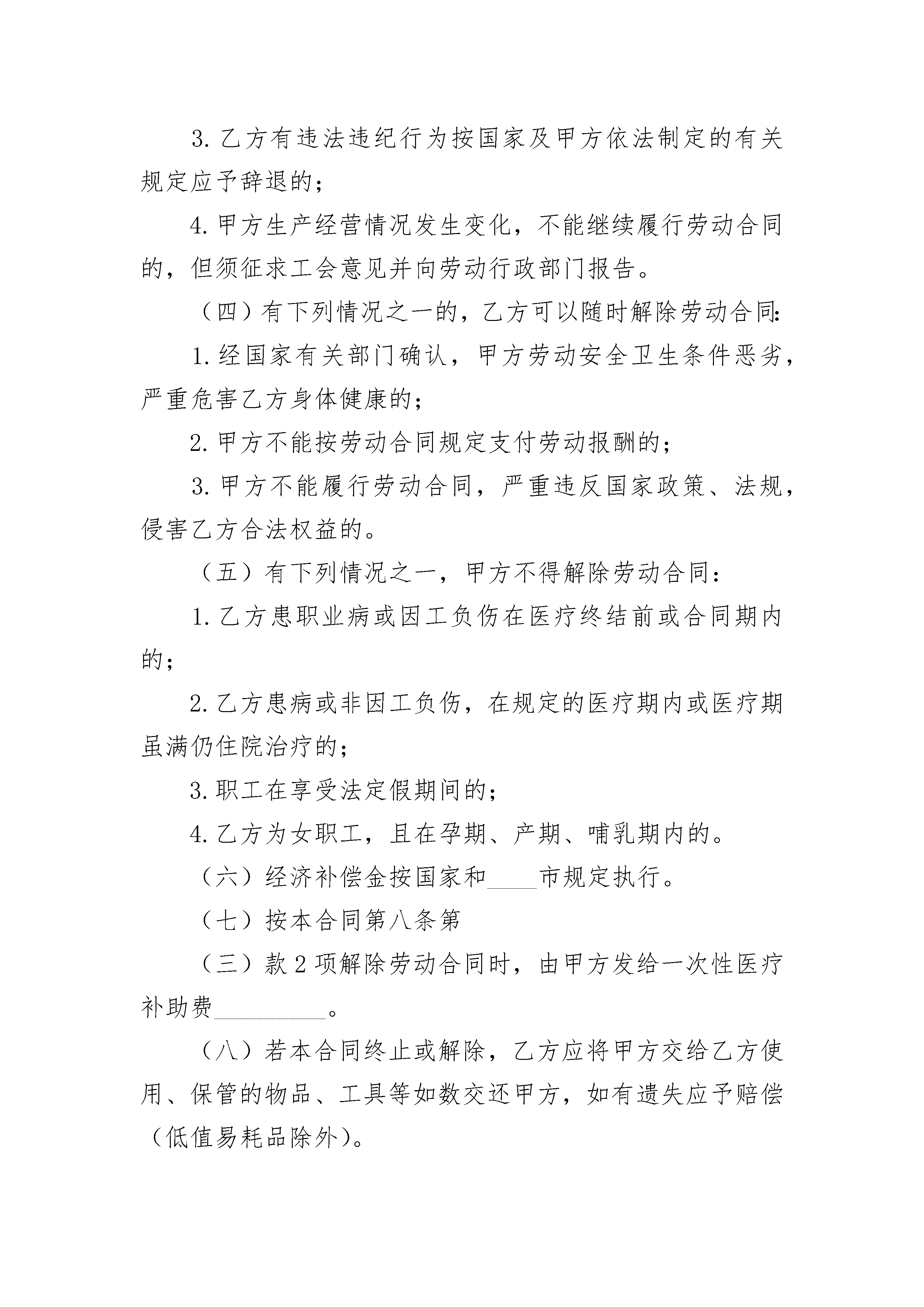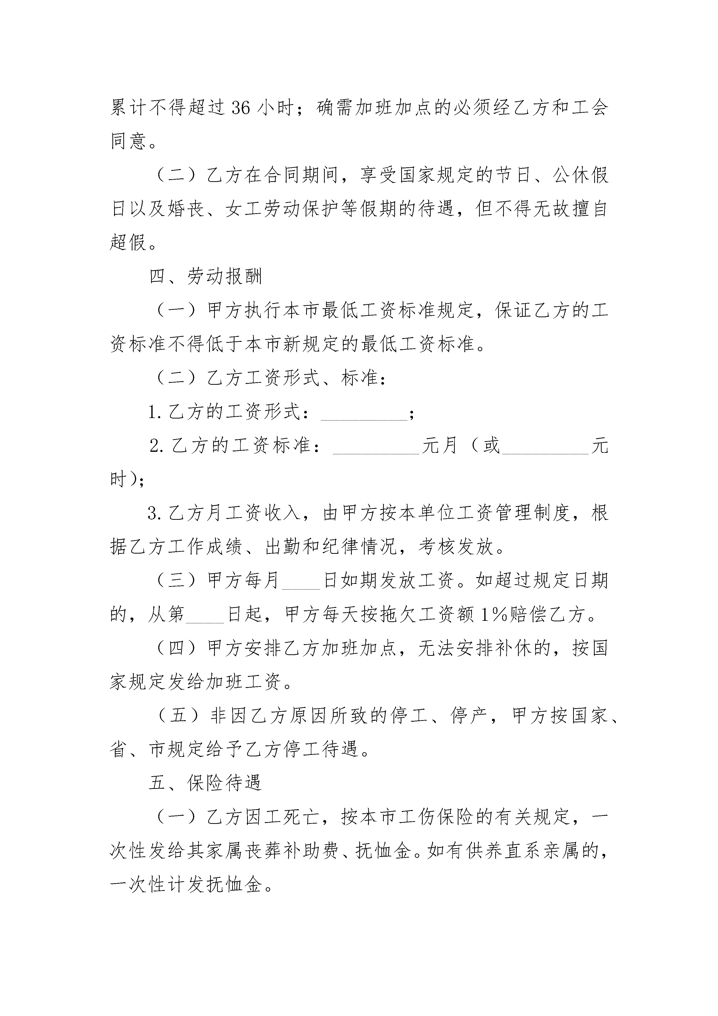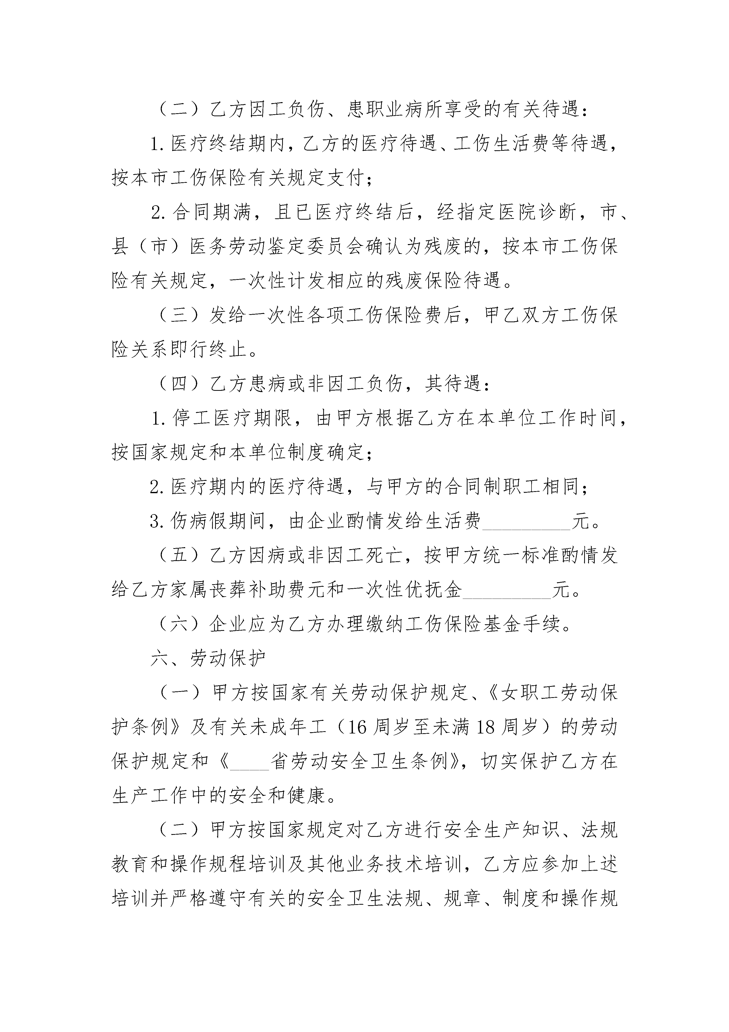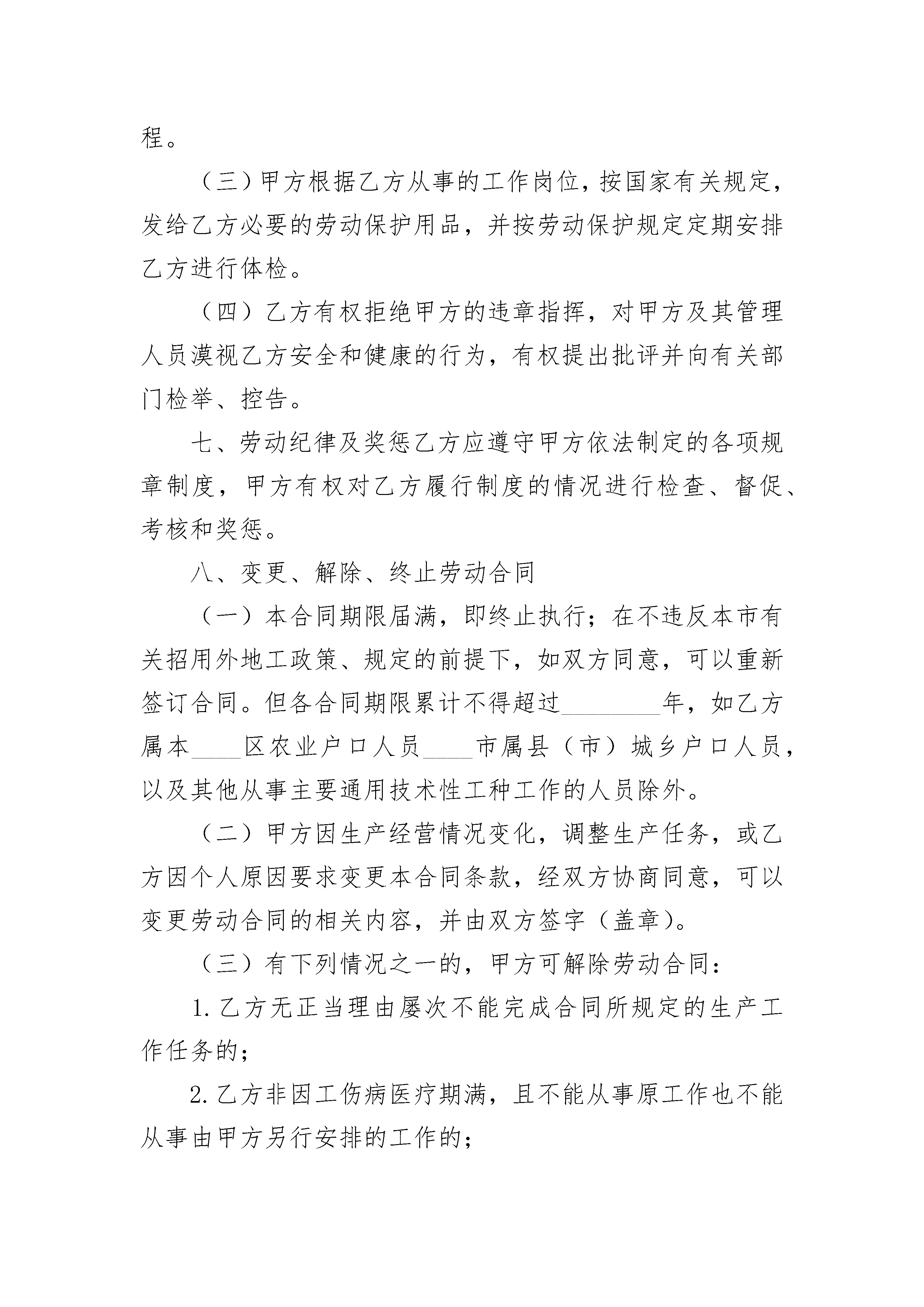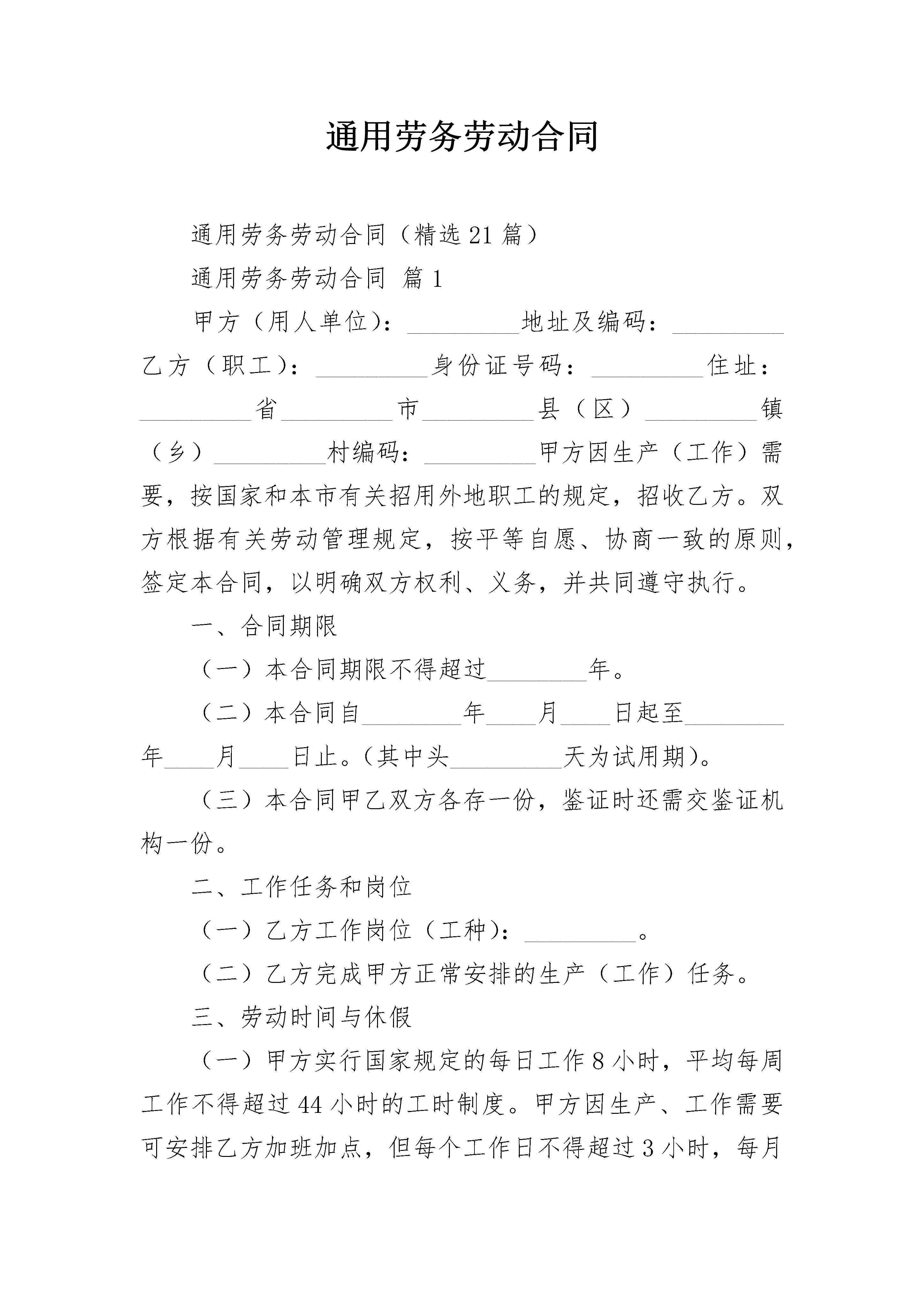 通用劳务劳动合同通用劳务劳动合同(精选21篇)通用劳务劳动合同篇1甲方(用人单位):_________地址及编码:_________乙方(职工):_________身份证号码:_________住址:_________省_________市_________县(区)_________镇(乡)_________村编码:_________甲方因生产(工作)需要,按国家和本市有关招用外地职工的规定,招收乙方。双方根据有关劳动管理规定,按平等自愿、协商一致的原则,签定本合同,以明确双方权利、义务,并共同遵守执行。一、合同期限(一)本合同期限不得超过________年。(二)本合同自________年____月____日起至________年____月____日止。(其中头_________天为试用期)。(三)本合同甲乙双方各存一份,鉴证时还需交鉴证机构一份。二、工作任务和岗位(一)乙方工作岗位(工种):_________。(二)乙方完成甲方正常安排的生产(工作)任务。三、劳动时间与休假(一)甲方实行国家规定的每日工作8小时,平均每周工作不得超过44小时的工时制度。甲方因生产、工作需要可安排乙方加班加点,但每个工作日不得超过3小时,每月累计不得超过36小时;确需加班加点的必须经乙方和工会同意。(二)乙方在合同期间,享受国家规定的节日、公休假日以及婚丧、女工劳动保护等假期的待遇,但不得无故擅自超假。四、劳动报酬(一)甲方执行本市最低工资标准规定,保证乙方的工资标准不得低于本市新规定的最低工资标准。(二)乙方工资形式、标准:1.乙方的工资形式:_________;2.乙方的工资标准:_________元月(或_________元时);3.乙方月工资收入,由甲方按本单位工资管理制度,根据乙方工作成绩、出勤和纪律情况,考核发放。(三)甲方每月____日如期发放工资。如超过规定日期的,从第____日起,甲方每天按拖欠工资额1%赔偿乙方。(四)甲方安排乙方加班加点,无法安排补休的,按国家规定发给加班工资。(五)非因乙方原因所致的停工、停产,甲方按国家、省、市规定给予乙方停工待遇。五、保险待遇(一)乙方因工死亡,按本市工伤保险的有关规定,一次性发给其家属丧葬补助费、抚恤金。如有供养直系亲属的,一次性计发抚恤金。(二)乙方因工负伤、患职业病所享受的有关待遇:1.医疗终结期内,乙方的医疗待遇、工伤生活费等待遇,按本市工伤保险有关规定支付;2.合同期满,且已医疗终结后,经指定医院诊断,市、县(市)医务劳动鉴定委员会确认为残废的,按本市工伤保险有关规定,一次性计发相应的残废保险待遇。(三)发给一次性各项工伤保险费后,甲乙双方工伤保险关系即行终止。(四)乙方患病或非因工负伤,其待遇:1.停工医疗期限,由甲方根据乙方在本单位工作时间,按国家规定和本单位制度确定;2.医疗期内的医疗待遇,与甲方的合同制职工相同;3.伤病假期间,由企业酌情发给生活费_________元。(五)乙方因病或非因工死亡,按甲方统一标准酌情发给乙方家属丧葬补助费元和一次性优抚金_________元。(六)企业应为乙方办理缴纳工伤保险基金手续。六、劳动保护(一)甲方按国家有关劳动保护规定、《女职工劳动保护条例》及有关未成年工(16周岁至未满18周岁)的劳动保护规定和《____省劳动安全卫生条例》,切实保护乙方在生产工作中的安全和健康。(二)甲方按国家规定对乙方进行安全生产知识、法规教育和操作规程培训及其他业务技术培训,乙方应参加上述培训并严格遵守有关的安全卫生法规、规章、制度和操作规程。(三)甲方根据乙方从事的工作岗位,按国家有关规定,发给乙方必要的劳动保护用品,并按劳动保护规定定期安排乙方进行体检。(四)乙方有权拒绝甲方的违章指挥,对甲方及其管理人员漠视乙方安全和健康的行为,有权提出批评并向有关部门检举、控告。七、劳动纪律及奖惩乙方应遵守甲方依法制定的各项规章制度,甲方有权对乙方履行制度的情况进行检查、督促、考核和奖惩。八、变更、解除、终止劳动合同(一)本合同期限届满,即终止执行;在不违反本市有关招用外地工政策、规定的前提下,如双方同意,可以重新签订合同。但各合同期限累计不得超过________年,如乙方属本____区农业户口人员____市属县(市)城乡户口人员,以及其他从事主要通用技术性工种工作的人员除外。(二)甲方因生产经营情况变化,调整生产任务,或乙方因个人原因要求变更本合同条款,经双方协商同意,可以变更劳动合同的相关内容,并由双方签字(盖章)。(三)有下列情况之一的,甲方可解除劳动合同:1.乙方无正当理由屡次不能完成合同所规定的生产工作任务的;2.乙方非因工伤病医疗期满,且不能从事原工作也不能从事由甲方另行安排的工作的;3.乙方有违法违纪行为按国家及甲方依法制定的有关规定应予辞退