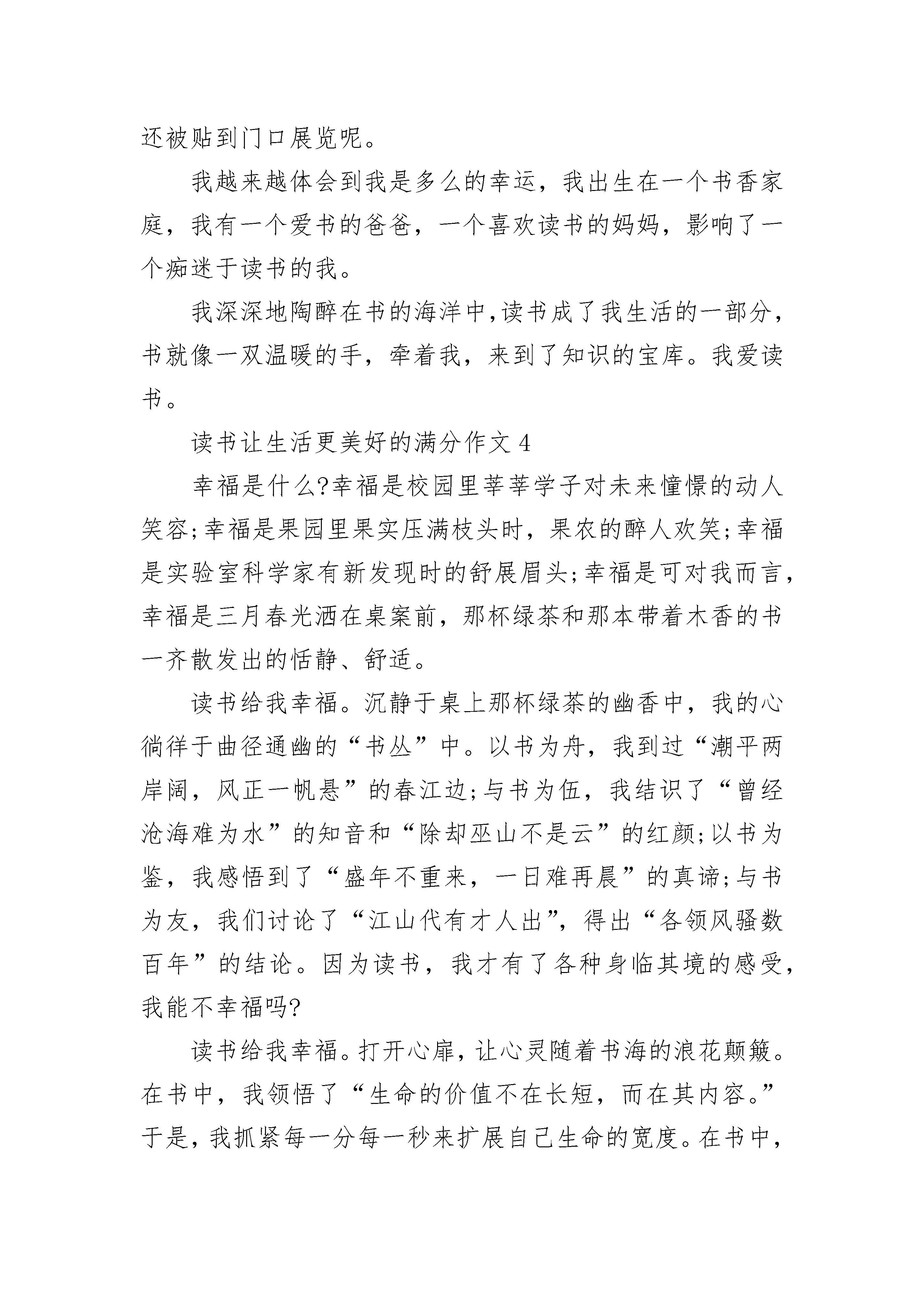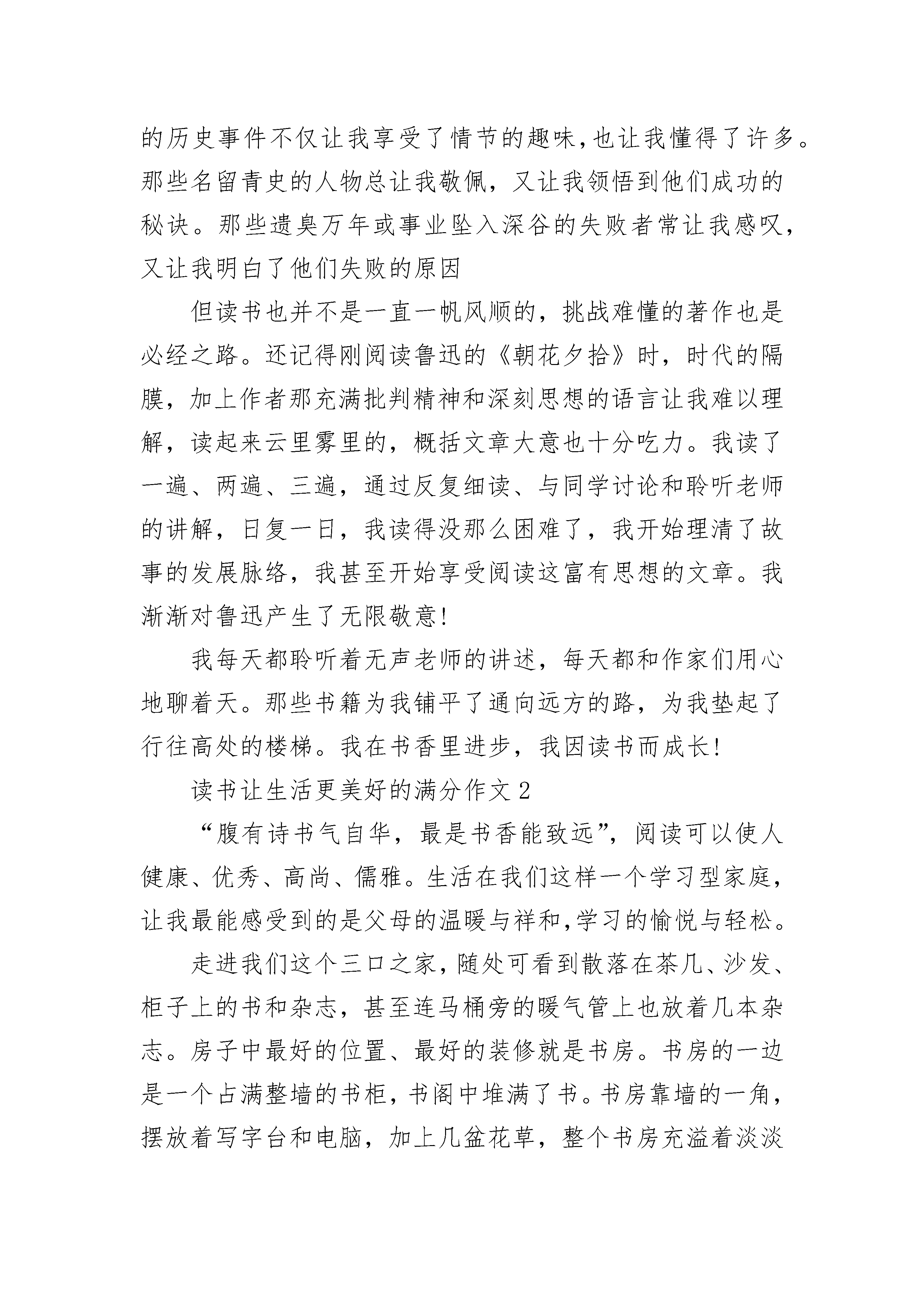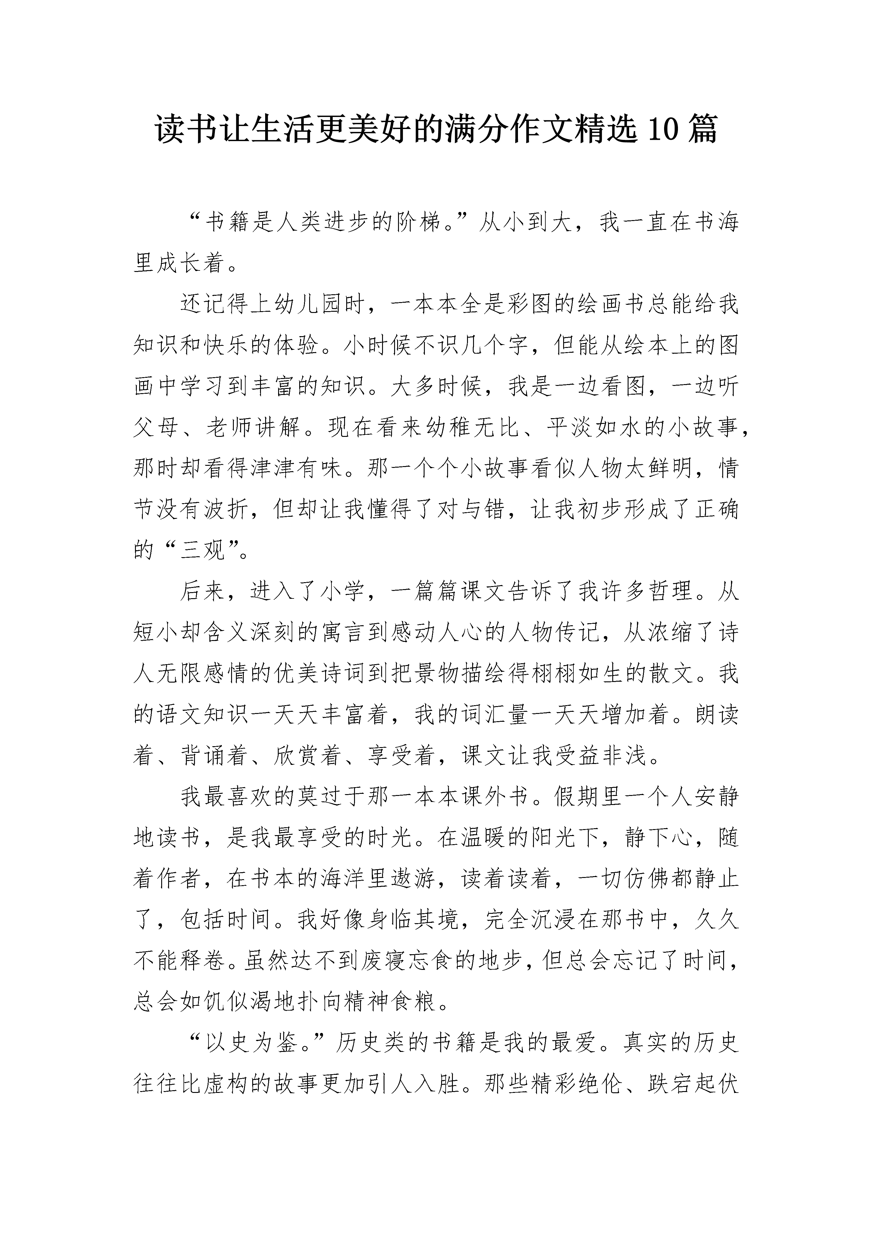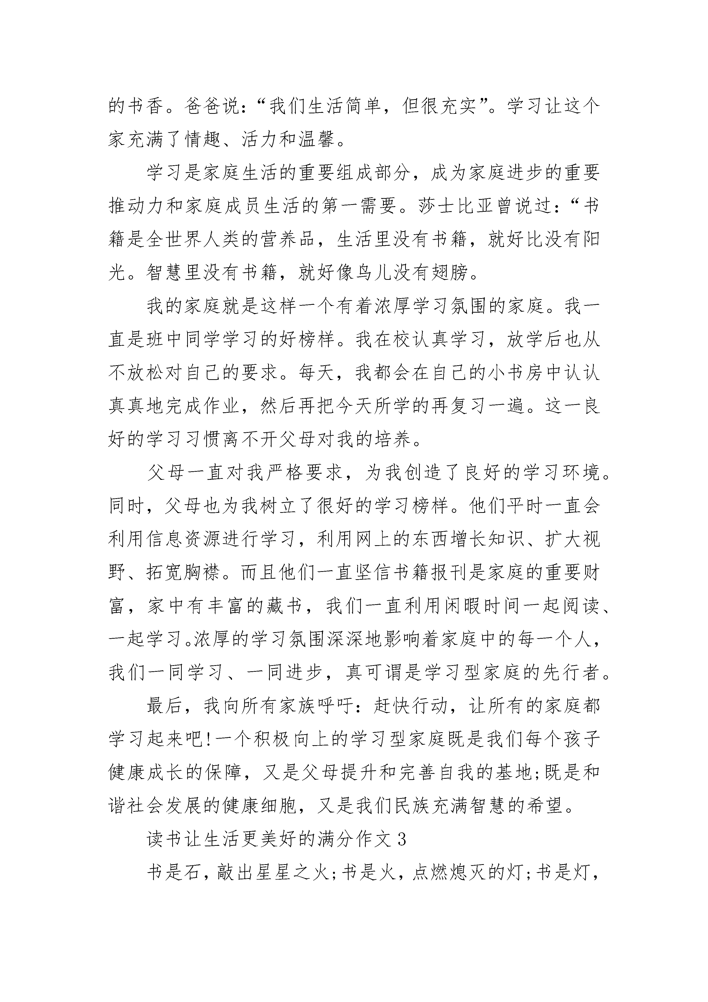 读书让生活更美好的满分作文精选10篇“书籍是人类进步的阶梯。”从小到大,我一直在书海里成长着。还记得上幼儿园时,一本本全是彩图的绘画书总能给我知识和快乐的体验。小时候不识几个字,但能从绘本上的图画中学习到丰富的知识。大多时候,我是一边看图,一边听父母、老师讲解。现在看来幼稚无比、平淡如水的小故事,那时却看得津津有味。那一个个小故事看似人物太鲜明,情节没有波折,但却让我懂得了对与错,让我初步形成了正确的“三观”。后来,进入了小学,一篇篇课文告诉了我许多哲理。从短小却含义深刻的寓言到感动人心的人物传记,从浓缩了诗人无限感情的优美诗词到把景物描绘得栩栩如生的散文。我的语文知识一天天丰富着,我的词汇量一天天增加着。朗读着、背诵着、欣赏着、享受着,课文让我受益非浅。我最喜欢的莫过于那一本本课外书。假期里一个人安静地读书,是我最享受的时光。在温暖的阳光下,静下心,随着作者,在书本的海洋里遨游,读着读着,一切仿佛都静止了,包括时间。我好像身临其境,完全沉浸在那书中,久久不能释卷。虽然达不到废寝忘食的地步,但总会忘记了时间,总会如饥似渴地扑向精神食粮。“以史为鉴。”历史类的书籍是我的最爱。真实的历史往往比虚构的故事更加引人入胜。那些精彩绝伦、跌宕起伏的历史事件不仅让我享受了情节的趣味,也让我懂得了许多。那些名留青史的人物总让我敬佩,又让我领悟到他们成功的秘诀。那些遗臭万年或事业坠入深谷的失败者常让我感叹,又让我明白了他们失败的原因但读书也并不是一直一帆风顺的,挑战难懂的著作也是必经之路。还记得刚阅读鲁迅的《朝花夕拾》时,时代的隔膜,加上作者那充满批判精神和深刻思想的语言让我难以理解,读起来云里雾里的,概括文章大意也十分吃力。我读了一遍、两遍、三遍,通过反复细读、与同学讨论和聆听老师的讲解,日复一日,我读得没那么困难了,我开始理清了故事的发展脉络,我甚至开始享受阅读这富有思想的文章。我渐渐对鲁迅产生了无限敬意!我每天都聆听着无声老师的讲述,每天都和作家们用心地聊着天。那些书籍为我铺平了通向远方的路,为我垫起了行往高处的楼梯。我在书香里进步,我因读书而成长!读书让生活更美好的满分作文2“腹有诗书气自华,最是书香能致远”,阅读可以使人健康、优秀、高尚、儒雅。生活在我们这样一个学习型家庭,让我最能感受到的是父母的温暖与祥和,学习的愉悦与轻松。走进我们这个三口之家,随处可看到散落在茶几、沙发、柜子上的书和杂志,甚至连马桶旁的暖气管上也放着几本杂志。房子中最好的位置、最好的装修就是书房。书房的一边是一个占满整墙的书柜,书阁中堆满了书。书房靠墙的一角,摆放着写字台和电脑,加上几盆花草,整个书房充溢着淡淡的书香。爸爸说:“我们生活简单,但很充实”。学习让这个家充满了情趣、活力和温馨。学习是家庭生活的重要组成部分,成为家庭进步的重要推动力和家庭成员生活的第一需要。莎士比亚曾说过:“书籍是全世界人类的营养品,生活里没有书籍,就好比没有阳光。智慧里没有书籍,就好像鸟儿没有翅膀。我的家庭就是这样一个有着浓厚学习氛围的家庭。我一直是班中同学学习的好榜样。我在校认真学习,放学后也从不放松对自己的要求。每天,我都会在自己的小书房中认认真真地完成作业,然后再把今天所学的再复习一遍。这一良好的学习习惯离不开父母对我的培养。父母一直对我严格要求,为我创造了良好的学习环境。同时,父母也为我树立了很好的学习榜样。他们平时一直会利用信息资源进行学习,利用网上的东西增长知识、扩大视野、拓宽胸襟。而且他们一直坚信书籍报刊是家庭的重要财富,家中有丰富的藏书,我们一直利用闲暇时间一起阅读、一起学习。浓厚的学习氛围深深地影响着家庭中的每一个人,我们一同学习、一同进步,真可谓是学习型家庭的先行者。最后,我向所有家族呼吁:赶快行动,让所有的家庭都学习起来吧!一个积极向上的学习型家庭既是我们每个孩子健康成长的保障,又是父母提升和完善自我的基地;既是和谐社会发展的健康细胞,又是我们民族充满智慧的希望。读书让生活更美好的满分作文3书是石,敲出星星之火;书是火,点燃熄灭的灯;书是灯,照亮夜行的路;书是路,引你走向黎明。我爱读书,书是我最亲密的伙伴,它带领我敲开了知识的大门,让我走近名人,让我亲近历史,让我领略了世界各地的奇异风光书,伴随着我的成长之路。说起我的读书故事,那可要长话短说了,要不,三天三夜也说不完。我还没上幼儿园时,妈妈就给我买了一本本图画书、故事书。开始时,图画书中的彩图吸引了我的好奇心,随后是妈妈给我读的故事让我念念不忘。后来,我上了幼儿园,认识了很多字,能自己读一些简单的童话书了。王子和小美人鱼的悲欢离合让我牵肠挂肚;白雪公主的可怜令我落泪不止;马良的神笔使我无比神往。看书让我不知不觉忘记了吃饭,忘记了睡觉。每当妈妈喊我吃饭时,我嘴上应付着,眼睛却离不开书,只有妈妈费了九牛二虎之力从