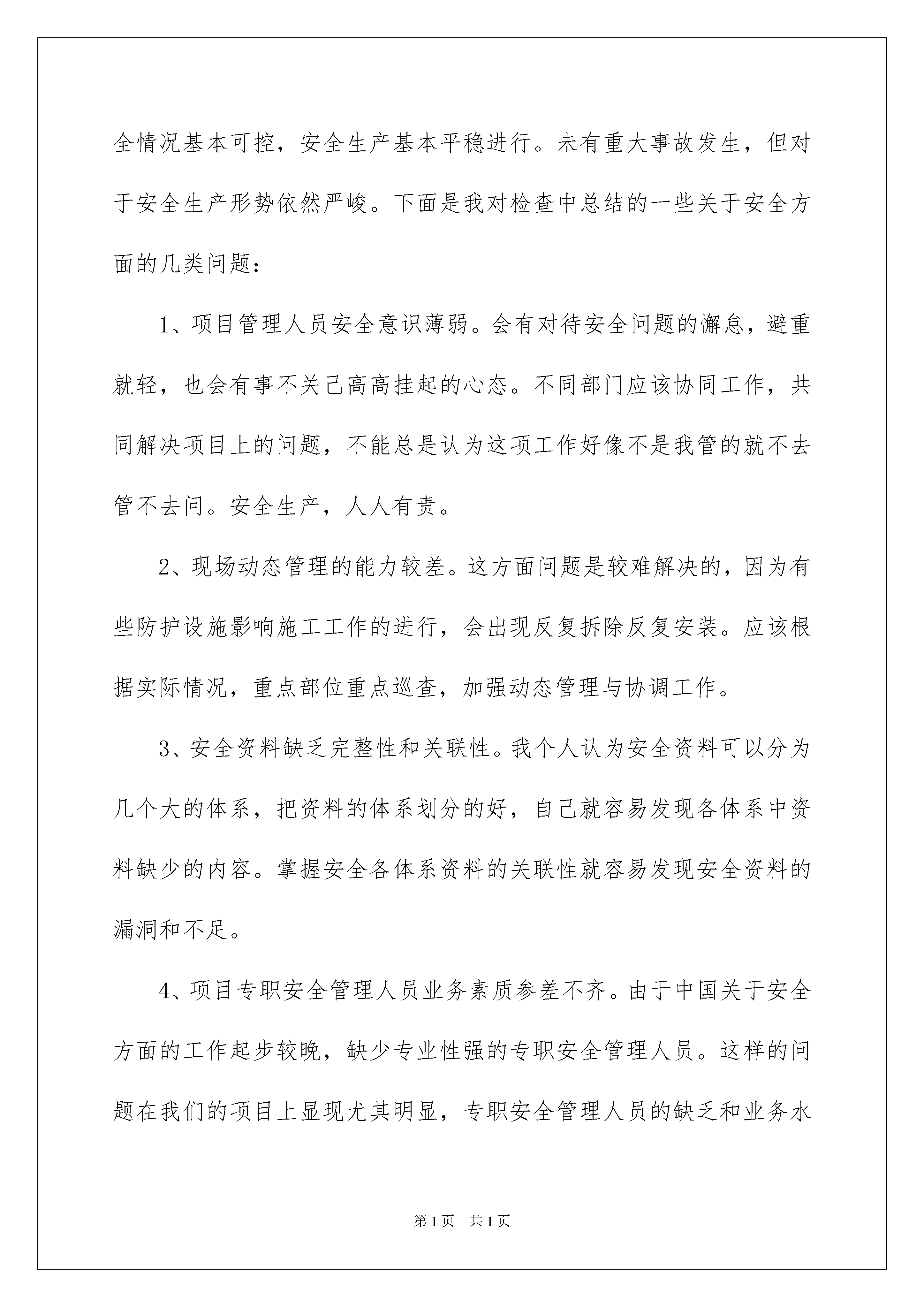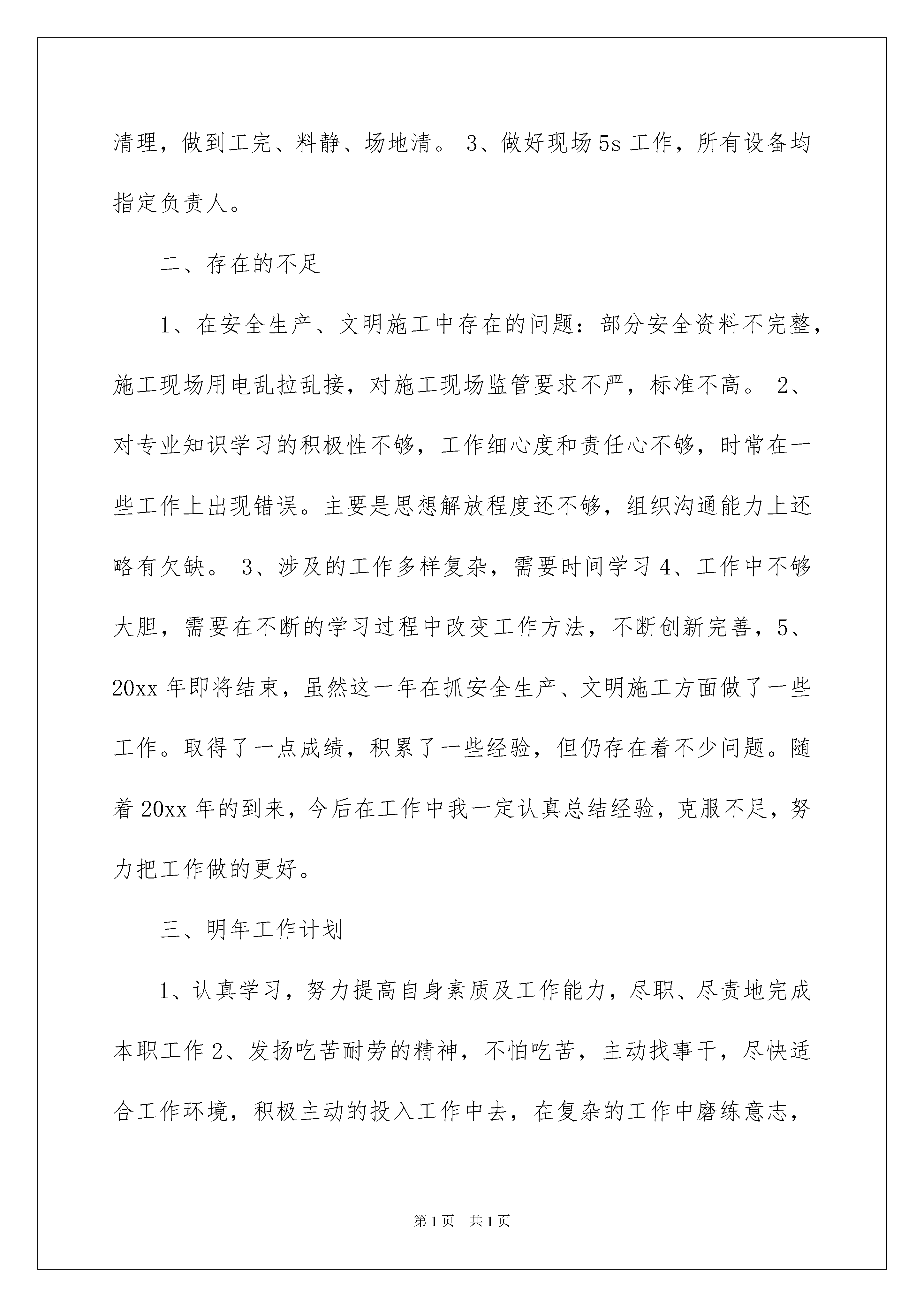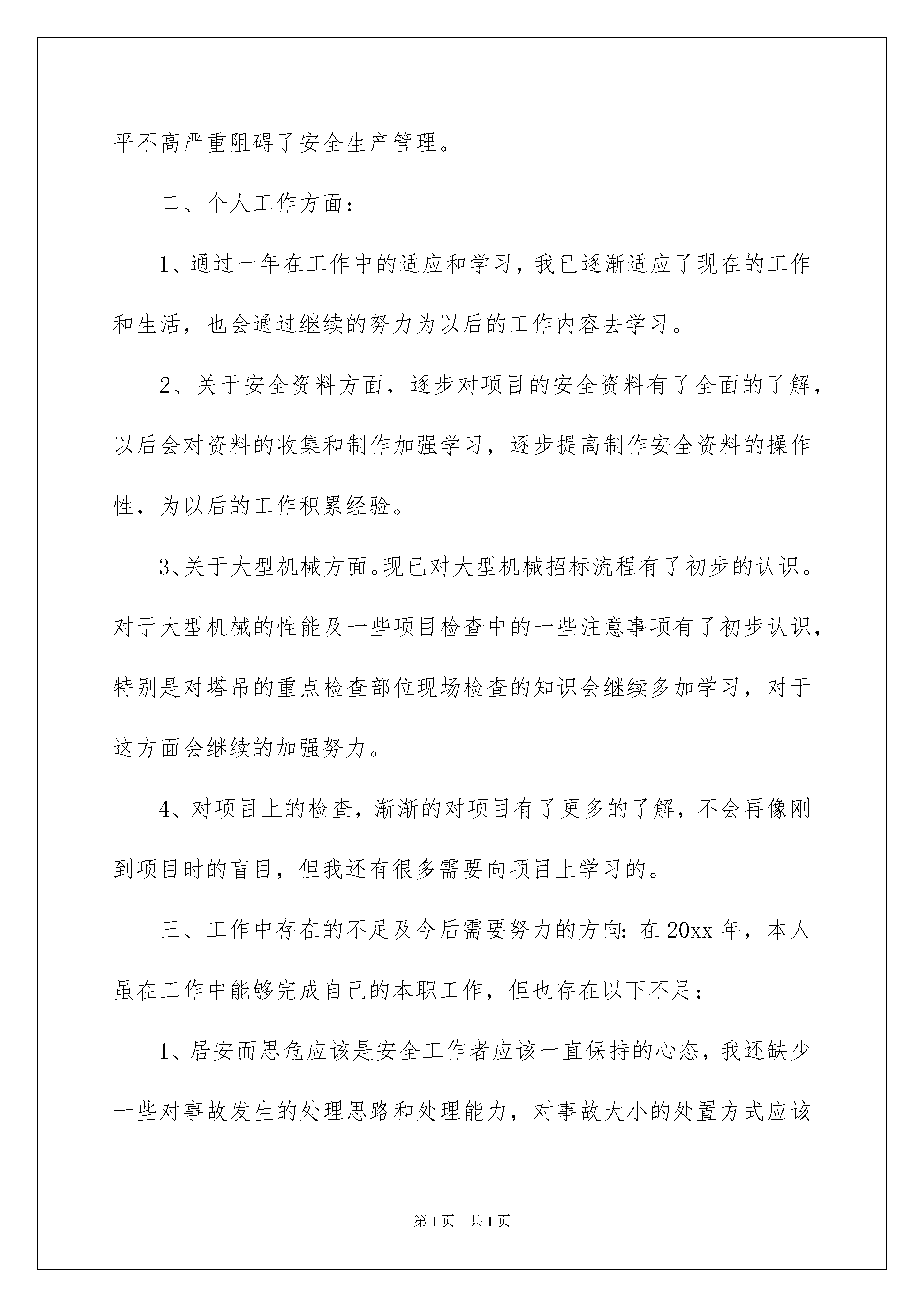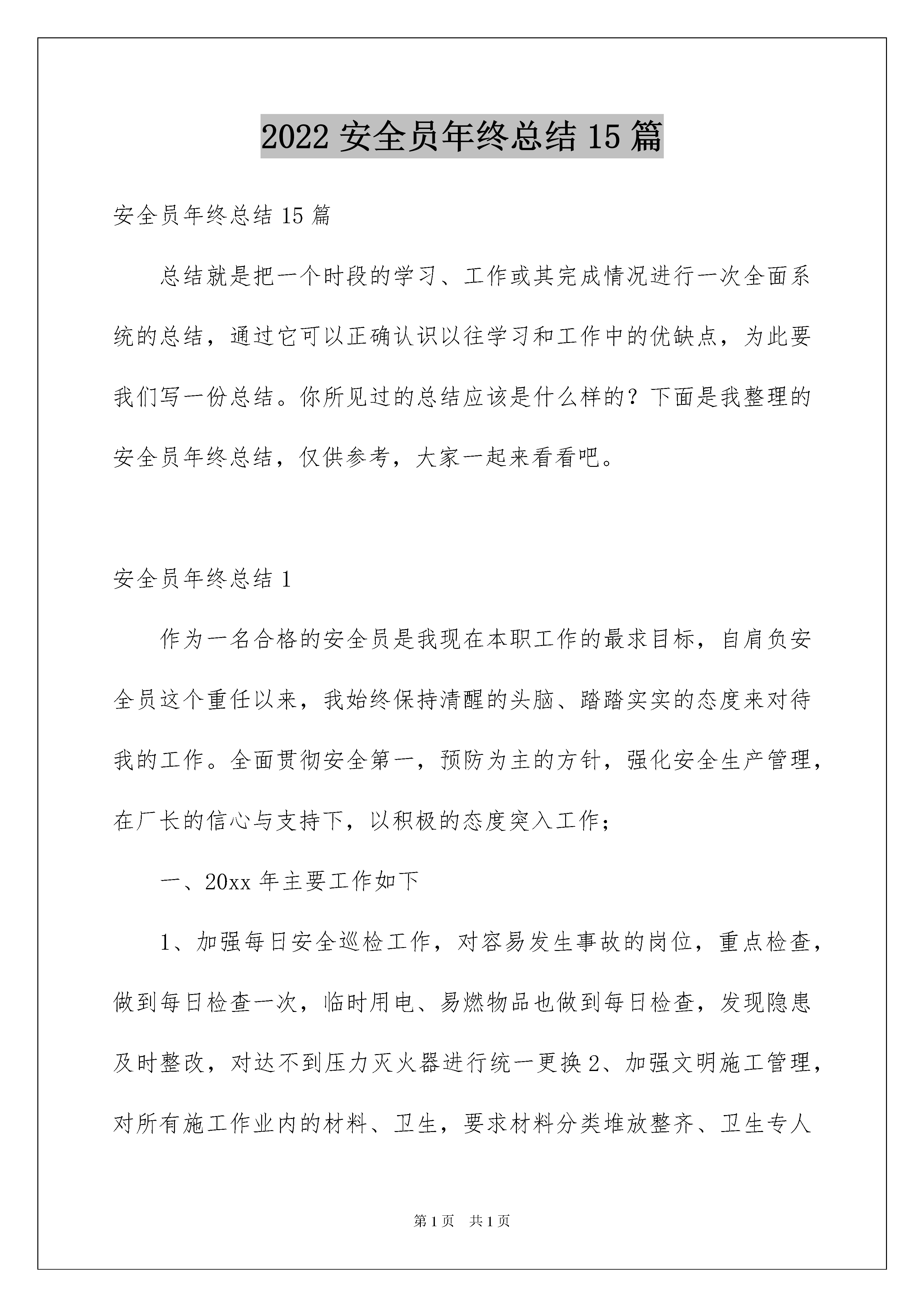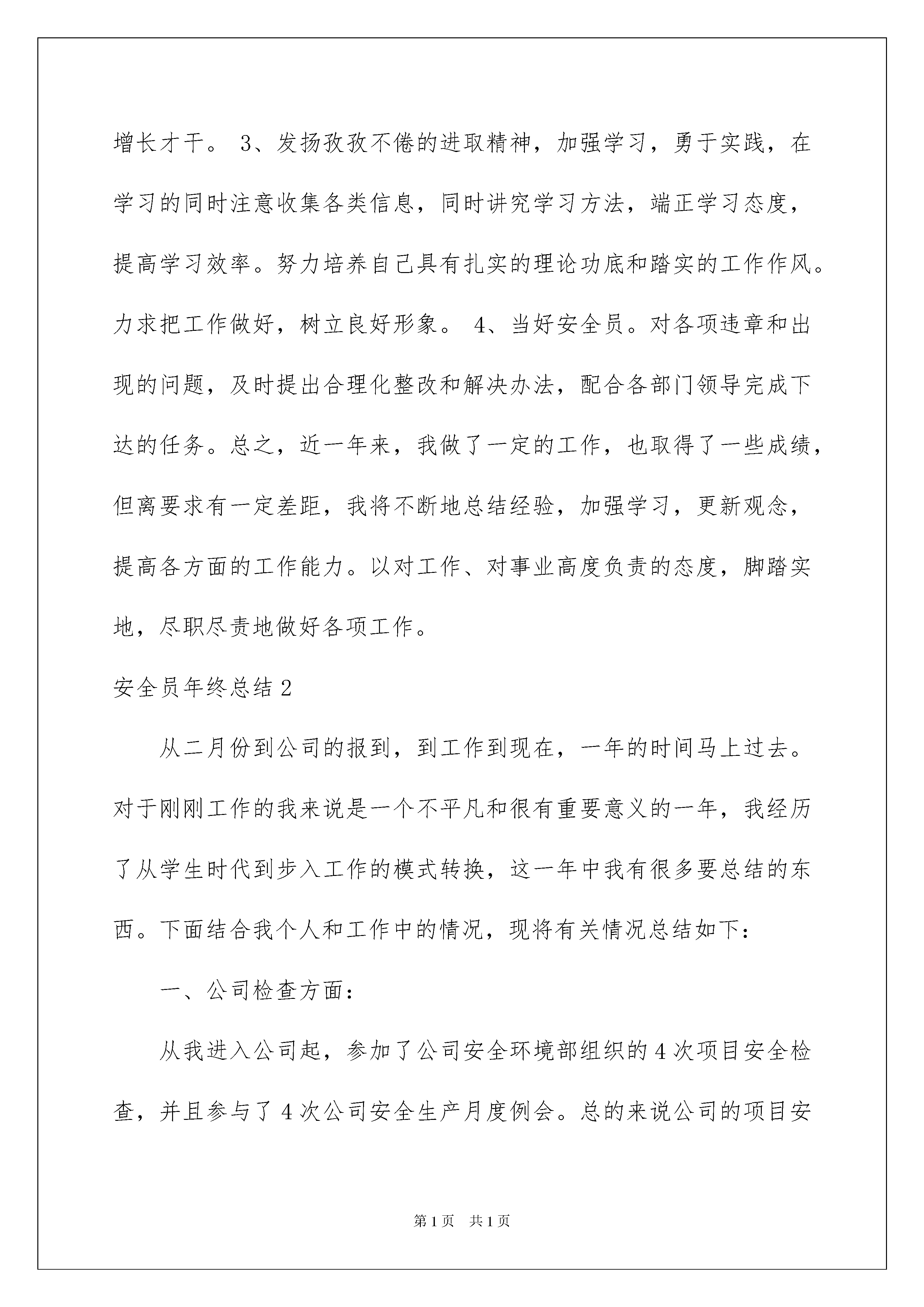 2022安全员年终总结15篇安全员年终总结15篇总结就是把一个时段的学习、工作或其完成情况进行一次全面系统的总结,通过它可以正确认识以往学习和工作中的优缺点,为此要我们写一份总结。你所见过的总结应该是什么样的?下面是我整理的安全员年终总结,仅供参考,大家一起来看看吧。安全员年终总结1作为一名合格的安全员是我现在本职工作的最求目标,自肩负安全员这个重任以来,我始终保持清醒的头脑、踏踏实实的态度来对待我的工作。全面贯彻安全第一,预防为主的方针,强化安全生产管理,在厂长的信心与支持下,以积极的态度突入工作;一、20xx年主要工作如下1、加强每日安全巡检工作,对容易发生事故的岗位,重点检查,做到每日检查一次,临时用电、易燃物品也做到每日检查,发现隐患及时整改,对达不到压力灭火器进行统一更换2、加强文明施工管理,对所有施工作业内的材料、卫生,要求材料分类堆放整齐、卫生专人清理,做到工完、料静、场地清。3、做好现场5s工作,所有设备均指定负责人。二、存在的不足1、在安全生产、文明施工中存在的问题:部分安全资料不完整,施工现场用电乱拉乱接,对施工现场监管要求不严,标准不高。2、对专业知识学习的积极性不够,工作细心度和责任心不够,时常在一些工作上出现错误。主要是思想解放程度还不够,组织沟通能力上还略有欠缺。3、涉及的工作多样复杂,需要时间学习4、工作中不够大胆,需要在不断的学习过程中改变工作方法,不断创新完善,5、20xx年即将结束,虽然这一年在抓安全生产、文明施工方面做了一些工作。取得了一点成绩,积累了一些经验,但仍存在着不少问题。随着20xx年的到来,今后在工作中我一定认真总结经验,克服不足,努力把工作做的更好。三、明年工作计划1、认真学习,努力提高自身素质及工作能力,尽职、尽责地完成本职工作2、发扬吃苦耐劳的精神,不怕吃苦,主动找事干,尽快适合工作环境,积极主动的投入工作中去,在复杂的工作中磨练意志,增长才干。3、发扬孜孜不倦的进取精神,加强学习,勇于实践,在学习的同时注意收集各类信息,同时讲究学习方法,端正学习态度,提高学习效率。努力培养自己具有扎实的理论功底和踏实的工作作风。力求把工作做好,树立良好形象。4、当好安全员。对各项违章和出现的问题,及时提出合理化整改和解决办法,配合各部门领导完成下达的任务。总之,近一年来,我做了一定的工作,也取得了一些成绩,但离要求有一定差距,我将不断地总结经验,加强学习,更新观念,提高各方面的工作能力。以对工作、对事业高度负责的态度,脚踏实地,尽职尽责地做好各项工作。安全员年终总结2从二月份到公司的报到,到工作到现在,一年的时间马上过去。对于刚刚工作的我来说是一个不平凡和很有重要意义的一年,我经历了从学生时代到步入工作的模式转换,这一年中我有很多要总结的东西。下面结合我个人和工作中的情况,现将有关情况总结如下:一、公司检查方面:从我进入公司起,参加了公司安全环境部组织的4次项目安全检查,并且参与了4次公司安全生产月度例会。总的来说公司的项目安全情况基本可控,安全生产基本平稳进行。未有重大事故发生,但对于安全生产形势依然严峻。下面是我对检查中总结的一些关于安全方面的几类问题:1、项目管理人员安全意识薄弱。会有对待安全问题的懈怠,避重就轻,也会有事不关己高高挂起的心态。不同部门应该协同工作,共同解决项目上的问题,不能总是认为这项工作好像不是我管的就不去管不去问。安全生产,人人有责。2、现场动态管理的能力较差。这方面问题是较难解决的,因为有些防护设施影响施工工作的进行,会出现反复拆除反复安装。应该根据实际情况,重点部位重点巡查,加强动态管理与协调工作。3、安全资料缺乏完整性和关联性。我个人认为安全资料可以分为几个大的体系,把资料的体系划分的好,自己就容易发现各体系中资料缺少的内容。掌握安全各体系资料的关联性就容易发现安全资料的漏洞和不足。4、项目专职安全管理人员业务素质参差不齐。由于中国关于安全方面的工作起步较晚,缺少专业性强的专职安全管理人员。这样的问题在我们的项目上显现尤其明显,专职安全管理人员的缺乏和业务水平不高严重阻碍了安全生产管理。二、个人工作方面:1、通过一年在工作中的适应和学习,我已逐渐适应了现在的工作和生活,也会通过继续的努力为以后的工作内容去学习。2、关于安全资料方面,逐步对项目的安全资料有了全面的了解,以后会对资料的收集和制作加强学习,逐步提高制作安全资料的操作性,为以后的工作积累经验。3、关于大型机械方面。现已对大型机械招标流程有了初步的认识。对于大型机械的性能及一些项目检查中的一些注意事项有了初步认识,特别是对塔吊的重点检查部位