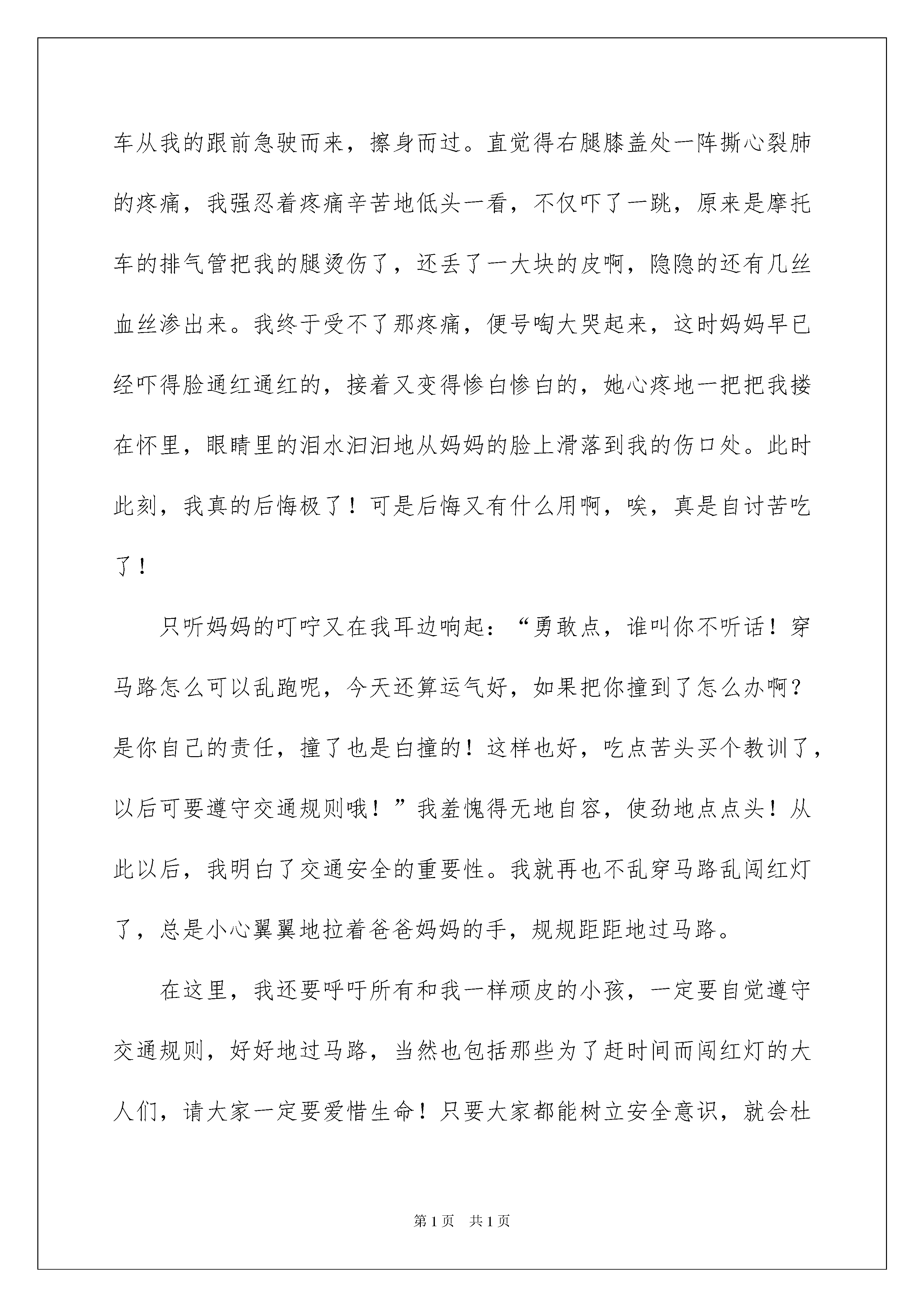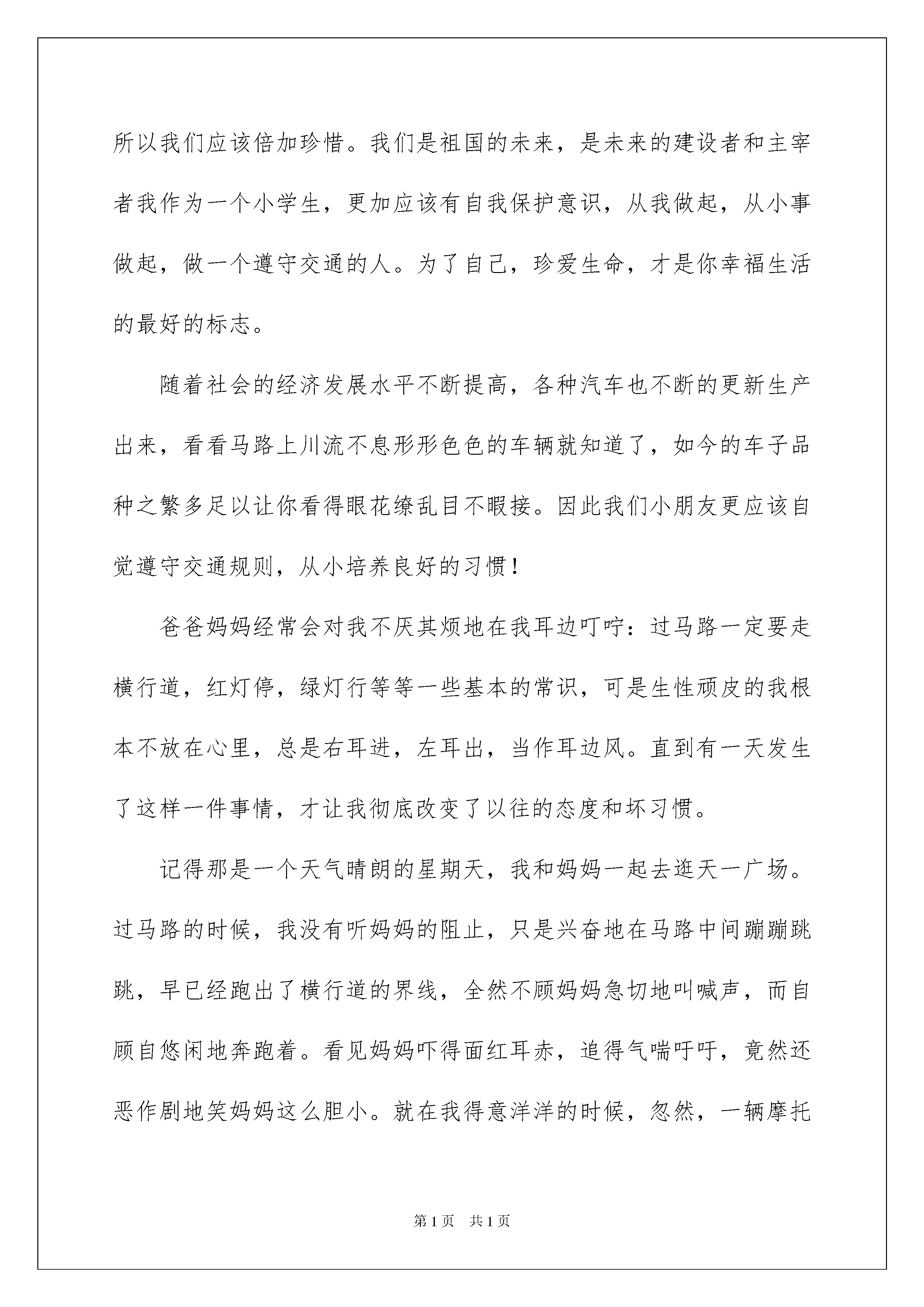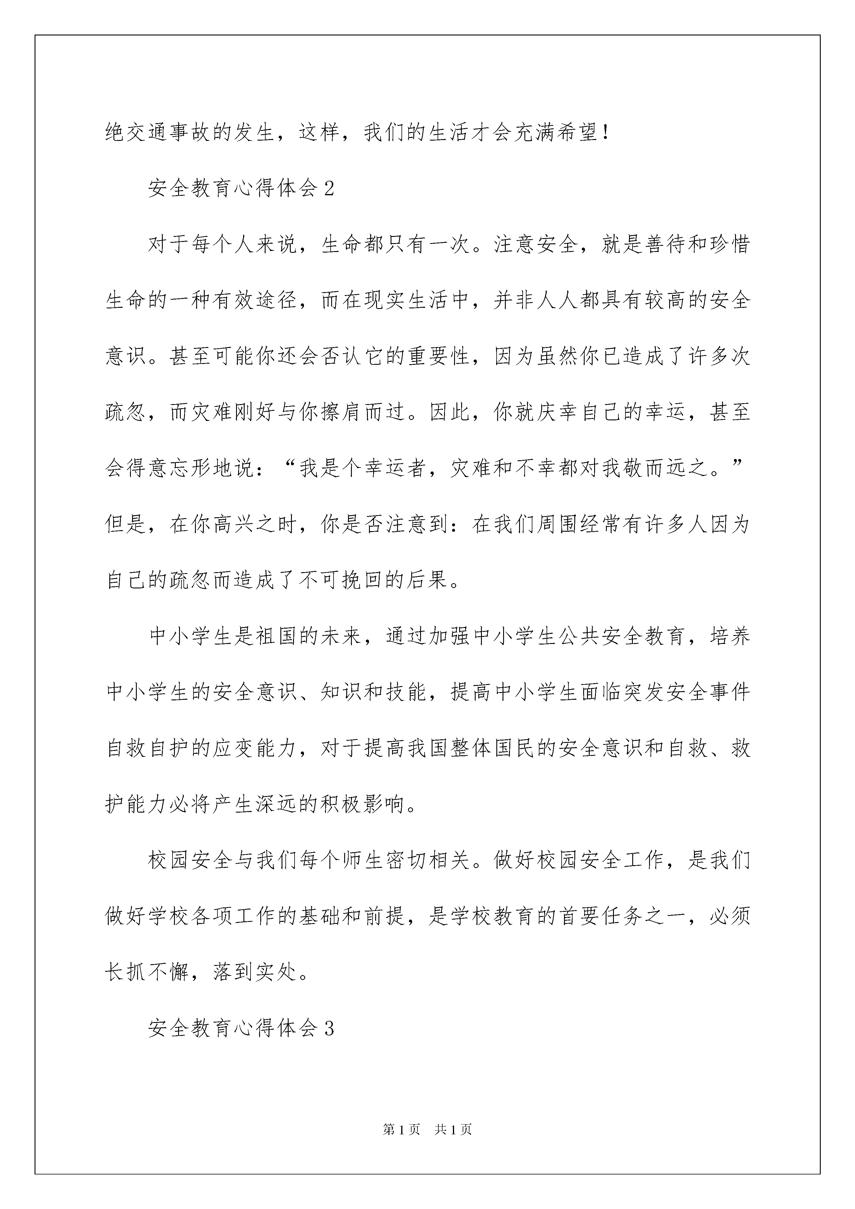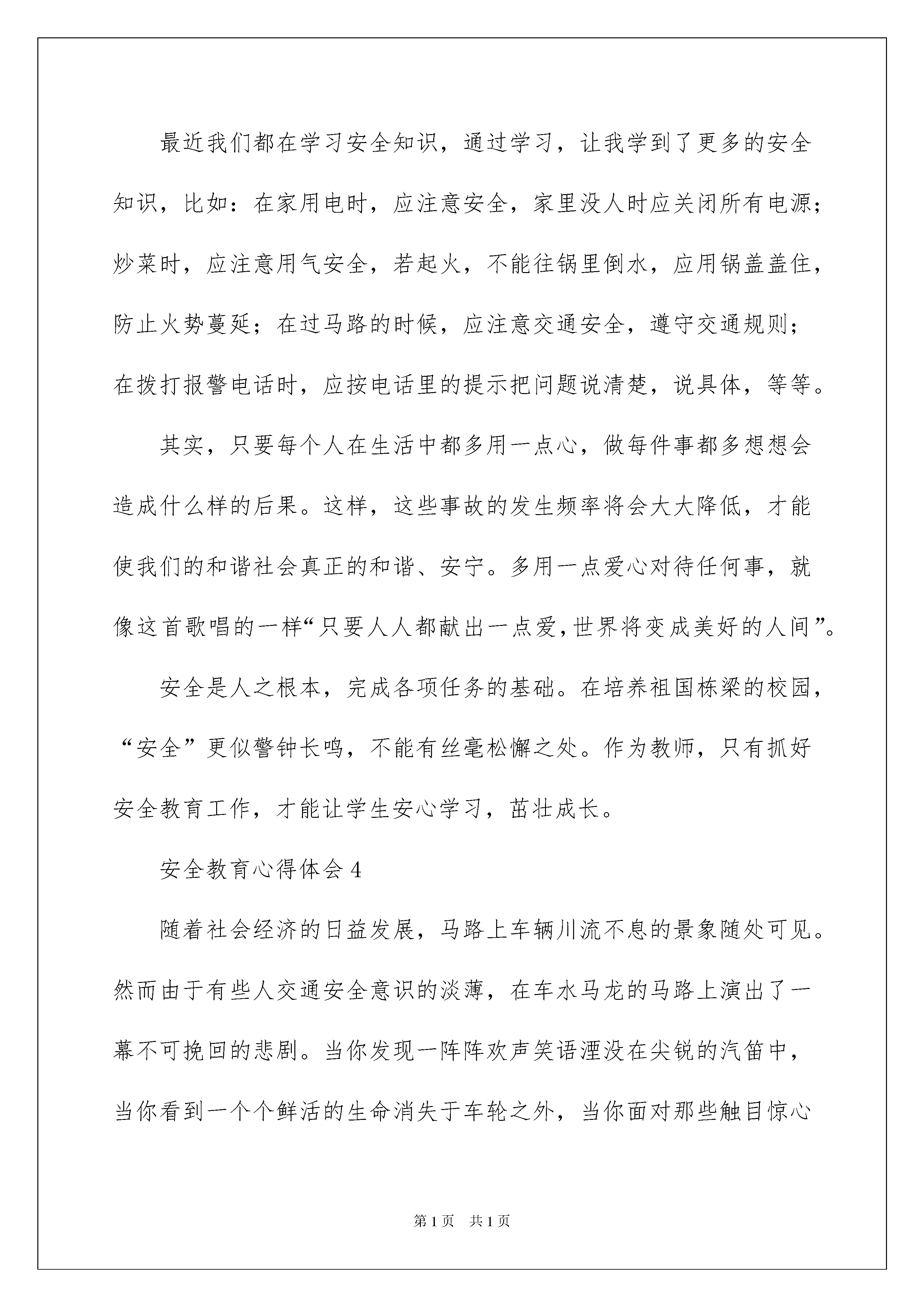2022安全教育心得体会(通用6篇)安全教育心得体会(通用6篇)我们心里有一些收获后,可用写心得体会的方式将其记录下来,这样可以不断更新自己的想法。那么好的心得体会都具备一些什么特点呢?下面是我为大家整理的安全教育心得体会(通用6篇),欢迎阅读与收藏。安全教育心得体会1人有了生命,才有快乐与悲伤,人有了生命,才有希望与理想,人有了生命,才有了对生命的珍爱。生命,是一种尊严,是一种权利:生命是宝贵的是任何东西不能买到的,生命只有一条。珍爱生命,享受生命,这本身就是最大的幸福。珍爱生命,生命就会以最大值回报你;无视生命,践踏生命,生命便会将你的权力收回。一个不珍爱生命的人,也就等于是自寻死路,我们每个人都要做到:我们每个人都要做到:珍爱生命,安全出行。每个人的生命都是父母给予我们的,它是无比宝贵的。有了生命的存在,才能成就我们一个个五彩的梦。一个人不会有第二次的生命,所以我们应该倍加珍惜。我们是祖国的未来,是未来的建设者和主宰者我作为一个小学生,更加应该有自我保护意识,从我做起,从小事做起,做一个遵守交通的人。为了自己,珍爱生命,才是你幸福生活的最好的标志。随着社会的经济发展水平不断提高,各种汽车也不断的更新生产出来,看看马路上川流不息形形色色的车辆就知道了,如今的车子品种之繁多足以让你看得眼花缭乱目不暇接。因此我们小朋友更应该自觉遵守交通规则,从小培养良好的习惯!爸爸妈妈经常会对我不厌其烦地在我耳边叮咛:过马路一定要走横行道,红灯停,绿灯行等等一些基本的常识,可是生性顽皮的我根本不放在心里,总是右耳进,左耳出,当作耳边风。直到有一天发生了这样一件事情,才让我彻底改变了以往的态度和坏习惯。记得那是一个天气晴朗的星期天,我和妈妈一起去逛天一广场。过马路的时候,我没有听妈妈的阻止,只是兴奋地在马路中间蹦蹦跳跳,早已经跑出了横行道的界线,全然不顾妈妈急切地叫喊声,而自顾自悠闲地奔跑着。看见妈妈吓得面红耳赤,追得气喘吁吁,竟然还恶作剧地笑妈妈这么胆小。就在我得意洋洋的时候,忽然,一辆摩托车从我的跟前急驶而来,擦身而过。直觉得右腿膝盖处一阵撕心裂肺的疼痛,我强忍着疼痛辛苦地低头一看,不仅吓了一跳,原来是摩托车的排气管把我的腿烫伤了,还丢了一大块的皮啊,隐隐的还有几丝血丝渗出来。我终于受不了那疼痛,便号啕大哭起来,这时妈妈早已经吓得脸通红通红的,接着又变得惨白惨白的,她心疼地一把把我搂在怀里,眼睛里的泪水汩汩地从妈妈的脸上滑落到我的伤口处。此时此刻,我真的后悔极了!可是后悔又有什么用啊,唉,真是自讨苦吃了!只听妈妈的叮咛又在我耳边响起:“勇敢点,谁叫你不听话!穿马路怎么可以乱跑呢,今天还算运气好,如果把你撞到了怎么办啊?是你自己的责任,撞了也是白撞的!这样也好,吃点苦头买个教训了,以后可要遵守交通规则哦!”我羞愧得无地自容,使劲地点点头!从此以后,我明白了交通安全的重要性。我就再也不乱穿马路乱闯红灯了,总是小心翼翼地拉着爸爸妈妈的手,规规距距地过马路。在这里,我还要呼吁所有和我一样顽皮的小孩,一定要自觉遵守交通规则,好好地过马路,当然也包括那些为了赶时间而闯红灯的大人们,请大家一定要爱惜生命!只要大家都能树立安全意识,就会杜绝交通事故的发生,这样,我们的生活才会充满希望!安全教育心得体会2对于每个人来说,生命都只有一次。注意安全,就是善待和珍惜生命的一种有效途径,而在现实生活中,并非人人都具有较高的安全意识。甚至可能你还会否认它的重要性,因为虽然你已造成了许多次疏忽,而灾难刚好与你擦肩而过。因此,你就庆幸自己的幸运,甚至会得意忘形地说:“我是个幸运者,灾难和不幸都对我敬而远之。”但是,在你高兴之时,你是否注意到:在我们周围经常有许多人因为自己的疏忽而造成了不可挽回的后果。中小学生是祖国的未来,通过加强中小学生公共安全教育,培养中小学生的安全意识、知识和技能,提高中小学生面临突发安全事件自救自护的应变能力,对于提高我国整体国民的安全意识和自救、救护能力必将产生深远的积极影响。校园安全与我们每个师生密切相关。做好校园安全工作,是我们做好学校各项工作的基础和前提,是学校教育的首要任务之一,必须长抓不懈,落到实处。安全教育心得体会3最近我们都在学习安全知识,通过学习,让我学到了更多的安全知识,比如:在家用电时,应注意安全,家里没人时应关闭所有电源;炒菜时,应注意用气安全,若起火,不能往锅里倒水,应用锅盖盖住,防止火势蔓延;在过马路的时候,应注意交通安全,遵守交通规则;在拨打报警电话时,应按电话里的提示把问题说清楚,说具体,等等。其实,只要每个人在生活中都多用一点心,做每件事都多想想会造成什么样的