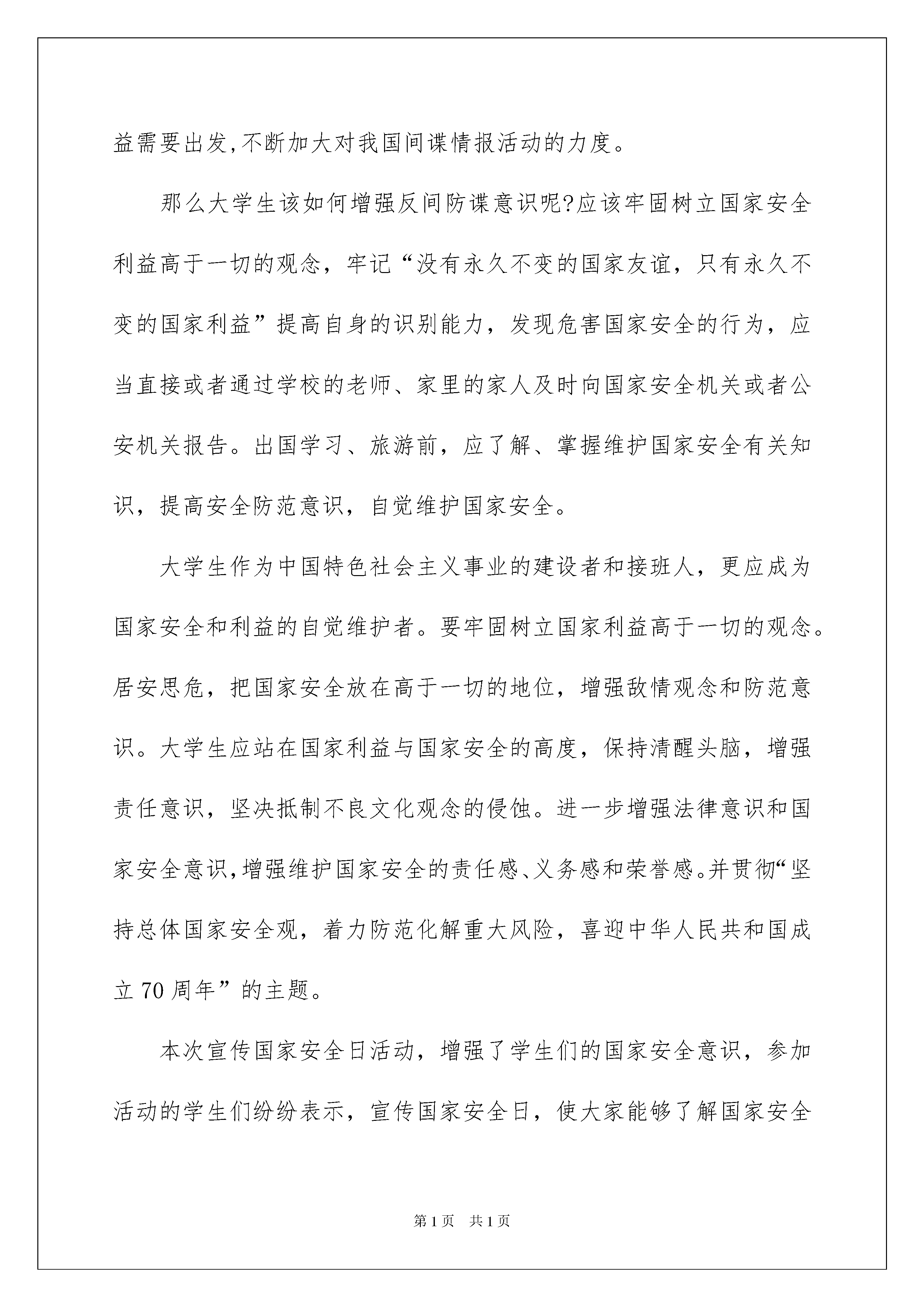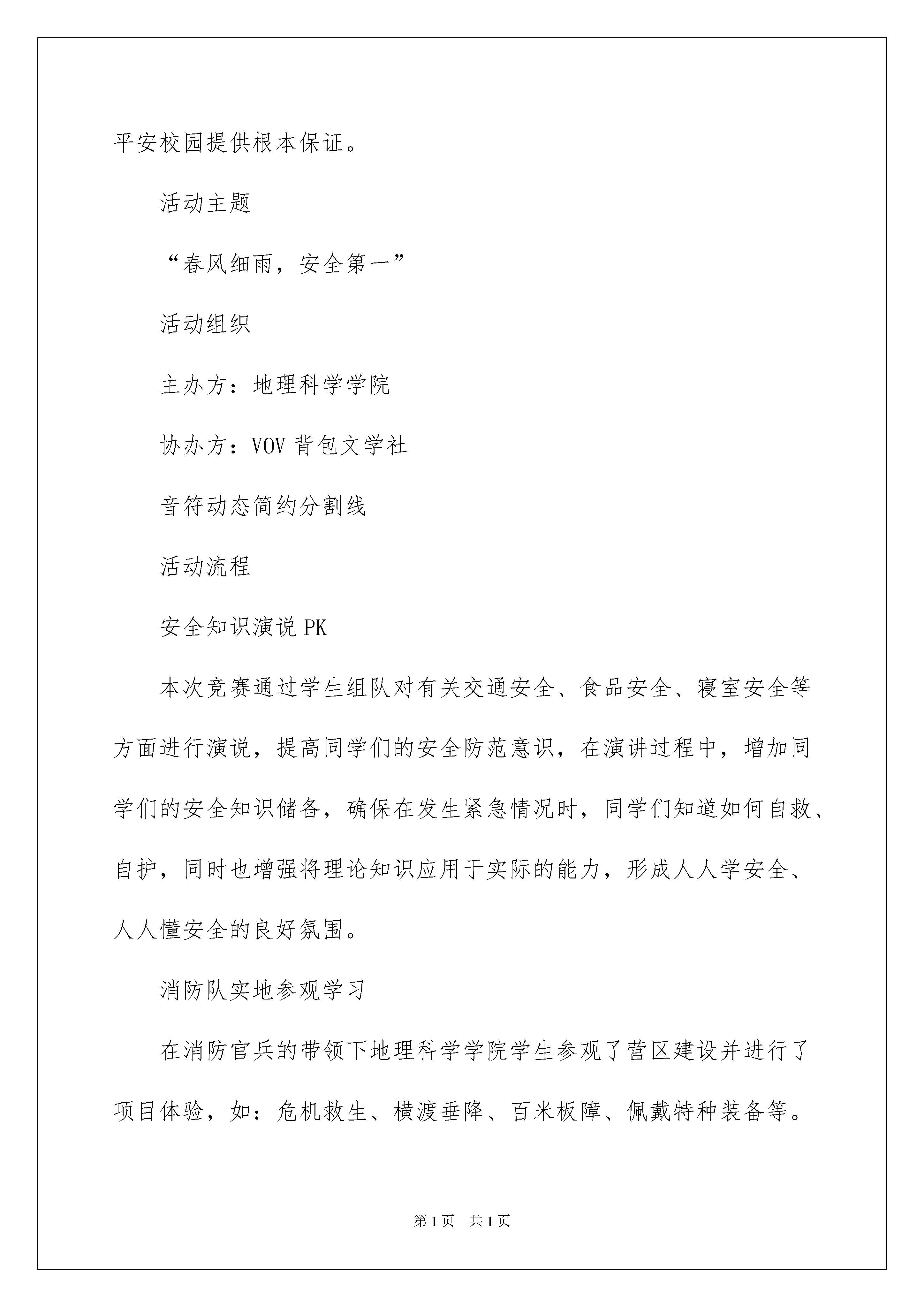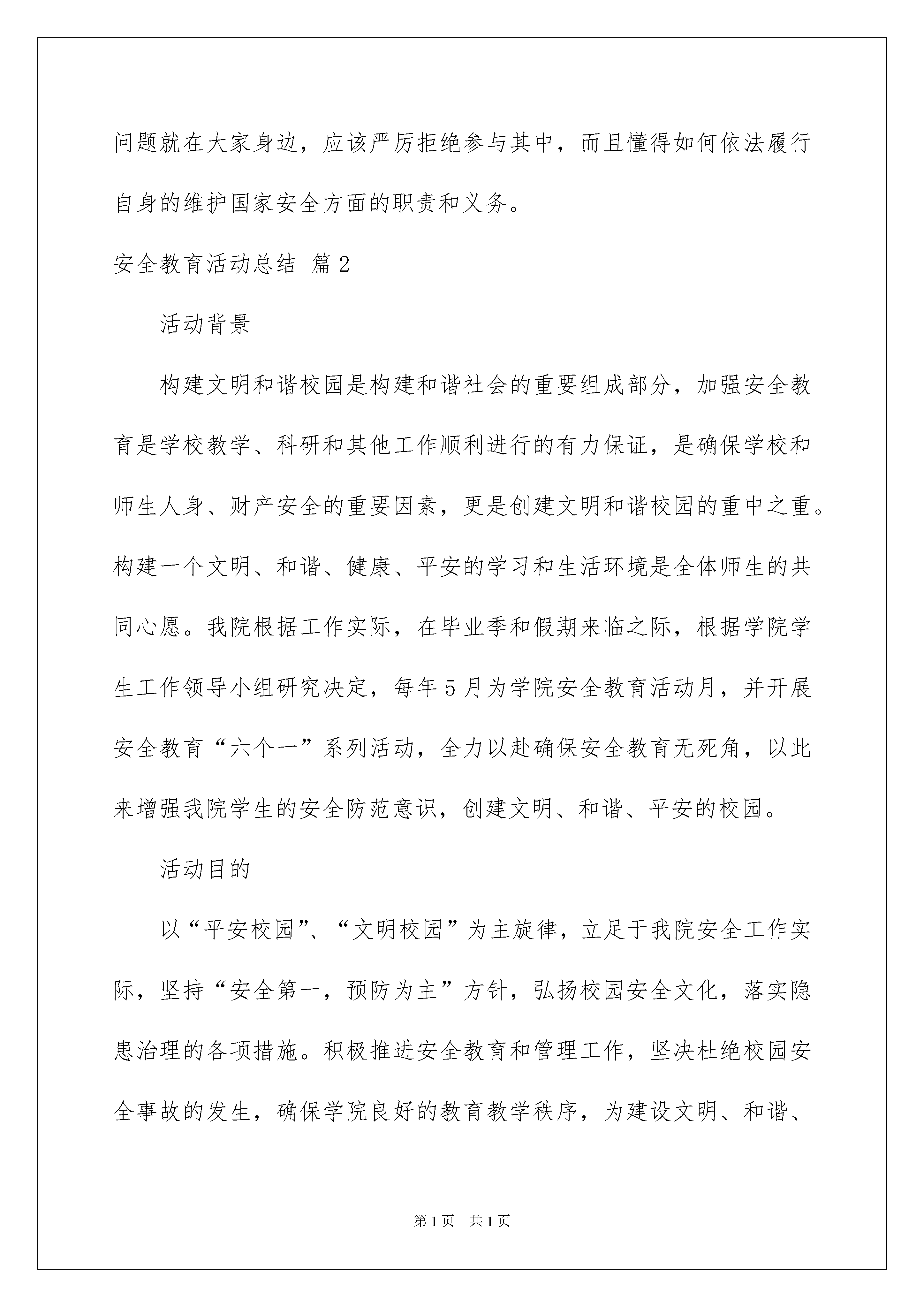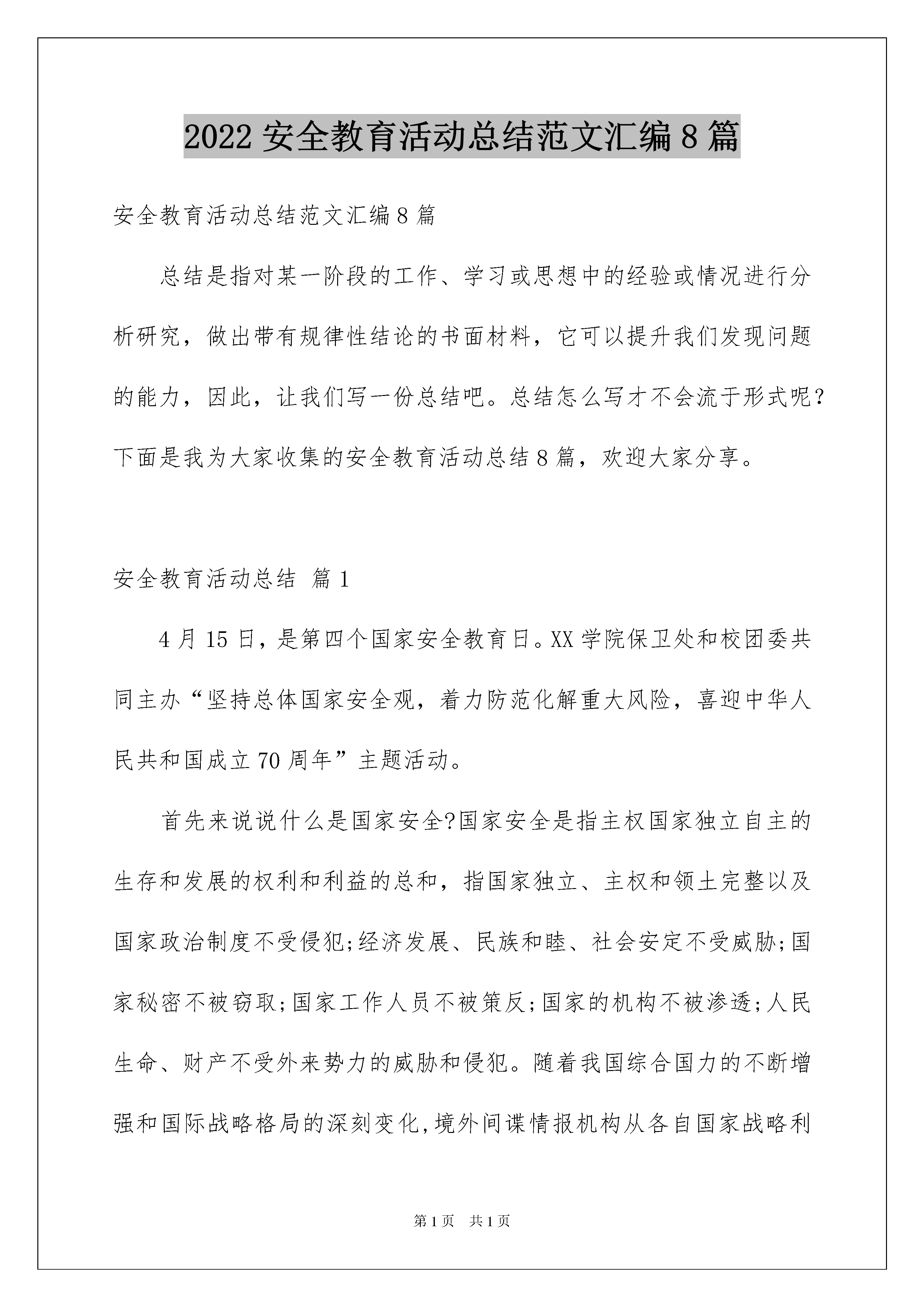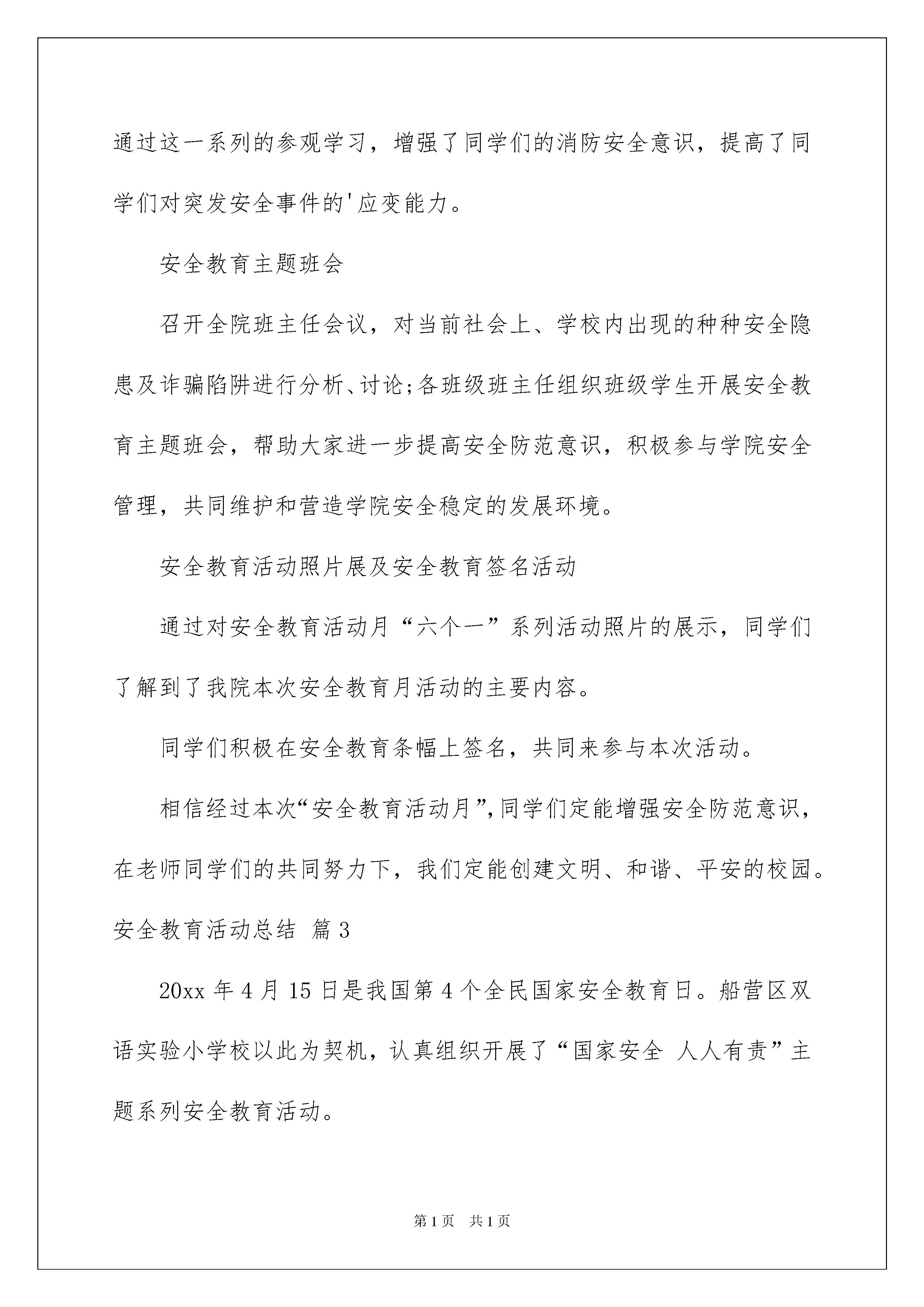 2022安全教育活动总结范文汇编8篇安全教育活动总结范文汇编8篇总结是指对某一阶段的工作、学习或思想中的经验或情况进行分析研究,做出带有规律性结论的书面材料,它可以提升我们发现问题的能力,因此,让我们写一份总结吧。总结怎么写才不会流于形式呢?下面是我为大家收集的安全教育活动总结8篇,欢迎大家分享。安全教育活动总结篇14月15日,是第四个国家安全教育日。XX学院保卫处和校团委共同主办“坚持总体国家安全观,着力防范化解重大风险,喜迎中华人民共和国成立70周年”主题活动。首先来说说什么是国家安全?国家安全是指主权国家独立自主的生存和发展的权利和利益的总和,指国家独立、主权和领土完整以及国家政治制度不受侵犯;经济发展、民族和睦、社会安定不受威胁;国家秘密不被窃取;国家工作人员不被策反;国家的机构不被渗透;人民生命、财产不受外来势力的威胁和侵犯。随着我国综合国力的不断增强和国际战略格局的深刻变化,境外间谍情报机构从各自国家战略利益需要出发,不断加大对我国间谍情报活动的力度。那么大学生该如何增强反间防谍意识呢?应该牢固树立国家安全利益高于一切的观念,牢记“没有永久不变的国家友谊,只有永久不变的国家利益”提高自身的识别能力,发现危害国家安全的行为,应当直接或者通过学校的老师、家里的家人及时向国家安全机关或者公安机关报告。出国学习、旅游前,应了解、掌握维护国家安全有关知识,提高安全防范意识,自觉维护国家安全。大学生作为中国特色社会主义事业的建设者和接班人,更应成为国家安全和利益的自觉维护者。要牢固树立国家利益高于一切的观念。居安思危,把国家安全放在高于一切的地位,增强敌情观念和防范意识。大学生应站在国家利益与国家安全的高度,保持清醒头脑,增强责任意识,坚决抵制不良文化观念的侵蚀。进一步增强法律意识和国家安全意识,增强维护国家安全的责任感、义务感和荣誉感。并贯彻“坚持总体国家安全观,着力防范化解重大风险,喜迎中华人民共和国成立70周年”的主题。本次宣传国家安全日活动,增强了学生们的国家安全意识,参加活动的学生们纷纷表示,宣传国家安全日,使大家能够了解国家安全问题就在大家身边,应该严厉拒绝参与其中,而且懂得如何依法履行自身的维护国家安全方面的职责和义务。安全教育活动总结篇2活动背景构建文明和谐校园是构建和谐社会的重要组成部分,加强安全教育是学校教学、科研和其他工作顺利进行的有力保证,是确保学校和师生人身、财产安全的重要因素,更是创建文明和谐校园的重中之重。构建一个文明、和谐、健康、平安的学习和生活环境是全体师生的共同心愿。我院根据工作实际,在毕业季和假期来临之际,根据学院学生工作领导小组研究决定,每年5月为学院安全教育活动月,并开展安全教育“六个一”系列活动,全力以赴确保安全教育无死角,以此来增强我院学生的安全防范意识,创建文明、和谐、平安的校园。活动目的以“平安校园”、“文明校园”为主旋律,立足于我院安全工作实际,坚持“安全第一,预防为主”方针,弘扬校园安全文化,落实隐患治理的各项措施。积极推进安全教育和管理工作,坚决杜绝校园安全事故的发生,确保学院良好的教育教学秩序,为建设文明、和谐、平安校园提供根本保证。活动主题“春风细雨,安全第一”活动组织主办方:地理科学学院协办方:VOV背包文学社音符动态简约分割线活动流程安全知识演说PK本次竞赛通过学生组队对有关交通安全、食品安全、寝室安全等方面进行演说,提高同学们的安全防范意识,在演讲过程中,增加同学们的安全知识储备,确保在发生紧急情况时,同学们知道如何自救、自护,同时也增强将理论知识应用于实际的能力,形成人人学安全、人人懂安全的良好氛围。消防队实地参观学习在消防官兵的带领下地理科学学院学生参观了营区建设并进行了项目体验,如:危机救生、横渡垂降、百米板障、佩戴特种装备等。通过这一系列的参观学习,增强了同学们的消防安全意识,提高了同学们对突发安全事件的'应变能力。安全教育主题班会召开全院班主任会议,对当前社会上、学校内出现的种种安全隐患及诈骗陷阱进行分析、讨论;各班级班主任组织班级学生开展安全教育主题班会,帮助大家进一步提高安全防范意识,积极参与学院安全管理,共同维护和营造学院安全稳定的发展环境。安全教育活动照片展及安全教育签名活动通过对安全教育活动月“六个一”系列活动照片的展示,同学们了解到了我院本次安全教育月活动的主要内容。同学们积极在安全教育条幅上签名,共同来参与本次活动。相信经过本次“安全教育活动月”,同学们定能增强安全防范意识,在老师同学们的共同努力下,我们定能创建文明、和谐、平安的校园。安全教育活动总结篇320xx年4月15日是我国第