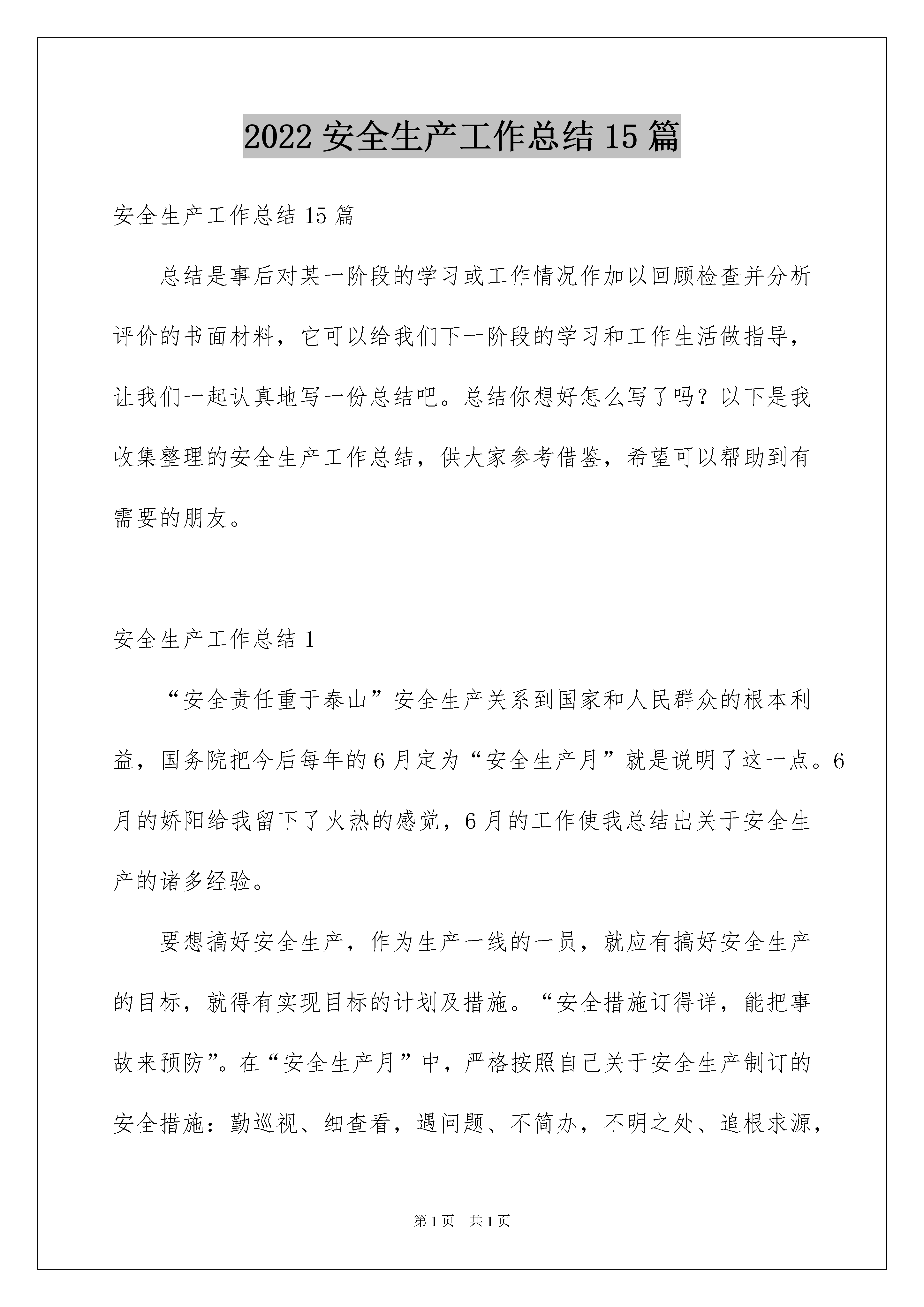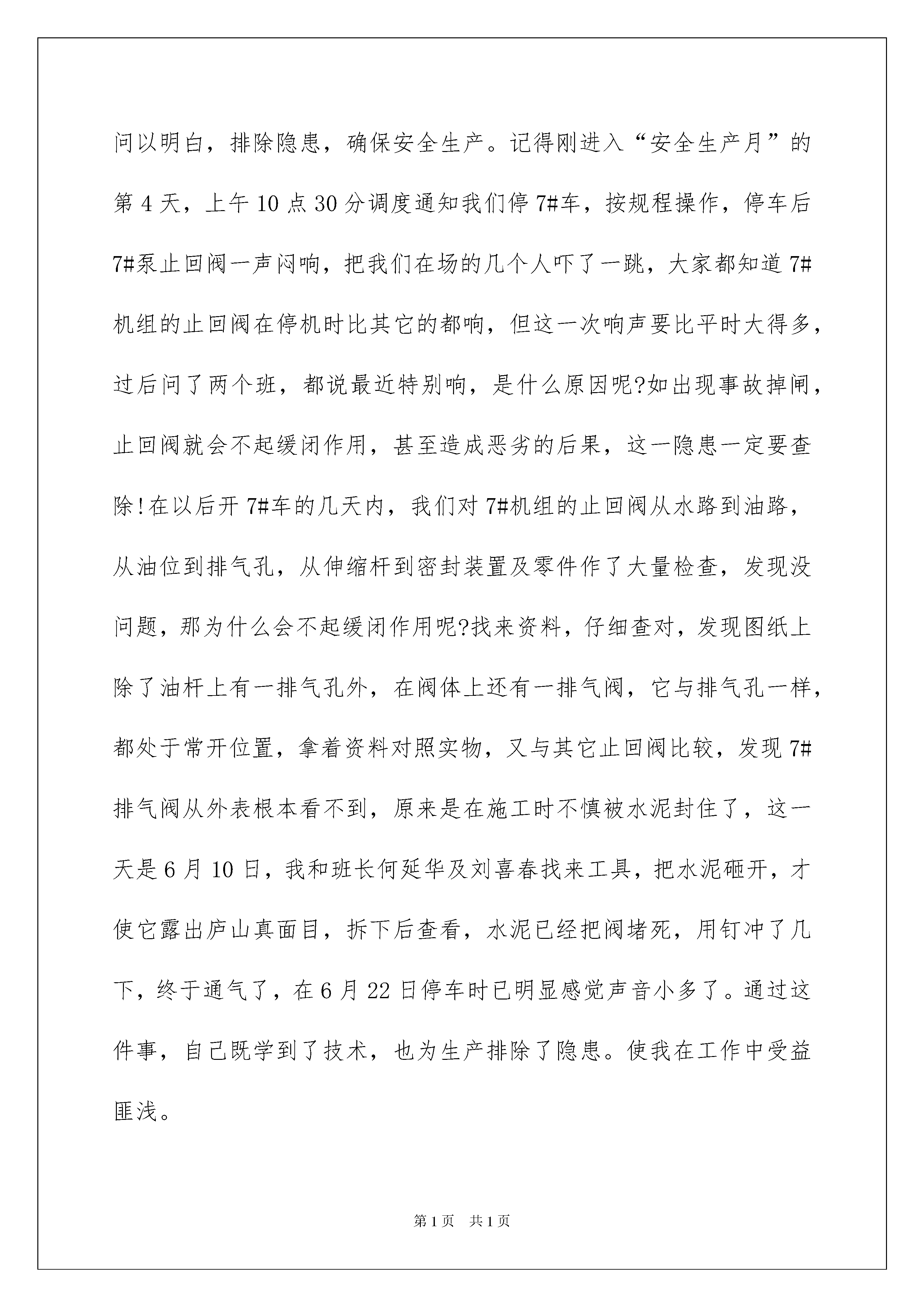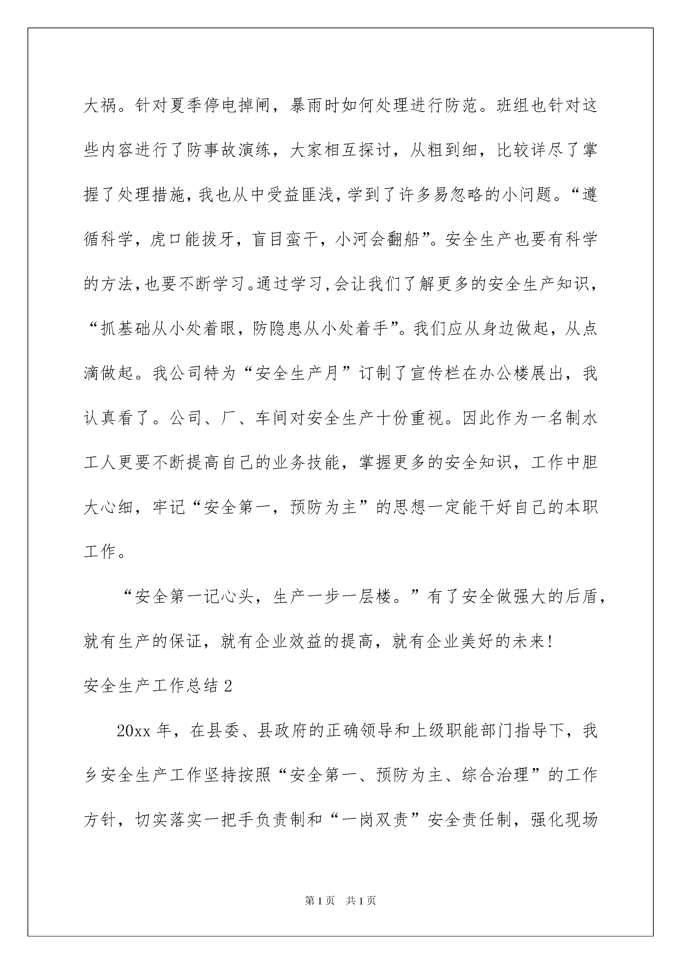 2022安全生产工作总结15篇安全生产工作总结15篇总结是事后对某一阶段的学习或工作情况作加以回顾检查并分析评价的书面材料,它可以给我们下一阶段的学习和工作生活做指导,让我们一起认真地写一份总结吧。总结你想好怎么写了吗?以下是我收集整理的安全生产工作总结,供大家参考借鉴,希望可以帮助到有需要的朋友。安全生产工作总结1“安全责任重于泰山”安全生产关系到国家和人民群众的根本利益,国务院把今后每年的6月定为“安全生产月”就是说明了这一点。6月的娇阳给我留下了火热的感觉,6月的工作使我总结出关于安全生产的诸多经验。要想搞好安全生产,作为生产一线的一员,就应有搞好安全生产的目标,就得有实现目标的计划及措施。“安全措施订得详,能把事故来预防”。在“安全生产月”中,严格按照自己关于安全生产制订的安全措施:勤巡视、细查看,遇问题、不简办,不明之处、追根求源,问以明白,排除隐患,确保安全生产。记得刚进入“安全生产月”的第4天,上午10点30分调度通知我们停7#车,按规程操作,停车后7#泵止回阀一声闷响,把我们在场的几个人吓了一跳,大家都知道7#机组的止回阀在停机时比其它的都响,但这一次响声要比平时大得多,过后问了两个班,都说最近特别响,是什么原因呢?如出现事故掉闸,止回阀就会不起缓闭作用,甚至造成恶劣的后果,这一隐患一定要查除!在以后开7#车的几天内,我们对7#机组的止回阀从水路到油路,从油位到排气孔,从伸缩杆到密封装置及零件作了大量检查,发现没问题,那为什么会不起缓闭作用呢?找来资料,仔细查对,发现图纸上除了油杆上有一排气孔外,在阀体上还有一排气阀,它与排气孔一样,都处于常开位置,拿着资料对照实物,又与其它止回阀比较,发现7#排气阀从外表根本看不到,原来是在施工时不慎被水泥封住了,这一天是6月10日,我和班长何延华及刘喜春找来工具,把水泥砸开,才使它露出庐山真面目,拆下后查看,水泥已经把阀堵死,用钉冲了几下,终于通气了,在6月22日停车时已明显感觉声音小多了。通过这件事,自己既学到了技术,也为生产排除了隐患。使我在工作中受益匪浅。正是由于自己生制订了严格的安全产措施,工作起来得心应手,安全生产才有保障。千里之堤溃于蚁穴,因此,对自己的每一次操作,每一回检查都与自己学习的安全知识联系起来,做到有的放矢,防患于未然。“安全生产月”已经结束了,但安全生产的意识早已植根在我们心中,只有安全生产天天抓,安全生产大家抓,我们的供水事业、我们的生活才能开出幸福花。为保障职工企业生命财产,提高广大职工安全生产的意识,推进安全生产活动深入开展。****年6月被定为“安全生产月”。“安全责任重于泰山。”安全与生产就如一对孪生姐妹,紧密相连,“忽视安全抓生产是火中取栗,脱离安全注求效益如水中捞月”。6月份是“安全生产月”,同时也正值我厂“安康杯”活动期间。为此,安全生产将引起我们的高度重视。在“安全生产月”当中,遵章守纪是第一位的。严格遵守我厂的规章制度和各项操作规程。认真学习《****安全生产月班组学习材料》,通过阅读,使我更深一步了解安全生产的重要性,尤其是那些因小失大的安全生产事故给人的沉痛的教训,从而牢记“多看一眼,安全保险;多防一步,少出事故。”很多事情都是我们忽视了一顶点儿而酿成大祸。针对夏季停电掉闸,暴雨时如何处理进行防范。班组也针对这些内容进行了防事故演练,大家相互探讨,从粗到细,比较详尽了掌握了处理措施,我也从中受益匪浅,学到了许多易忽略的小问题。“遵循科学,虎口能拔牙,盲目蛮干,小河会翻船”。安全生产也要有科学的方法,也要不断学习。通过学习,会让我们了解更多的安全生产知识,“抓基础从小处着眼,防隐患从小处着手”。我们应从身边做起,从点滴做起。我公司特为“安全生产月”订制了宣传栏在办公楼展出,我认真看了。公司、厂、车间对安全生产十份重视。因此作为一名制水工人更要不断提高自己的业务技能,掌握更多的安全知识,工作中胆大心细,牢记“安全第一,预防为主”的思想一定能干好自己的本职工作。“安全第一记心头,生产一步一层楼。”有了安全做强大的后盾,就有生产的保证,就有企业效益的提高,就有企业美好的未来!安全生产工作总结220xx年,在县委、县政府的正确领导和上级职能部门指导下,我乡安全生产工作坚持按照“安全第一、预防为主、综合治理”的工作方针,切实落实一把手负责制和“一岗双责”安全责任制,强化现场监管,狠抓隐患整改,全镇安全生产形势实现整体平稳。现将我乡上半年安全生产工作及下半年工作打算作如下汇报:一、加强领导,落实责任为了切实加强对安全生产工作的领导,落实一把手负责制和“一岗双责制”,乡里成立了由乡长向