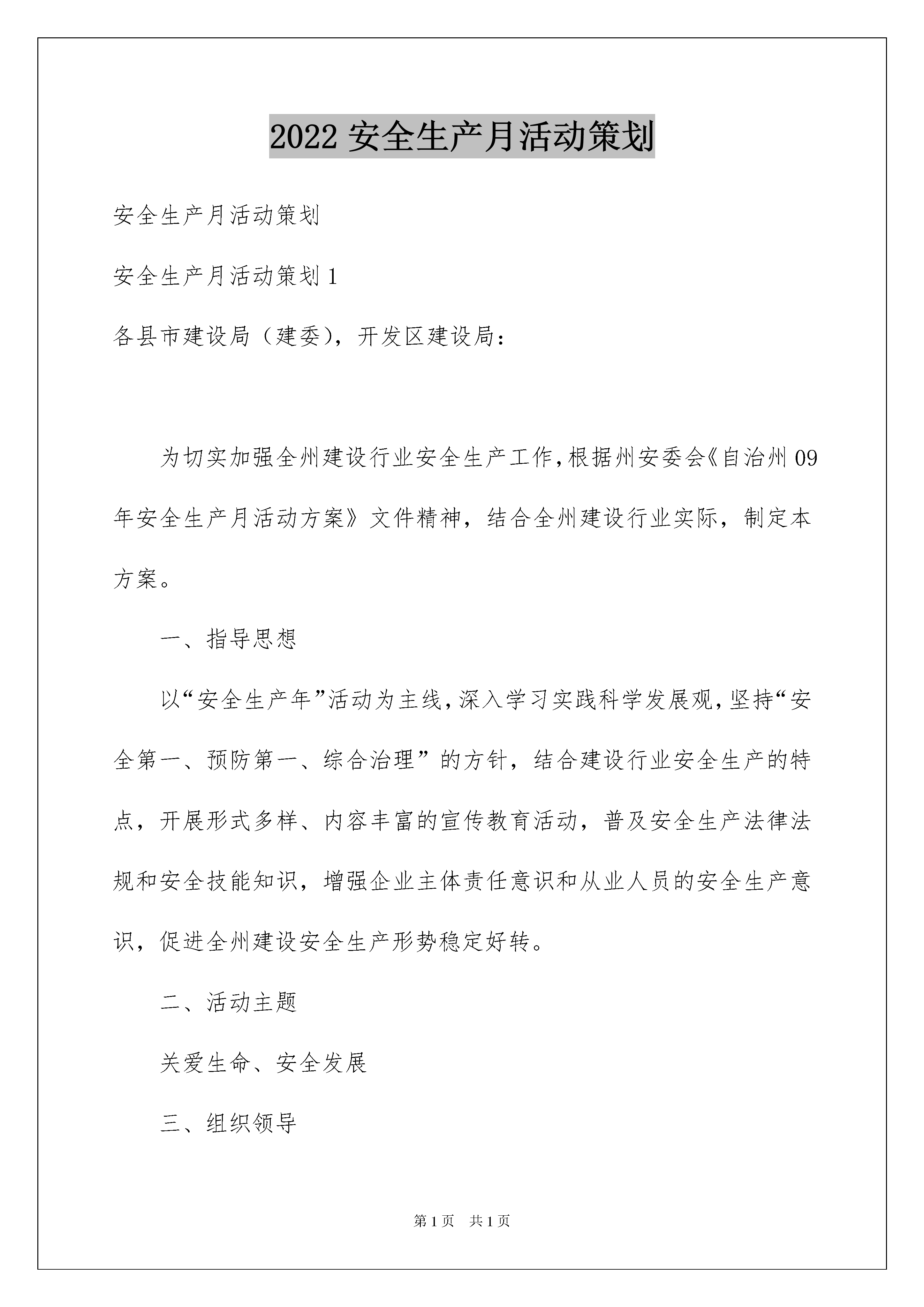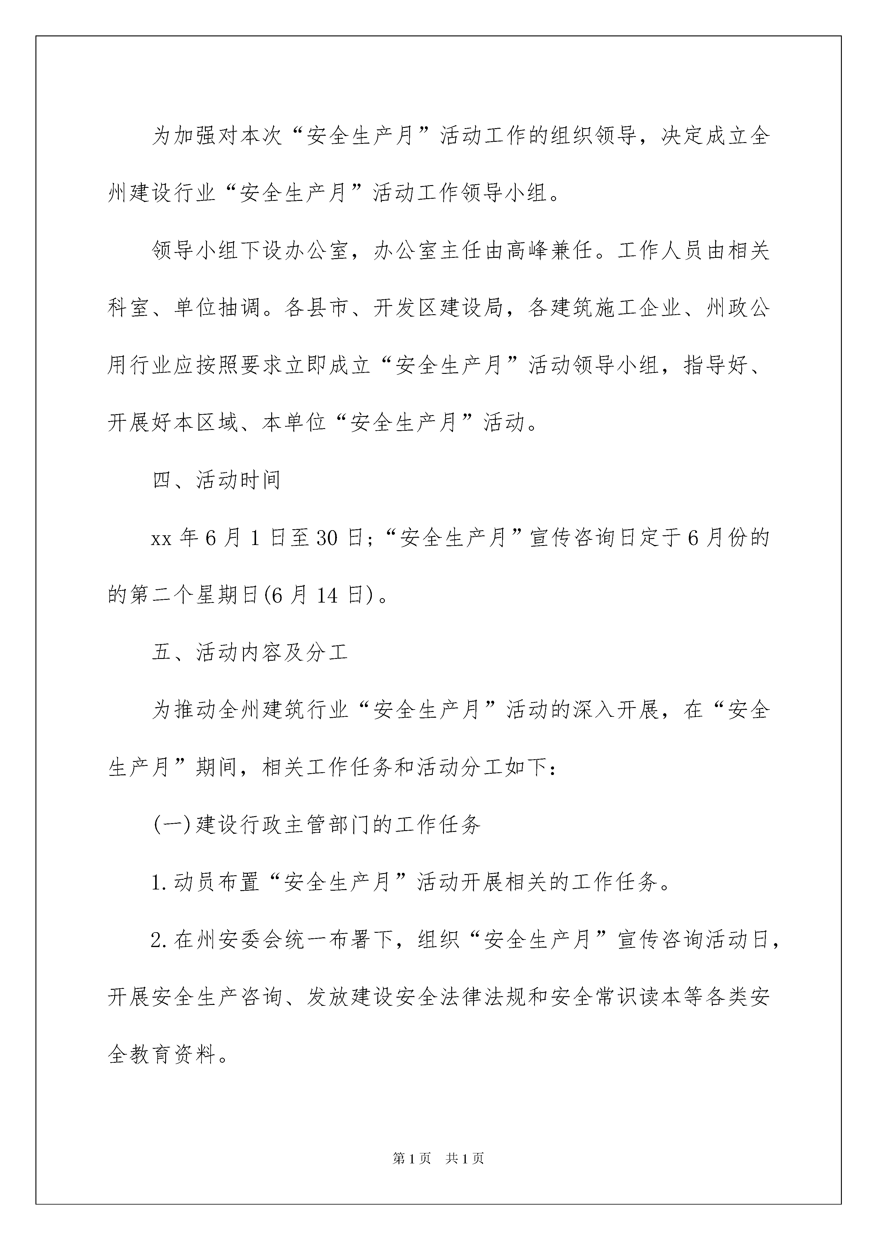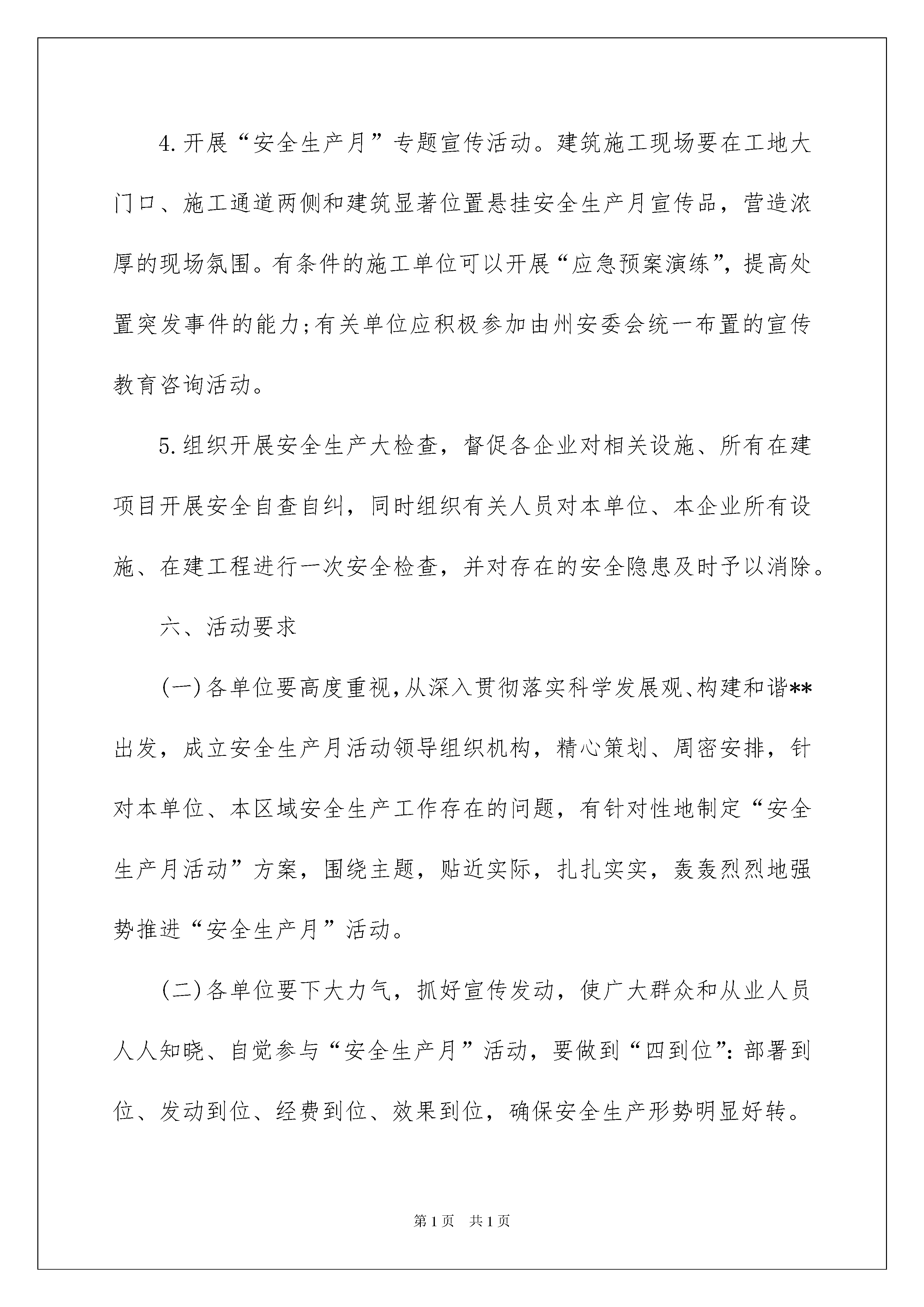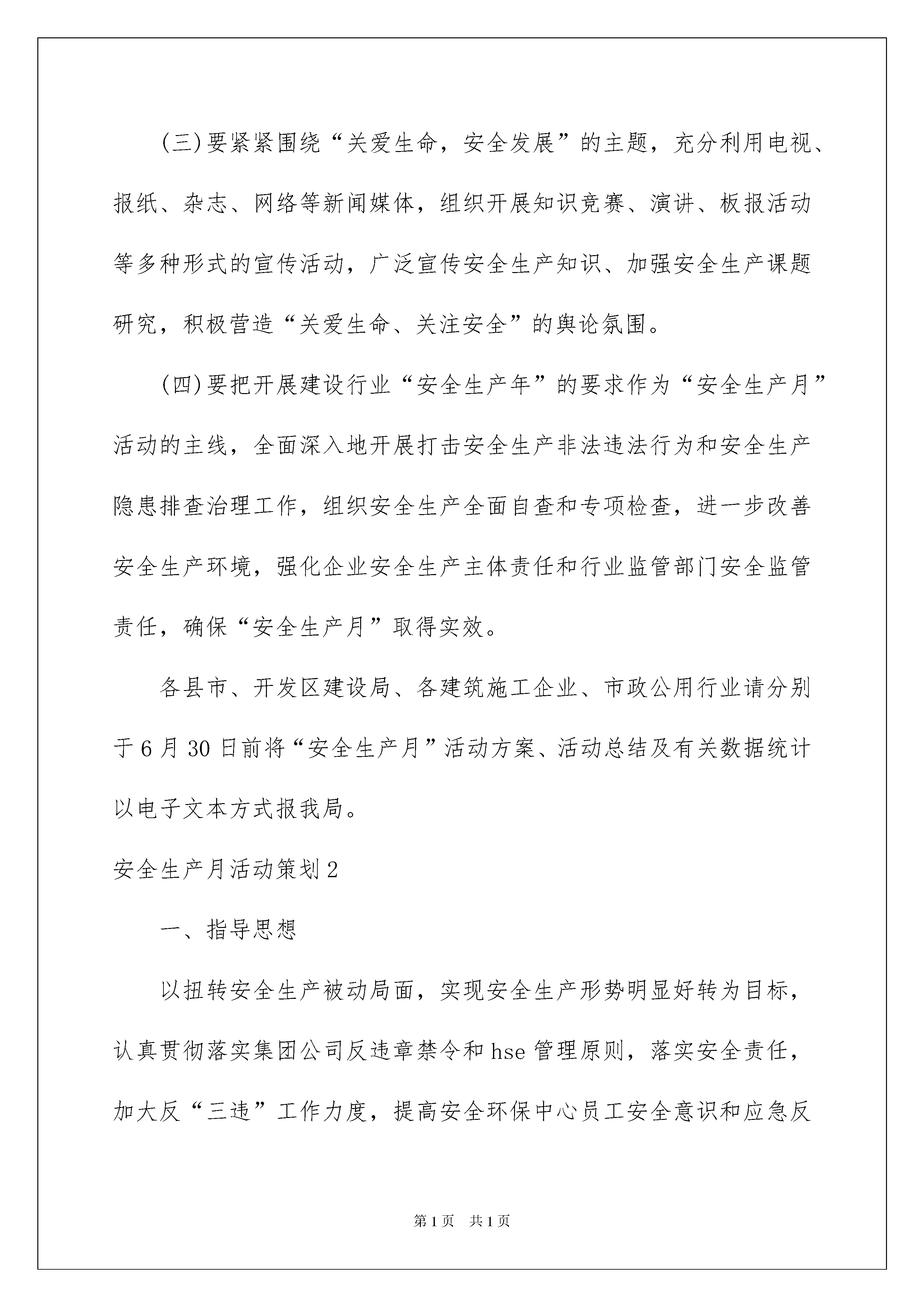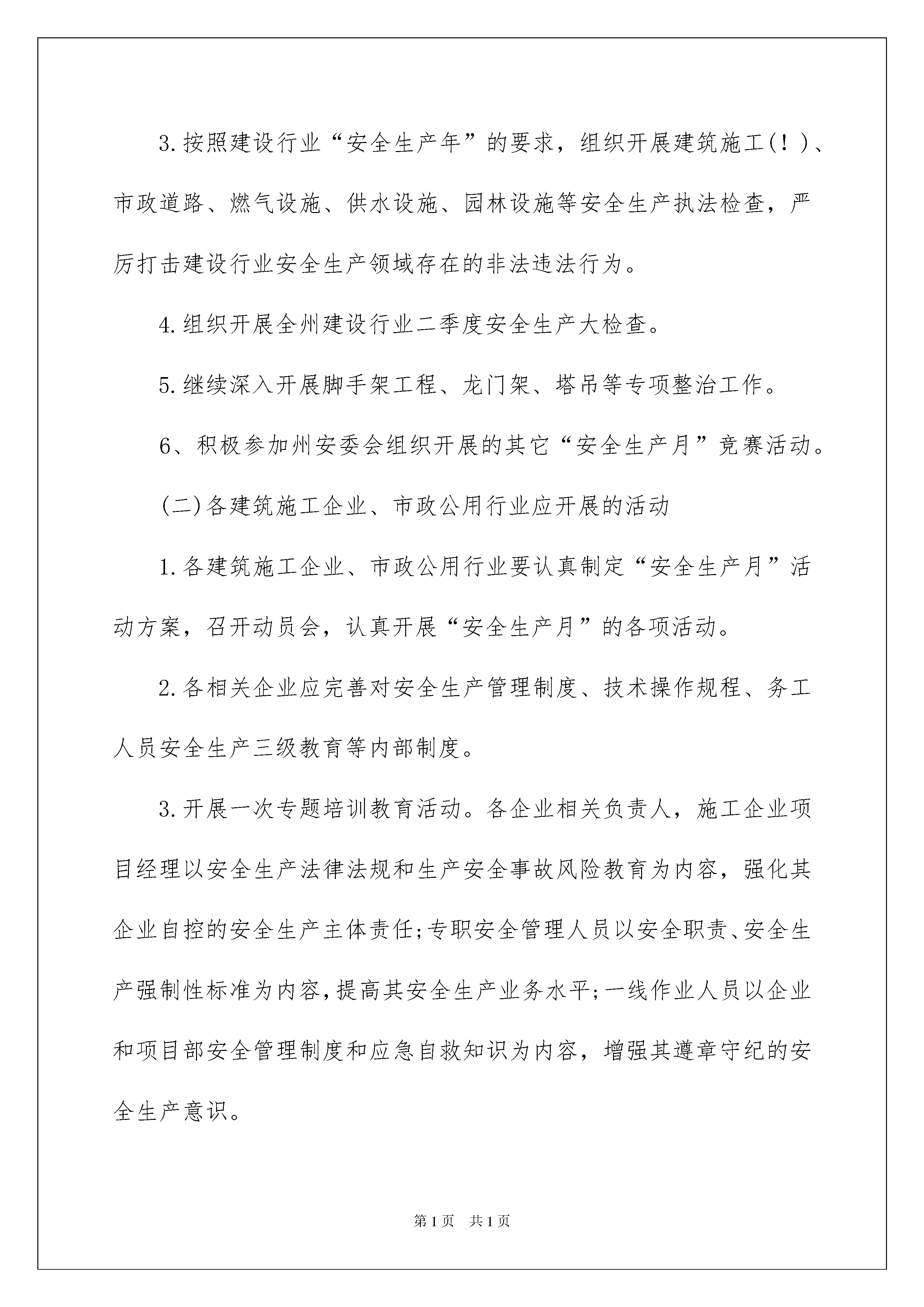 2022安全生产月活动策划安全生产月活动策划安全生产月活动策划1各县市建设局(建委),开发区建设局:为切实加强全州建设行业安全生产工作,根据州安委会《自治州09年安全生产月活动方案》文件精神,结合全州建设行业实际,制定本方案。一、指导思想以“安全生产年”活动为主线,深入学习实践科学发展观,坚持“安全第一、预防第一、综合治理”的方针,结合建设行业安全生产的特点,开展形式多样、内容丰富的宣传教育活动,普及安全生产法律法规和安全技能知识,增强企业主体责任意识和从业人员的安全生产意识,促进全州建设安全生产形势稳定好转。二、活动主题关爱生命、安全发展三、组织领导为加强对本次“安全生产月”活动工作的组织领导,决定成立全州建设行业“安全生产月”活动工作领导小组。领导小组下设办公室,办公室主任由高峰兼任。工作人员由相关科室、单位抽调。各县市、开发区建设局,各建筑施工企业、州政公用行业应按照要求立即成立“安全生产月”活动领导小组,指导好、开展好本区域、本单位“安全生产月”活动。四、活动时间xx年6月1日至30日;“安全生产月”宣传咨询日定于6月份的的第二个星期日(6月14日)。五、活动内容及分工为推动全州建筑行业“安全生产月”活动的深入开展,在“安全生产月”期间,相关工作任务和活动分工如下:(一)建设行政主管部门的工作任务1.动员布置“安全生产月”活动开展相关的工作任务。2.在州安委会统一布署下,组织“安全生产月”宣传咨询活动日,开展安全生产咨询、发放建设安全法律法规和安全常识读本等各类安全教育资料。3.按照建设行业“安全生产年”的要求,组织开展建筑施工(!)、市政道路、燃气设施、供水设施、园林设施等安全生产执法检查,严厉打击建设行业安全生产领域存在的非法违法行为。4.组织开展全州建设行业二季度安全生产大检查。5.继续深入开展脚手架工程、龙门架、塔吊等专项整治工作。6、积极参加州安委会组织开展的其它“安全生产月”竞赛活动。(二)各建筑施工企业、市政公用行业应开展的活动1.各建筑施工企业、市政公用行业要认真制定“安全生产月”活动方案,召开动员会,认真开展“安全生产月”的各项活动。2.各相关企业应完善对安全生产管理制度、技术操作规程、务工人员安全生产三级教育等内部制度。3.开展一次专题培训教育活动。各企业相关负责人,施工企业项目经理以安全生产法律法规和生产安全事故风险教育为内容,强化其企业自控的安全生产主体责任;专职安全管理人员以安全职责、安全生产强制性标准为内容,提高其安全生产业务水平;一线作业人员以企业和项目部安全管理制度和应急自救知识为内容,增强其遵章守纪的安全生产意识。4.开展“安全生产月”专题宣传活动。建筑施工现场要在工地大门口、施工通道两侧和建筑显著位置悬挂安全生产月宣传品,营造浓厚的现场氛围。有条件的施工单位可以开展“应急预案演练”,提高处置突发事件的能力;有关单位应积极参加由州安委会统一布置的宣传教育咨询活动。5.组织开展安全生产大检查,督促各企业对相关设施、所有在建项目开展安全自查自纠,同时组织有关人员对本单位、本企业所有设施、在建工程进行一次安全检查,并对存在的安全隐患及时予以消除。六、活动要求(一)各单位要高度重视,从深入贯彻落实科学发展观、构建和谐**出发,成立安全生产月活动领导组织机构,精心策划、周密安排,针对本单位、本区域安全生产工作存在的问题,有针对性地制定“安全生产月活动”方案,围绕主题,贴近实际,扎扎实实,轰轰烈烈地强势推进“安全生产月”活动。(二)各单位要下大力气,抓好宣传发动,使广大群众和从业人员人人知晓、自觉参与“安全生产月”活动,要做到“四到位”:部署到位、发动到位、经费到位、效果到位,确保安全生产形势明显好转。(三)要紧紧围绕“关爱生命,安全发展”的主题,充分利用电视、报纸、杂志、网络等新闻媒体,组织开展知识竞赛、演讲、板报活动等多种形式的宣传活动,广泛宣传安全生产知识、加强安全生产课题研究,积极营造“关爱生命、关注安全”的舆论氛围。(四)要把开展建设行业“安全生产年”的要求作为“安全生产月”活动的主线,全面深入地开展打击安全生产非法违法行为和安全生产隐患排查治理工作,组织安全生产全面自查和专项检查,进一步改善安全生产环境,强化企业安全生产主体责任和行业监管部门安全监管责任,确保“安全生产月”取得实效。各县市、开发区建设局、各建筑施工企业、市政公用行业请分别于6月30日前将“安全生产月”活动方案、活动总结及有关数据统计以电子文本方式报我局。安全生产月活动策划2一、指导思想以扭转安全生产被动局面,实现安全生产形势明显好转为目标,认真贯彻落实集团公司反违