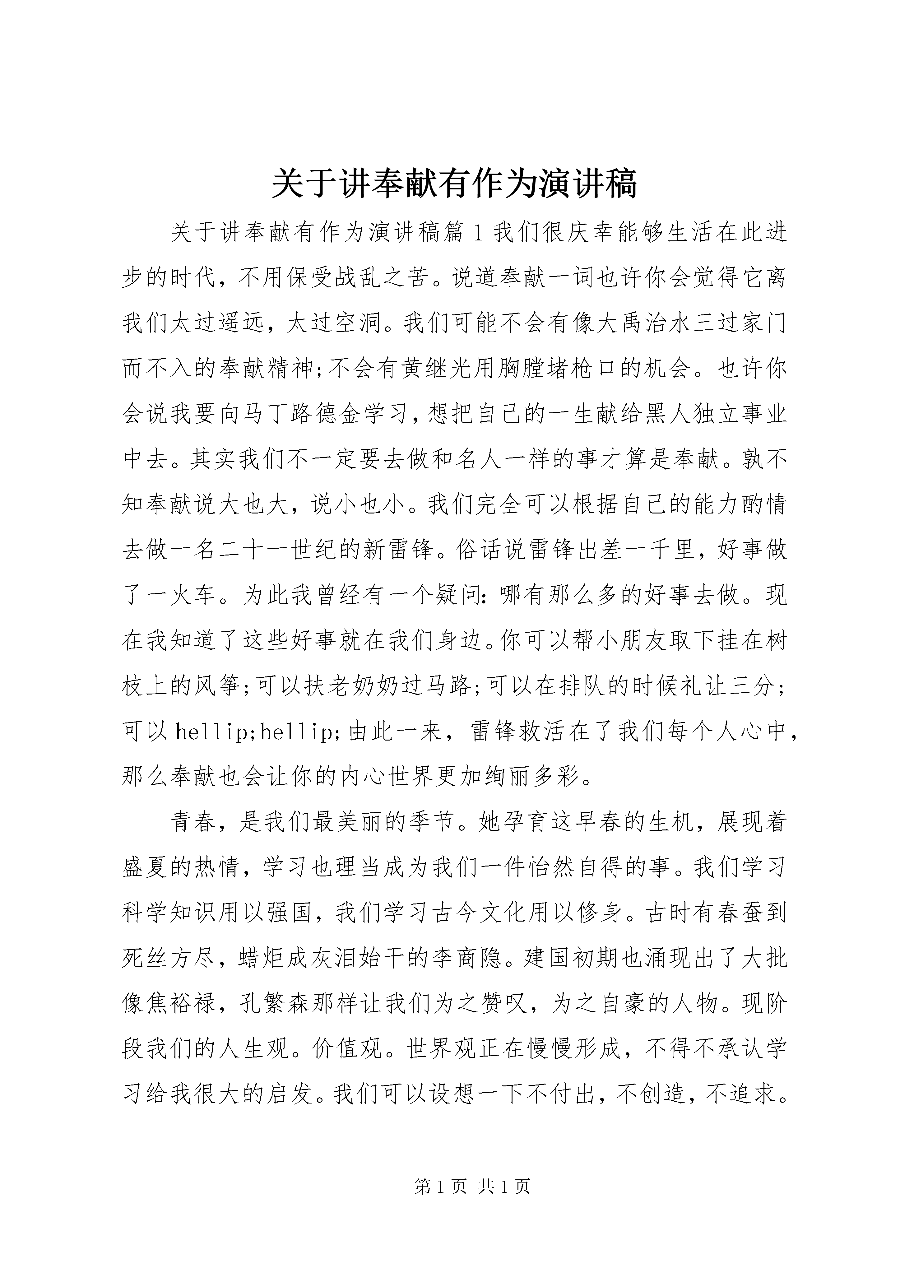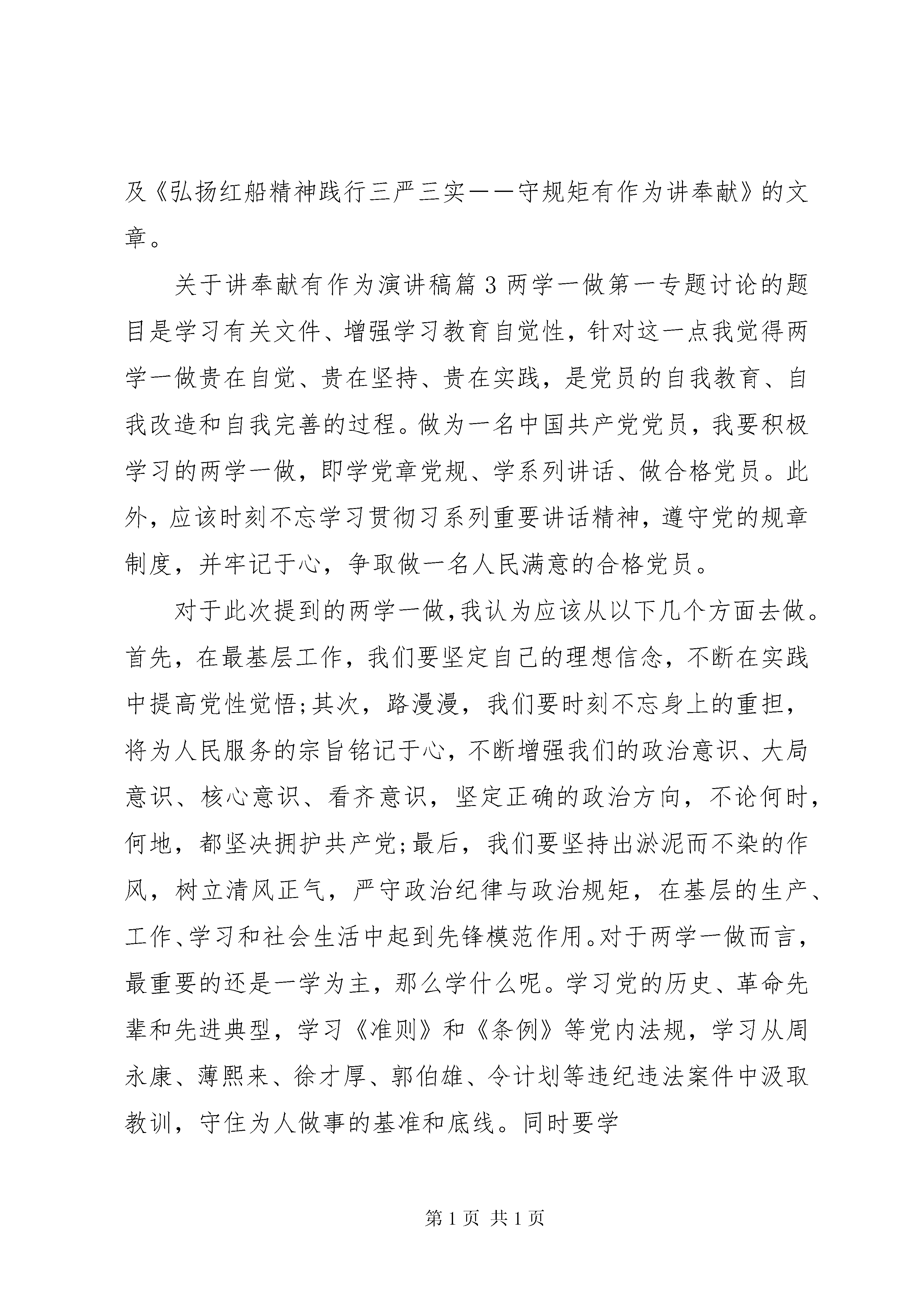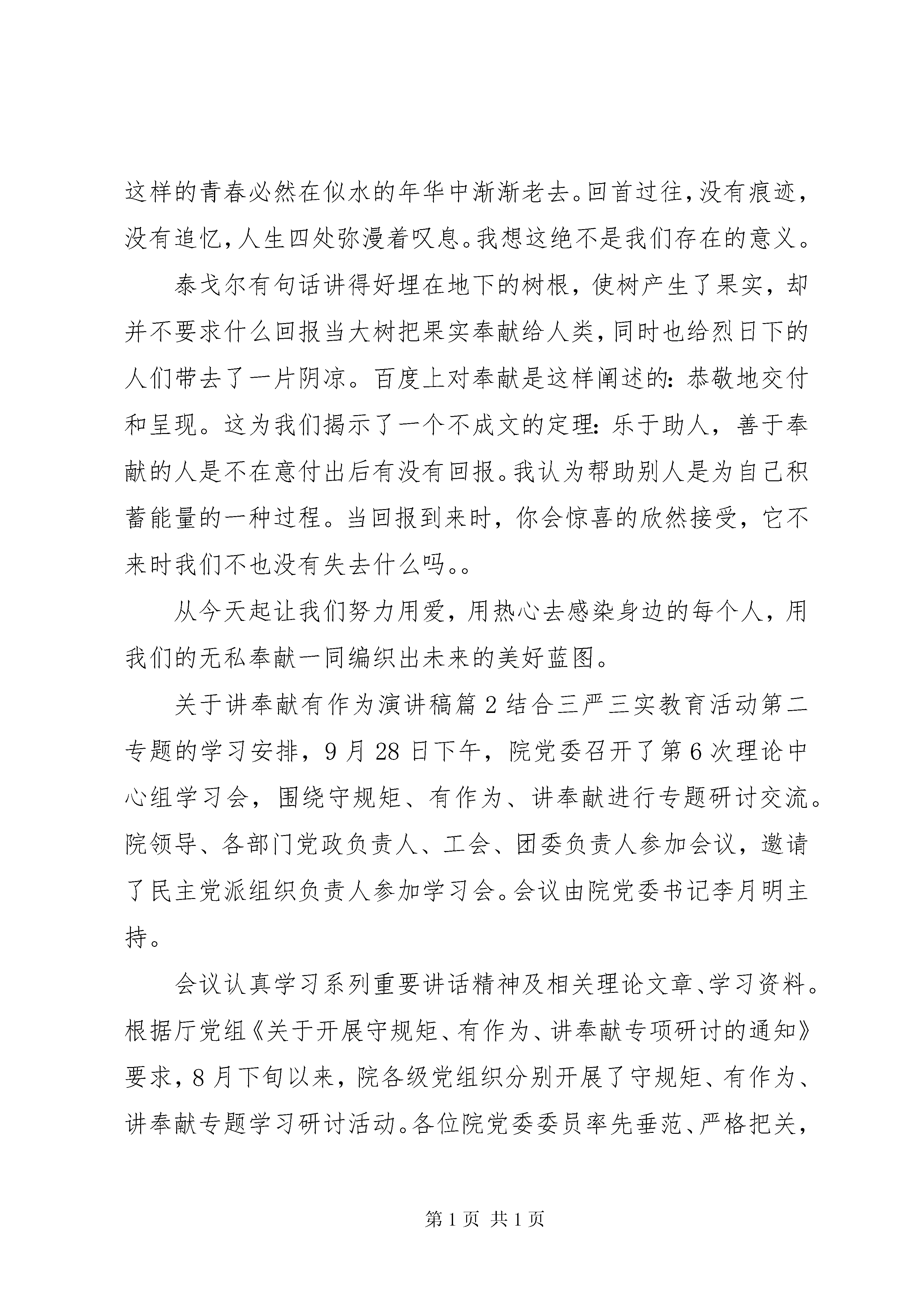 关于讲奉献有作为演讲稿关于讲奉献有作为演讲稿篇1我们很庆幸能够生活在此进步的时代,不用保受战乱之苦。说道奉献一词也许你会觉得它离我们太过遥远,太过空洞。我们可能不会有像大禹治水三过家门而不入的奉献精神;不会有黄继光用胸膛堵枪口的机会。也许你会说我要向马丁路德金学习,想把自己的一生献给黑人独立事业中去。其实我们不一定要去做和名人一样的事才算是奉献。孰不知奉献说大也大,说小也小。我们完全可以根据自己的能力酌情去做一名二十一世纪的新雷锋。俗话说雷锋出差一千里,好事做了一火车。为此我曾经有一个疑问:哪有那么多的好事去做。现在我知道了这些好事就在我们身边。你可以帮小朋友取下挂在树枝上的风筝;可以扶老奶奶过马路;可以在排队的时候礼让三分;可以hellip;hellip;由此一来,雷锋救活在了我们每个人心中,那么奉献也会让你的内心世界更加绚丽多彩。青春,是我们最美丽的季节。她孕育这早春的生机,展现着盛夏的热情,学习也理当成为我们一件怡然自得的事。我们学习科学知识用以强国,我们学习古今文化用以修身。古时有春蚕到死丝方尽,蜡炬成灰泪始干的李商隐。建国初期也涌现出了大批像焦裕禄,孔繁森那样让我们为之赞叹,为之自豪的人物。现阶段我们的人生观。价值观。世界观正在慢慢形成,不得不承认学习给我很大的启发。我们可以设想一下不付出,不创造,不追求。这样的青春必然在似水的年华中渐渐老去。回首过往,没有痕迹,没有追忆,人生四处弥漫着叹息。我想这绝不是我们存在的意义。泰戈尔有句话讲得好埋在地下的树根,使树产生了果实,却并不要求什么回报当大树把果实奉献给人类,同时也给烈日下的人们带去了一片阴凉。百度上对奉献是这样阐述的:恭敬地交付和呈现。这为我们揭示了一个不成文的定理:乐于助人,善于奉献的人是不在意付出后有没有回报。我认为帮助别人是为自己积蓄能量的一种过程。当回报到来时,你会惊喜的欣然接受,它不来时我们不也没有失去什么吗。。从今天起让我们努力用爱,用热心去感染身边的每个人,用我们的无私奉献一同编织出未来的美好蓝图。关于讲奉献有作为演讲稿篇2结合三严三实教育活动第二专题的学习安排,9月28日下午,院党委召开了第6次理论中心组学习会,围绕守规矩、有作为、讲奉献进行专题研讨交流。院领导、各部门党政负责人、工会、团委负责人参加会议,邀请了民主党派组织负责人参加学习会。会议由院党委书记李月明主持。会议认真学习系列重要讲话精神及相关理论文章、学习资料。根据厅党组《关于开展守规矩、有作为、讲奉献专项研讨的通知》要求,8月下旬以来,院各级党组织分别开展了守规矩、有作为、讲奉献专题学习研讨活动。各位院党委委员率先垂范、严格把关,既当好组织者,又当好参与者,认真自学,结合工作实际深入思考,分别撰写了学习体会。会上,与会的院党委委员围绕守规矩、有作为、讲奉献一一作了交流发言。各党委委员结合工作实际,围绕守规矩,着重研讨如何增强党章党规党纪意识、廉洁从政,严守政治规矩、底线规矩、工作规矩;围绕有作为,着重研讨如何增强创新精神、担当精神、实干精神,做到求创新、敢担当、抓落实;围绕讲奉献,着重研讨如何坚持和发扬奉献精神、敬业精神,做到心中有民、忠于事业、勤奋高效。交流发言中,各位党委委员认真领会守规矩、有作为、讲奉献的精神实质,明确在勘测设计工作中践行三严三实的具体要求,坚持以问题为导向,有机融合当前的重点工作,融入日常管理、融入作风改进、融入制度建设。守规矩,先从抓好不严不实的问题整改入手;有作为,以完成好当前的重点工作任务为检验;讲奉献,要求党员干部率先示范,发挥好引领作用。紧密结合千人万项蹲点服务开展百日攻坚活动,攻坚克难,改进管理,强化沟通交流,改进服务举措,提高服务水平,优化服务质量,加快推进当前重点水利建设项目和五水共治重点任务的勘测设计工作,为浙江水利事业做出应有的贡献。会议还学习传达了省纪委《关于11起实行一案双查追究党风廉政主体责任和监督责任典型案例的通报》、《关于中秋国庆期间深入落实中央八项规定和各项纪律要求的通知》等文件通知及《弘扬红船精神践行三严三实――守规矩有作为讲奉献》的文章。关于讲奉献有作为演讲稿篇3两学一做第一专题讨论的题目是学习有关文件、增强学习教育自觉性,针对这一点我觉得两学一做贵在自觉、贵在坚持、贵在实践,是党员的自我教育、自我改造和自我完善的过程。做为一名中国共产党党员,我要积极学习的两学一做,即学党章党规、学系列讲话、做合格党员。此外,应该时刻不忘学习贯彻习系列重要讲话精神,遵守党的规章制度,并牢记于心,争取做一名人民满意的合格党员。对于此次提到的两学一做,我认为应该从以下几个方面去做。首先,在最基层工作,我们要坚定自己的理想信念,不断在实践中提高党性觉悟;其次,路漫漫,我们要时刻不忘身上的重担,将为人民服务的宗旨铭记于心,不