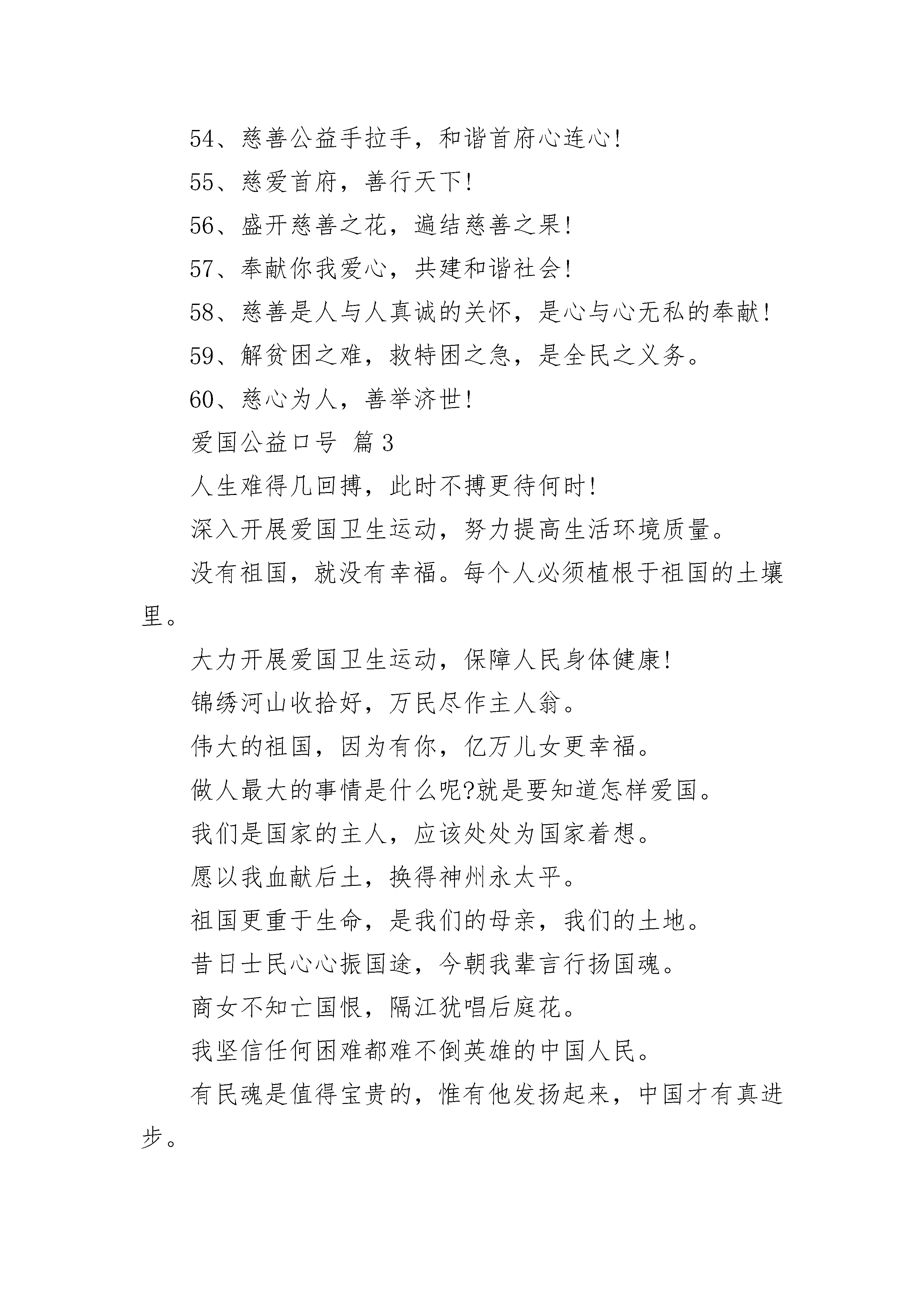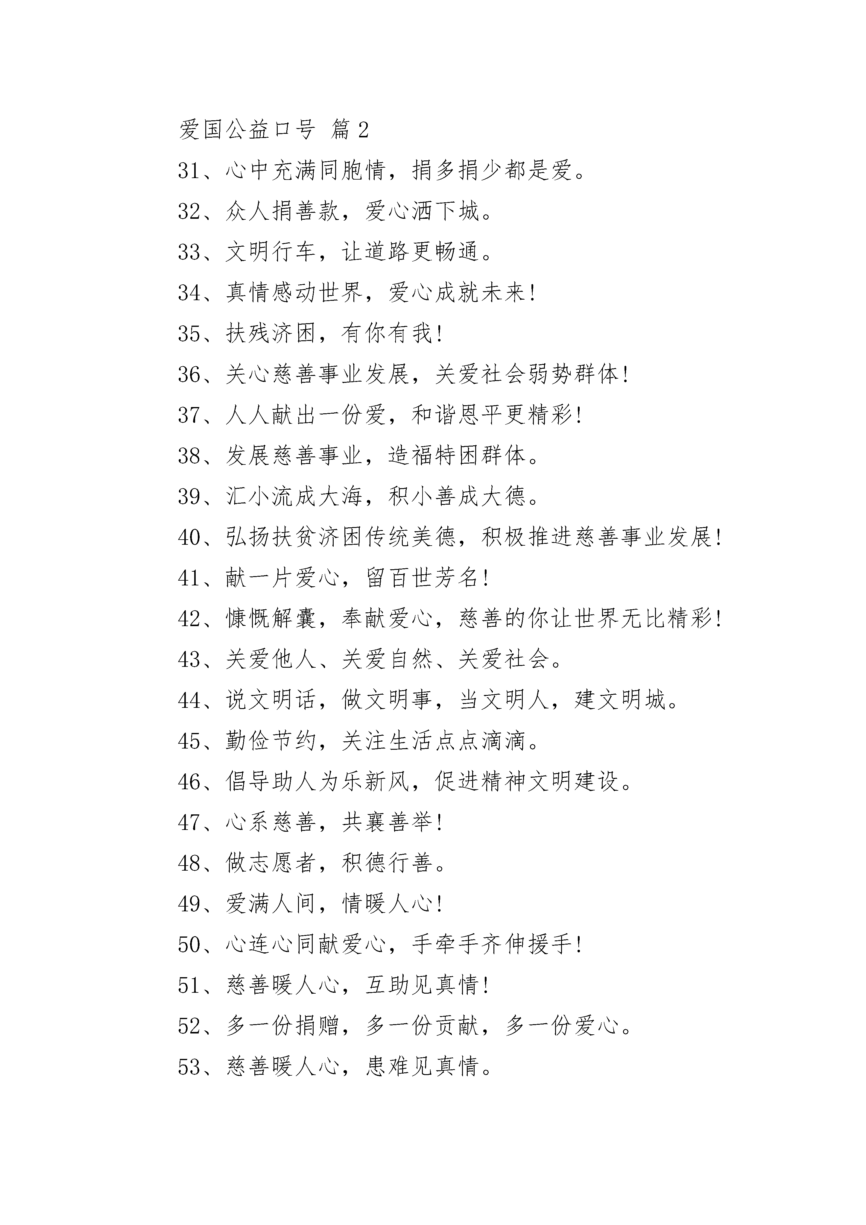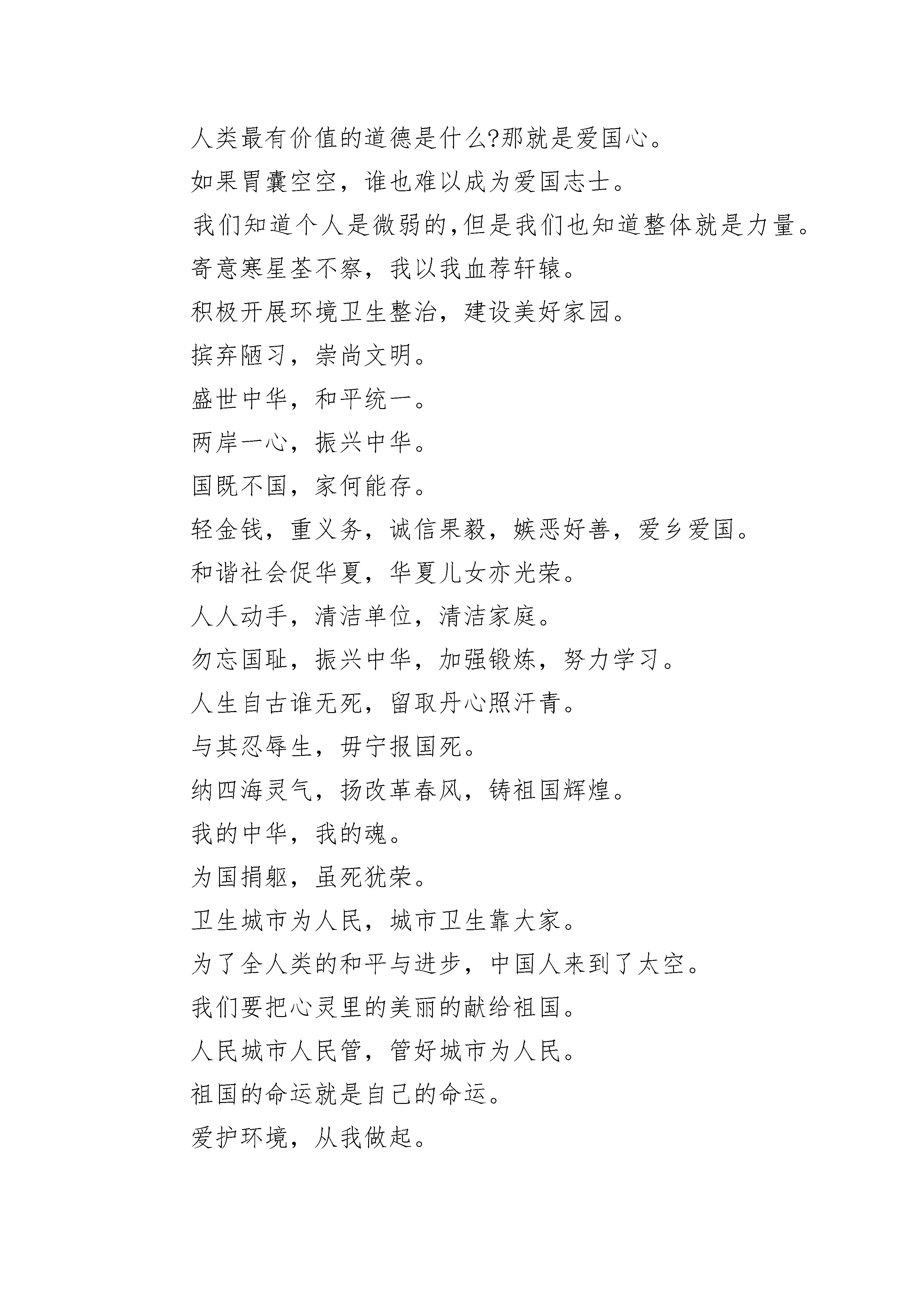 爱国公益口号爱国公益口号(通用3篇)爱国公益口号篇161、弘扬雷锋精神,参与志愿服务,倡导文明新风。62、帮困助学好风尚,敬老扶残真善举!63、捐赠不分多少,善举不分先后!64、乐善好施,助人悦己!65、乐善好施,功德无量!66、用行动帮助贫困,用爱心抚慰心灵。67、开文明车,行平安路,回幸福家。68、传播人间至爱真情,浇灌慈善至美之花!69、热心公益,助人为乐。70、做慈善事业的行动者,当爱心奉献的传播者!71、讲文明、树新风,做文明有礼的厦门人。72、扶贫济困,救孤助残!73、让文明行为成为习惯,让志愿服务成为时尚。74、学习雷锋、奉献他人、提升自己。75、讲文明从我做起,树新风从现在做起。76、助人为乐其乐无穷,热心慈善功德无量!77、慈善义举,情义无价,功德无量!78、净化社会环境,促进未成年人健康成长。79、爱心善举汇恩平,欢声笑语漫侨乡!80、阳光雨露及时雨,慈善仁爱人间情!爱国公益口号篇231、心中充满同胞情,捐多捐少都是爱。32、众人捐善款,爱心洒下城。33、文明行车,让道路更畅通。34、真情感动世界,爱心成就未来!35、扶残济困,有你有我!36、关心慈善事业发展,关爱社会弱势群体!37、人人献出一份爱,和谐恩平更精彩!38、发展慈善事业,造福特困群体。39、汇小流成大海,积小善成大德。40、弘扬扶贫济困传统美德,积极推进慈善事业发展!41、献一片爱心,留百世芳名!42、慷慨解囊,奉献爱心,慈善的你让世界无比精彩!43、关爱他人、关爱自然、关爱社会。44、说文明话,做文明事,当文明人,建文明城。45、勤俭节约,关注生活点点滴滴。46、倡导助人为乐新风,促进精神文明建设。47、心系慈善,共襄善举!48、做志愿者,积德行善。49、爱满人间,情暖人心!50、心连心同献爱心,手牵手齐伸援手!51、慈善暖人心,互助见真情!52、多一份捐赠,多一份贡献,多一份爱心。53、慈善暖人心,患难见真情。54、慈善公益手拉手,和谐首府心连心!55、慈爱首府,善行天下!56、盛开慈善之花,遍结慈善之果!57、奉献你我爱心,共建和谐社会!58、慈善是人与人真诚的关怀,是心与心无私的奉献!59、解贫困之难,救特困之急,是全民之义务。60、慈心为人,善举济世!爱国公益口号篇3人生难得几回搏,此时不搏更待何时!深入开展爱国卫生运动,努力提高生活环境质量。没有祖国,就没有幸福。每个人必须植根于祖国的土壤里。大力开展爱国卫生运动,保障人民身体健康!锦绣河山收拾好,万民尽作主人翁。伟大的祖国,因为有你,亿万儿女更幸福。做人最大的事情是什么呢?就是要知道怎样爱国。我们是国家的主人,应该处处为国家着想。愿以我血献后土,换得神州永太平。祖国更重于生命,是我们的母亲,我们的土地。昔日士民心心振国途,今朝我辈言行扬国魂。商女不知亡国恨,隔江犹唱后庭花。我坚信任何困难都难不倒英雄的中国人民。有民魂是值得宝贵的,惟有他发扬起来,中国才有真进步。人类最有价值的道德是什么?那就是爱国心。如果胃囊空空,谁也难以成为爱国志士。我们知道个人是微弱的,但是我们也知道整体就是力量。寄意寒星荃不察,我以我血荐轩辕。积极开展环境卫生整治,建设美好家园。摈弃陋习,崇尚文明。盛世中华,和平统一。两岸一心,振兴中华。国既不国,家何能存。轻金钱,重义务,诚信果毅,嫉恶好善,爱乡爱国。和谐社会促华夏,华夏儿女亦光荣。人人动手,清洁单位,清洁家庭。勿忘国耻,振兴中华,加强锻炼,努力学习。人生自古谁无死,留取丹心照汗青。与其忍辱生,毋宁报国死。纳四海灵气,扬改革春风,铸祖国辉煌。我的中华,我的魂。为国捐躯,虽死犹荣。卫生城市为人民,城市卫生靠大家。为了全人类的和平与进步,中国人来到了太空。我们要把心灵里的美丽的献给祖国。人民城市人民管,管好城市为人民。祖国的命运就是自己的命运。爱护环境,从我做起。流逝年华无法还,长存唯有爱国心。用最热情的血液喷薄出祖国最辉煌的明天。