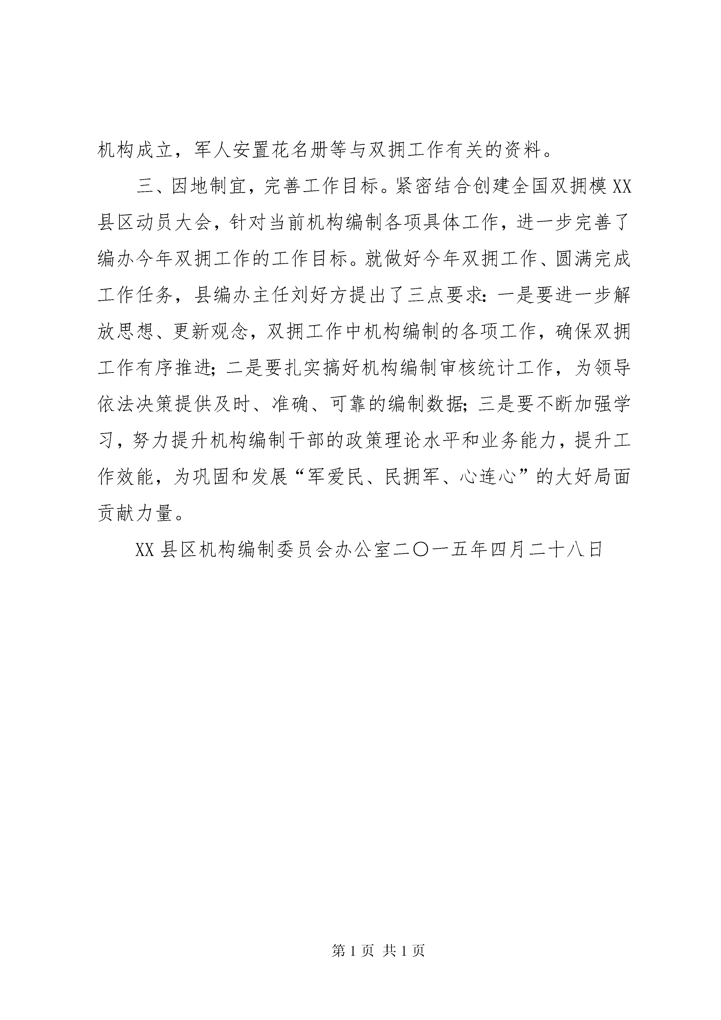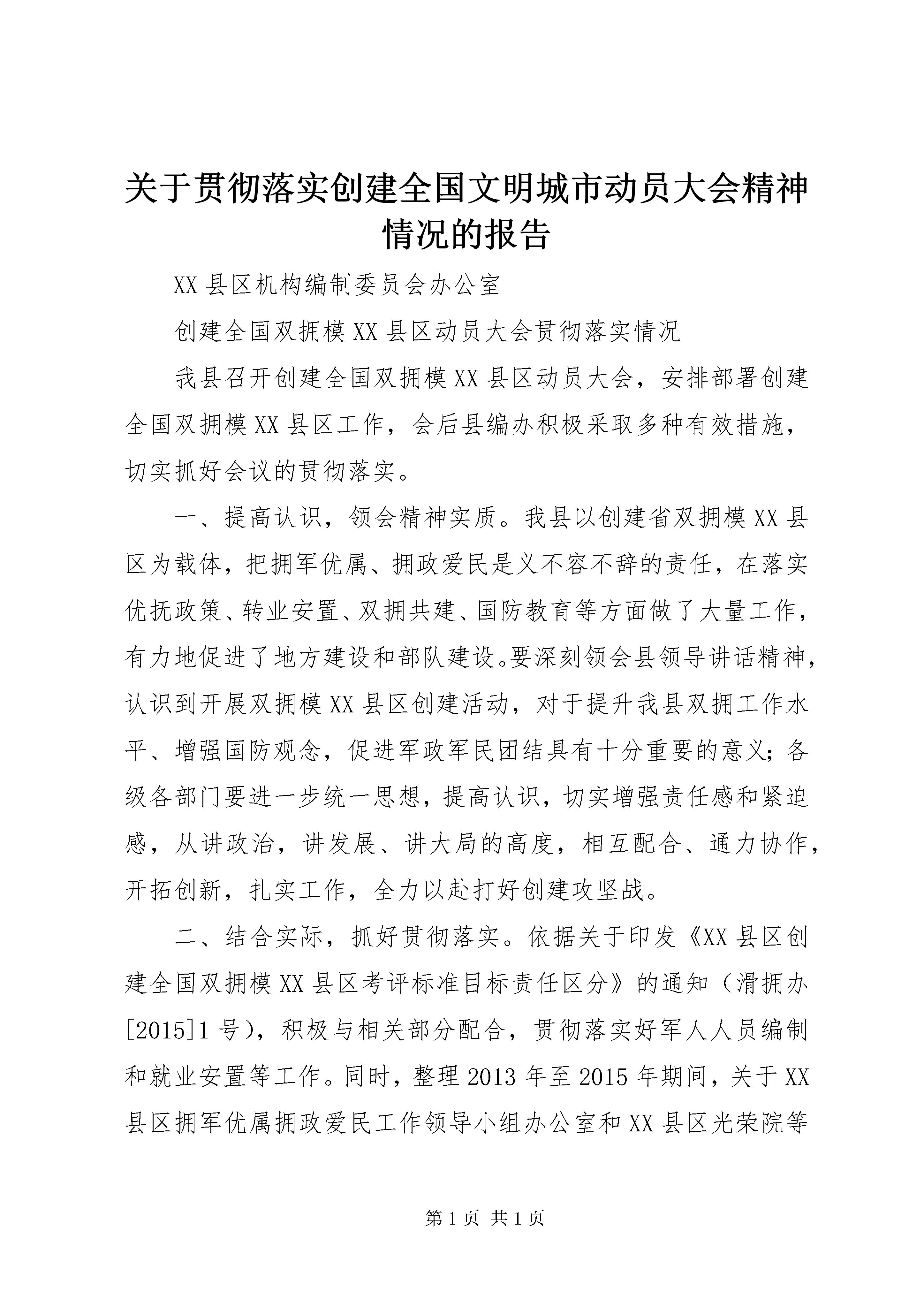 关于贯彻落实创建全国文明城市动员大会精神情况的报告XX县区机构编制委员会办公室创建全国双拥模XX县区动员大会贯彻落实情况我县召开创建全国双拥模XX县区动员大会,安排部署创建全国双拥模XX县区工作,会后县编办积极采取多种有效措施,切实抓好会议的贯彻落实。一、提高认识,领会精神实质。我县以创建省双拥模XX县区为载体,把拥军优属、拥政爱民是义不容不辞的责任,在落实优抚政策、转业安置、双拥共建、国防教育等方面做了大量工作,有力地促进了地方建设和部队建设。要深刻领会县领导讲话精神,认识到开展双拥模XX县区创建活动,对于提升我县双拥工作水平、增强国防观念,促进军政军民团结具有十分重要的意义;各级各部门要进一步统一思想,提高认识,切实增强责任感和紧迫感,从讲政治,讲发展、讲大局的高度,相互配合、通力协作,开拓创新,扎实工作,全力以赴打好创建攻坚战。二、结合实际,抓好贯彻落实。依据关于印发《XX县区创建全国双拥模XX县区考评标准目标责任区分》的通知(滑拥办[2015]1号),积极与相关部分配合,贯彻落实好军人人员编制和就业安置等工作。同时,整理2013年至2015年期间,关于XX县区拥军优属拥政爱民工作领导小组办公室和XX县区光荣院等机构成立,军人安置花名册等与双拥工作有关的资料。三、因地制宜,完善工作目标。紧密结合创建全国双拥模XX县区动员大会,针对当前机构编制各项具体工作,进一步完善了编办今年双拥工作的工作目标。就做好今年双拥工作、圆满完成工作任务,县编办主任刘好方提出了三点要求:一是要进一步解放思想、更新观念,双拥工作中机构编制的各项工作,确保双拥工作有序推进;二是要扎实搞好机构编制审核统计工作,为领导依法决策提供及时、准确、可靠的编制数据;三是要不断加强学习,努力提升机构编制干部的政策理论水平和业务能力,提升工作效能,为巩固和发展“军爱民、民拥军、心连心”的大好局面贡献力量。XX县区机构编制委员会办公室二○一五年四月二十八日