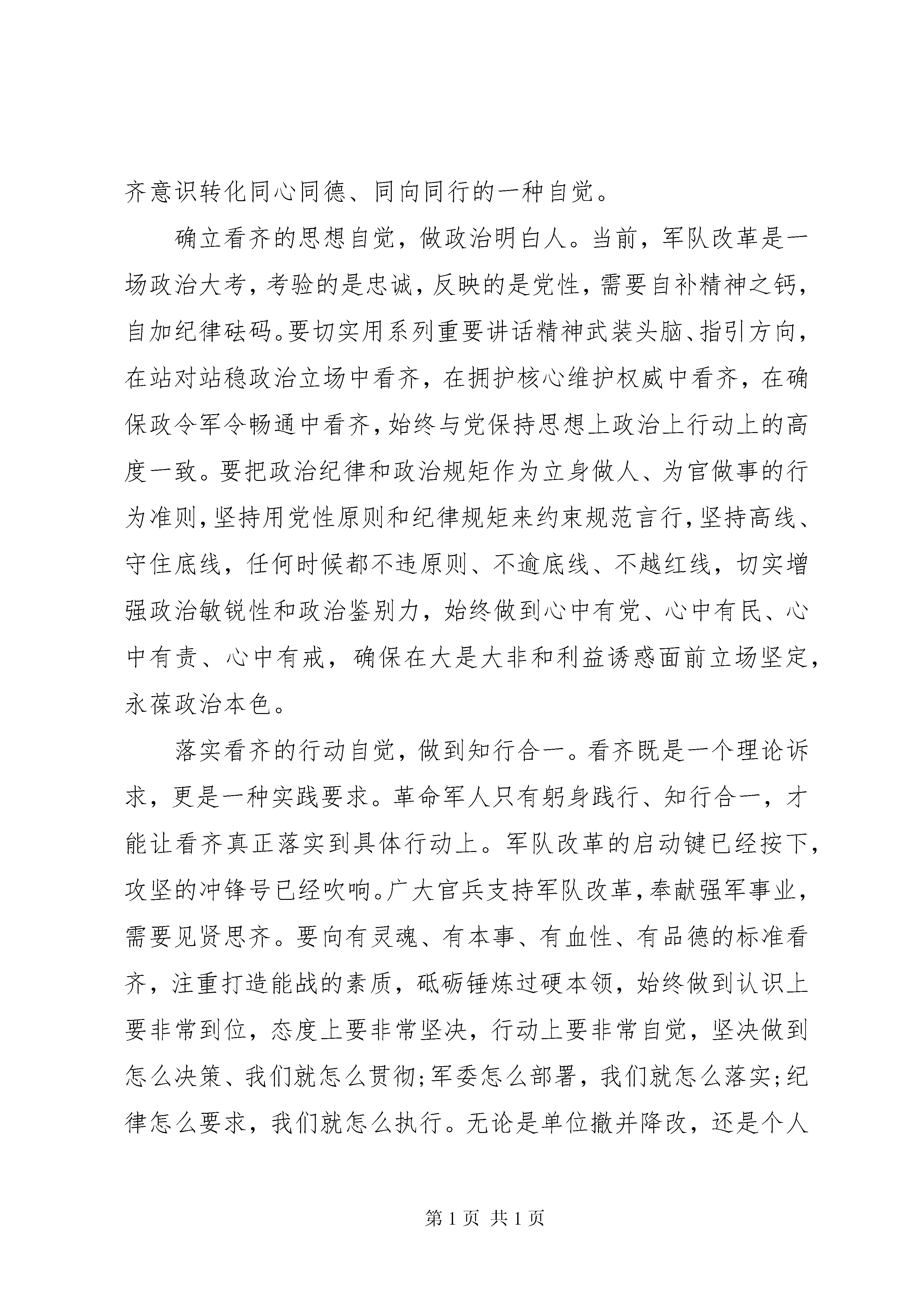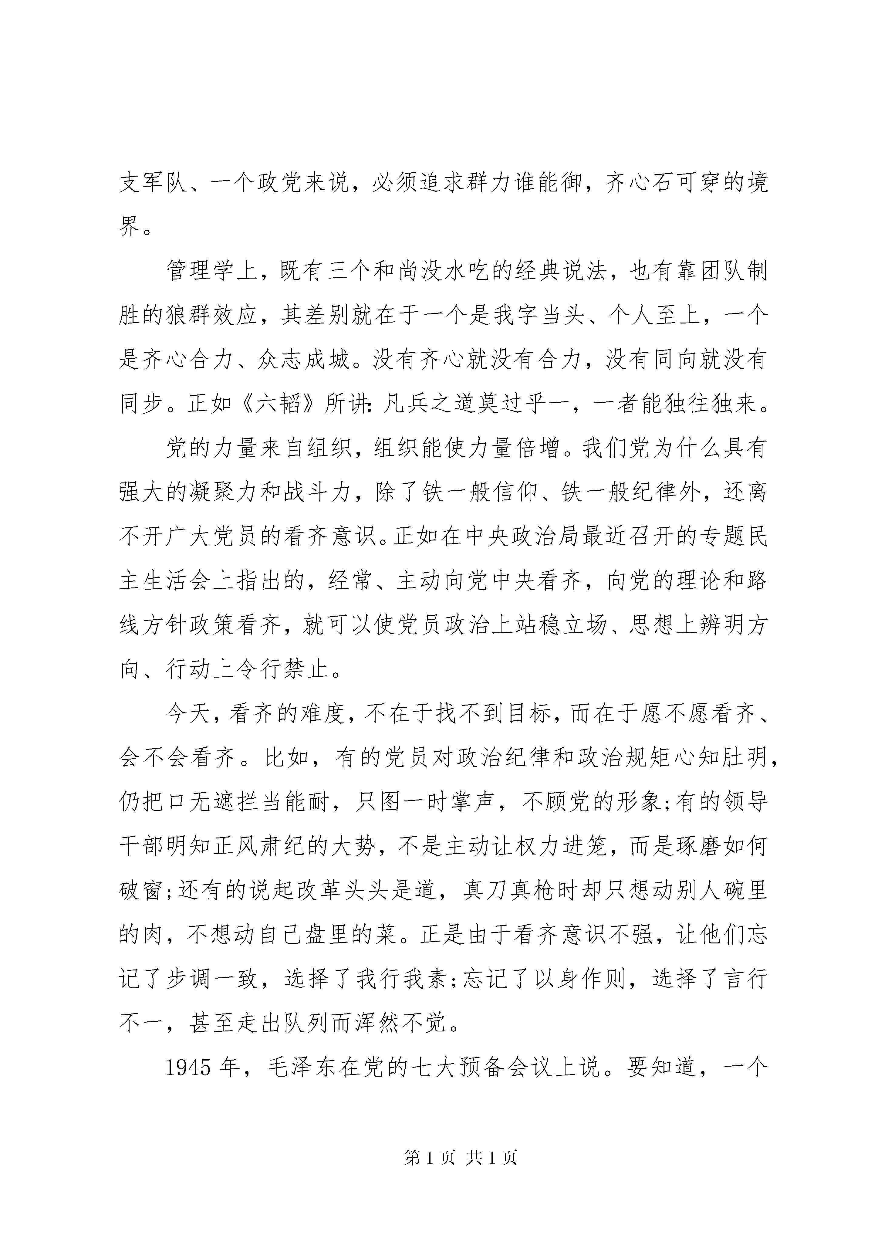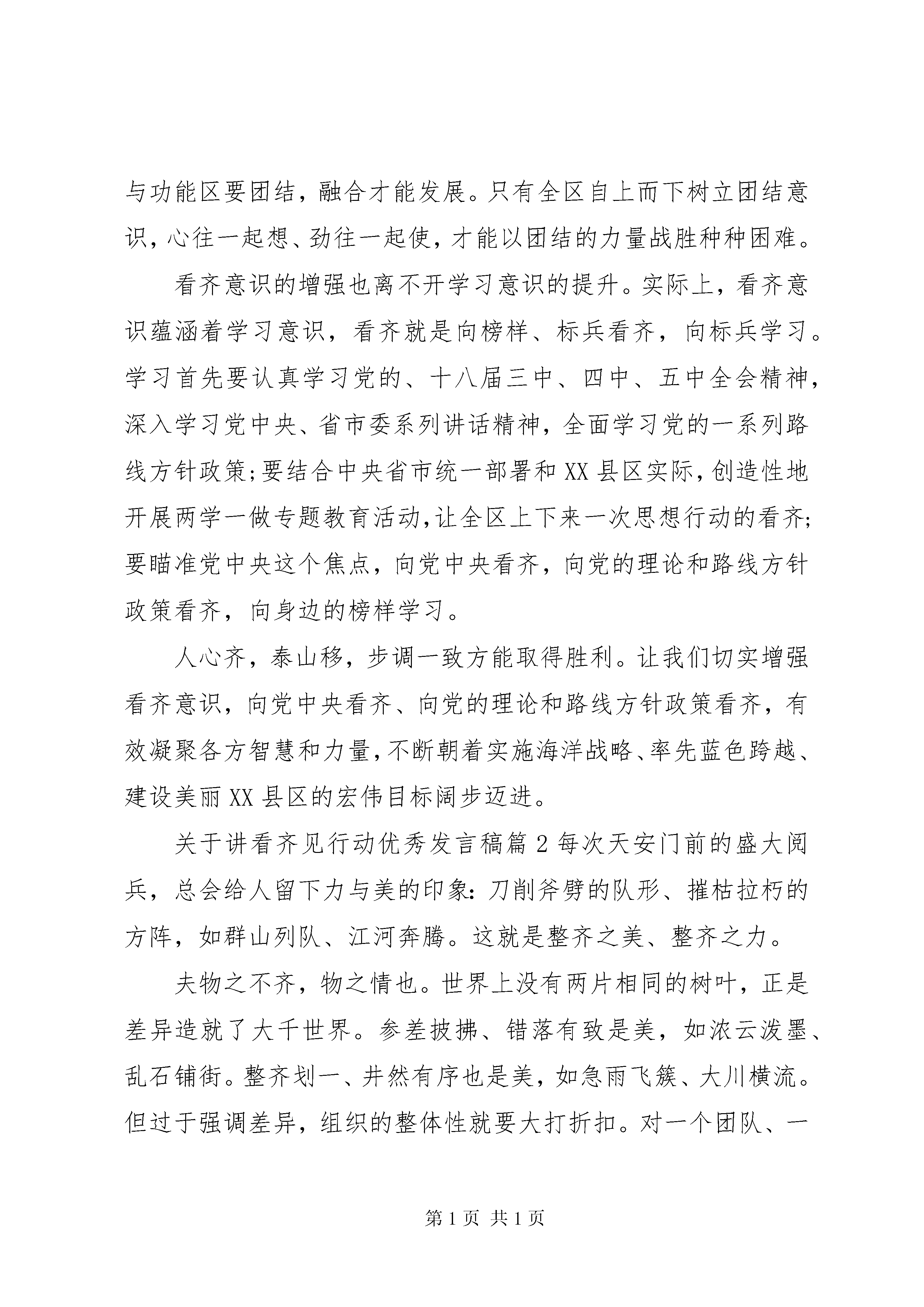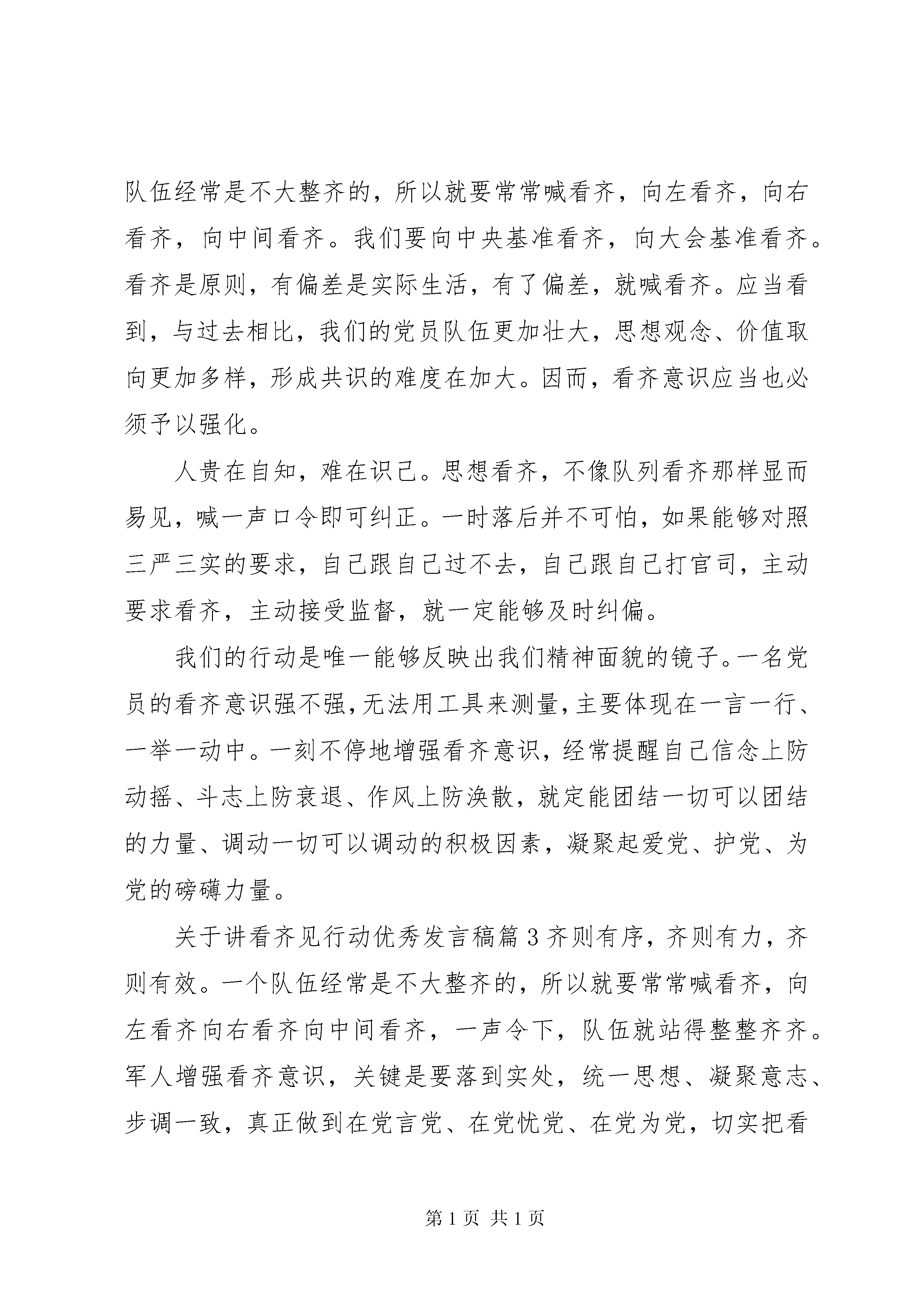 关于讲看齐见行动优秀发言稿4篇关于讲看齐见行动优秀发言稿篇1齐,是一种力量的凝聚。齐则有序,齐则有力,齐则有效。看齐意识,衡量着党员干部的党性强弱,是每位党员干部最基本的政治素养和党性修养,是我们党的优良传统和独特优势。切实增强看齐意识,就是要在思想上、政治上、行动上全面看齐:思想上看齐,要始终同党中央保持高度一致,自觉维护党中央权威,党中央提倡的坚决响应,党中央决定的坚决照办,党中央禁止的坚决杜绝;政治上看齐,要做政治上的明白人,严守政治纪律和政治规矩,提高政治鉴别力,增强政治敏锐性,在大是大非面前保持清醒头脑、旗帜鲜明;行动上看齐,要自觉践行三严三实的要求,把三严三实作为做人、做官、做事的理念,作为日常行为的准则,作为抓班子、带队伍的遵循,作为一种常态、一种趋势,越来越严、越来越实,同时,对不严不实的行为要经常提醒、敲打,对违反纪律规矩的要从严处理,而不能高高举起、轻轻放下。切实增强看齐意识,要牢牢把握好实际工作中的两个着力点团结意识和学习意识。团结就是力量。看齐意识的增强离不开团结意识的提升,对于全区党员而言,我们要紧紧地团结在以同志为党中央周围,对于XX县区来说,全区要团结,各级各部门要扎扎实实地落实工委区委的决策部署,东XX县区要融合,镇街与功能区要团结,融合才能发展。只有全区自上而下树立团结意识,心往一起想、劲往一起使,才能以团结的力量战胜种种困难。看齐意识的增强也离不开学习意识的提升。实际上,看齐意识蕴涵着学习意识,看齐就是向榜样、标兵看齐,向标兵学习。学习首先要认真学习党的、十八届三中、四中、五中全会精神,深入学习党中央、省市委系列讲话精神,全面学习党的一系列路线方针政策;要结合中央省市统一部署和XX县区实际,创造性地开展两学一做专题教育活动,让全区上下来一次思想行动的看齐;要瞄准党中央这个焦点,向党中央看齐,向党的理论和路线方针政策看齐,向身边的榜样学习。人心齐,泰山移,步调一致方能取得胜利。让我们切实增强看齐意识,向党中央看齐、向党的理论和路线方针政策看齐,有效凝聚各方智慧和力量,不断朝着实施海洋战略、率先蓝色跨越、建设美丽XX县区的宏伟目标阔步迈进。关于讲看齐见行动优秀发言稿篇2每次天安门前的盛大阅兵,总会给人留下力与美的印象:刀削斧劈的队形、摧枯拉朽的方阵,如群山列队、江河奔腾。这就是整齐之美、整齐之力。夫物之不齐,物之情也。世界上没有两片相同的树叶,正是差异造就了大千世界。参差披拂、错落有致是美,如浓云泼墨、乱石铺街。整齐划一、井然有序也是美,如急雨飞簇、大川横流。但过于强调差异,组织的整体性就要大打折扣。对一个团队、一支军队、一个政党来说,必须追求群力谁能御,齐心石可穿的境界。管理学上,既有三个和尚没水吃的经典说法,也有靠团队制胜的狼群效应,其差别就在于一个是我字当头、个人至上,一个是齐心合力、众志成城。没有齐心就没有合力,没有同向就没有同步。正如《六韬》所讲:凡兵之道莫过乎一,一者能独往独来。党的力量来自组织,组织能使力量倍增。我们党为什么具有强大的凝聚力和战斗力,除了铁一般信仰、铁一般纪律外,还离不开广大党员的看齐意识。正如在中央政治局最近召开的专题民主生活会上指出的,经常、主动向党中央看齐,向党的理论和路线方针政策看齐,就可以使党员政治上站稳立场、思想上辨明方向、行动上令行禁止。今天,看齐的难度,不在于找不到目标,而在于愿不愿看齐、会不会看齐。比如,有的党员对政治纪律和政治规矩心知肚明,仍把口无遮拦当能耐,只图一时掌声,不顾党的形象;有的领导干部明知正风肃纪的大势,不是主动让权力进笼,而是琢磨如何破窗;还有的说起改革头头是道,真刀真枪时却只想动别人碗里的肉,不想动自己盘里的菜。正是由于看齐意识不强,让他们忘记了步调一致,选择了我行我素;忘记了以身作则,选择了言行不一,甚至走出队列而浑然不觉。1945年,毛泽东在党的七大预备会议上说。要知道,一个队伍经常是不大整齐的,所以就要常常喊看齐,向左看齐,向右看齐,向中间看齐。我们要向中央基准看齐,向大会基准看齐。看齐是原则,有偏差是实际生活,有了偏差,就喊看齐。应当看到,与过去相比,我们的党员队伍更加壮大,思想观念、价值取向更加多样,形成共识的难度在加大。因而,看齐意识应当也必须予以强化。人贵在自知,难在识己。思想看齐,不像队列看齐那样显而易见,喊一声口令即可纠正。一时落后并不可怕,如果能够对照三严三实的要求,自己跟自己过不去,自己跟自己打官司,主动要求看齐,主动接受监督,就一定能够及时纠偏。我们的行动是唯一能够反映出我们精神面貌的镜子。一名党员的看齐意识强不强,无法用工具来测量,主要体现在一言一行、一举一动中。一刻不停地增强看齐意识,经常提醒自己信念上防动摇、斗志上防衰退、作风上防涣散,就定能团结一切可以团结的力量、调动一切