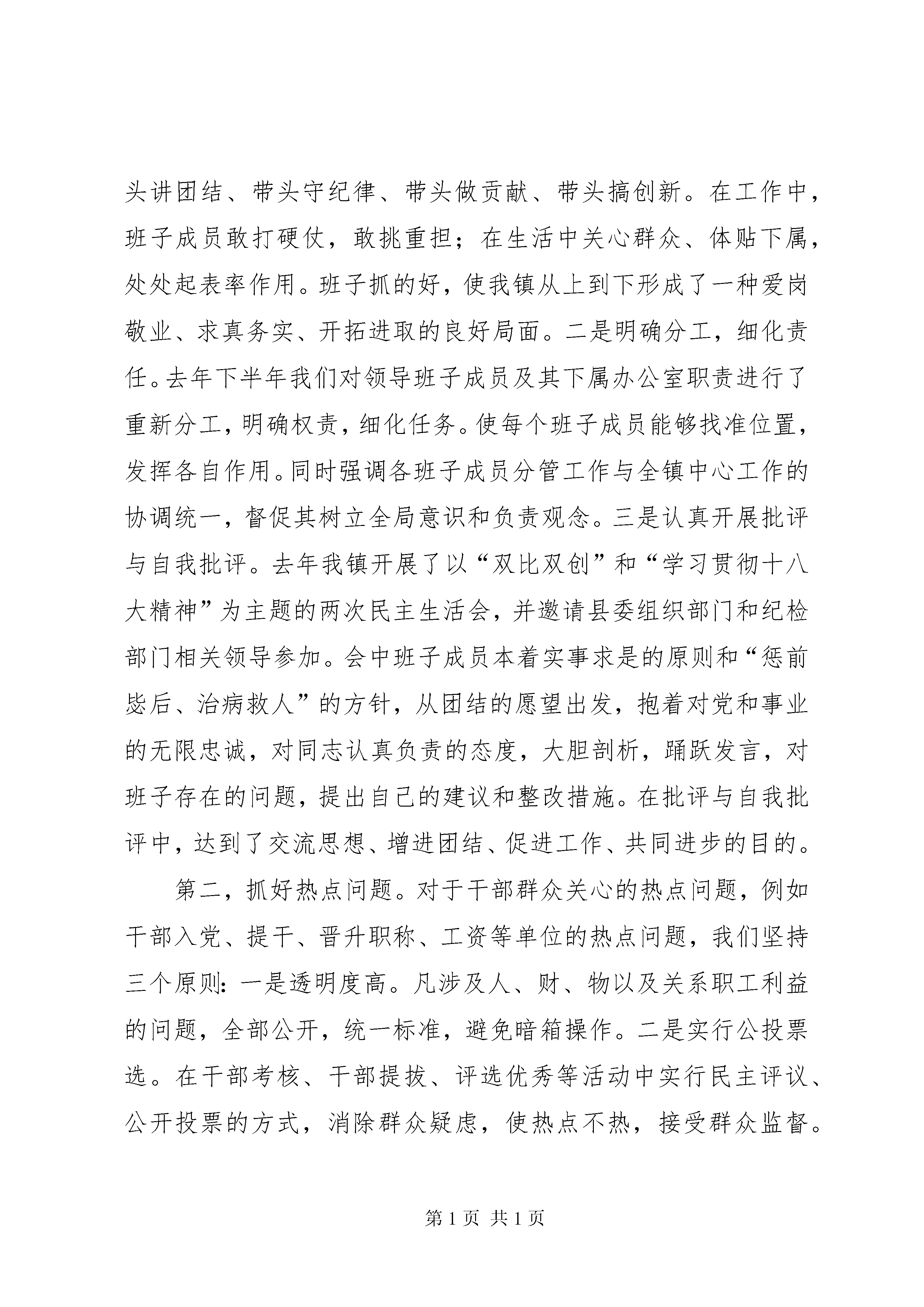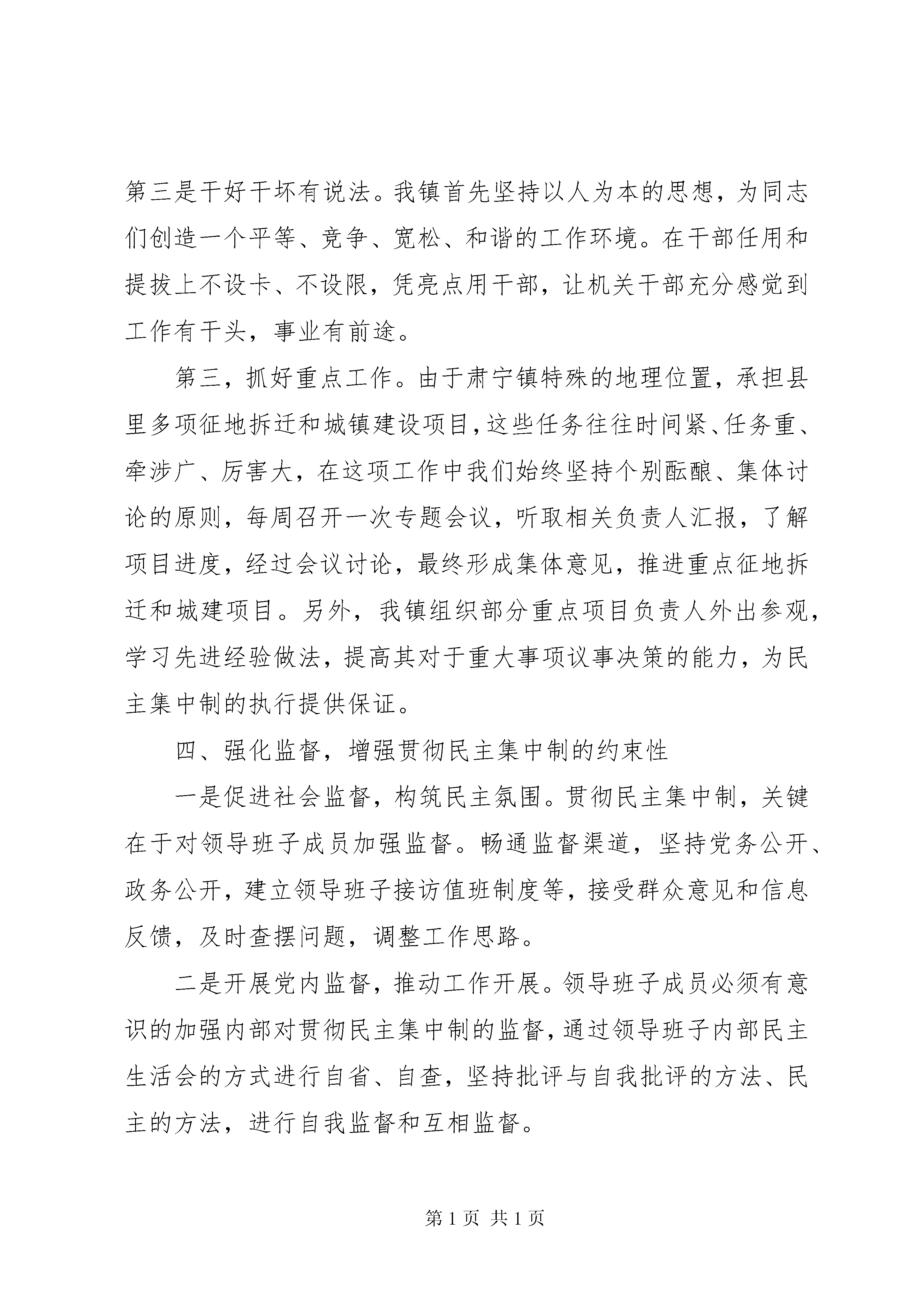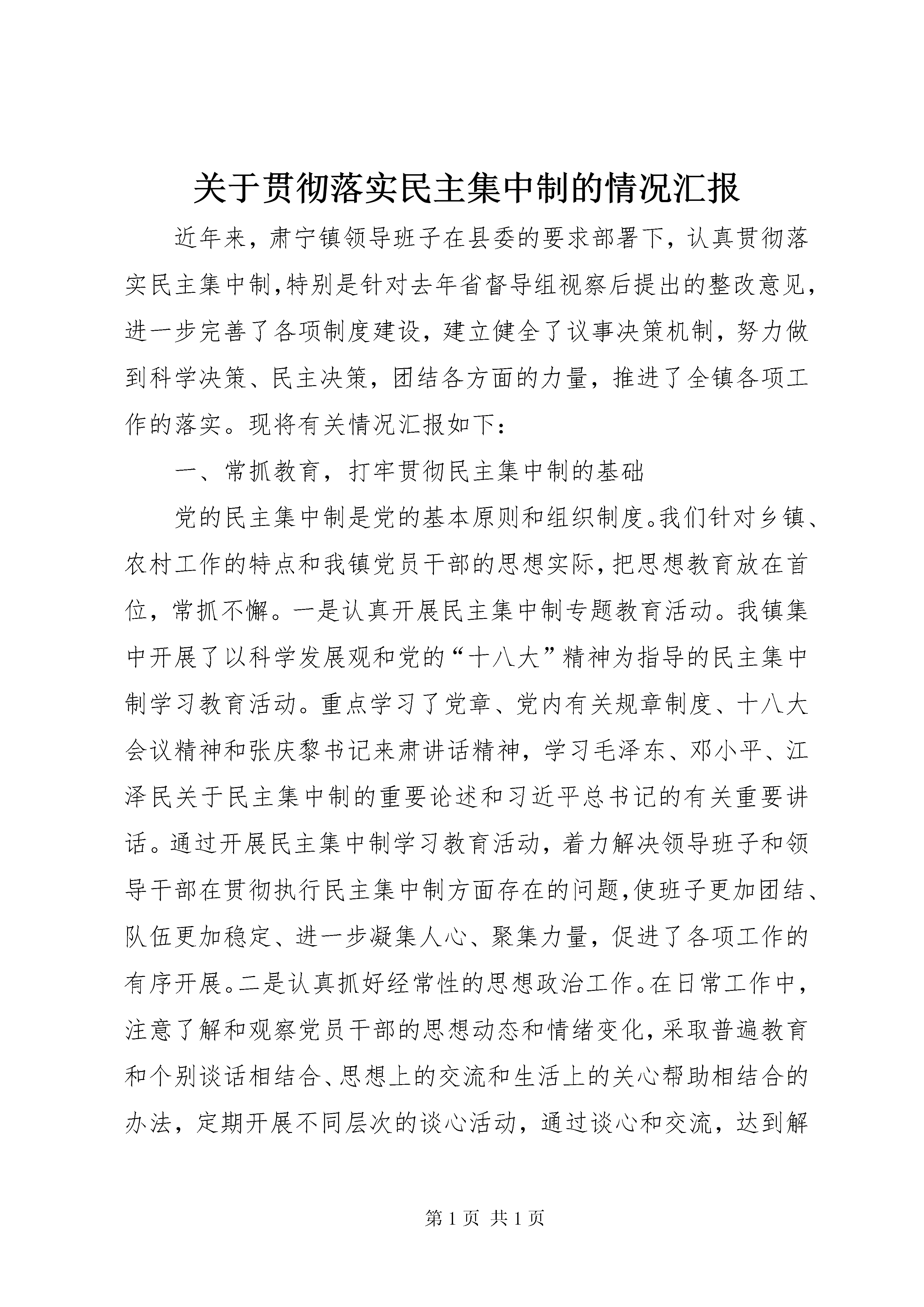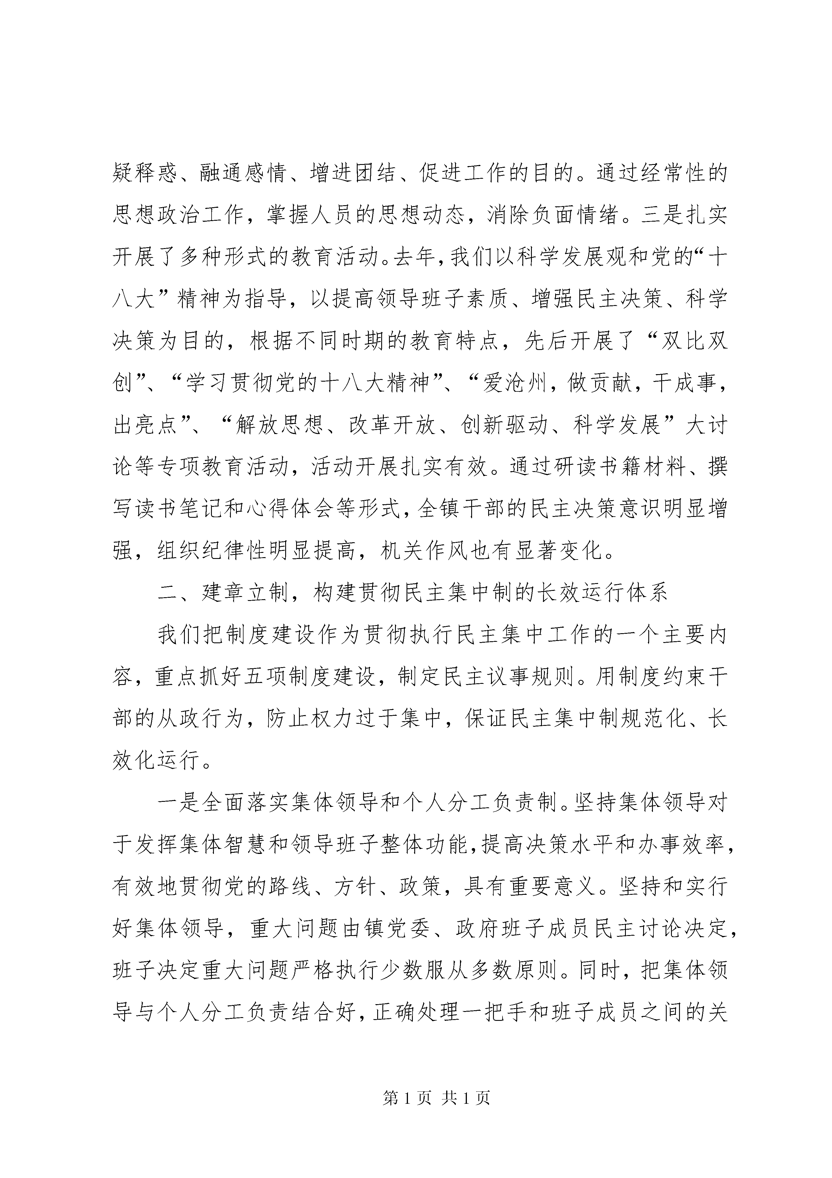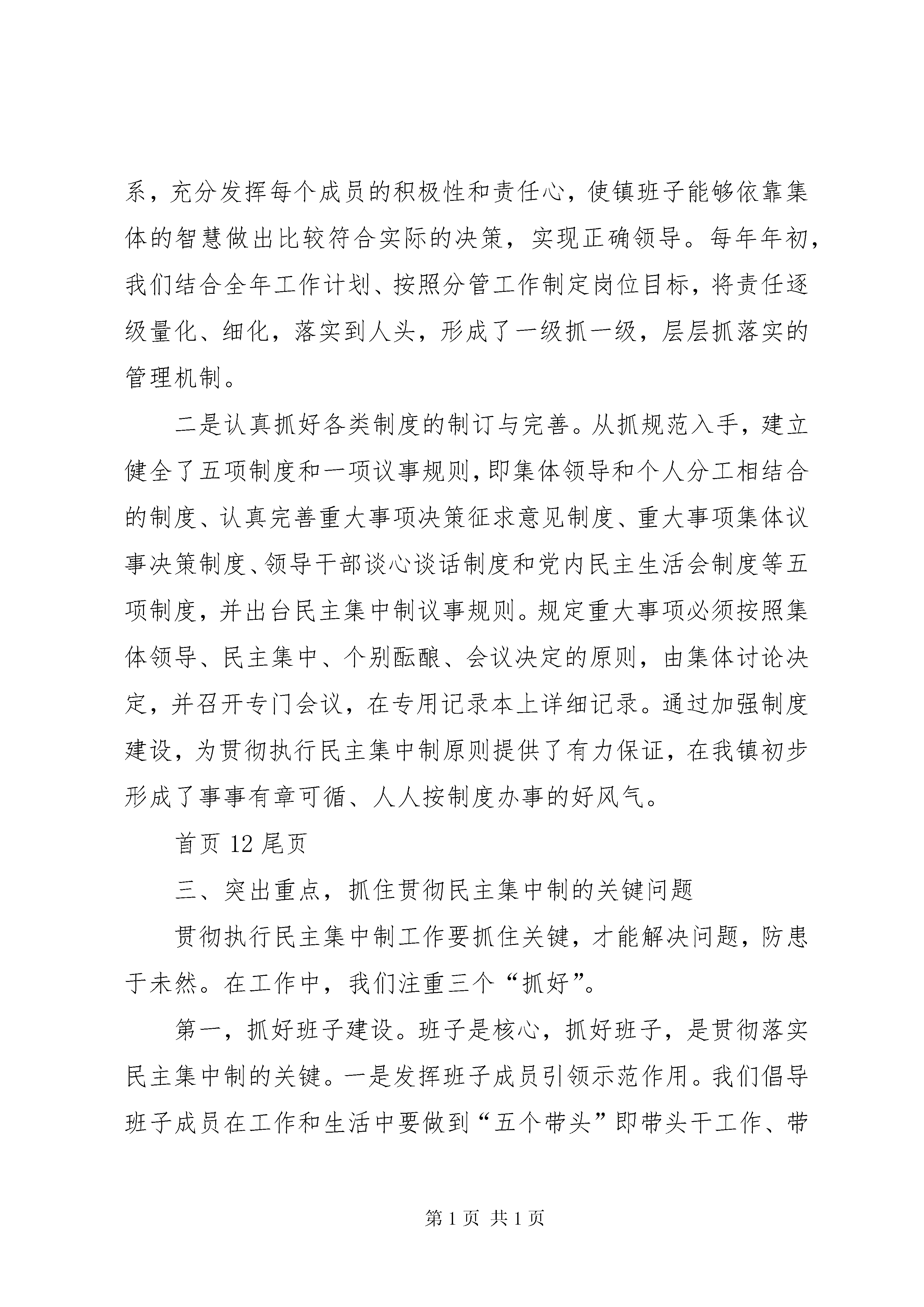 关于贯彻落实民主集中制的情况汇报近年来,肃宁镇领导班子在县委的要求部署下,认真贯彻落实民主集中制,特别是针对去年省督导组视察后提出的整改意见,进一步完善了各项制度建设,建立健全了议事决策机制,努力做到科学决策、民主决策,团结各方面的力量,推进了全镇各项工作的落实。现将有关情况汇报如下:一、常抓教育,打牢贯彻民主集中制的基础党的民主集中制是党的基本原则和组织制度。我们针对乡镇、农村工作的特点和我镇党员干部的思想实际,把思想教育放在首位,常抓不懈。一是认真开展民主集中制专题教育活动。我镇集中开展了以科学发展观和党的“十八大”精神为指导的民主集中制学习教育活动。重点学习了党章、党内有关规章制度、十八大会议精神和张庆黎书记来肃讲话精神,学习毛泽东、邓小平、江泽民关于民主集中制的重要论述和习近平总书记的有关重要讲话。通过开展民主集中制学习教育活动,着力解决领导班子和领导干部在贯彻执行民主集中制方面存在的问题,使班子更加团结、队伍更加稳定、进一步凝集人心、聚集力量,促进了各项工作的有序开展。二是认真抓好经常性的思想政治工作。在日常工作中,注意了解和观察党员干部的思想动态和情绪变化,采取普遍教育和个别谈话相结合、思想上的交流和生活上的关心帮助相结合的办法,定期开展不同层次的谈心活动,通过谈心和交流,达到解疑释惑、融通感情、增进团结、促进工作的目的。通过经常性的思想政治工作,掌握人员的思想动态,消除负面情绪。三是扎实开展了多种形式的教育活动。去年,我们以科学发展观和党的“十八大”精神为指导,以提高领导班子素质、增强民主决策、科学决策为目的,根据不同时期的教育特点,先后开展了“双比双创”、“学习贯彻党的十八大精神”、“爱沧州,做贡献,干成事,出亮点”、“解放思想、改革开放、创新驱动、科学发展”大讨论等专项教育活动,活动开展扎实有效。通过研读书籍材料、撰写读书笔记和心得体会等形式,全镇干部的民主决策意识明显增强,组织纪律性明显提高,机关作风也有显著变化。二、建章立制,构建贯彻民主集中制的长效运行体系我们把制度建设作为贯彻执行民主集中工作的一个主要内容,重点抓好五项制度建设,制定民主议事规则。用制度约束干部的从政行为,防止权力过于集中,保证民主集中制规范化、长效化运行。一是全面落实集体领导和个人分工负责制。坚持集体领导对于发挥集体智慧和领导班子整体功能,提高决策水平和办事效率,有效地贯彻党的路线、方针、政策,具有重要意义。坚持和实行好集体领导,重大问题由镇党委、政府班子成员民主讨论决定,班子决定重大问题严格执行少数服从多数原则。同时,把集体领导与个人分工负责结合好,正确处理一把手和班子成员之间的关系,充分发挥每个成员的积极性和责任心,使镇班子能够依靠集体的智慧做出比较符合实际的决策,实现正确领导。每年年初,我们结合全年工作计划、按照分管工作制定岗位目标,将责任逐级量化、细化,落实到人头,形成了一级抓一级,层层抓落实的管理机制。二是认真抓好各类制度的制订与完善。从抓规范入手,建立健全了五项制度和一项议事规则,即集体领导和个人分工相结合的制度、认真完善重大事项决策征求意见制度、重大事项集体议事决策制度、领导干部谈心谈话制度和党内民主生活会制度等五项制度,并出台民主集中制议事规则。规定重大事项必须按照集体领导、民主集中、个别酝酿、会议决定的原则,由集体讨论决定,并召开专门会议,在专用记录本上详细记录。通过加强制度建设,为贯彻执行民主集中制原则提供了有力保证,在我镇初步形成了事事有章可循、人人按制度办事的好风气。首页12尾页三、突出重点,抓住贯彻民主集中制的关键问题贯彻执行民主集中制工作要抓住关键,才能解决问题,防患于未然。在工作中,我们注重三个“抓好”。第一,抓好班子建设。班子是核心,抓好班子,是贯彻落实民主集中制的关键。一是发挥班子成员引领示范作用。我们倡导班子成员在工作和生活中要做到“五个带头”即带头干工作、带头讲团结、带头守纪律、带头做贡献、带头搞创新。在工作中,班子成员敢打硬仗,敢挑重担;在生活中关心群众、体贴下属,处处起表率作用。班子抓的好,使我镇从上到下形成了一种爱岗敬业、求真务实、开拓进取的良好局面。二是明确分工,细化责任。去年下半年我们对领导班子成员及其下属办公室职责进行了重新分工,明确权责,细化任务。使每个班子成员能够找准位置,发挥各自作用。同时强调各班子成员分管工作与全镇中心工作的协调统一,督促其树立全局意识和负责观念。三是认真开展批评与自我批评。去年我镇开展了以“双比双创”和“学习贯彻十八大精神”为主题的两次民主生活会,并邀请县委组织部门和纪检部门相关领导参加。会中班子成员本着实事求是的原则和“惩前毖后、治病救人”的方针,从团结的愿望出发,抱着对党和事业的无限忠诚,对同志认真负责的态度,大胆剖析,踊跃发言,