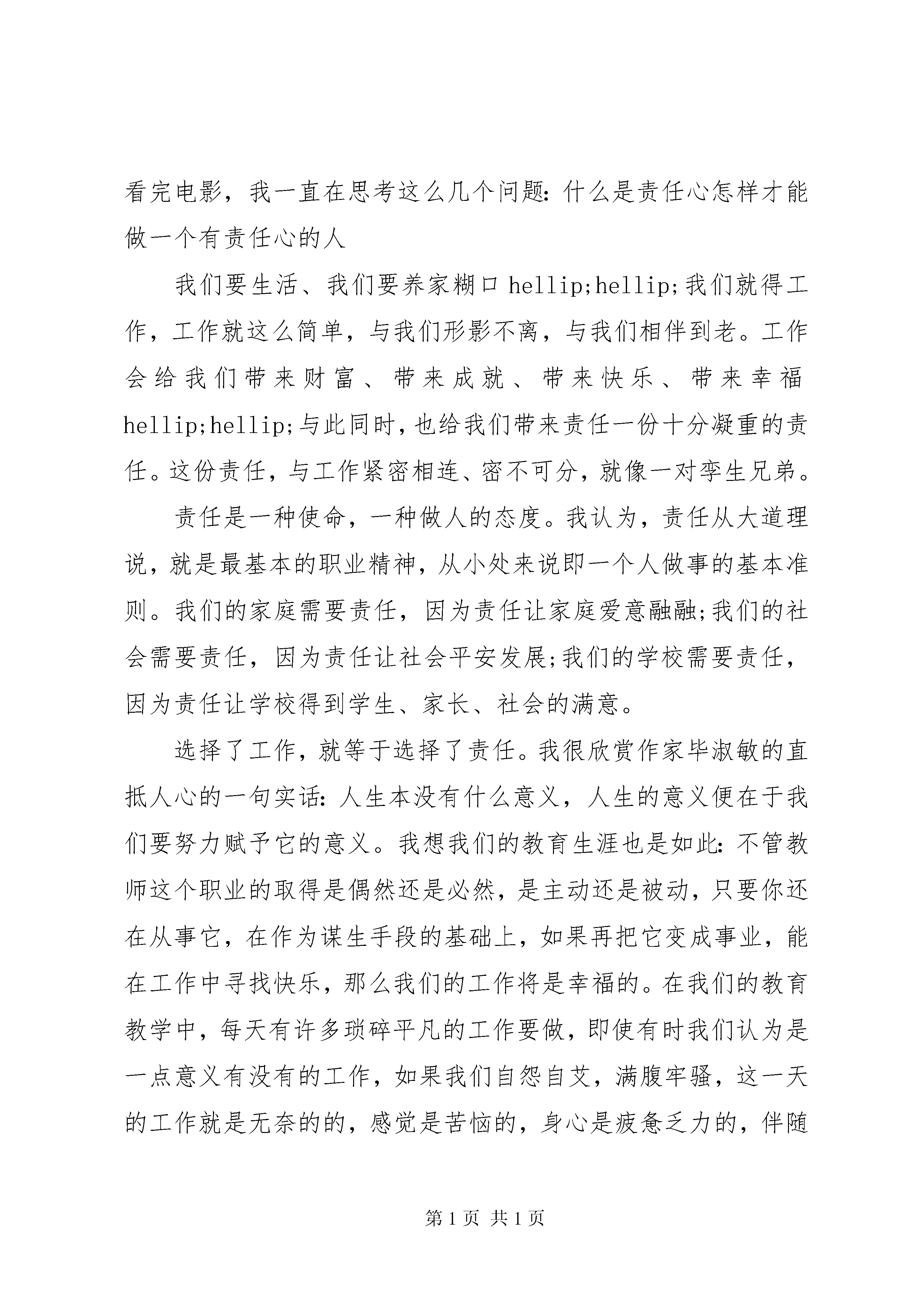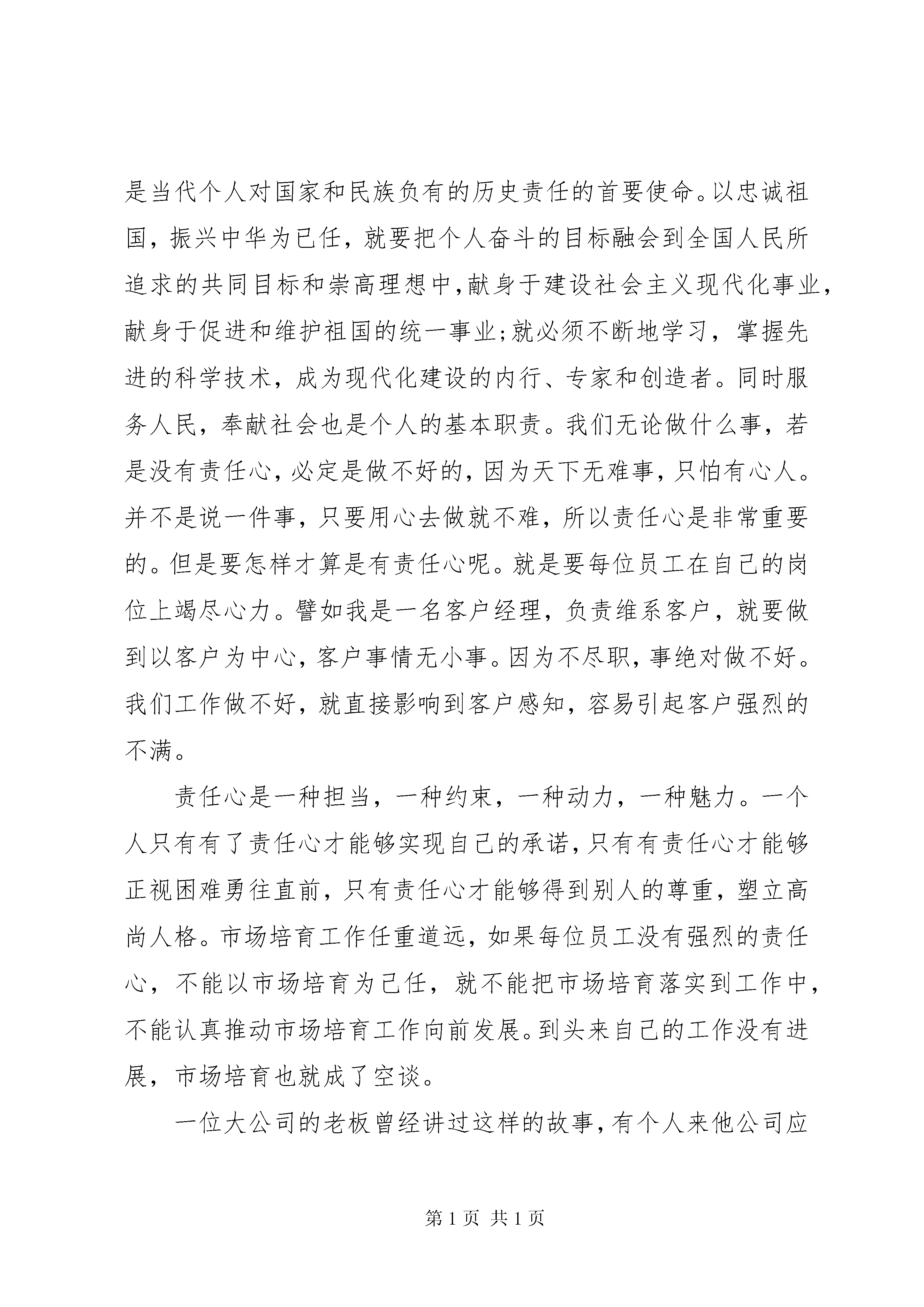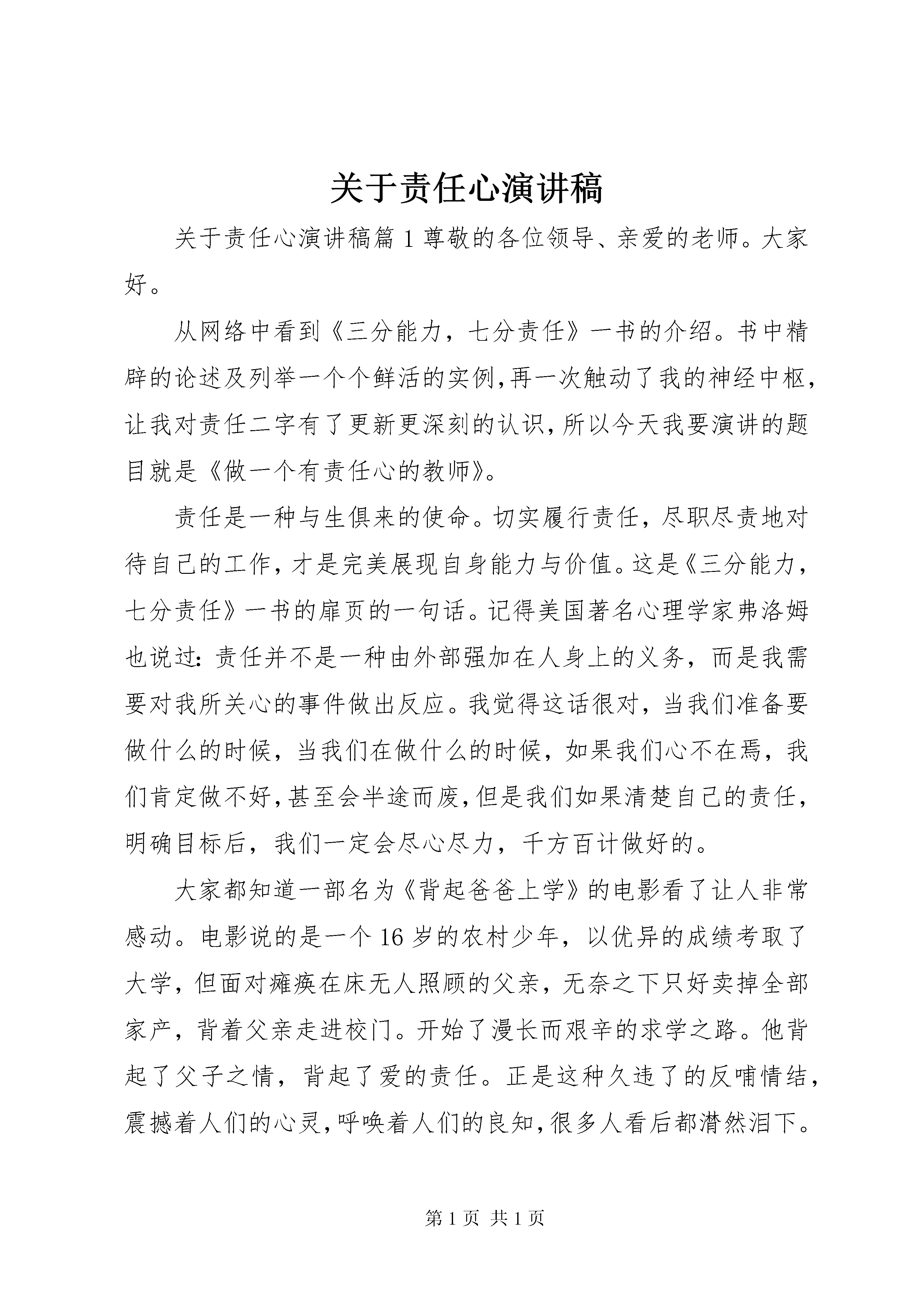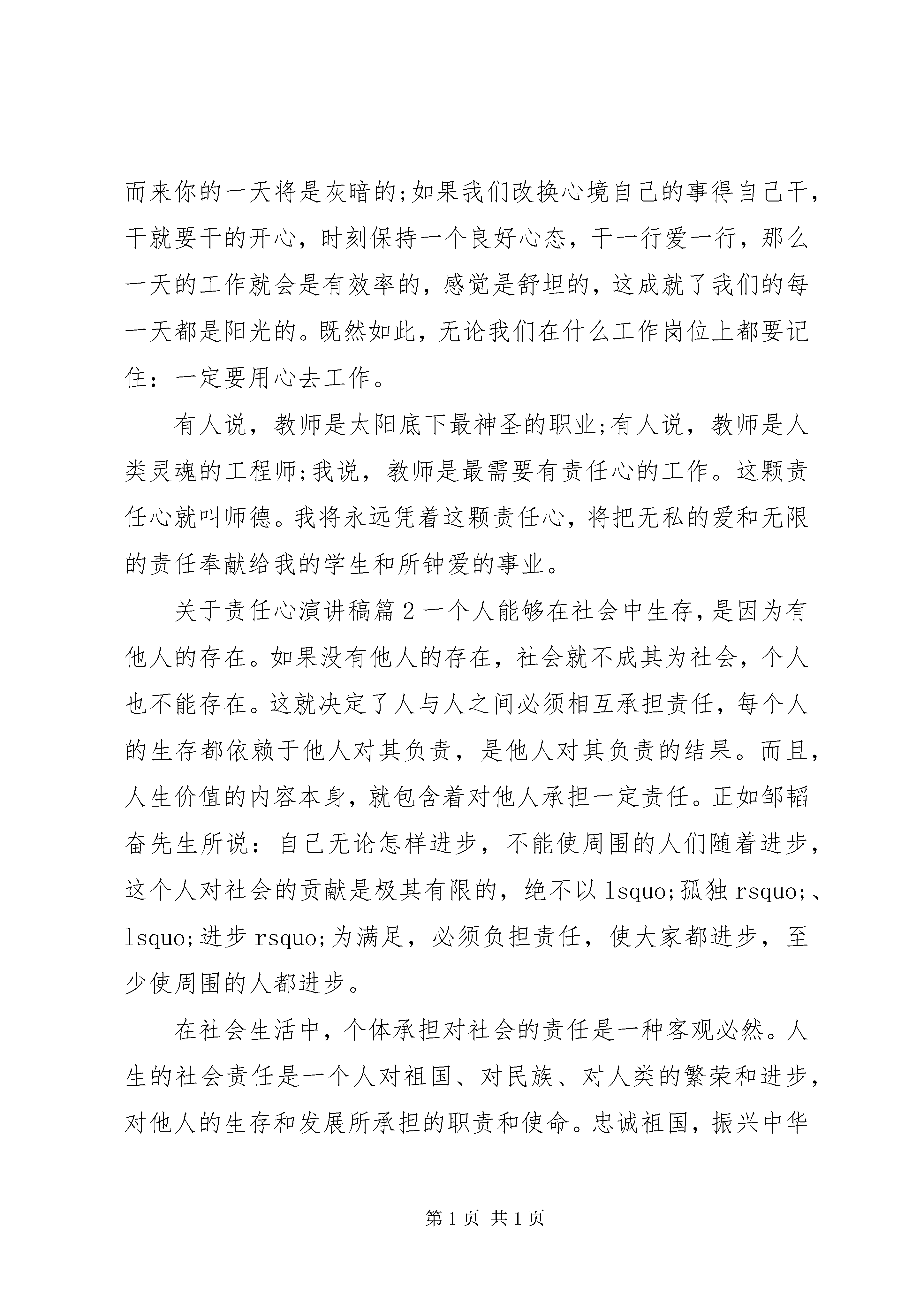 关于责任心演讲稿关于责任心演讲稿篇1尊敬的各位领导、亲爱的老师。大家好。从网络中看到《三分能力,七分责任》一书的介绍。书中精辟的论述及列举一个个鲜活的实例,再一次触动了我的神经中枢,让我对责任二字有了更新更深刻的认识,所以今天我要演讲的题目就是《做一个有责任心的教师》。责任是一种与生俱来的使命。切实履行责任,尽职尽责地对待自己的工作,才是完美展现自身能力与价值。这是《三分能力,七分责任》一书的扉页的一句话。记得美国著名心理学家弗洛姆也说过:责任并不是一种由外部强加在人身上的义务,而是我需要对我所关心的事件做出反应。我觉得这话很对,当我们准备要做什么的时候,当我们在做什么的时候,如果我们心不在焉,我们肯定做不好,甚至会半途而废,但是我们如果清楚自己的责任,明确目标后,我们一定会尽心尽力,千方百计做好的。大家都知道一部名为《背起爸爸上学》的电影看了让人非常感动。电影说的是一个16岁的农村少年,以优异的成绩考取了大学,但面对瘫痪在床无人照顾的父亲,无奈之下只好卖掉全部家产,背着父亲走进校门。开始了漫长而艰辛的求学之路。他背起了父子之情,背起了爱的责任。正是这种久违了的反哺情结,震撼着人们的心灵,呼唤着人们的良知,很多人看后都潸然泪下。看完电影,我一直在思考这么几个问题:什么是责任心怎样才能做一个有责任心的人我们要生活、我们要养家糊口hellip;hellip;我们就得工作,工作就这么简单,与我们形影不离,与我们相伴到老。工作会给我们带来财富、带来成就、带来快乐、带来幸福hellip;hellip;与此同时,也给我们带来责任一份十分凝重的责任。这份责任,与工作紧密相连、密不可分,就像一对孪生兄弟。责任是一种使命,一种做人的态度。我认为,责任从大道理说,就是最基本的职业精神,从小处来说即一个人做事的基本准则。我们的家庭需要责任,因为责任让家庭爱意融融;我们的社会需要责任,因为责任让社会平安发展;我们的学校需要责任,因为责任让学校得到学生、家长、社会的满意。选择了工作,就等于选择了责任。我很欣赏作家毕淑敏的直抵人心的一句实话:人生本没有什么意义,人生的意义便在于我们要努力赋予它的意义。我想我们的教育生涯也是如此:不管教师这个职业的取得是偶然还是必然,是主动还是被动,只要你还在从事它,在作为谋生手段的基础上,如果再把它变成事业,能在工作中寻找快乐,那么我们的工作将是幸福的。在我们的教育教学中,每天有许多琐碎平凡的工作要做,即使有时我们认为是一点意义有没有的工作,如果我们自怨自艾,满腹牢骚,这一天的工作就是无奈的的,感觉是苦恼的,身心是疲惫乏力的,伴随而来你的一天将是灰暗的;如果我们改换心境自己的事得自己干,干就要干的开心,时刻保持一个良好心态,干一行爱一行,那么一天的工作就会是有效率的,感觉是舒坦的,这成就了我们的每一天都是阳光的。既然如此,无论我们在什么工作岗位上都要记住:一定要用心去工作。有人说,教师是太阳底下最神圣的职业;有人说,教师是人类灵魂的工程师;我说,教师是最需要有责任心的工作。这颗责任心就叫师德。我将永远凭着这颗责任心,将把无私的爱和无限的责任奉献给我的学生和所钟爱的事业。关于责任心演讲稿篇2一个人能够在社会中生存,是因为有他人的存在。如果没有他人的存在,社会就不成其为社会,个人也不能存在。这就决定了人与人之间必须相互承担责任,每个人的生存都依赖于他人对其负责,是他人对其负责的结果。而且,人生价值的内容本身,就包含着对他人承担一定责任。正如邹韬奋先生所说:自己无论怎样进步,不能使周围的人们随着进步,这个人对社会的贡献是极其有限的,绝不以lsquo;孤独rsquo;、lsquo;进步rsquo;为满足,必须负担责任,使大家都进步,至少使周围的人都进步。在社会生活中,个体承担对社会的责任是一种客观必然。人生的社会责任是一个人对祖国、对民族、对人类的繁荣和进步,对他人的生存和发展所承担的职责和使命。忠诚祖国,振兴中华是当代个人对国家和民族负有的历史责任的首要使命。以忠诚祖国,振兴中华为已任,就要把个人奋斗的目标融会到全国人民所追求的共同目标和崇高理想中,献身于建设社会主义现代化事业,献身于促进和维护祖国的统一事业;就必须不断地学习,掌握先进的科学技术,成为现代化建设的内行、专家和创造者。同时服务人民,奉献社会也是个人的基本职责。我们无论做什么事,若是没有责任心,必定是做不好的,因为天下无难事,只怕有心人。并不是说一件事,只要用心去做就不难,所以责任心是非常重要的。但是要怎样才算是有责任心呢。就是要每位员工在自己的岗位上竭尽心力。譬如我是一名客户经理,负责维系客户,就要做到以客户为中心,客户事情无小事。因为不尽职,事绝对做不好。我们工作做不好,就直接影响到客户感知,容易引起客户强烈的不满。责任心是一种担当,