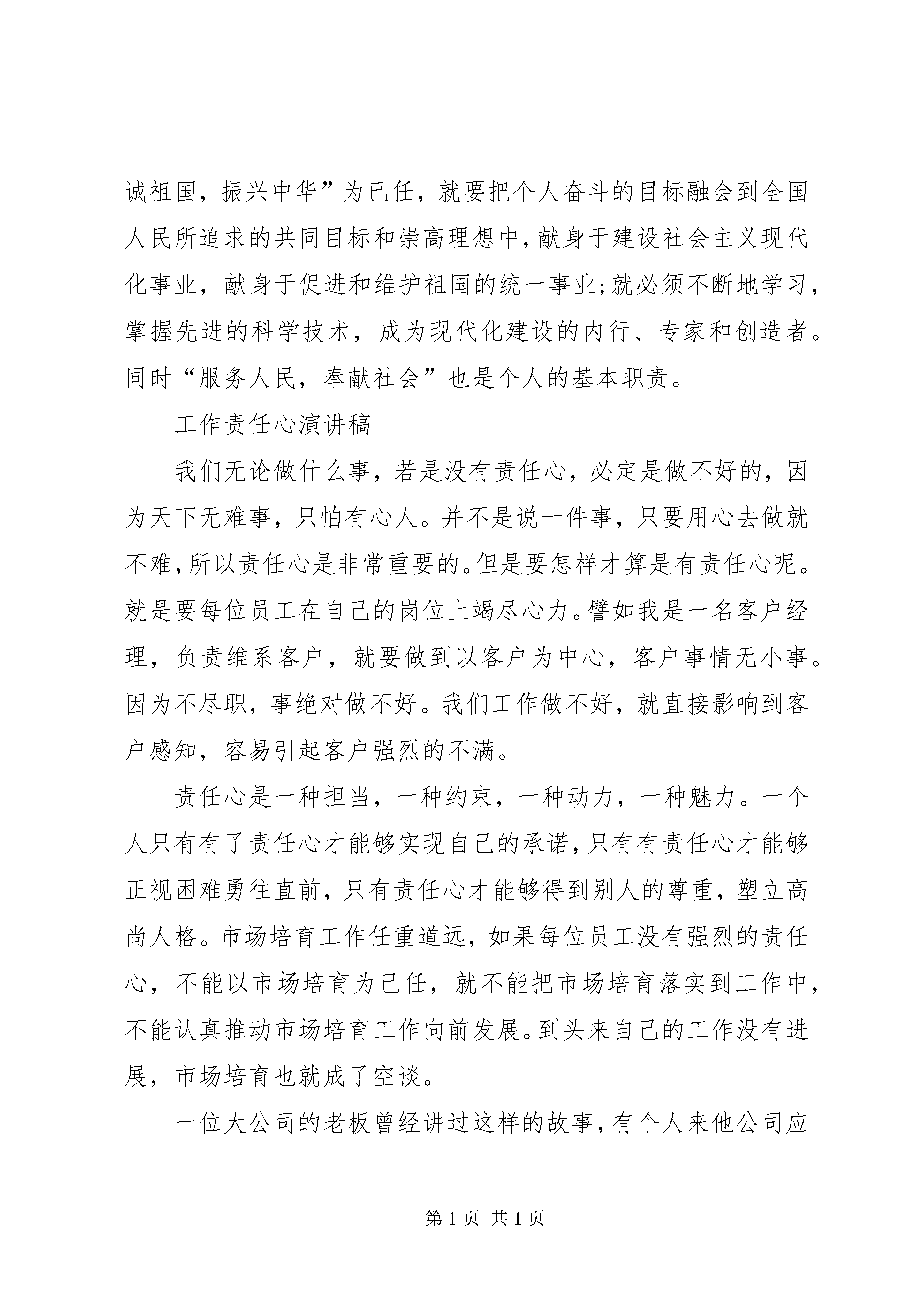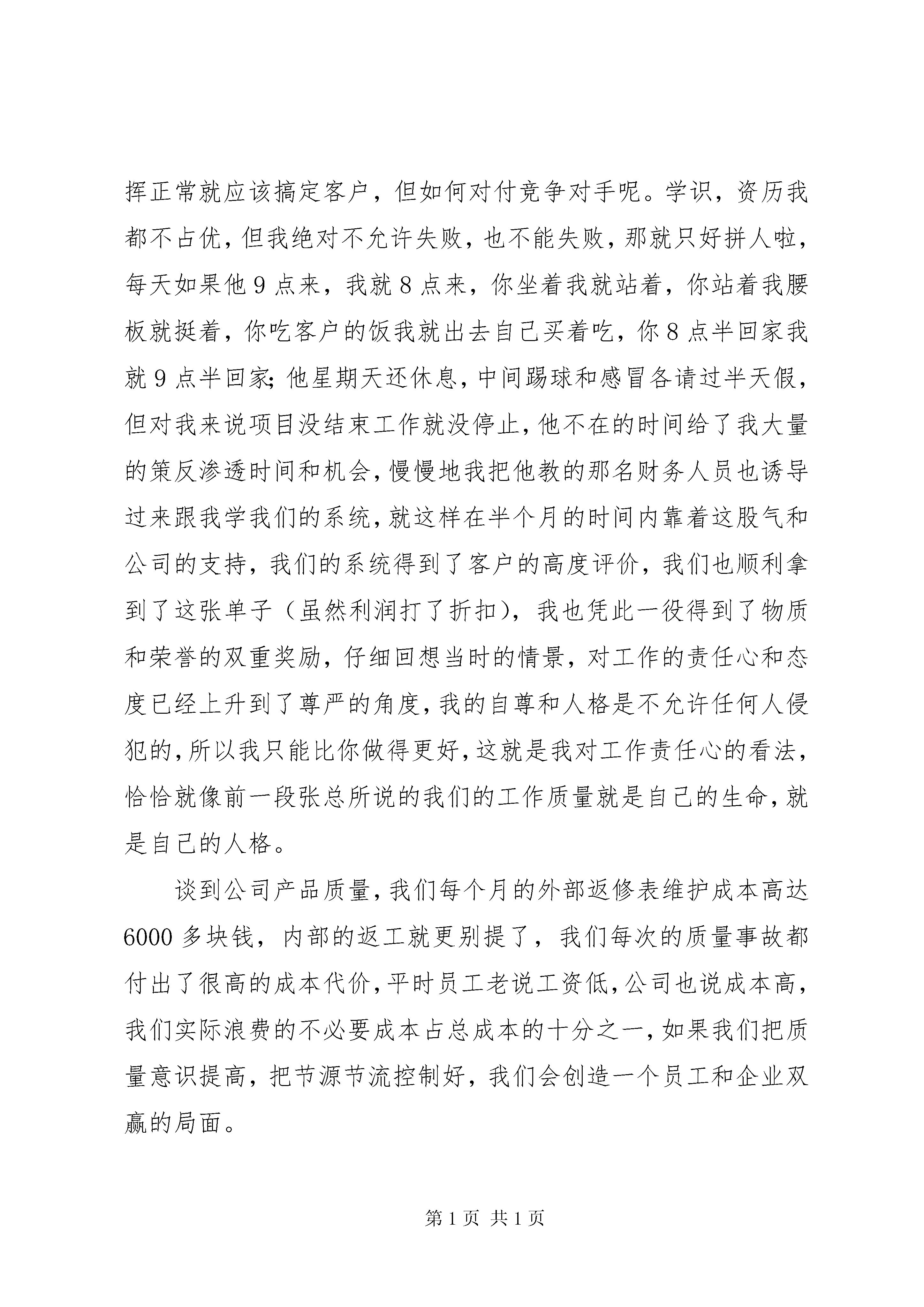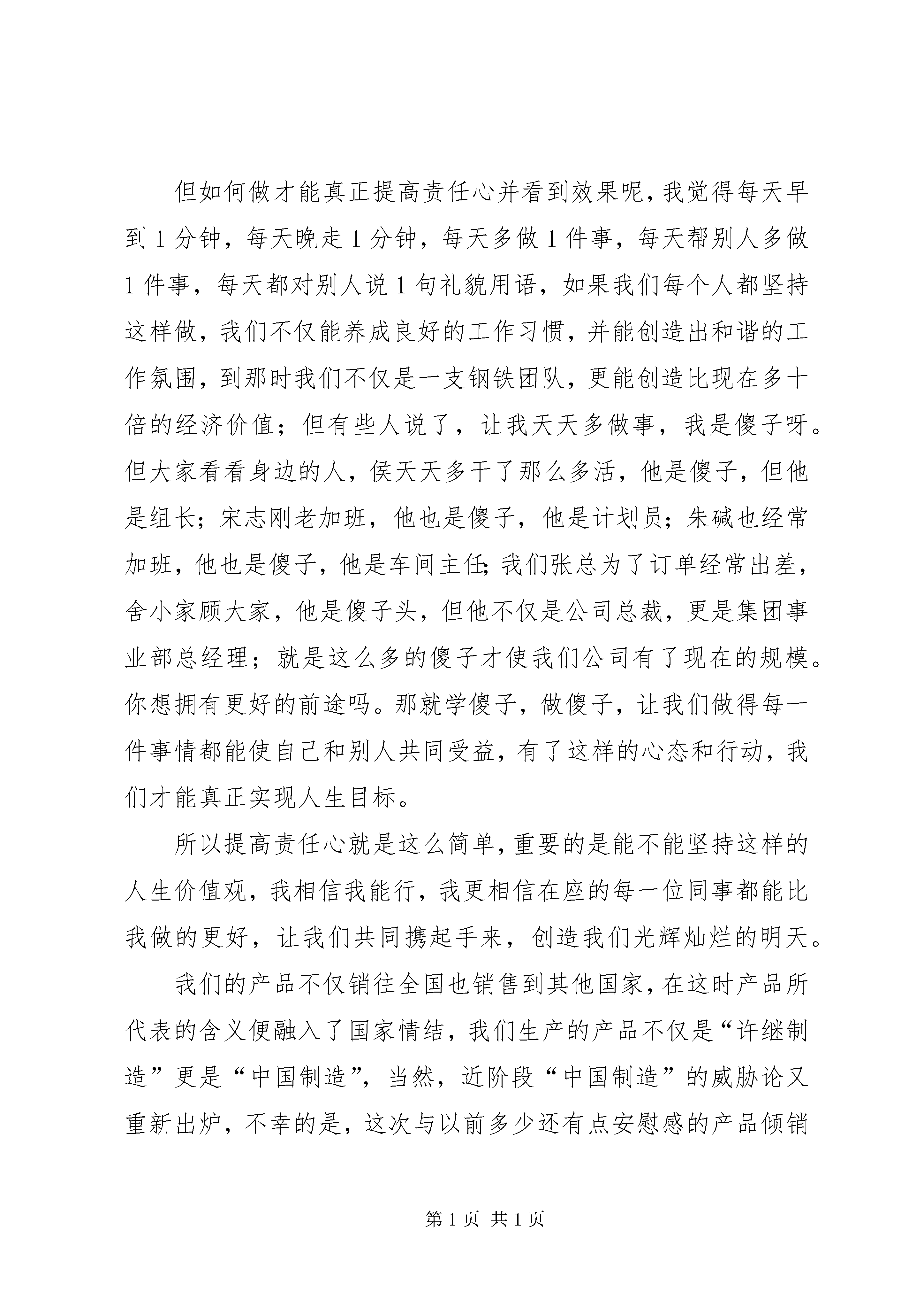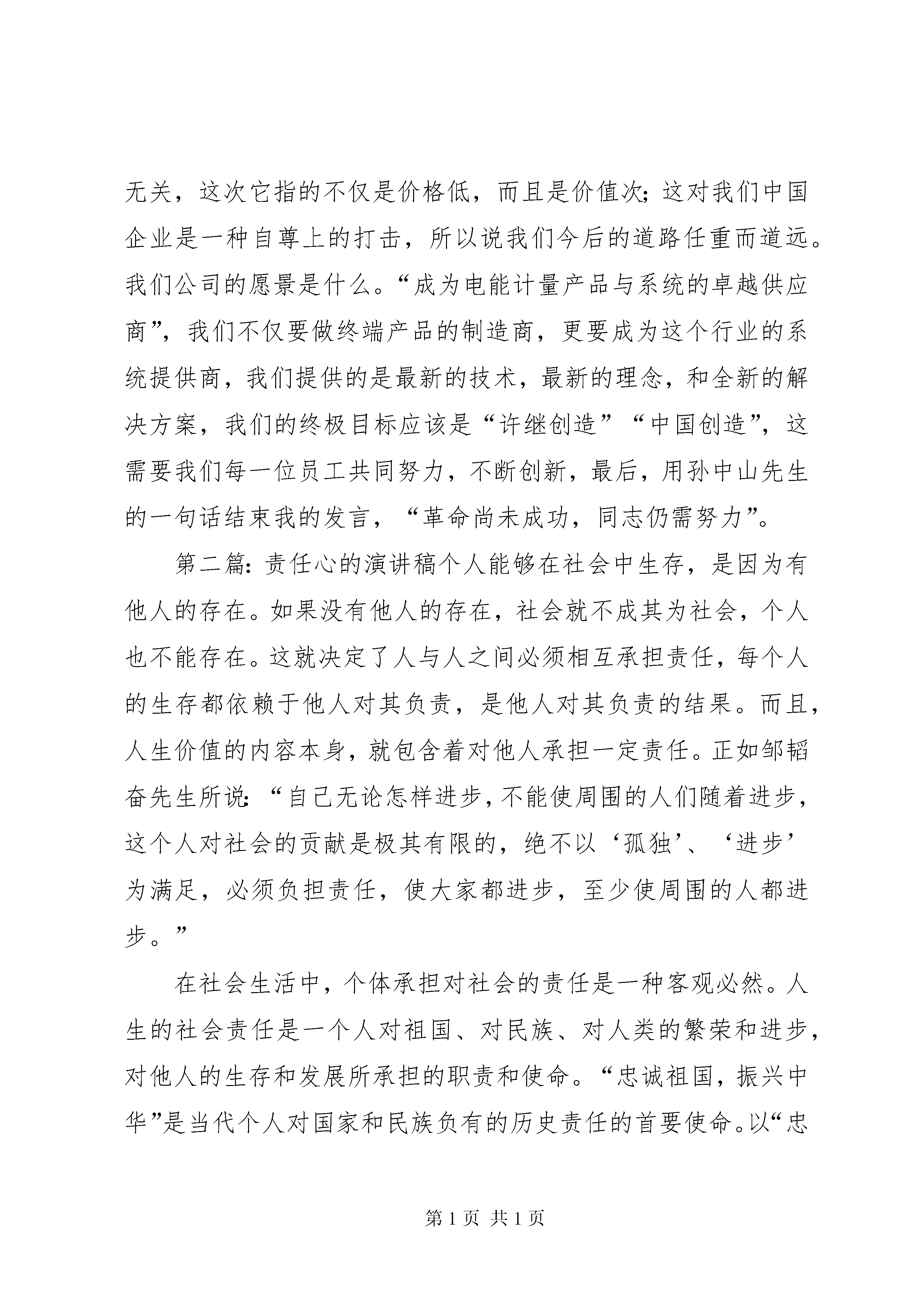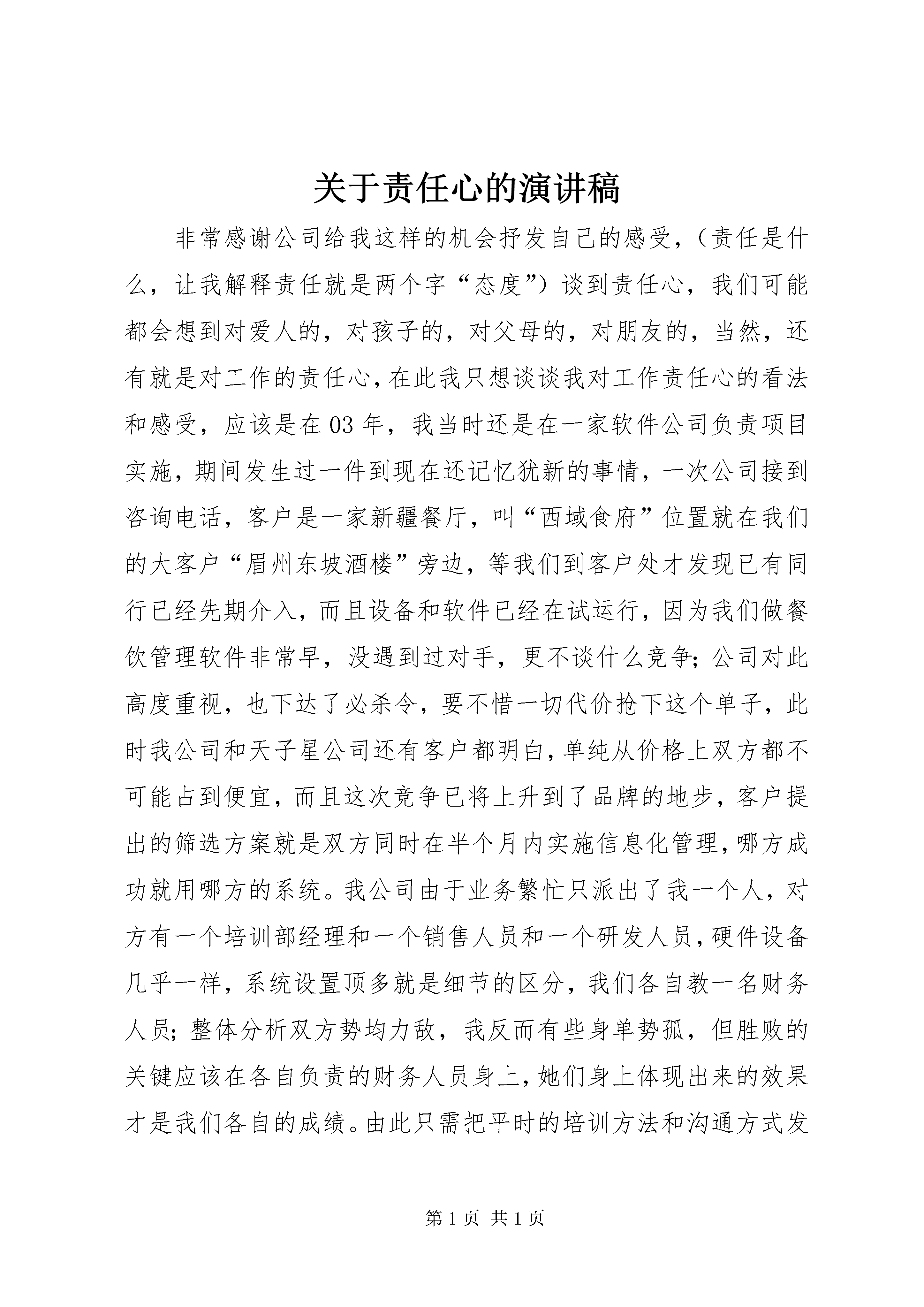 关于责任心的演讲稿非常感谢公司给我这样的机会抒发自己的感受,(责任是什么,让我解释责任就是两个字“态度”)谈到责任心,我们可能都会想到对爱人的,对孩子的,对父母的,对朋友的,当然,还有就是对工作的责任心,在此我只想谈谈我对工作责任心的看法和感受,应该是在03年,我当时还是在一家软件公司负责项目实施,期间发生过一件到现在还记忆犹新的事情,一次公司接到咨询电话,客户是一家新疆餐厅,叫“西域食府”位置就在我们的大客户“眉州东坡酒楼”旁边,等我们到客户处才发现已有同行已经先期介入,而且设备和软件已经在试运行,因为我们做餐饮管理软件非常早,没遇到过对手,更不谈什么竞争;公司对此高度重视,也下达了必杀令,要不惜一切代价抢下这个单子,此时我公司和天子星公司还有客户都明白,单纯从价格上双方都不可能占到便宜,而且这次竞争已将上升到了品牌的地步,客户提出的筛选方案就是双方同时在半个月内实施信息化管理,哪方成功就用哪方的系统。我公司由于业务繁忙只派出了我一个人,对方有一个培训部经理和一个销售人员和一个研发人员,硬件设备几乎一样,系统设置顶多就是细节的区分,我们各自教一名财务人员;整体分析双方势均力敌,我反而有些身单势孤,但胜败的关键应该在各自负责的财务人员身上,她们身上体现出来的效果才是我们各自的成绩。由此只需把平时的培训方法和沟通方式发挥正常就应该搞定客户,但如何对付竞争对手呢。学识,资历我都不占优,但我绝对不允许失败,也不能失败,那就只好拼人啦,每天如果他9点来,我就8点来,你坐着我就站着,你站着我腰板就挺着,你吃客户的饭我就出去自己买着吃,你8点半回家我就9点半回家;他星期天还休息,中间踢球和感冒各请过半天假,但对我来说项目没结束工作就没停止,他不在的时间给了我大量的策反渗透时间和机会,慢慢地我把他教的那名财务人员也诱导过来跟我学我们的系统,就这样在半个月的时间内靠着这股气和公司的支持,我们的系统得到了客户的高度评价,我们也顺利拿到了这张单子(虽然利润打了折扣),我也凭此一役得到了物质和荣誉的双重奖励,仔细回想当时的情景,对工作的责任心和态度已经上升到了尊严的角度,我的自尊和人格是不允许任何人侵犯的,所以我只能比你做得更好,这就是我对工作责任心的看法,恰恰就像前一段张总所说的我们的工作质量就是自己的生命,就是自己的人格。谈到公司产品质量,我们每个月的外部返修表维护成本高达6000多块钱,内部的返工就更别提了,我们每次的质量事故都付出了很高的成本代价,平时员工老说工资低,公司也说成本高,我们实际浪费的不必要成本占总成本的十分之一,如果我们把质量意识提高,把节源节流控制好,我们会创造一个员工和企业双赢的局面。但如何做才能真正提高责任心并看到效果呢,我觉得每天早到1分钟,每天晚走1分钟,每天多做1件事,每天帮别人多做1件事,每天都对别人说1句礼貌用语,如果我们每个人都坚持这样做,我们不仅能养成良好的工作习惯,并能创造出和谐的工作氛围,到那时我们不仅是一支钢铁团队,更能创造比现在多十倍的经济价值;但有些人说了,让我天天多做事,我是傻子呀。但大家看看身边的人,侯天天多干了那么多活,他是傻子,但他是组长;宋志刚老加班,他也是傻子,他是计划员;朱碱也经常加班,他也是傻子,他是车间主任;我们张总为了订单经常出差,舍小家顾大家,他是傻子头,但他不仅是公司总裁,更是集团事业部总经理;就是这么多的傻子才使我们公司有了现在的规模。你想拥有更好的前途吗。那就学傻子,做傻子,让我们做得每一件事情都能使自己和别人共同受益,有了这样的心态和行动,我们才能真正实现人生目标。所以提高责任心就是这么简单,重要的是能不能坚持这样的人生价值观,我相信我能行,我更相信在座的每一位同事都能比我做的更好,让我们共同携起手来,创造我们光辉灿烂的明天。我们的产品不仅销往全国也销售到其他国家,在这时产品所代表的含义便融入了国家情结,我们生产的产品不仅是“许继制造”更是“中国制造”,当然,近阶段“中国制造”的威胁论又重新出炉,不幸的是,这次与以前多少还有点安慰感的产品倾销无关,这次它指的不仅是价格低,而且是价值次;这对我们中国企业是一种自尊上的打击,所以说我们今后的道路任重而道远。我们公司的愿景是什么。“成为电能计量产品与系统的卓越供应商”,我们不仅要做终端产品的制造商,更要成为这个行业的系统提供商,我们提供的是最新的技术,最新的理念,和全新的解决方案,我们的终极目标应该是“许继创造”“中国创造”,这需要我们每一位员工共同努力,不断创新,最后,用孙中山先生的一句话结束我的发言,“革命尚未成功,同志仍需努力”。第二篇:责任心的演讲稿个人能够在社会中生存,是因为有他人的存在。如果没有他人的存在,社会就不成其为社会,个人也不能存在。这就决定了人与人之间必须相互承担责任,每个人的
