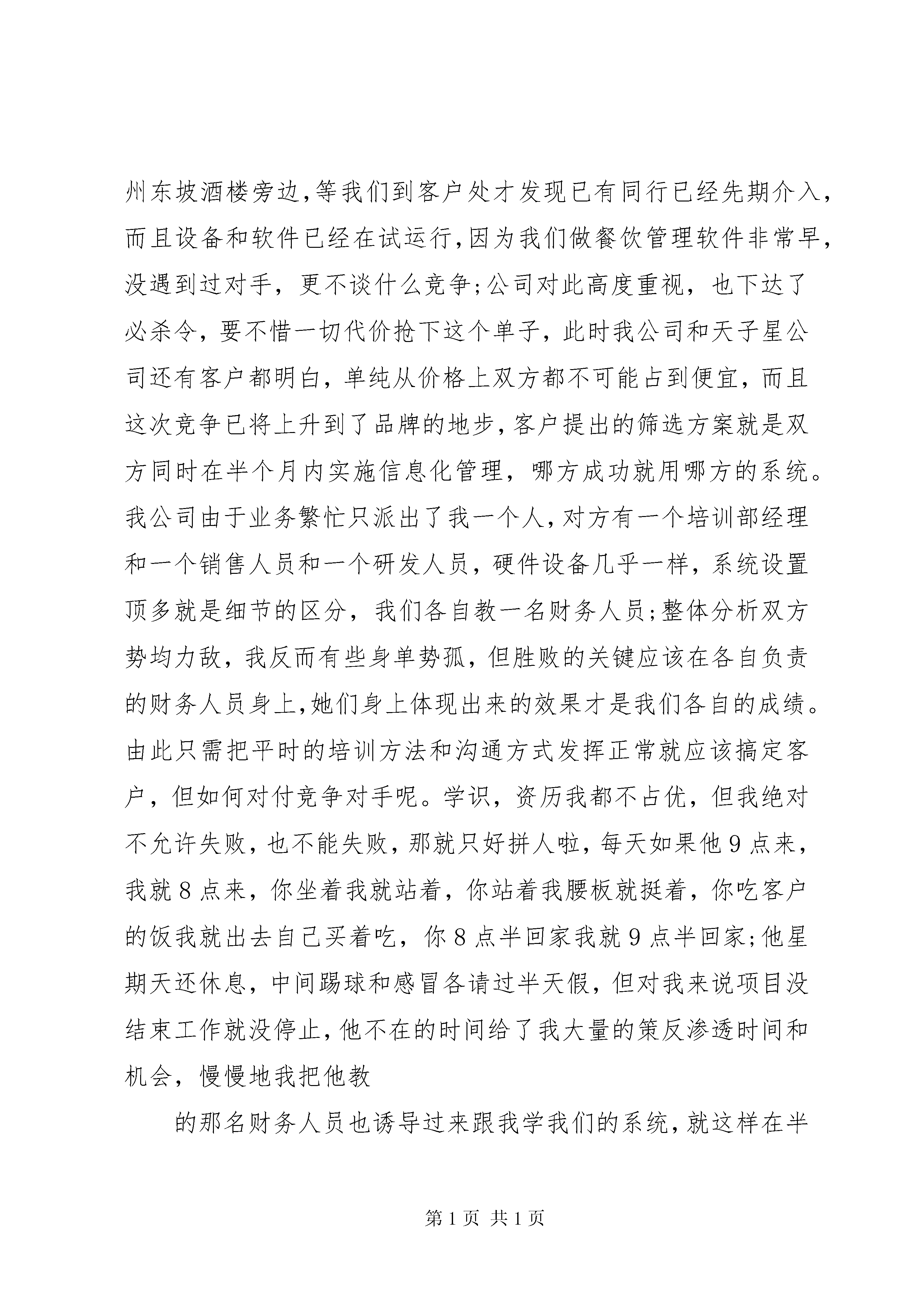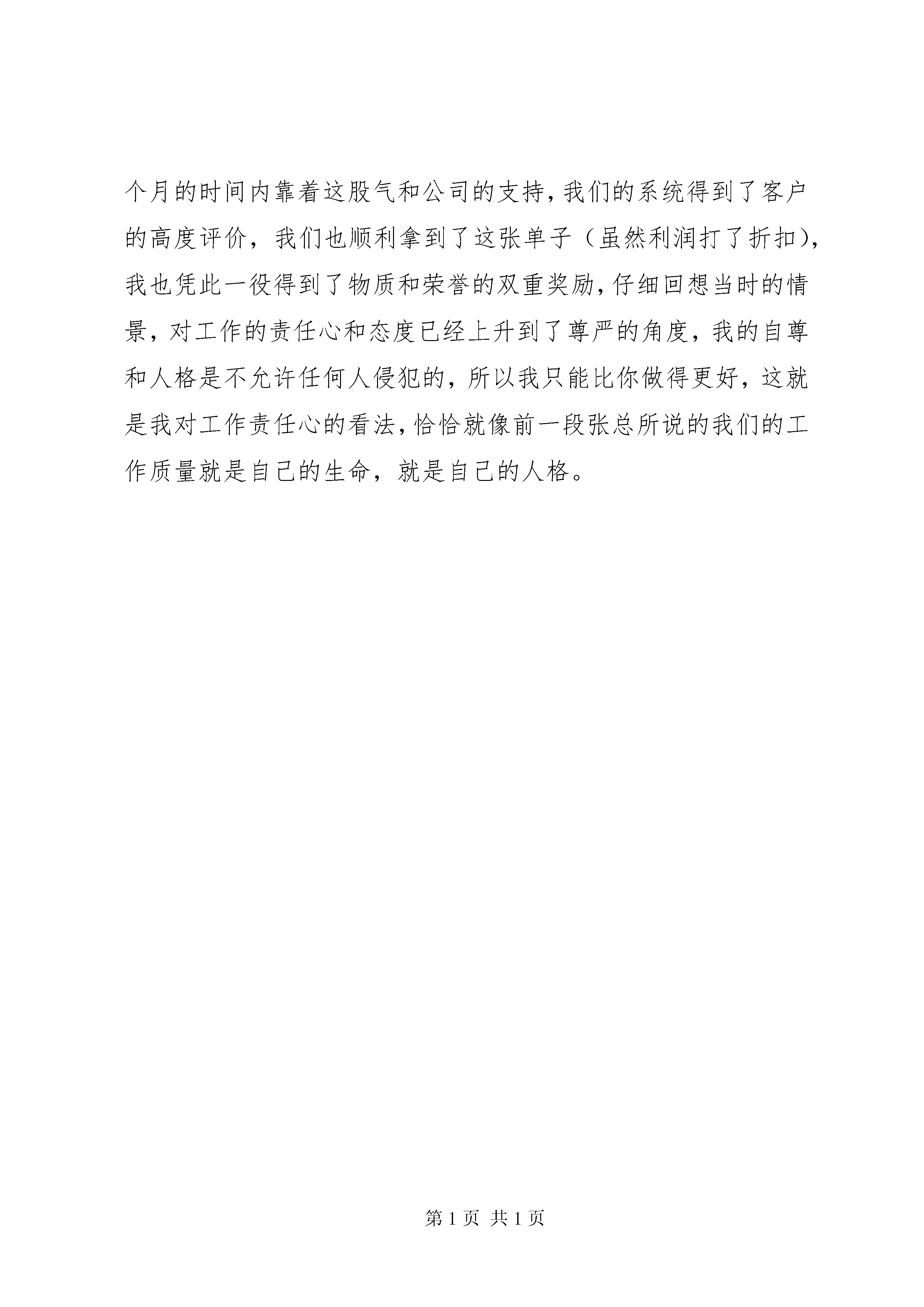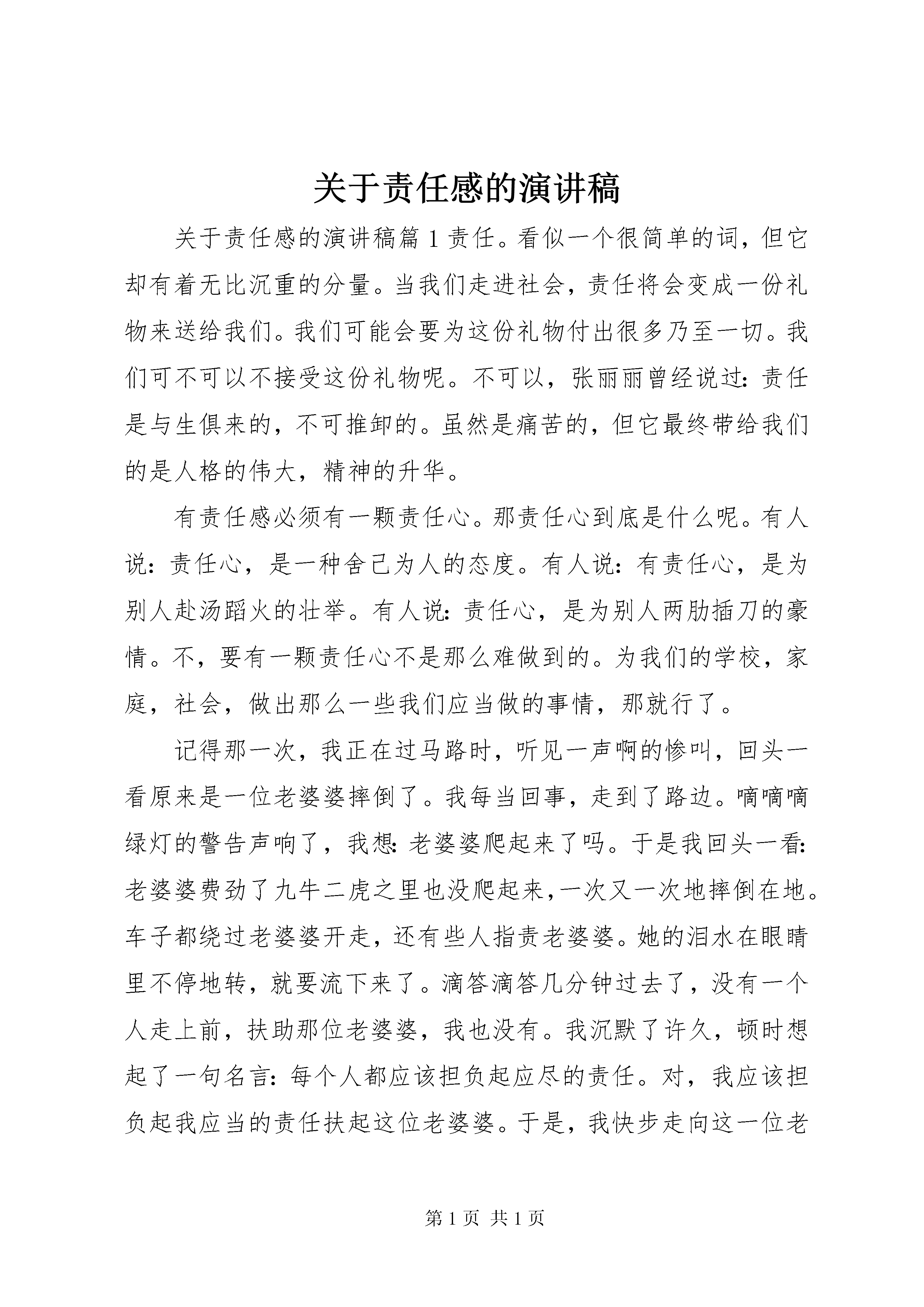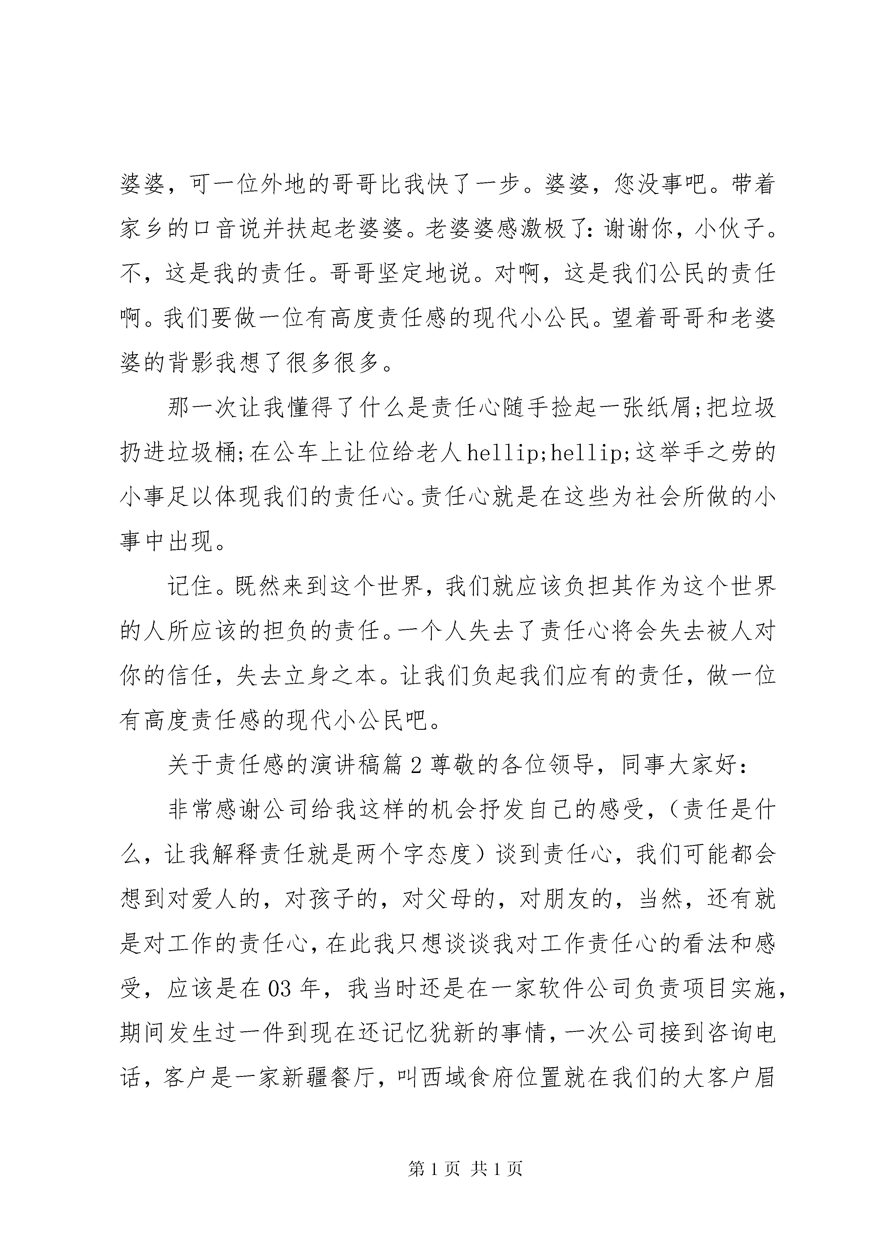 关于责任感的演讲稿关于责任感的演讲稿篇1责任。看似一个很简单的词,但它却有着无比沉重的分量。当我们走进社会,责任将会变成一份礼物来送给我们。我们可能会要为这份礼物付出很多乃至一切。我们可不可以不接受这份礼物呢。不可以,张丽丽曾经说过:责任是与生俱来的,不可推卸的。虽然是痛苦的,但它最终带给我们的是人格的伟大,精神的升华。有责任感必须有一颗责任心。那责任心到底是什么呢。有人说:责任心,是一种舍己为人的态度。有人说:有责任心,是为别人赴汤蹈火的壮举。有人说:责任心,是为别人两肋插刀的豪情。不,要有一颗责任心不是那么难做到的。为我们的学校,家庭,社会,做出那么一些我们应当做的事情,那就行了。记得那一次,我正在过马路时,听见一声啊的惨叫,回头一看原来是一位老婆婆摔倒了。我每当回事,走到了路边。嘀嘀嘀绿灯的警告声响了,我想:老婆婆爬起来了吗。于是我回头一看:老婆婆费劲了九牛二虎之里也没爬起来,一次又一次地摔倒在地。车子都绕过老婆婆开走,还有些人指责老婆婆。她的泪水在眼睛里不停地转,就要流下来了。滴答滴答几分钟过去了,没有一个人走上前,扶助那位老婆婆,我也没有。我沉默了许久,顿时想起了一句名言:每个人都应该担负起应尽的责任。对,我应该担负起我应当的责任扶起这位老婆婆。于是,我快步走向这一位老婆婆,可一位外地的哥哥比我快了一步。婆婆,您没事吧。带着家乡的口音说并扶起老婆婆。老婆婆感激极了:谢谢你,小伙子。不,这是我的责任。哥哥坚定地说。对啊,这是我们公民的责任啊。我们要做一位有高度责任感的现代小公民。望着哥哥和老婆婆的背影我想了很多很多。那一次让我懂得了什么是责任心随手捡起一张纸屑;把垃圾扔进垃圾桶;在公车上让位给老人hellip;hellip;这举手之劳的小事足以体现我们的责任心。责任心就是在这些为社会所做的小事中出现。记住。既然来到这个世界,我们就应该负担其作为这个世界的人所应该的担负的责任。一个人失去了责任心将会失去被人对你的信任,失去立身之本。让我们负起我们应有的责任,做一位有高度责任感的现代小公民吧。关于责任感的演讲稿篇2尊敬的各位领导,同事大家好:非常感谢公司给我这样的机会抒发自己的感受,(责任是什么,让我解释责任就是两个字态度)谈到责任心,我们可能都会想到对爱人的,对孩子的,对父母的,对朋友的,当然,还有就是对工作的责任心,在此我只想谈谈我对工作责任心的看法和感受,应该是在03年,我当时还是在一家软件公司负责项目实施,期间发生过一件到现在还记忆犹新的事情,一次公司接到咨询电话,客户是一家新疆餐厅,叫西域食府位置就在我们的大客户眉州东坡酒楼旁边,等我们到客户处才发现已有同行已经先期介入,而且设备和软件已经在试运行,因为我们做餐饮管理软件非常早,没遇到过对手,更不谈什么竞争;公司对此高度重视,也下达了必杀令,要不惜一切代价抢下这个单子,此时我公司和天子星公司还有客户都明白,单纯从价格上双方都不可能占到便宜,而且这次竞争已将上升到了品牌的地步,客户提出的筛选方案就是双方同时在半个月内实施信息化管理,哪方成功就用哪方的系统。我公司由于业务繁忙只派出了我一个人,对方有一个培训部经理和一个销售人员和一个研发人员,硬件设备几乎一样,系统设置顶多就是细节的区分,我们各自教一名财务人员;整体分析双方势均力敌,我反而有些身单势孤,但胜败的关键应该在各自负责的财务人员身上,她们身上体现出来的效果才是我们各自的成绩。由此只需把平时的培训方法和沟通方式发挥正常就应该搞定客户,但如何对付竞争对手呢。学识,资历我都不占优,但我绝对不允许失败,也不能失败,那就只好拼人啦,每天如果他9点来,我就8点来,你坐着我就站着,你站着我腰板就挺着,你吃客户的饭我就出去自己买着吃,你8点半回家我就9点半回家;他星期天还休息,中间踢球和感冒各请过半天假,但对我来说项目没结束工作就没停止,他不在的时间给了我大量的策反渗透时间和机会,慢慢地我把他教的那名财务人员也诱导过来跟我学我们的系统,就这样在半个月的时间内靠着这股气和公司的支持,我们的系统得到了客户的高度评价,我们也顺利拿到了这张单子(虽然利润打了折扣),我也凭此一役得到了物质和荣誉的双重奖励,仔细回想当时的情景,对工作的责任心和态度已经上升到了尊严的角度,我的自尊和人格是不允许任何人侵犯的,所以我只能比你做得更好,这就是我对工作责任心的看法,恰恰就像前一段张总所说的我们的工作质量就是自己的生命,就是自己的人格。