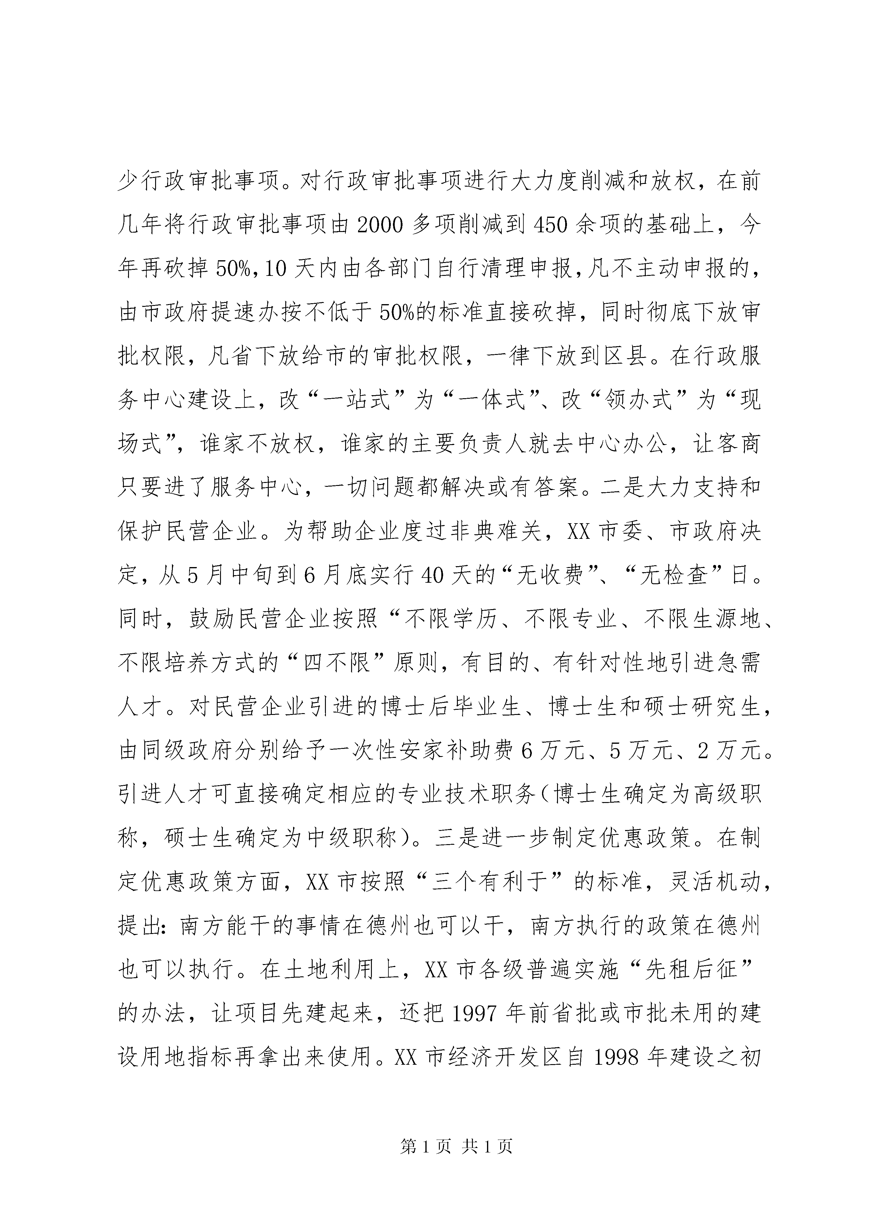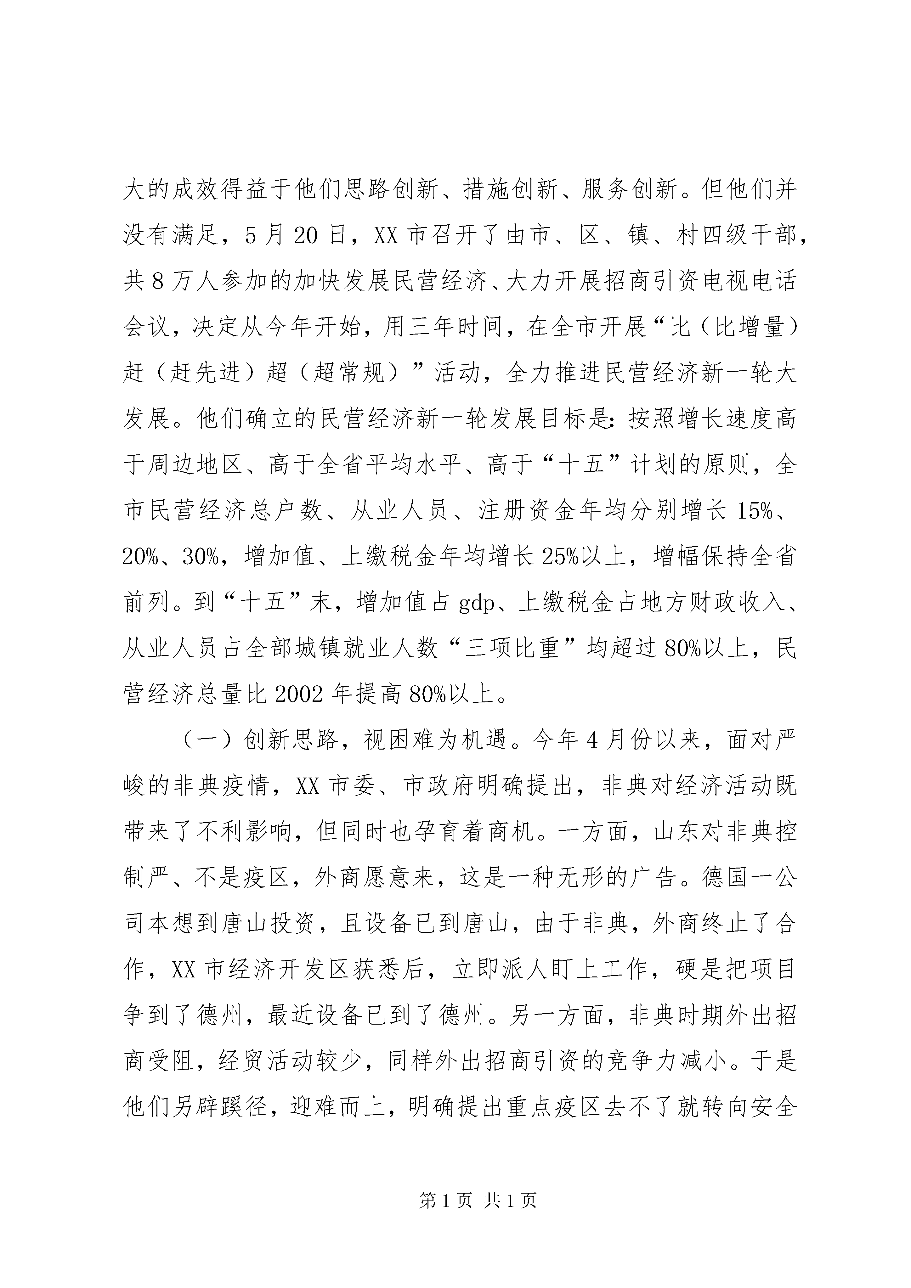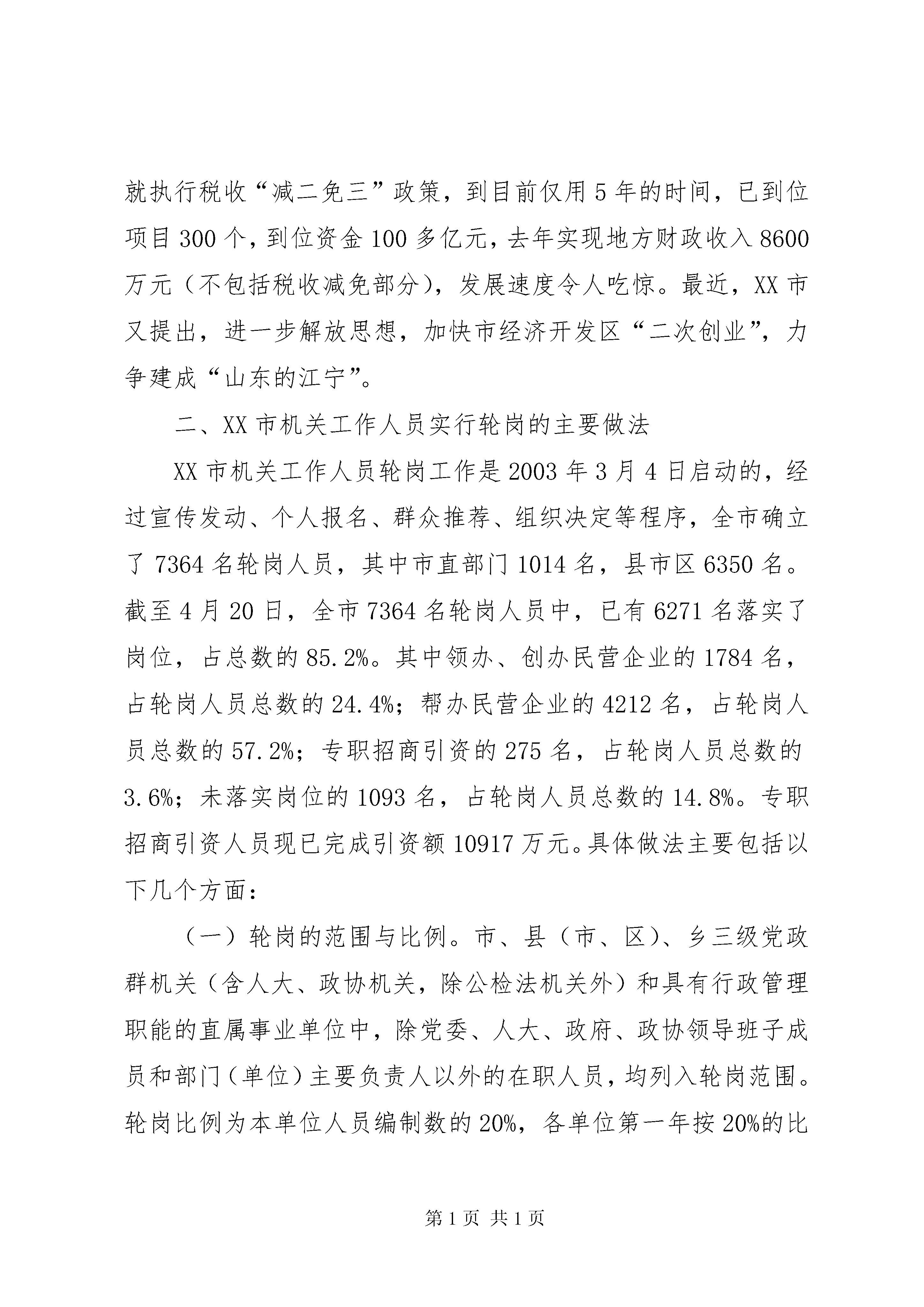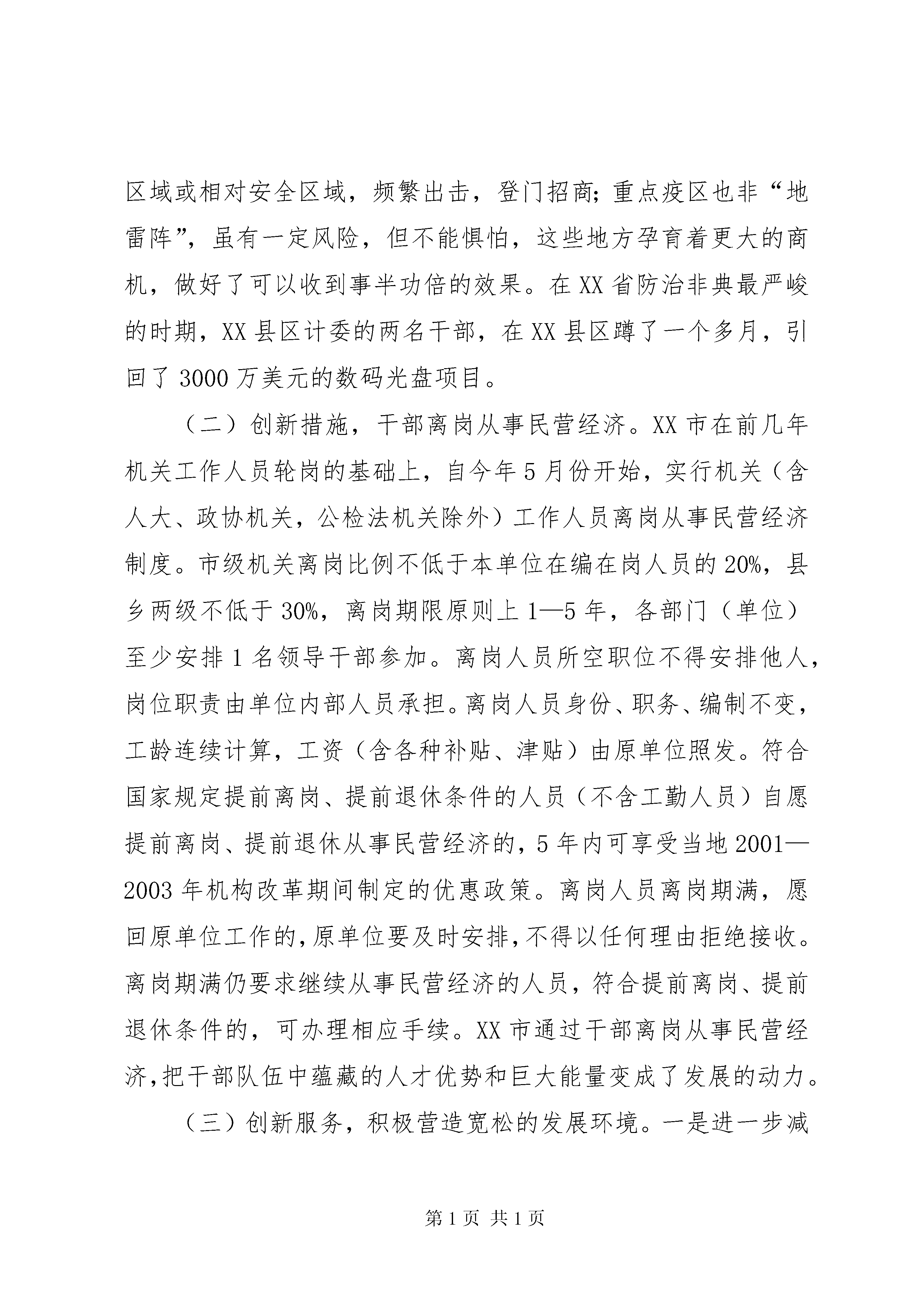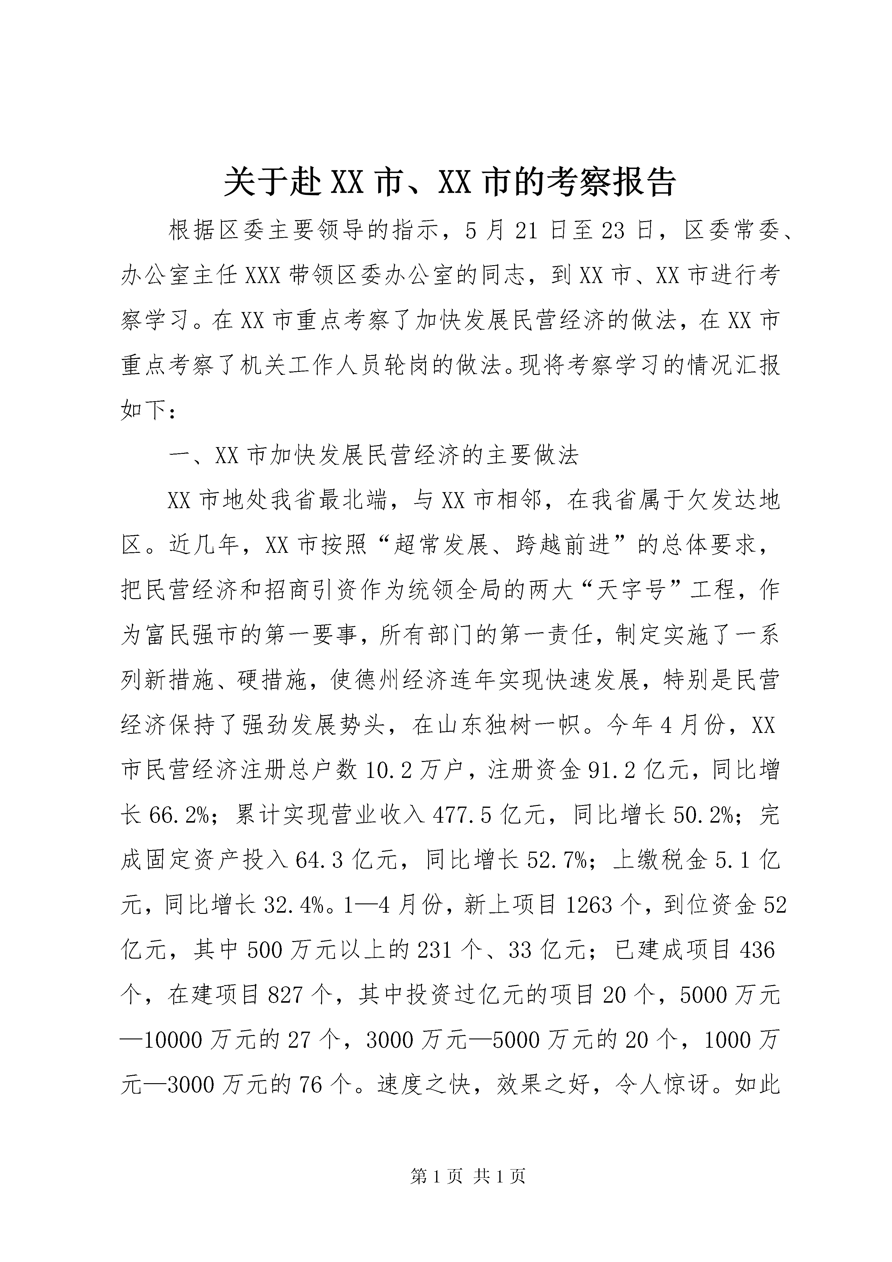 关于赴XX市、XX市的考察报告根据区委主要领导的指示,5月21日至23日,区委常委、办公室主任XXX带领区委办公室的同志,到XX市、XX市进行考察学习。在XX市重点考察了加快发展民营经济的做法,在XX市重点考察了机关工作人员轮岗的做法。现将考察学习的情况汇报如下:一、XX市加快发展民营经济的主要做法XX市地处我省最北端,与XX市相邻,在我省属于欠发达地区。近几年,XX市按照“超常发展、跨越前进”的总体要求,把民营经济和招商引资作为统领全局的两大“天字号”工程,作为富民强市的第一要事,所有部门的第一责任,制定实施了一系列新措施、硬措施,使德州经济连年实现快速发展,特别是民营经济保持了强劲发展势头,在山东独树一帜。今年4月份,XX市民营经济注册总户数10.2万户,注册资金91.2亿元,同比增长66.2%;累计实现营业收入477.5亿元,同比增长50.2%;完成固定资产投入64.3亿元,同比增长52.7%;上缴税金5.1亿元,同比增长32.4%。1—4月份,新上项目1263个,到位资金52亿元,其中500万元以上的231个、33亿元;已建成项目436个,在建项目827个,其中投资过亿元的项目20个,5000万元—10000万元的27个,3000万元—5000万元的20个,1000万元—3000万元的76个。速度之快,效果之好,令人惊讶。如此大的成效得益于他们思路创新、措施创新、服务创新。但他们并没有满足,5月20日,XX市召开了由市、区、镇、村四级干部,共8万人参加的加快发展民营经济、大力开展招商引资电视电话会议,决定从今年开始,用三年时间,在全市开展“比(比增量)赶(赶先进)超(超常规)”活动,全力推进民营经济新一轮大发展。他们确立的民营经济新一轮发展目标是:按照增长速度高于周边地区、高于全省平均水平、高于“十五”计划的原则,全市民营经济总户数、从业人员、注册资金年均分别增长15%、20%、30%,增加值、上缴税金年均增长25%以上,增幅保持全省前列。到“十五”末,增加值占gdp、上缴税金占地方财政收入、从业人员占全部城镇就业人数“三项比重”均超过80%以上,民营经济总量比2002年提高80%以上。(一)创新思路,视困难为机遇。今年4月份以来,面对严峻的非典疫情,XX市委、市政府明确提出,非典对经济活动既带来了不利影响,但同时也孕育着商机。一方面,山东对非典控制严、不是疫区,外商愿意来,这是一种无形的广告。德国一公司本想到唐山投资,且设备已到唐山,由于非典,外商终止了合作,XX市经济开发区获悉后,立即派人盯上工作,硬是把项目争到了德州,最近设备已到了德州。另一方面,非典时期外出招商受阻,经贸活动较少,同样外出招商引资的竞争力减小。于是他们另辟蹊径,迎难而上,明确提出重点疫区去不了就转向安全区域或相对安全区域,频繁出击,登门招商;重点疫区也非“地雷阵”,虽有一定风险,但不能惧怕,这些地方孕育着更大的商机,做好了可以收到事半功倍的效果。在XX省防治非典最严峻的时期,XX县区计委的两名干部,在XX县区蹲了一个多月,引回了3000万美元的数码光盘项目。(二)创新措施,干部离岗从事民营经济。XX市在前几年机关工作人员轮岗的基础上,自今年5月份开始,实行机关(含人大、政协机关,公检法机关除外)工作人员离岗从事民营经济制度。市级机关离岗比例不低于本单位在编在岗人员的20%,县乡两级不低于30%,离岗期限原则上1—5年,各部门(单位)至少安排1名领导干部参加。离岗人员所空职位不得安排他人,岗位职责由单位内部人员承担。离岗人员身份、职务、编制不变,工龄连续计算,工资(含各种补贴、津贴)由原单位照发。符合国家规定提前离岗、提前退休条件的人员(不含工勤人员)自愿提前离岗、提前退休从事民营经济的,5年内可享受当地2001—2003年机构改革期间制定的优惠政策。离岗人员离岗期满,愿回原单位工作的,原单位要及时安排,不得以任何理由拒绝接收。离岗期满仍要求继续从事民营经济的人员,符合提前离岗、提前退休条件的,可办理相应手续。XX市通过干部离岗从事民营经济,把干部队伍中蕴藏的人才优势和巨大能量变成了发展的动力。(三)创新服务,积极营造宽松的发展环境。一是进一步减少行政审批事项。对行政审批事项进行大力度削减和放权,在前几年将行政审批事项由2000多项削减到450余项的基础上,今年再砍掉50%,10天内由各部门自行清理申报,凡不主动申报的,由市政府提速办按不低于50%的标准直接砍掉,同时彻底下放审批权限,凡省下放给市的审批权限,一律下放到区县。在行政服务中心建设上,改“一站式”为“一体式”、改“领办式”为“现场式”,谁家不放权,谁家的主要负责人就去中心办公,让客商只要进了服务中心,一切问题都解决或有答案。二是大力支持和保护民营企业。为帮助企