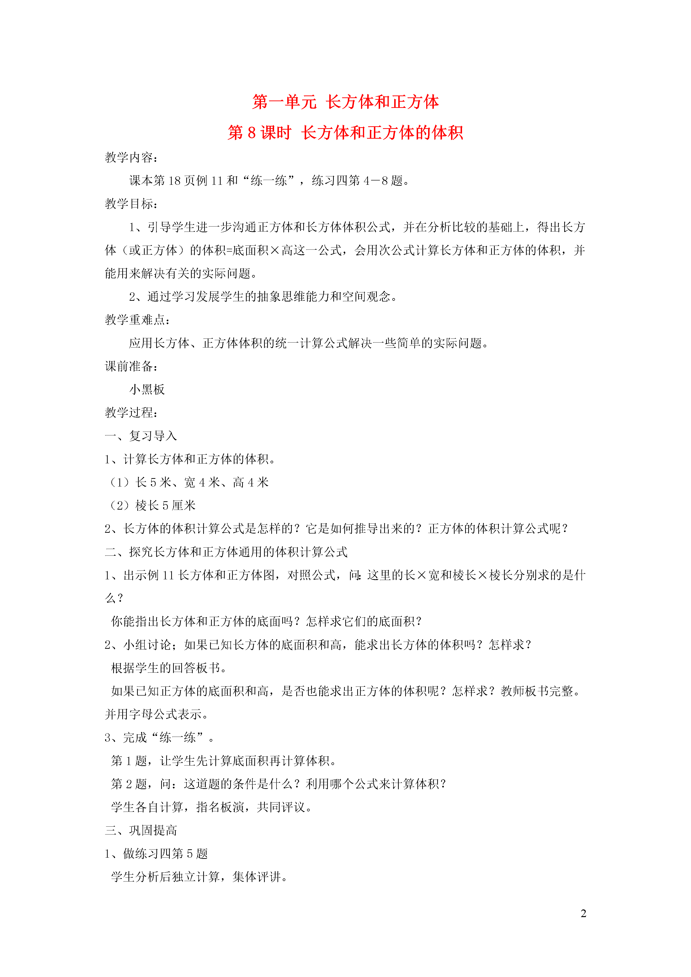 2第一单元长方体和正方体第8课时长方体和正方体的体积教学内容:课本例11和“练一练”,练习四第4-8题。教学目标:1、引导学生进一步沟通正方体和长方体体积公式,并在分析比较的基础上,得出长方体(或正方体)的体积=底面积×高这一公式,会用次公式计算长方体和正方体的体积,并能用来解决有关的实际问题。2、通过学习发展学生的抽象思维能力和空间观念。教学重难点:应用长方体、正方体体积的统一计算公式解决一些简单的实际问题。课前准备:小黑板教学过程:一、复习导入1、计算长方体和正方体的体积。(1)长5米、宽4米、高4米(2)棱长5厘米2、长方体的体积计算公式是怎样的?它是如何推导出来的?正方体的体积计算公式呢?二、探究长方体和正方体通用的体积计算公式1、出示例11长方体和正方体图,对照公式,问:这里的长×宽和棱长×棱长分别求的是什么?你能指出长方体和正方体的底面吗?怎样求它们的底面积?2、小组讨论;如果已知长方体的底面积和高,能求出长方体的体积吗?怎样求?根据学生的回答板书。如果已知正方体的底面积和高,是否也能求出正方体的体积呢?怎样求?教师板书完整。并用字母公式表示。3、完成“练一练”。第1题,让学生先计算底面积再计算体积。第2题,问:这道题的条件是什么?利用哪个公式来计算体积?学生各自计算,指名板演,共同评议。三、巩固提高1、做练习四第5题学生分析后独立计算,集体评讲。2、做练习四第6题学生独立计算,然后全班交流。3、做练习四第7题读题理解题意,用方程独立解答,交流订正。四、课堂总结通过这节课的学习,你有什么收获呢?五、布置作业练习四第4、8题。教学反思: