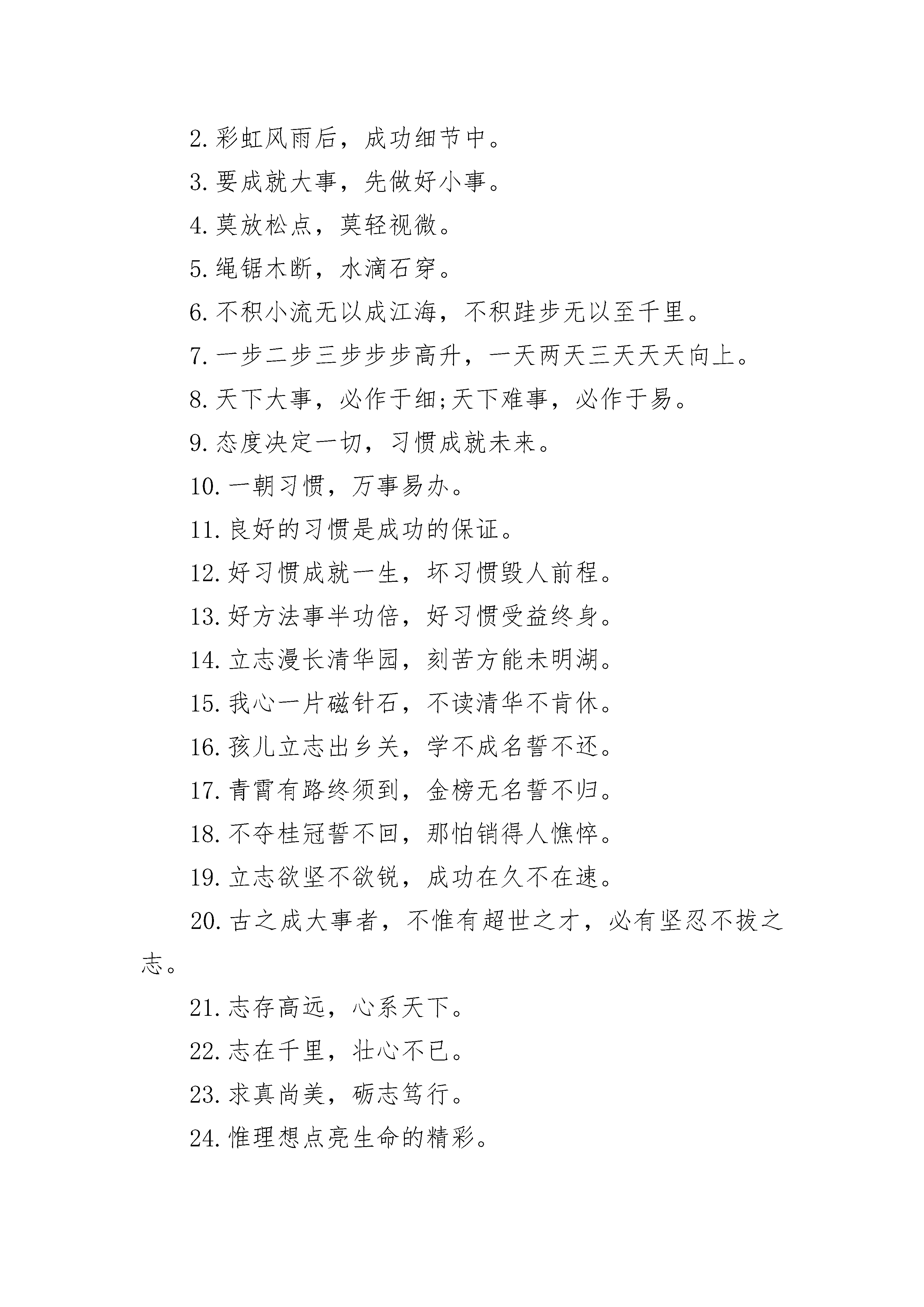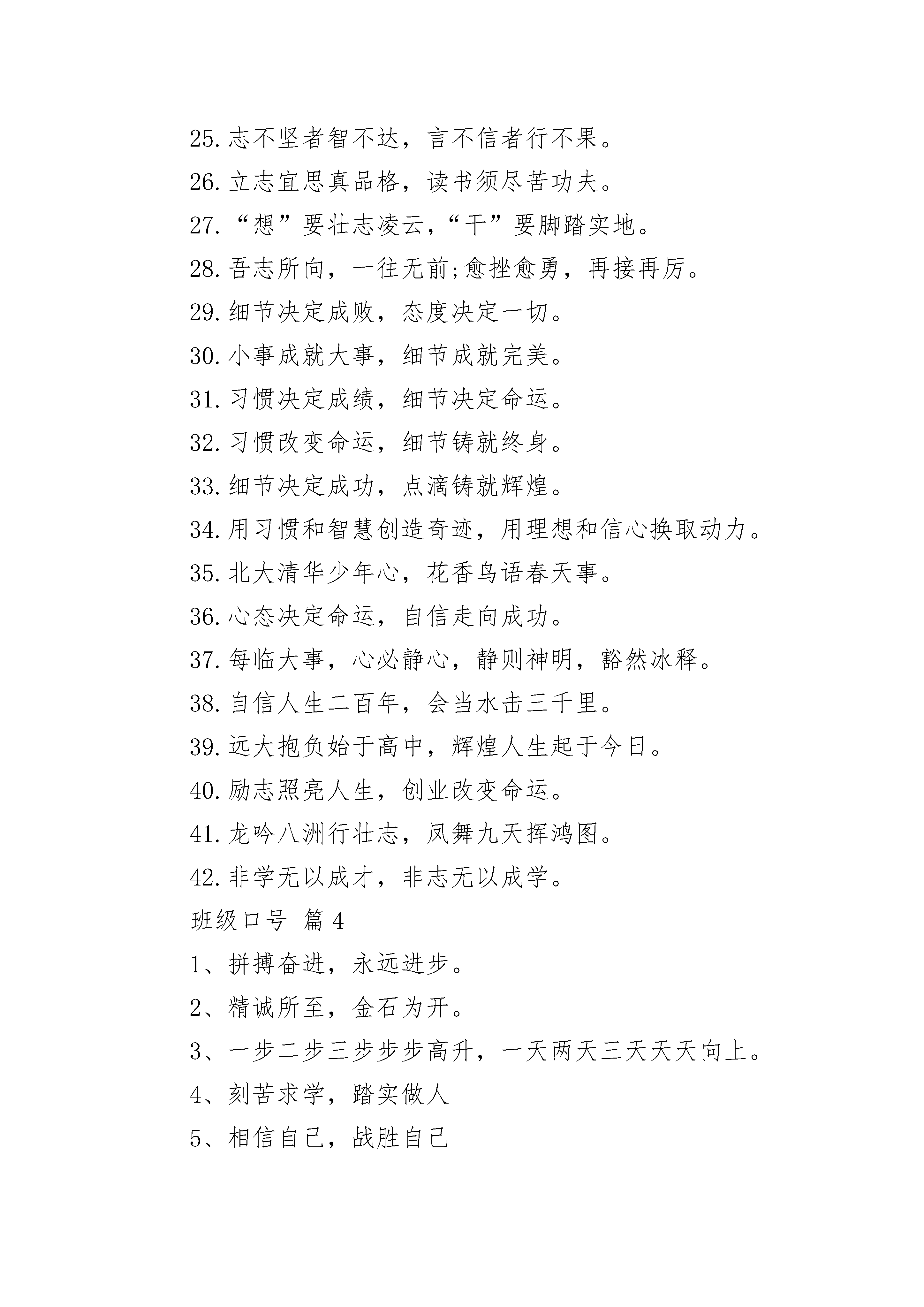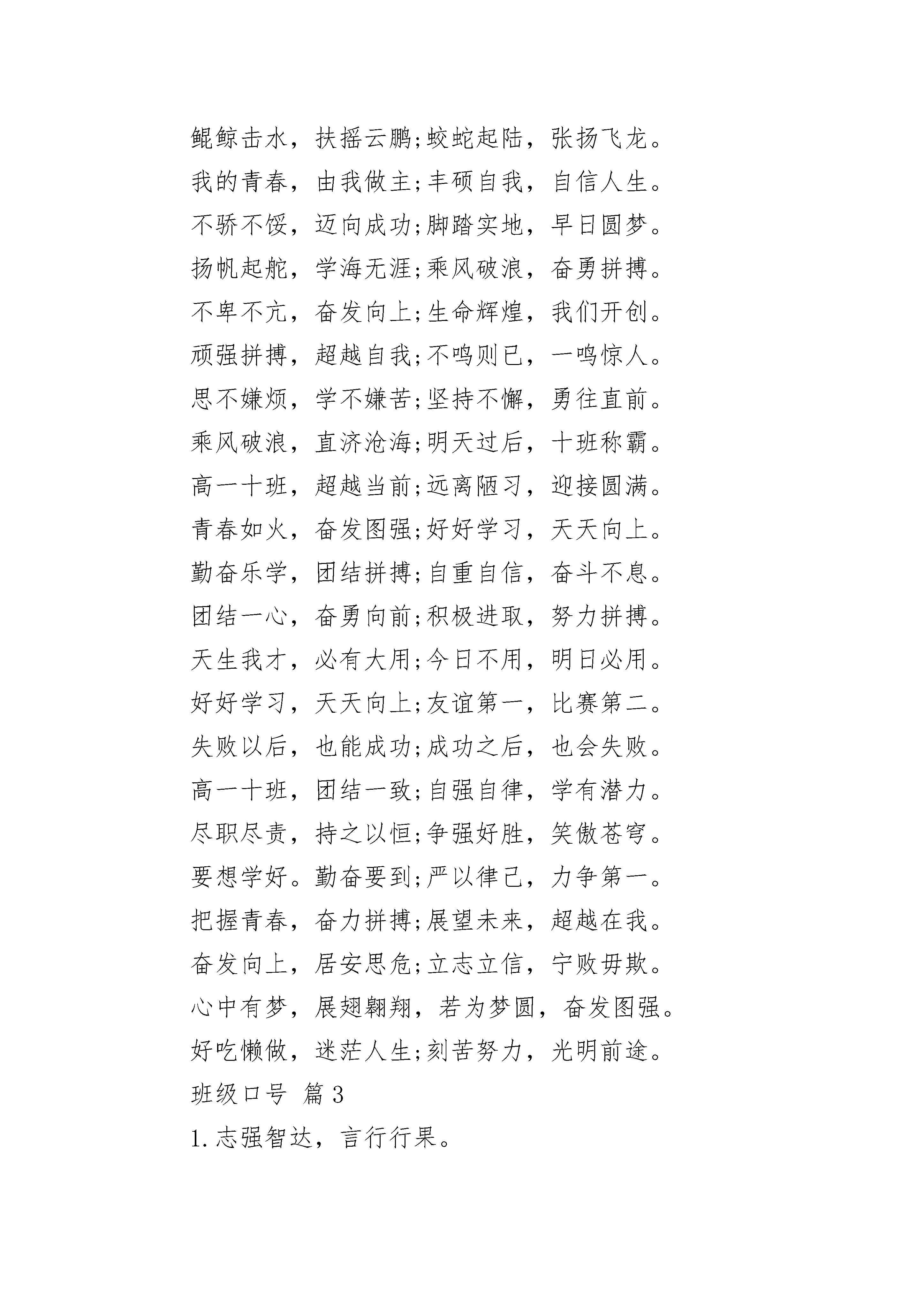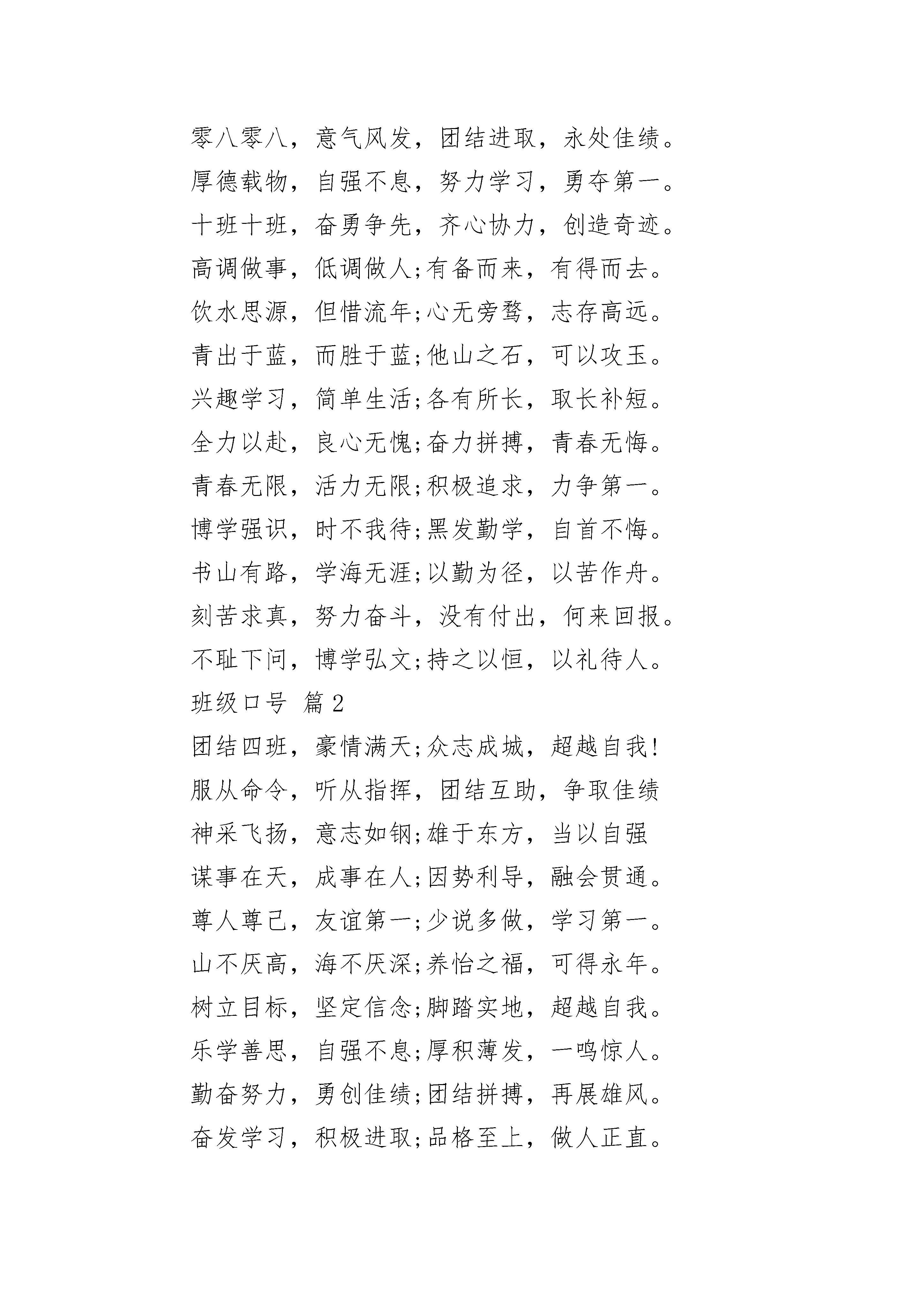 班级口号班级口号(精选17篇)班级口号篇1不耻下问,学以致用;锲而不舍,孜孜不倦。鸟贵有翼,人贵有志;人若立志,万夫莫敌。良药苦口,忠言逆耳;顿开茅塞,补偏救弊。学贵有恒,务实上进;天道酬勤,厚积薄发。勤奋乐学,团结拼搏;自信自律,求实创新。团结一致,奋发拼搏;激扬青春,放飞梦想。人生有限,价值无限;珍爱生命,创造奇迹。追求卓越,不断前进;追求完美,不断突破。互帮互助,团结友爱;疯狂学习,活泼玩耍。好好学习,天天向上;互帮互助,共同进步。真彩青春,活力焕发;勤俭有度,为梦奋发。保定宗旨,砥砺德行;远见卓识,创造辉煌。心志要坚,意趣要乐;输在犹豫,赢在行动。艰苦风斗,铁杵成针;矢志不移,滴水穿石。零二零二,独一无二,激情飞扬,永创辉煌。零三零三,奋勇争先,挑战极限,勇夺桂冠。四班四班,锐不可当,超越自我,再创辉煌。乘风破浪,气宇轩昂,零五有我,共创辉煌。零六零六,卓越优秀,冲刺巅峰,唯我零六。零七零七,披荆斩棘,奋发图强,共创佳绩。零八零八,意气风发,团结进取,永处佳绩。厚德载物,自强不息,努力学习,勇夺第一。十班十班,奋勇争先,齐心协力,创造奇迹。高调做事,低调做人;有备而来,有得而去。饮水思源,但惜流年;心无旁骛,志存高远。青出于蓝,而胜于蓝;他山之石,可以攻玉。兴趣学习,简单生活;各有所长,取长补短。全力以赴,良心无愧;奋力拼搏,青春无悔。青春无限,活力无限;积极追求,力争第一。博学强识,时不我待;黑发勤学,自首不悔。书山有路,学海无涯;以勤为径,以苦作舟。刻苦求真,努力奋斗,没有付出,何来回报。不耻下问,博学弘文;持之以恒,以礼待人。班级口号篇2团结四班,豪情满天;众志成城,超越自我!服从命令,听从指挥,团结互助,争取佳绩神采飞扬,意志如钢;雄于东方,当以自强谋事在天,成事在人;因势利导,融会贯通。尊人尊己,友谊第一;少说多做,学习第一。山不厌高,海不厌深;养怡之福,可得永年。树立目标,坚定信念;脚踏实地,超越自我。乐学善思,自强不息;厚积薄发,一鸣惊人。勤奋努力,勇创佳绩;团结拼搏,再展雄风。奋发学习,积极进取;品格至上,做人正直。鲲鲸击水,扶摇云鹏;蛟蛇起陆,张扬飞龙。我的青春,由我做主;丰硕自我,自信人生。不骄不馁,迈向成功;脚踏实地,早日圆梦。扬帆起舵,学海无涯;乘风破浪,奋勇拼搏。不卑不亢,奋发向上;生命辉煌,我们开创。顽强拼搏,超越自我;不鸣则已,一鸣惊人。思不嫌烦,学不嫌苦;坚持不懈,勇往直前。乘风破浪,直济沧海;明天过后,十班称霸。高一十班,超越当前;远离陋习,迎接圆满。青春如火,奋发图强;好好学习,天天向上。勤奋乐学,团结拼搏;自重自信,奋斗不息。团结一心,奋勇向前;积极进取,努力拼搏。天生我才,必有大用;今日不用,明日必用。好好学习,天天向上;友谊第一,比赛第二。失败以后,也能成功;成功之后,也会失败。高一十班,团结一致;自强自律,学有潜力。尽职尽责,持之以恒;争强好胜,笑傲苍穹。要想学好。勤奋要到;严以律己,力争第一。把握青春,奋力拼搏;展望未来,超越在我。奋发向上,居安思危;立志立信,宁败毋欺。心中有梦,展翅翱翔,若为梦圆,奋发图强。好吃懒做,迷茫人生;刻苦努力,光明前途。班级口号篇31.志强智达,言行行果。2.彩虹风雨后,成功细节中。3.要成就大事,先做好小事。4.莫放松点,莫轻视微。5.绳锯木断,水滴石穿。6.不积小流无以成江海,不积跬步无以至千里。7.一步二步三步步步高升,一天两天三天天天向上。8.天下大事,必作于细;天下难事,必作于易。9.态度决定一切,习惯成就未来。10.一朝习惯,万事易办。11.良好的习惯是成功的保证。12.好习惯成就一生,坏习惯毁人前程。13.好方法事半功倍,好习惯受益终身。14.立志漫长清华园,刻苦方能未明湖。15.我心一片磁针石,不读清华不肯休。16.孩儿立志出乡关,学不成名誓不还。17.青霄有路终须到,金榜无名誓不归。18.不夺桂冠誓不回,那怕销得人憔悴。19.立志欲坚不欲锐,成功在久不在速。20.古之成大事者,不惟有超世之才,必有坚忍不拔之志。21.志存高远,心系天下。22.志在千里,壮心不已。23.求真尚美,砺志笃行。24.惟理想点亮生命的精彩。25.志不坚者智不达,言不信者行不果。26.立志宜思真品格,读书须尽苦功夫。27.“想”要壮志凌云,“干”要脚踏实地。28.吾志所向,一往无前;愈挫愈勇,再接再厉。29.细节决定成败,态度决定一切。30.小事成就大事,细节成就完美。31.习惯决定成绩,细节决定命运。32.习惯改变命运,细节铸就终身。33.细节决定成功,点滴铸就辉煌。34.用习惯和智慧创造奇迹,用理想和信心换取动力。35.北大清华少年心,花香鸟语春天事。36.心态决定命运,自信走向成功。37.每临大事,心必静心,静则神明,豁然冰释。38.自信人生二