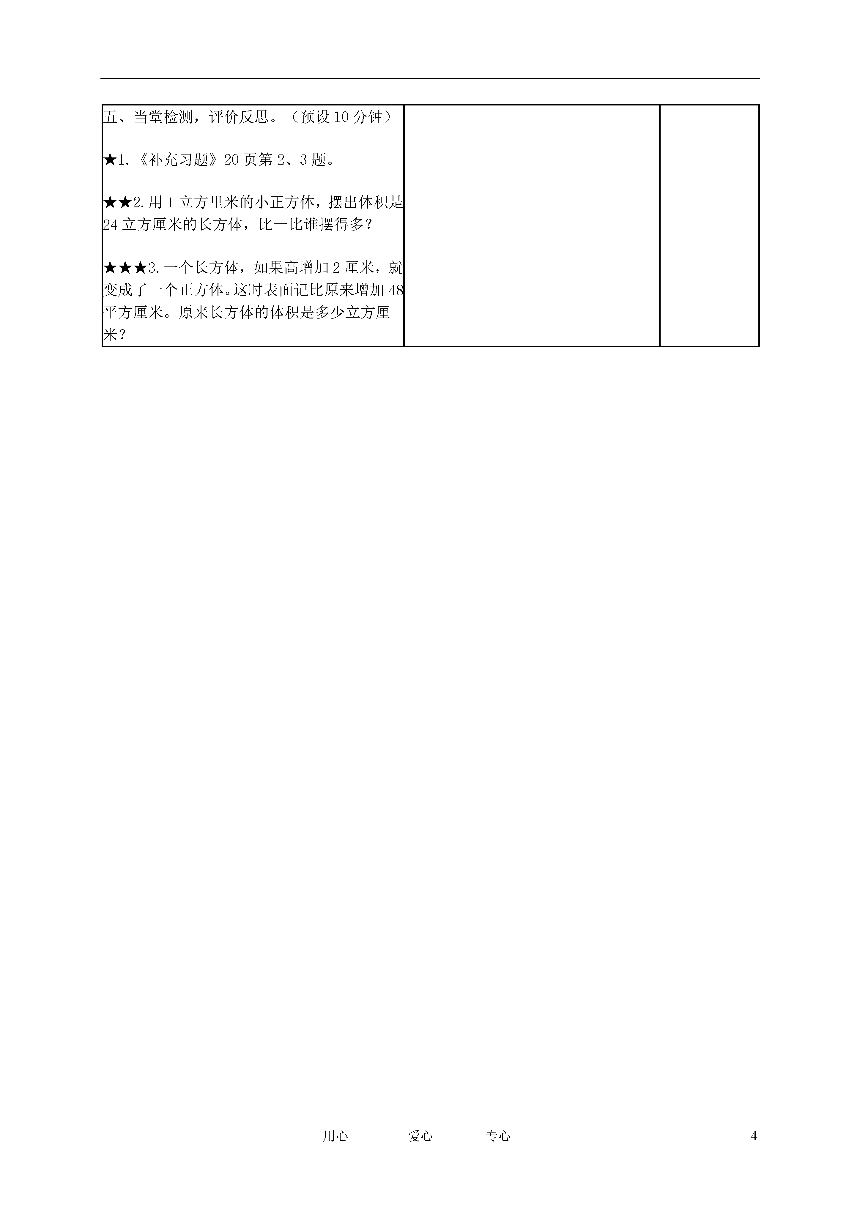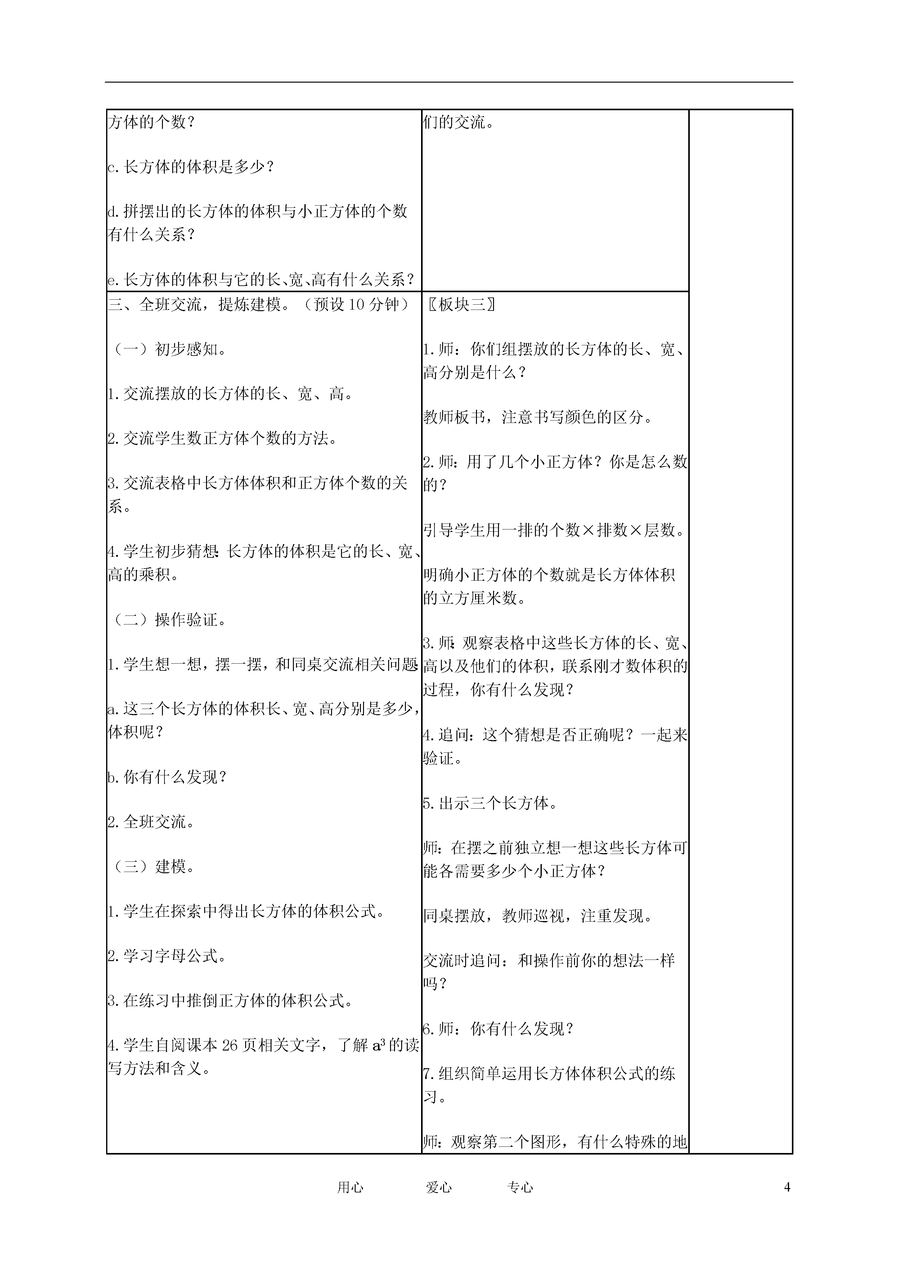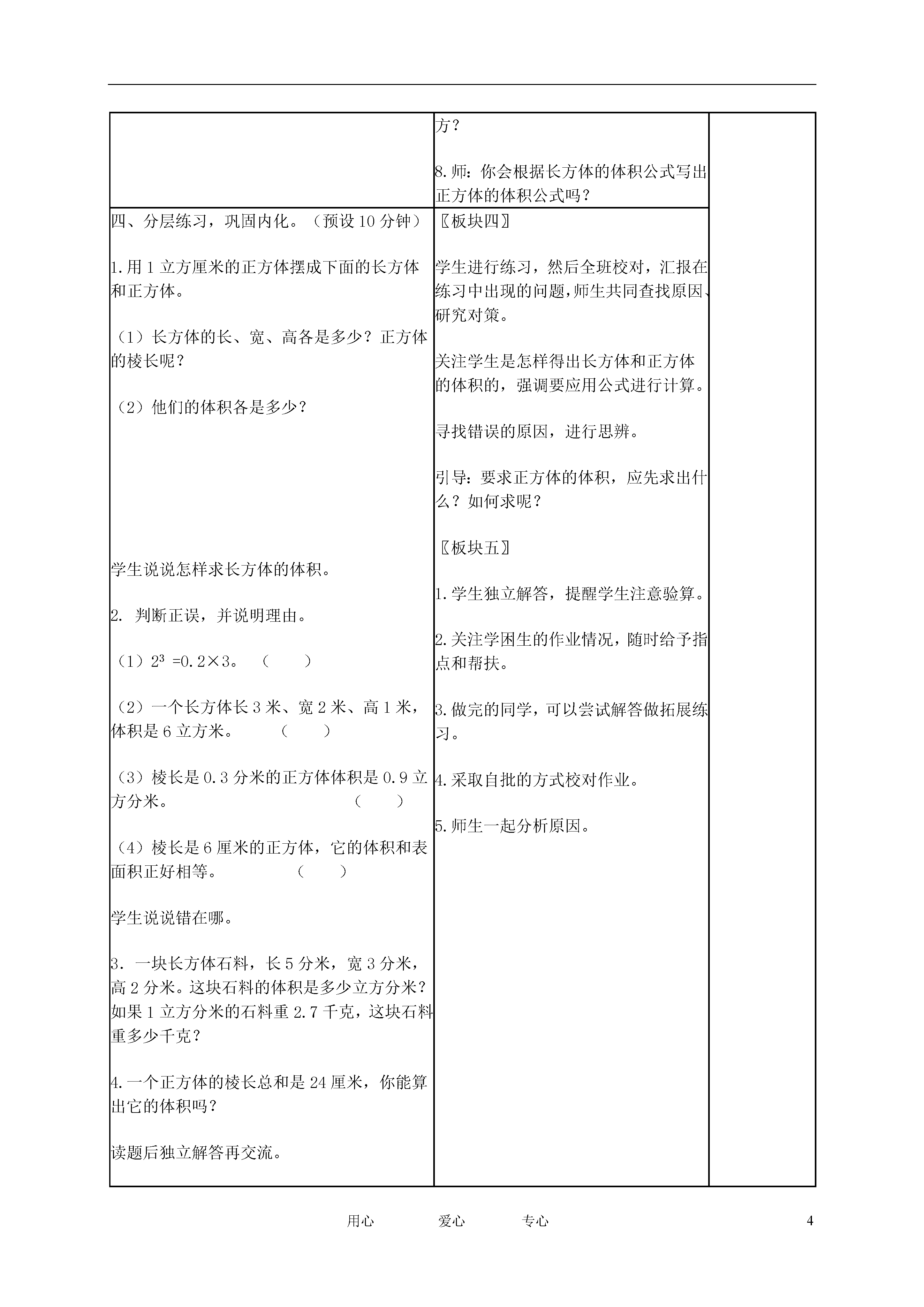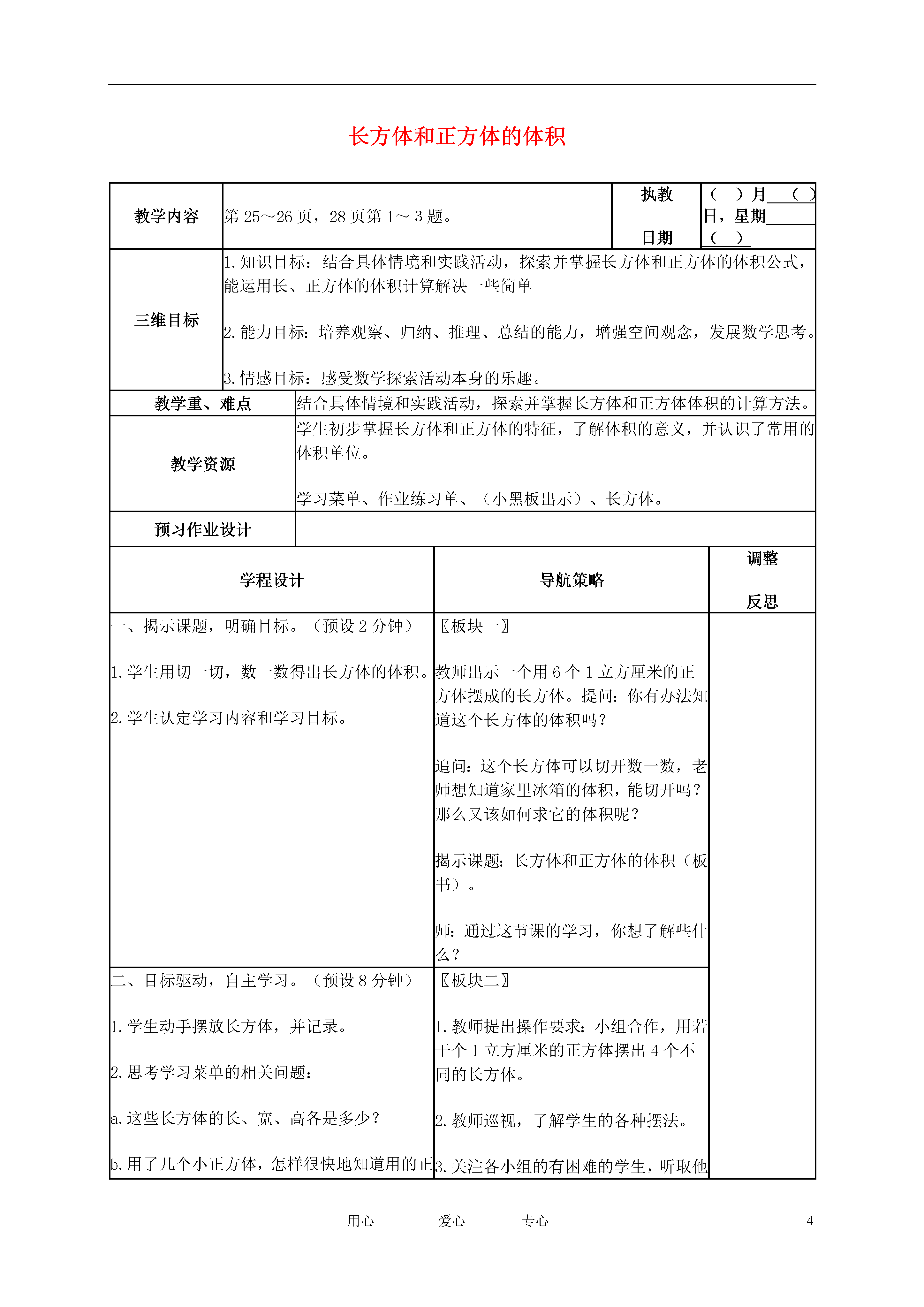 4用心爱心专心长方体和正方体的体积教学内容第25~26页,28页第1~3题。执教日期()月()日,星期()三维目标1.知识目标:结合具体情境和实践活动,探索并掌握长方体和正方体的体积公式,能运用长、正方体的体积计算解决一些简单2.能力目标:培养观察、归纳、推理、总结的能力,增强空间观念,发展数学思考。3.情感目标:感受数学探索活动本身的乐趣。教学重、难点结合具体情境和实践活动,探索并掌握长方体和正方体体积的计算方法。教学资源学生初步掌握长方体和正方体的特征,了解体积的意义,并认识了常用的体积单位。学习菜单、作业练习单、(小黑板出示)、长方体。预习作业设计学程设计导航策略调整反思一、揭示课题,明确目标。(预设2分钟)1.学生用切一切,数一数得出长方体的体积。2.学生认定学习内容和学习目标。〖板块一〗教师出示一个用6个1立方厘米的正方体摆成的长方体。提问:你有办法知道这个长方体的体积吗?追问:这个长方体可以切开数一数,老师想知道家里冰箱的体积,能切开吗?那么又该如何求它的体积呢?揭示课题:长方体和正方体的体积(板书)。师:通过这节课的学习,你想了解些什么?二、目标驱动,自主学习。(预设8分钟)1.学生动手摆放长方体,并记录。2.思考学习菜单的相关问题:a.这些长方体的长、宽、高各是多少?b.用了几个小正方体,怎样很快地知道用的正方体的个数?c.长方体的体积是多少?d.拼摆出的长方体的体积与小正方体的个数有什么关系?e.长方体的体积与它的长、宽、高有什么关系?〖板块二〗1.教师提出操作要求:小组合作,用若干个1立方厘米的正方体摆出4个不同的长方体。2.教师巡视,了解学生的各种摆法。3.关注各小组的有困难的学生,听取他们的交流。三、全班交流,提炼建模。(预设10分钟)(一)初步感知。1.交流摆放的长方体的长、宽、高。2.交流学生数正方体个数的方法。3.交流表格中长方体体积和正方体个数的关系。4.学生初步猜想:长方体的体积是它的长、宽、高的乘积。(二)操作验证。1.学生想一想,摆一摆,和同桌交流相关问题:a.这三个长方体的体积长、宽、高分别是多少,体积呢?b.你有什么发现?2.全班交流。(三)建模。1.学生在探索中得出长方体的体积公式。2.学习字母公式。3.在练习中推倒正方体的体积公式。4.学生自阅课本26页相关文字,了解a3的读写方法和含义。〖板块三〗1.师:你们组摆放的长方体的长、宽、高分别是什么?教师板书,注意书写颜色的区分。2.师:用了几个小正方体?你是怎么数的?引导学生用一排的个数×排数×层数。明确小正方体的个数就是长方体体积的立方厘米数。3.师:观察表格中这些长方体的长、宽、高以及他们的体积,联系刚才数体积的过程,你有什么发现?4.追问:这个猜想是否正确呢?一起来验证。5.出示三个长方体。师:在摆之前独立想一想这些长方体可能各需要多少个小正方体?同桌摆放,教师巡视,注重发现。交流时追问:和操作前你的想法一样吗?6.师:你有什么发现?7.组织简单运用长方体体积公式的练习。师:观察第二个图形,有什么特殊的地方?8.师:你会根据长方体的体积公式写出正方体的体积公式吗?四、分层练习,巩固内化。(预设10分钟)1.用1立方厘米的正方体摆成下面的长方体和正方体。(1)长方体的长、宽、高各是多少?正方体的棱长呢?(2)他们的体积各是多少?学生说说怎样求长方体的体积。2.判断正误,并说明理由。(1)23=0.2×3。()(2)一个长方体长3米、宽2米、高1米,体积是6立方米。()(3)棱长是0.3分米的正方体体积是0.9立方分米。()(4)棱长是6厘米的正方体,它的体积和表面积正好相等。()学生说说错在哪。3.一块长方体石料,长5分米,宽3分米,高2分米。这块石料的体积是多少立方分米?如果1立方分米的石料重2.7千克,这块石料重多少千克?4.一个正方体的棱长总和是24厘米,你能算出它的体积吗?读题后独立解答再交流。五、当堂检测,评价反思。(预设10分钟)★1.《补充习题》20页第2、3题。★★2.用1立方里米的小正方体,摆出体积是24立方厘米的长方体,比一比谁摆得多?★★★3.一个长方体,如果高增加2厘米,就变成了一个正方体。这时表面记比原来增加48平方厘米。原来长方体的体积是多少立方厘米?〖板块四〗学生进行练习,然后全班校对,汇报在练习中出现的问题,师生共同查找原因、研究对策。关注学生是怎样得出长方体和正方体的体积的,强调要应用公式进行计算。寻找错误的原因,进行思辨。引导:要求正方体的体积,应先求出什么?如何求