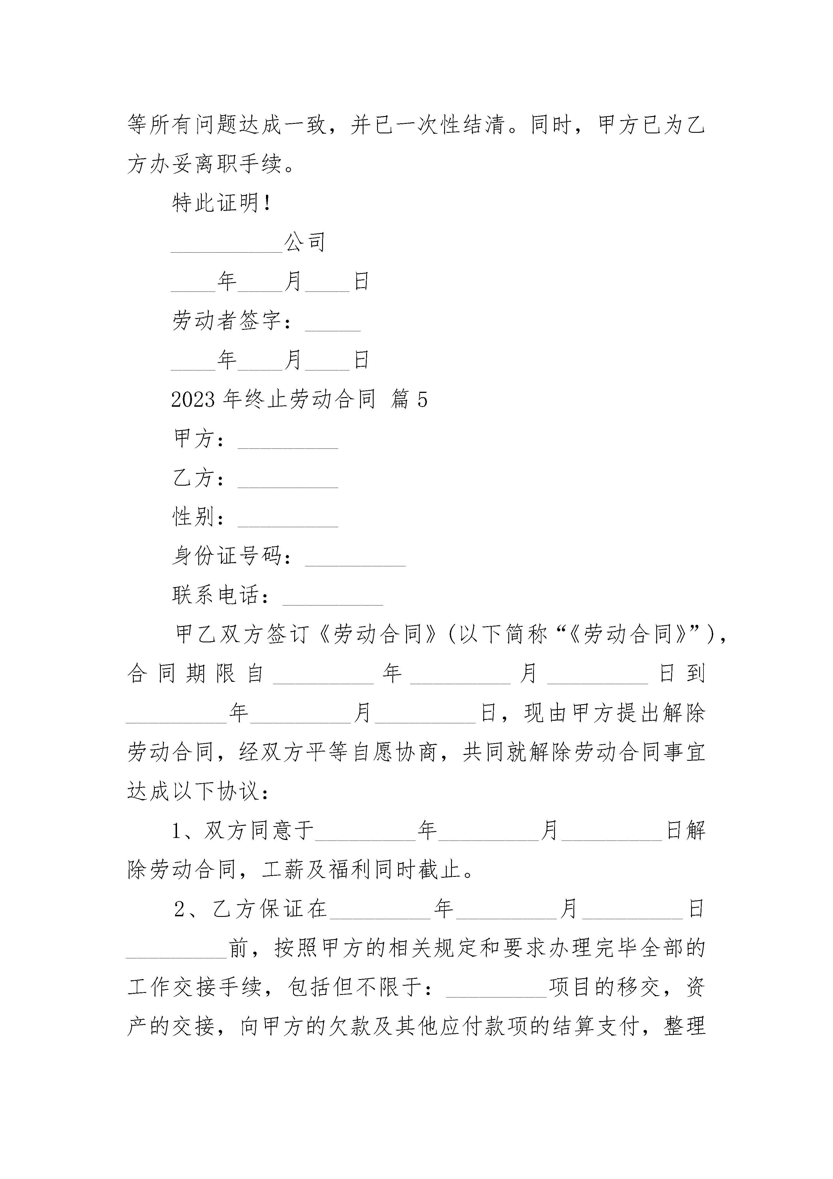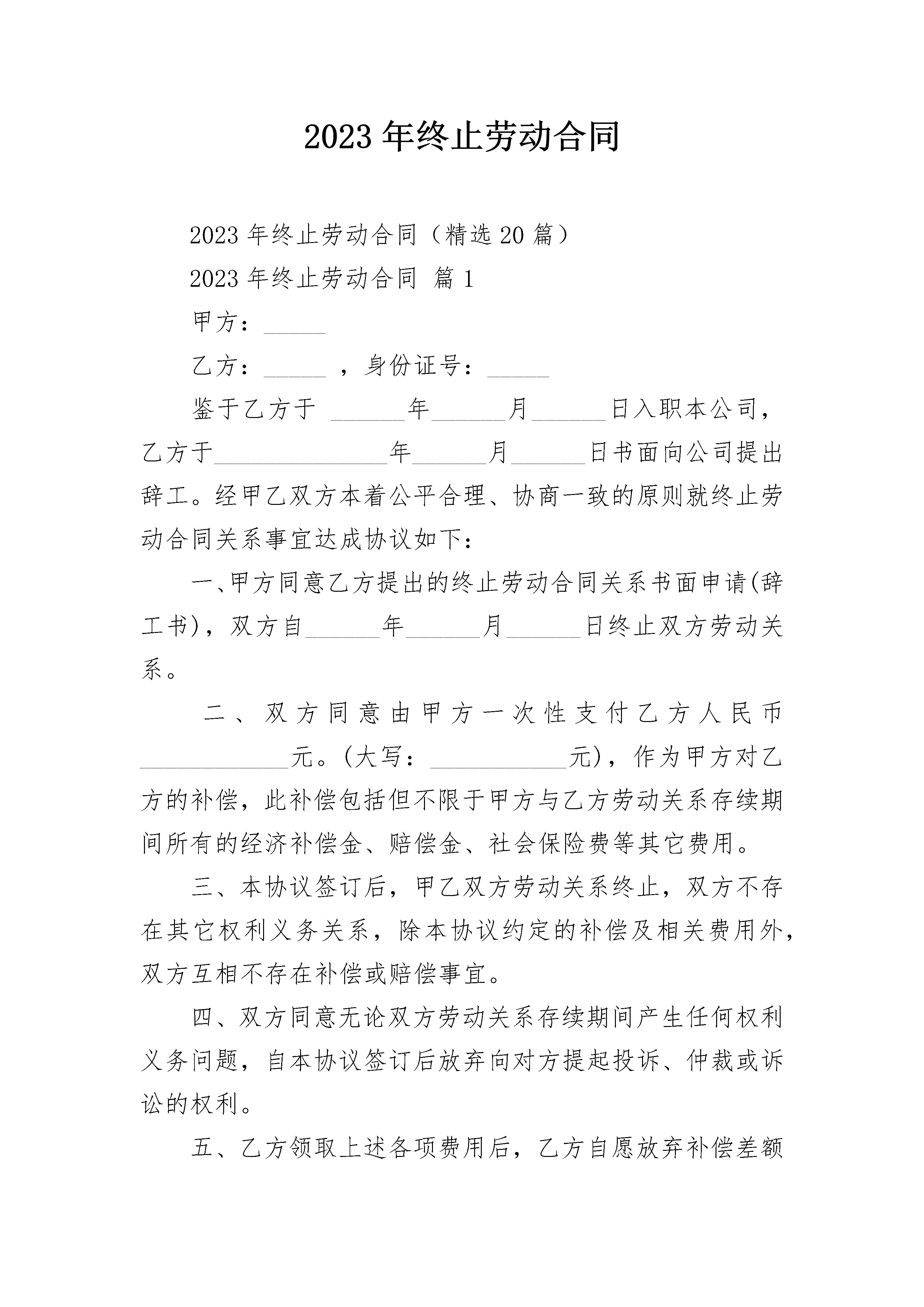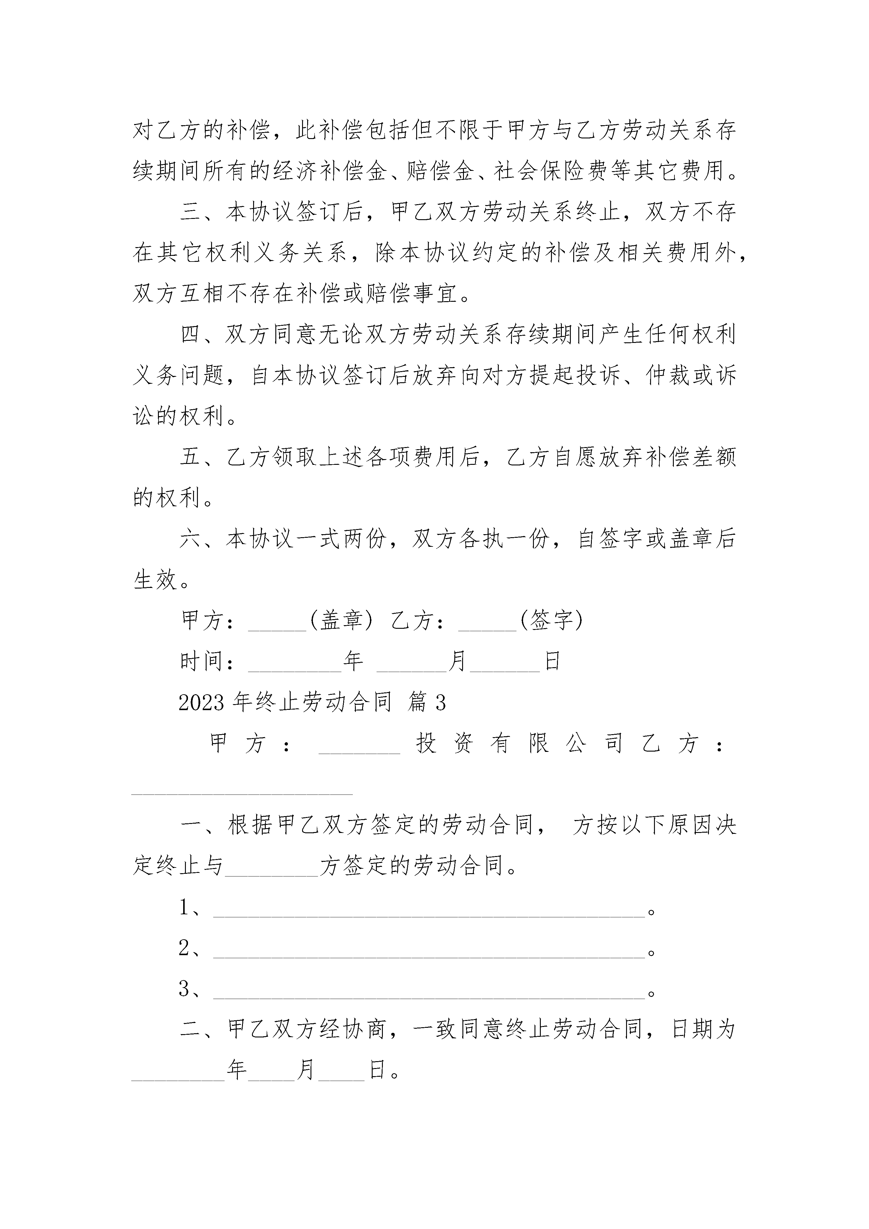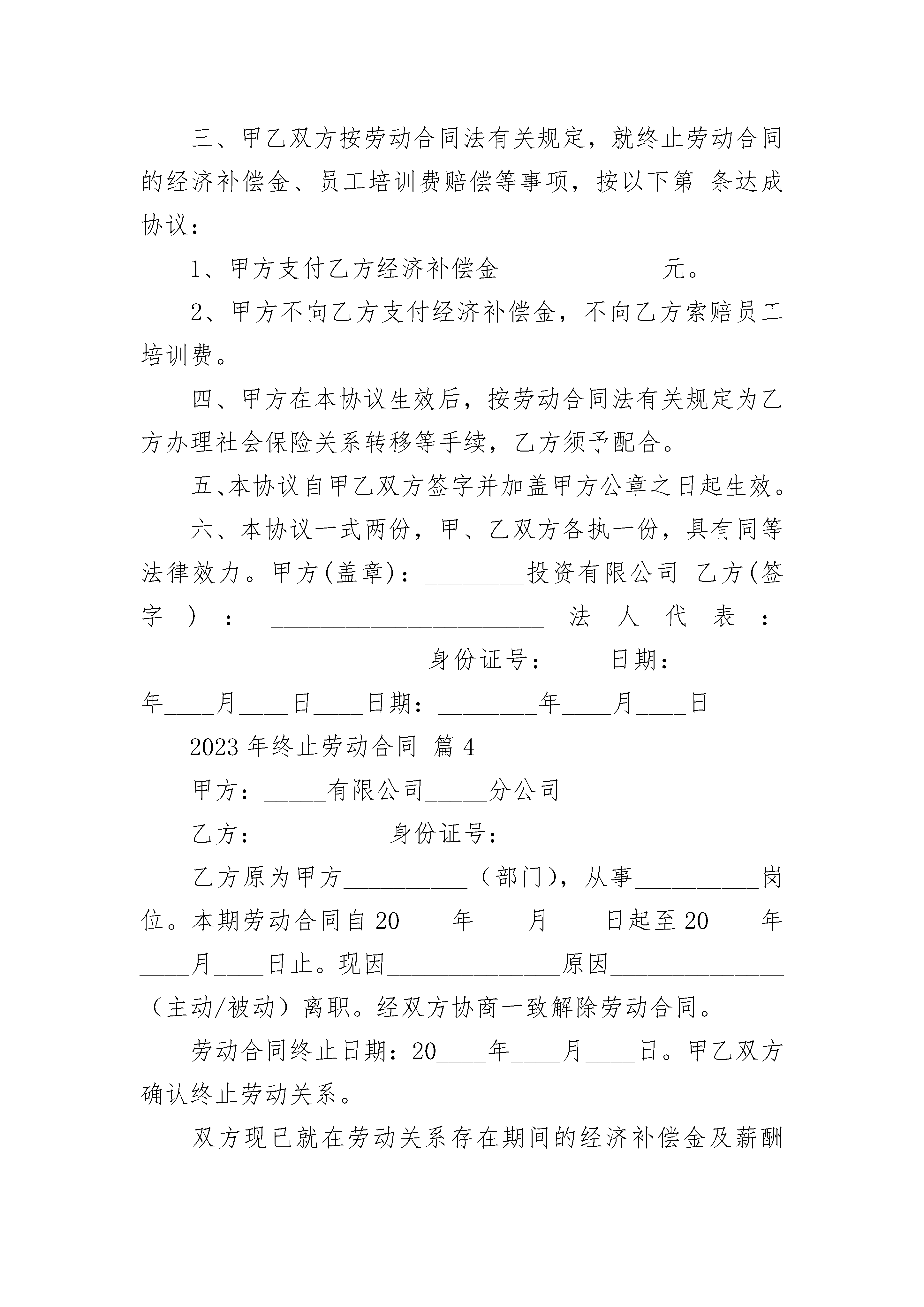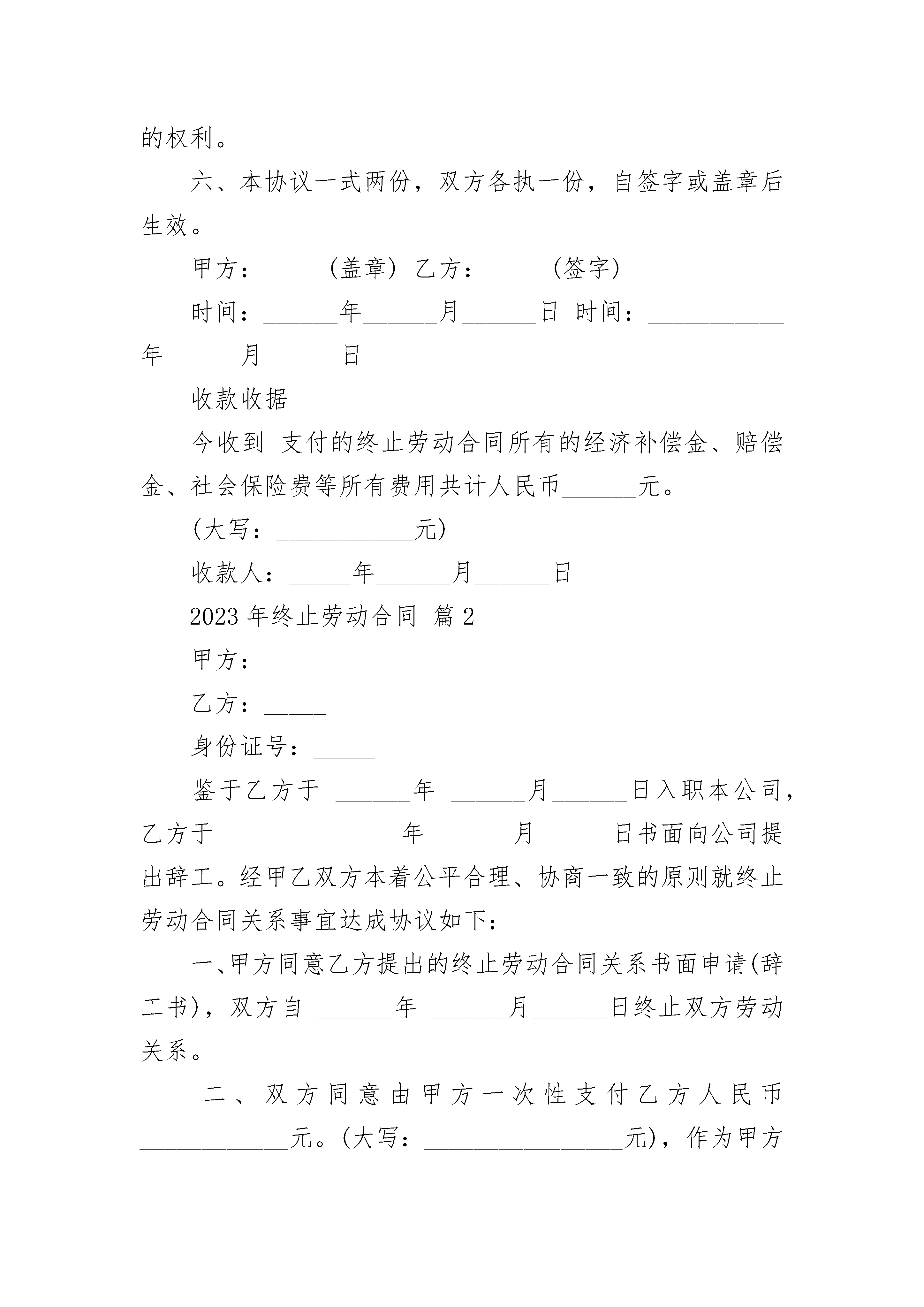 2023年终止劳动合同2023年终止劳动合同(精选20篇)2023年终止劳动合同篇1甲方:_____乙方:_____,身份证号:_____鉴于乙方于______年______月______日入职本公司,乙方于______________年______月______日书面向公司提出辞工。经甲乙双方本着公平合理、协商一致的原则就终止劳动合同关系事宜达成协议如下:一、甲方同意乙方提出的终止劳动合同关系书面申请(辞工书),双方自______年______月______日终止双方劳动关系。二、双方同意由甲方一次性支付乙方人民币____________元。(大写:___________元),作为甲方对乙方的补偿,此补偿包括但不限于甲方与乙方劳动关系存续期间所有的经济补偿金、赔偿金、社会保险费等其它费用。三、本协议签订后,甲乙双方劳动关系终止,双方不存在其它权利义务关系,除本协议约定的补偿及相关费用外,双方互相不存在补偿或赔偿事宜。四、双方同意无论双方劳动关系存续期间产生任何权利义务问题,自本协议签订后放弃向对方提起投诉、仲裁或诉讼的权利。五、乙方领取上述各项费用后,乙方自愿放弃补偿差额的权利。六、本协议一式两份,双方各执一份,自签字或盖章后生效。甲方:_____(盖章)乙方:_____(签字)时间:______年______月______日时间:___________年______月______日收款收据今收到支付的终止劳动合同所有的经济补偿金、赔偿金、社会保险费等所有费用共计人民币______元。(大写:___________元)收款人:_____年______月______日2023年终止劳动合同篇2甲方:_____乙方:_____身份证号:_____鉴于乙方于______年______月______日入职本公司,乙方于______________年______月______日书面向公司提出辞工。经甲乙双方本着公平合理、协商一致的原则就终止劳动合同关系事宜达成协议如下:一、甲方同意乙方提出的终止劳动合同关系书面申请(辞工书),双方自______年______月______日终止双方劳动关系。二、双方同意由甲方一次性支付乙方人民币____________元。(大写:________________元),作为甲方对乙方的补偿,此补偿包括但不限于甲方与乙方劳动关系存续期间所有的经济补偿金、赔偿金、社会保险费等其它费用。三、本协议签订后,甲乙双方劳动关系终止,双方不存在其它权利义务关系,除本协议约定的补偿及相关费用外,双方互相不存在补偿或赔偿事宜。四、双方同意无论双方劳动关系存续期间产生任何权利义务问题,自本协议签订后放弃向对方提起投诉、仲裁或诉讼的权利。五、乙方领取上述各项费用后,乙方自愿放弃补偿差额的权利。六、本协议一式两份,双方各执一份,自签字或盖章后生效。甲方:_____(盖章)乙方:_____(签字)时间:________年______月______日2023年终止劳动合同篇3甲方:_______投资有限公司乙方:___________________一、根据甲乙双方签定的劳动合同,方按以下原因决定终止与________方签定的劳动合同。1、_____________________________________。2、_____________________________________。3、_____________________________________。二、甲乙双方经协商,一致同意终止劳动合同,日期为________年____月____日。三、甲乙双方按劳动合同法有关规定,就终止劳动合同的经济补偿金、员工培训费赔偿等事项,按以下第条达成协议:1、甲方支付乙方经济补偿金_____________元。2、甲方不向乙方支付经济补偿金,不向乙方索赔员工培训费。四、甲方在本协议生效后,按劳动合同法有关规定为乙方办理社会保险关系转移等手续,乙方须予配合。五、本协议自甲乙双方签字并加盖甲方公章之日起生效。六、本协议一式两份,甲、乙双方各执一份,具有同等法律效力。甲方(盖章):________投资有限公司乙方(签字):______________________法人代表:______________________身份证号:____日期:________年____月____日____日期:________年____月____日2023年终止劳动合同篇4甲方:_____有限公司_____分公司乙方:__________身份证号:__________乙方原为甲方__________(部门),从事__________岗位。本期劳动合同自20____年____月____日起至20____年____月____日止。现因________