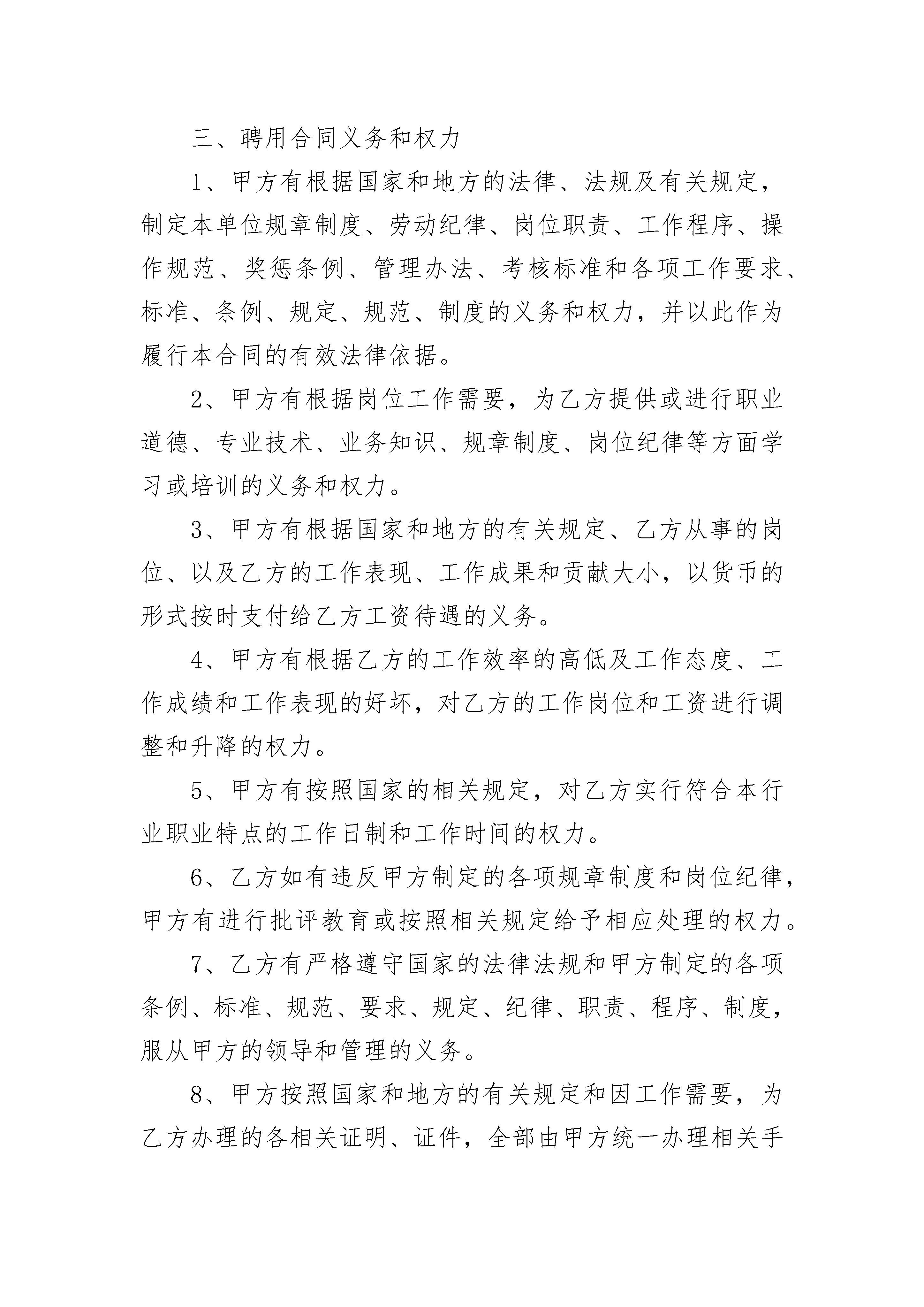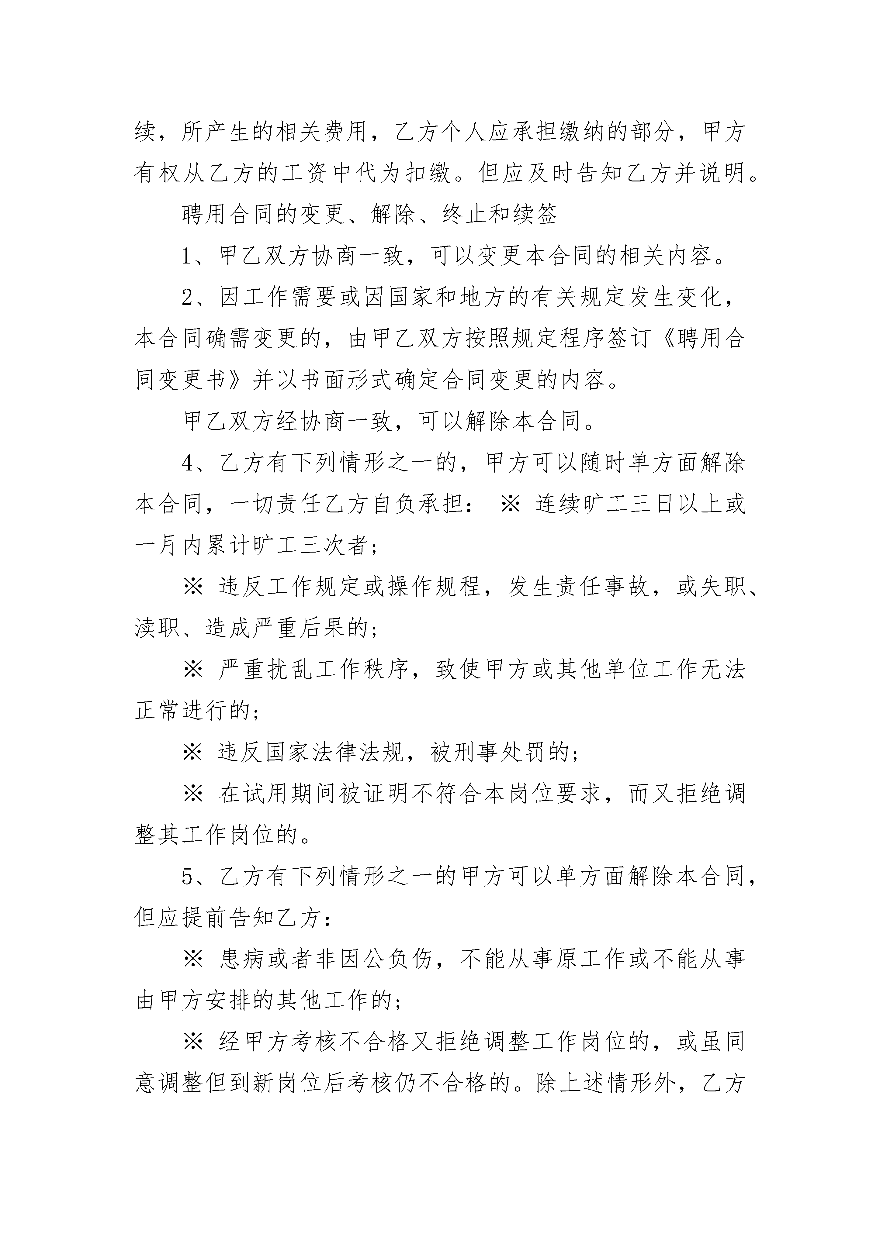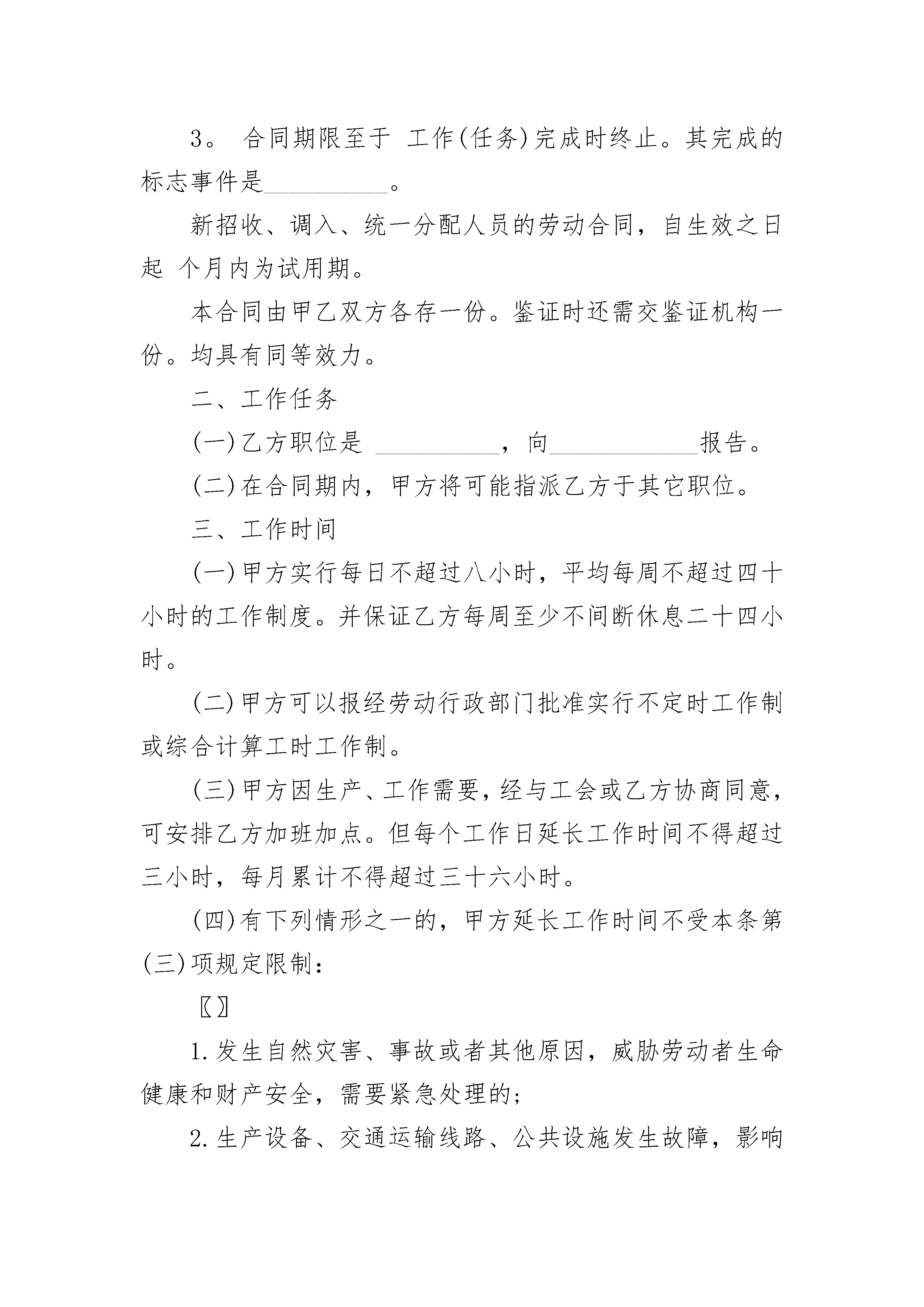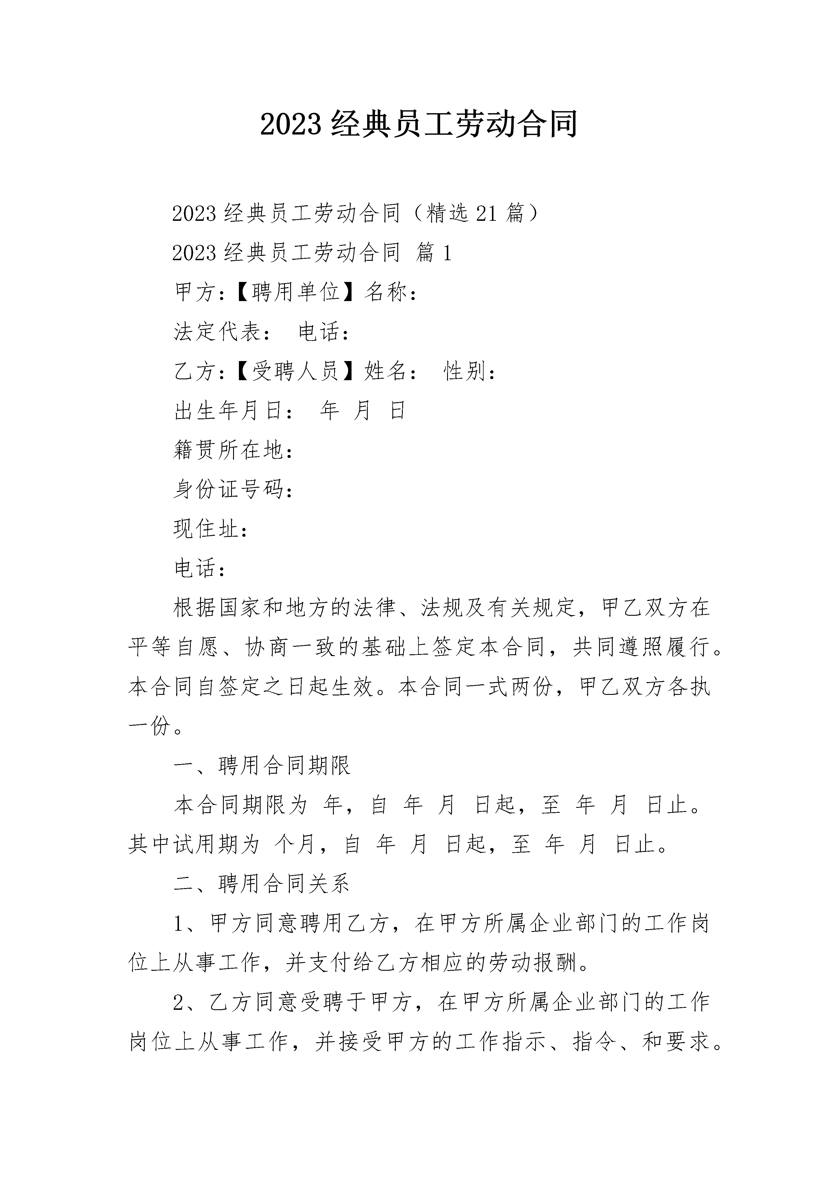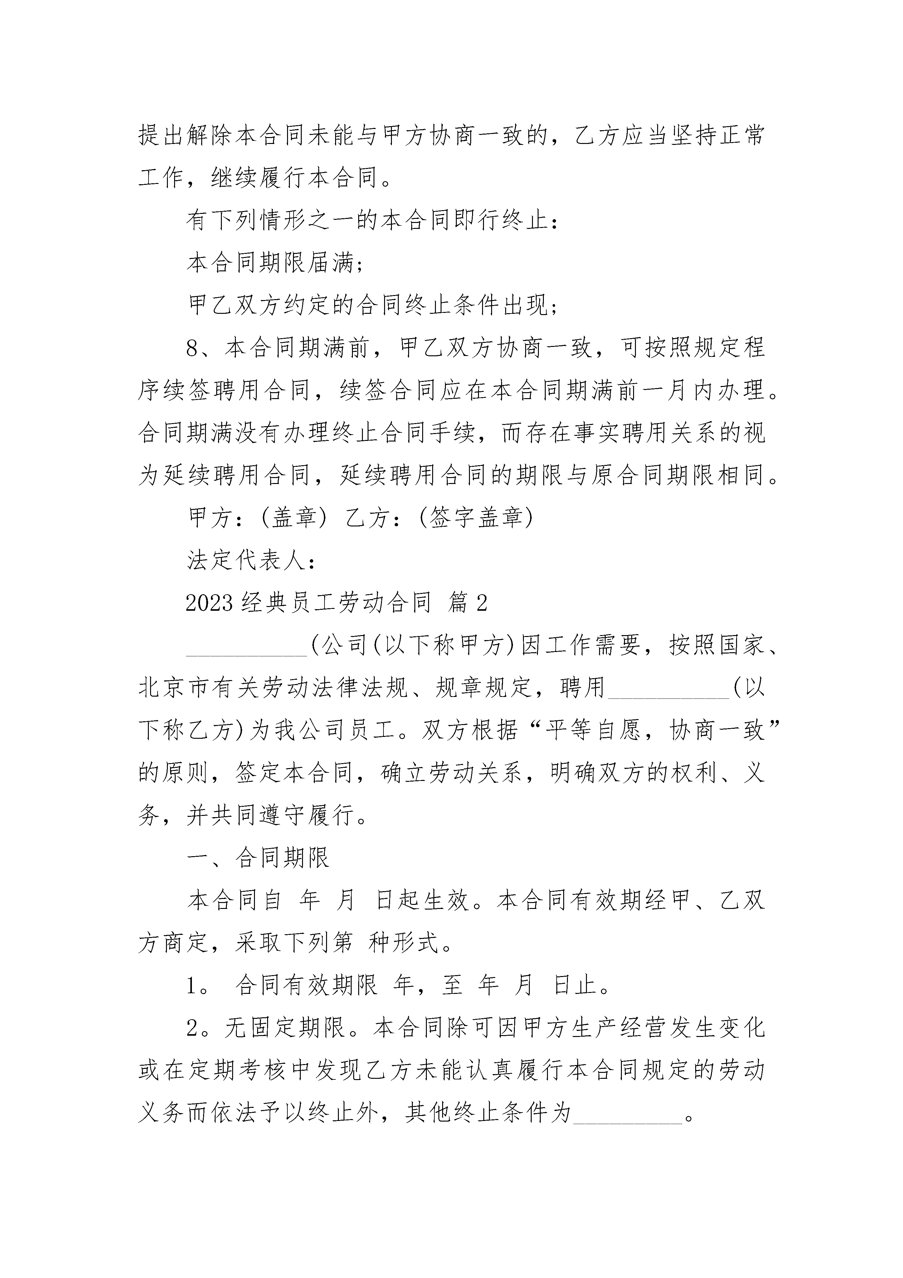 2023经典员工劳动合同2023经典员工劳动合同(精选21篇)2023经典员工劳动合同篇1甲方:【聘用单位】名称:法定代表:电话:乙方:【受聘人员】姓名:性别:出生年月日:年月日籍贯所在地:身份证号码:现住址:电话:根据国家和地方的法律、法规及有关规定,甲乙双方在平等自愿、协商一致的基础上签定本合同,共同遵照履行。本合同自签定之日起生效。本合同一式两份,甲乙双方各执一份。一、聘用合同期限本合同期限为年,自年月日起,至年月日止。其中试用期为个月,自年月日起,至年月日止。二、聘用合同关系1、甲方同意聘用乙方,在甲方所属企业部门的工作岗位上从事工作,并支付给乙方相应的劳动报酬。2、乙方同意受聘于甲方,在甲方所属企业部门的工作岗位上从事工作,并接受甲方的工作指示、指令、和要求。三、聘用合同义务和权力1、甲方有根据国家和地方的法律、法规及有关规定,制定本单位规章制度、劳动纪律、岗位职责、工作程序、操作规范、奖惩条例、管理办法、考核标准和各项工作要求、标准、条例、规定、规范、制度的义务和权力,并以此作为履行本合同的有效法律依据。2、甲方有根据岗位工作需要,为乙方提供或进行职业道德、专业技术、业务知识、规章制度、岗位纪律等方面学习或培训的义务和权力。3、甲方有根据国家和地方的有关规定、乙方从事的岗位、以及乙方的工作表现、工作成果和贡献大小,以货币的形式按时支付给乙方工资待遇的义务。4、甲方有根据乙方的工作效率的高低及工作态度、工作成绩和工作表现的好坏,对乙方的工作岗位和工资进行调整和升降的权力。5、甲方有按照国家的相关规定,对乙方实行符合本行业职业特点的工作日制和工作时间的权力。6、乙方如有违反甲方制定的各项规章制度和岗位纪律,甲方有进行批评教育或按照相关规定给予相应处理的权力。7、乙方有严格遵守国家的法律法规和甲方制定的各项条例、标准、规范、要求、规定、纪律、职责、程序、制度,服从甲方的领导和管理的义务。8、甲方按照国家和地方的有关规定和因工作需要,为乙方办理的各相关证明、证件,全部由甲方统一办理相关手续,所产生的相关费用,乙方个人应承担缴纳的部分,甲方有权从乙方的工资中代为扣缴。但应及时告知乙方并说明。聘用合同的变更、解除、终止和续签1、甲乙双方协商一致,可以变更本合同的相关内容。2、因工作需要或因国家和地方的有关规定发生变化,本合同确需变更的,由甲乙双方按照规定程序签订《聘用合同变更书》并以书面形式确定合同变更的内容。甲乙双方经协商一致,可以解除本合同。4、乙方有下列情形之一的,甲方可以随时单方面解除本合同,一切责任乙方自负承担:※连续旷工三日以上或一月内累计旷工三次者;※违反工作规定或操作规程,发生责任事故,或失职、渎职、造成严重后果的;※严重扰乱工作秩序,致使甲方或其他单位工作无法正常进行的;※违反国家法律法规,被刑事处罚的;※在试用期间被证明不符合本岗位要求,而又拒绝调整其工作岗位的。5、乙方有下列情形之一的甲方可以单方面解除本合同,但应提前告知乙方:※患病或者非因公负伤,不能从事原工作或不能从事由甲方安排的其他工作的;※经甲方考核不合格又拒绝调整工作岗位的,或虽同意调整但到新岗位后考核仍不合格的。除上述情形外,乙方提出解除本合同未能与甲方协商一致的,乙方应当坚持正常工作,继续履行本合同。有下列情形之一的本合同即行终止:本合同期限届满;甲乙双方约定的合同终止条件出现;8、本合同期满前,甲乙双方协商一致,可按照规定程序续签聘用合同,续签合同应在本合同期满前一月内办理。合同期满没有办理终止合同手续,而存在事实聘用关系的视为延续聘用合同,延续聘用合同的期限与原合同期限相同。甲方:(盖章)乙方:(签字盖章)法定代表人:2023经典员工劳动合同篇2__________(公司(以下称甲方)因工作需要,按照国家、北京市有关劳动法律法规、规章规定,聘用__________(以下称乙方)为我公司员工。双方根据“平等自愿,协商一致”的原则,签定本合同,确立劳动关系,明确双方的权利、义务,并共同遵守履行。一、合同期限本合同自年月日起生效。本合同有效期经甲、乙双方商定,采取下列第种形式。1。合同有效期限年,至年月日止。2。无固定期限。本合同除可因甲方生产经营发生变化或在定期考核中发现乙方未能认真履行本合同规定的劳动义务而依法予以终止外,其他终止条件为_________。3。合同期限至于工作(任务)完成时终止。其完成的标志事件是__________。新招收、调入、统一分配人员的劳动合同,自生效之日起个月内为试用期。本合同由甲乙双方各存一份。鉴证时还需交鉴证机构一份。均具有同等效力。二、工作任务(一)乙方职位是__________,向____________报告。(二)在合同期内,甲方将可能指派乙方于其它职位。三、工作时间(一)甲方实行每日不超过八小时
