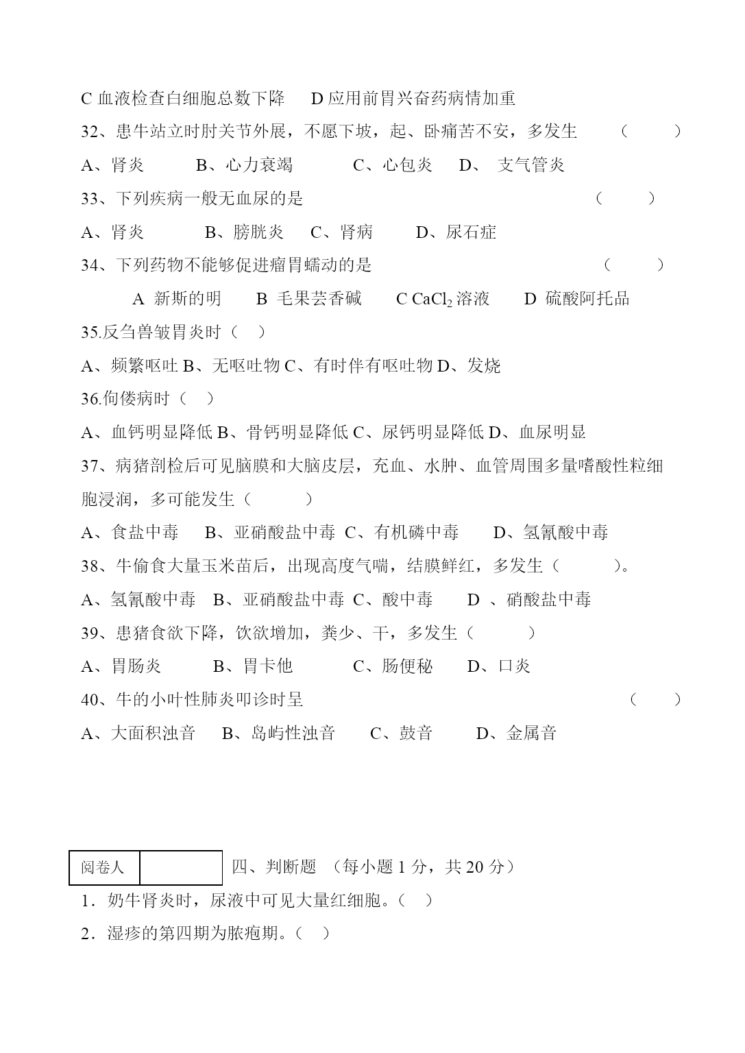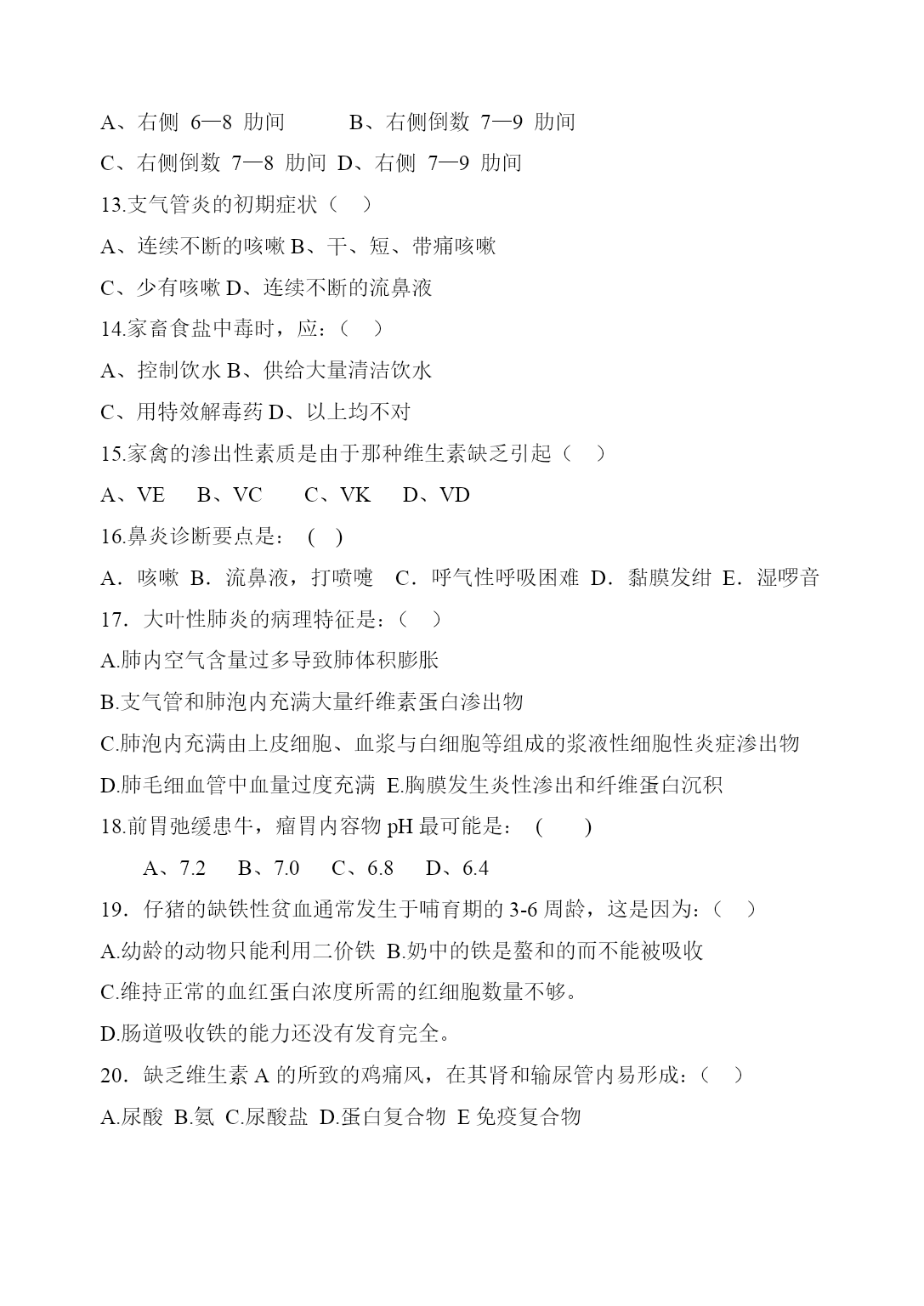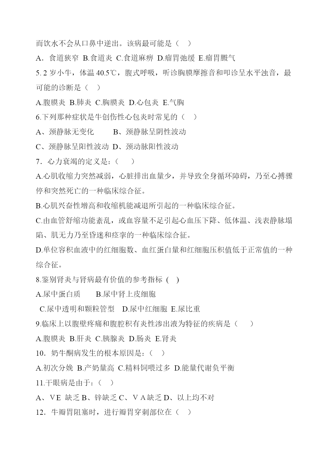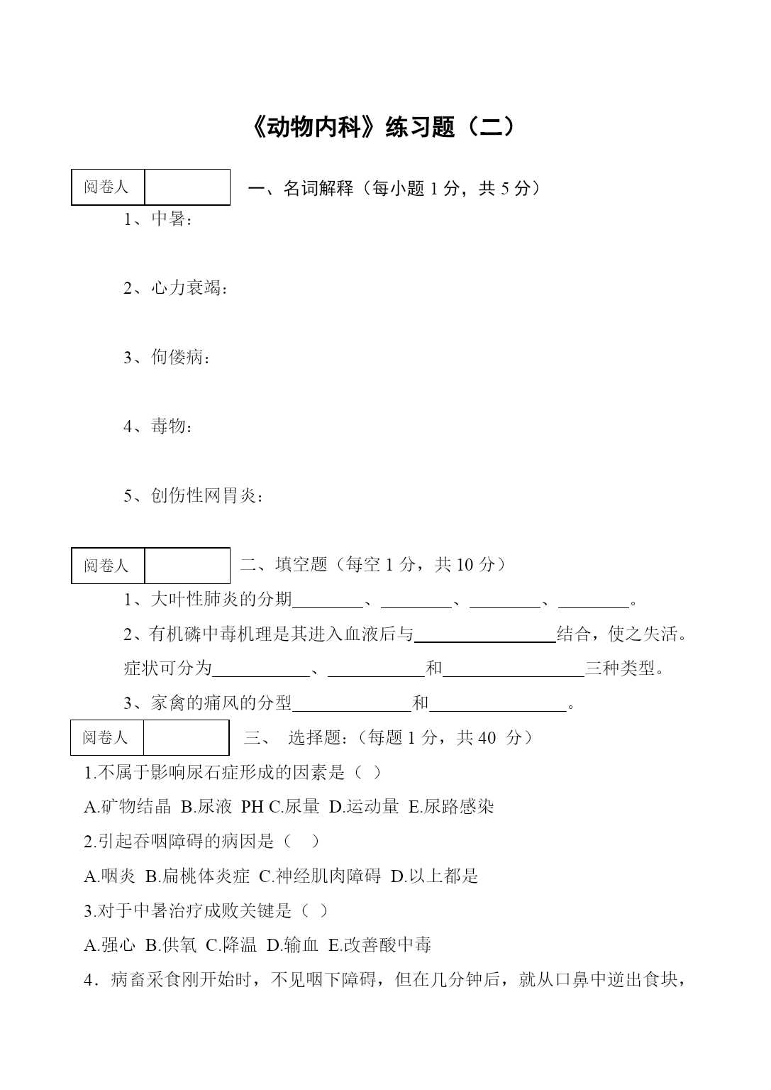 《动物内科》练习题(二)阅卷人一、名词解释一、名词解释(每小题1分,共5分)1、中暑:2、心力衰竭:3、佝偻病:4、毒物:5、创伤性网胃炎:阅卷人二、填空题(二、填空题(每空1分,共10分)1、大叶性肺炎的分期、、、。2、有机磷中毒机理是其进入血液后与结合,使之失活。症状可分为、和三种类型。3、家禽的痛风的分型和。阅卷人三、选择题:(每题1分,共40分)1.不属于影响尿石症形成的因素是()A.矿物结晶B.尿液PHC.尿量D.运动量E.尿路感染2.引起吞咽障碍的病因是()A.咽炎B.扁桃体炎症C.神经肌肉障碍D.以上都是3.对于中暑治疗成败关键是()A.强心B.供氧C.降温D.输血E.改善酸中毒4.病畜采食刚开始时,不见咽下障碍,但在几分钟后,就从口鼻中逆出食块,而饮水不会从口鼻中逆出。该病最可能是()A.食道狭窄B.食道炎C.食道麻痹D.瘤胃弛缓E.瘤胃臌气5.2岁小牛,体温40.5℃,腹式呼吸,听诊胸膜摩擦音和叩诊呈水平浊音,最可能的诊断是()A.腹膜炎B.肺炎C.胸膜炎D.心包炎E.气胸6.下列那种症状是牛创伤性心包炎时常见的()A、颈静脉无变化B、颈静脉呈阴性波动C、颈静脉呈阳性波动D、颈动脉阳性波动7.心力衰竭的定义是:()A.心肌收缩力突然减弱,心脏排出血量少,并导致全身循环障碍,乃至心搏骤停和突然死亡的一种临床综合征。B.心肌兴奋性增高和收缩机能减退所引起的一种临床综合征。C.由血管舒缩功能紊乱,或血容量不足引起心血压下降、低体温、浅表静脉塌陷、肌无力乃至昏迷和痉挛的一种临床综合征。D.单位容积血液中的红细胞数、血红蛋白量和红细胞压积值低于正常值的一种综合征。8.鉴别肾炎与肾病最有价值的参考指标()A.尿中蛋白质B.尿中肾上皮细胞C.尿中透明和颗粒管型D.尿中红细胞E.尿比重9.临床上以腹壁疼痛和腹腔积有炎性渗出液为特征的疾病是()A.腹膜炎B.肝炎C.胰腺炎D.肠炎E.肾炎10.奶牛酮病发生的根本原因是:()A.初次分娩B.产奶量高C.精料饲喂过多D.能量代谢负平衡11.干眼病是由于:()A、VE缺乏B、锌缺乏C、VA缺乏D、以上均不对12.牛瓣胃阻塞时,进行瓣胃穿刺部位在()A、右侧6—8肋间B、右侧倒数7—9肋间C、右侧倒数7—8肋间D、右侧7—9肋间13.支气管炎的初期症状()A、连续不断的咳嗽B、干、短、带痛咳嗽C、少有咳嗽D、连续不断的流鼻液14.家畜食盐中毒时,应:()A、控制饮水B、供给大量清洁饮水C、用特效解毒药D、以上均不对15.家禽的渗出性素质是由于那种维生素缺乏引起()A、VEB、VCC、VKD、VD16.鼻炎诊断要点是:()A.咳嗽B.流鼻液,打喷嚏C.呼气性呼吸困难D.黏膜发绀E.湿啰音17.大叶性肺炎的病理特征是:()A.肺内空气含量过多导致肺体积膨胀B.支气管和肺泡内充满大量纤维素蛋白渗出物C.肺泡内充满由上皮细胞、血浆与白细胞等组成的浆液性细胞性炎症渗出物D.肺毛细血管中血量过度充满E.胸膜发生炎性渗出和纤维蛋白沉积18.前胃弛缓患牛,瘤胃内容物pH最可能是:()A、7.2B、7.0C、6.8D、6.419.仔猪的缺铁性贫血通常发生于哺育期的3-6周龄,这是因为:()A.幼龄的动物只能利用二价铁B.奶中的铁是螯和的而不能被吸收C.维持正常的血红蛋白浓度所需的红细胞数量不够。D.肠道吸收铁的能力还没有发育完全。20.缺乏维生素A的所致的鸡痛风,在其肾和输尿管内易形成:()A.尿酸B.氨C.尿酸盐D.蛋白复合物E免疫复合物21.亚硝酸盐中毒的特效解毒药为()A、阿托品B、维生素KC、大剂量美兰D、小剂量美兰22.引起仔猪低血糖的原因()A、仔猪吸乳不足B、母猪泌乳障碍C、A+BD、糖的异生作用减弱23.牛皱胃阻塞,粪便为()A、稀而少B、干而少C、干而多D、无变化24.肠炎时可选用以下的哪组药物补液()A、大量高渗溶液B、大量浓盐水C、等渗糖盐水D、A+B25.胃肠炎的治疗原则是()A、除祛病因、清理胃肠、保护胃肠粘膜,消炎补液和对症治处理B、除祛病因、限制饮水、保护胃肠粘膜,消炎补液和对症治处理C、除祛病因、自由采食、保护胃肠粘膜,消炎补液和对症治处理D、除祛病因、自由采食、保护胃肠机能,消炎补液和对症治处理26、尿结石原始形成部位是()。A、尿道B、输尿管C、膀胱D、肾脏27.有机磷农药中毒的解毒药品是()A、硫代硫酸钠B、阿托品C、亚硒酸钠D、阿托品+碘磷定28.下列不属于口炎临床表现的是()A.口腔黏膜红、肿、热、痛B.咀嚼障碍C.流涎、口臭D..废食29.急性咽炎的症状不包括()A.体温升高B.吞咽困难C.咳嗽D触诊咽部敏感30、一病牛表现伸头缩颈,流涎,食糜和饮水从鼻孔反流,送入胃管障碍,请诊断分析该牛可能患有()A、咽炎B、食管阻塞C、有机磷中毒D、支气管炎31、下列症状