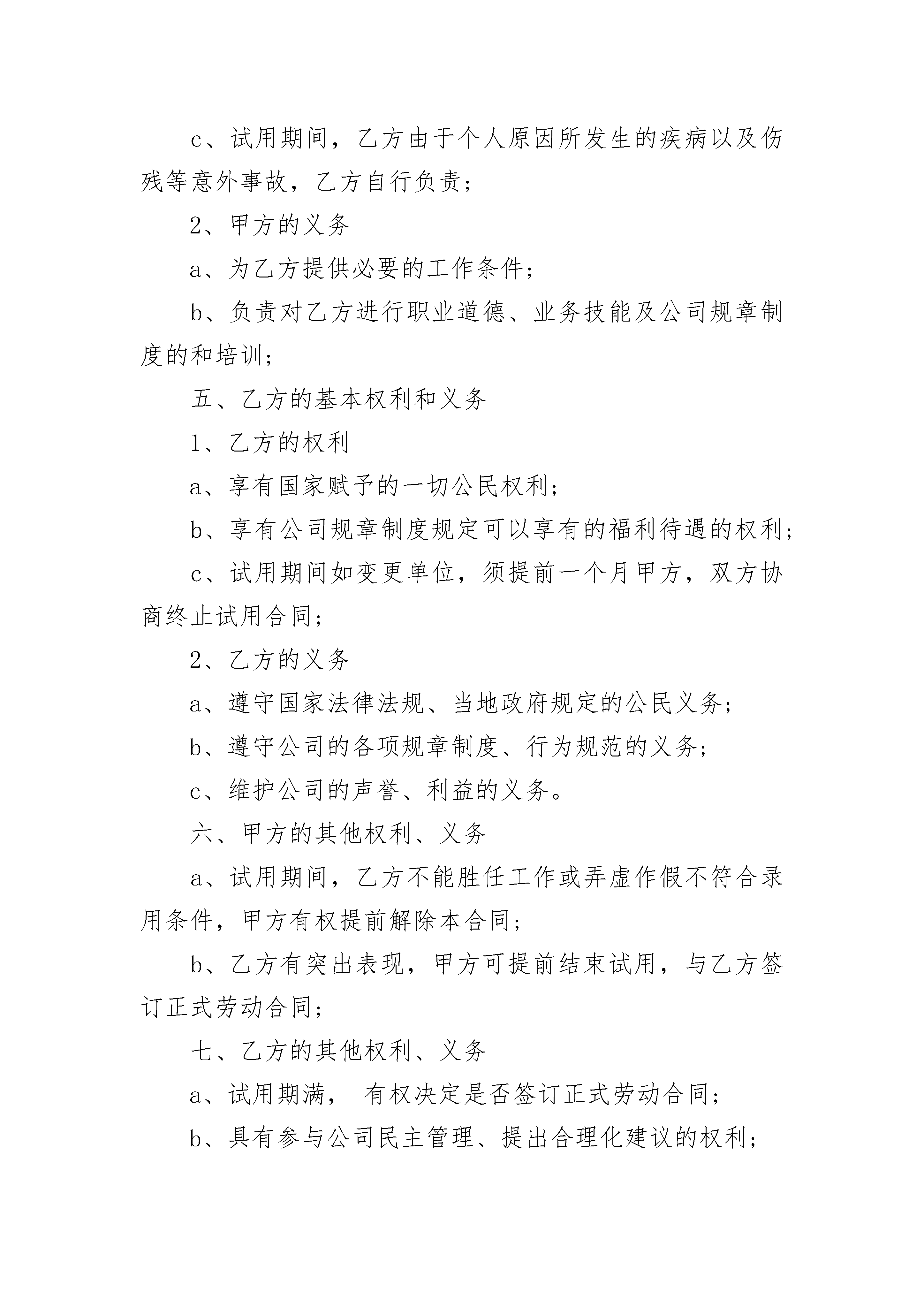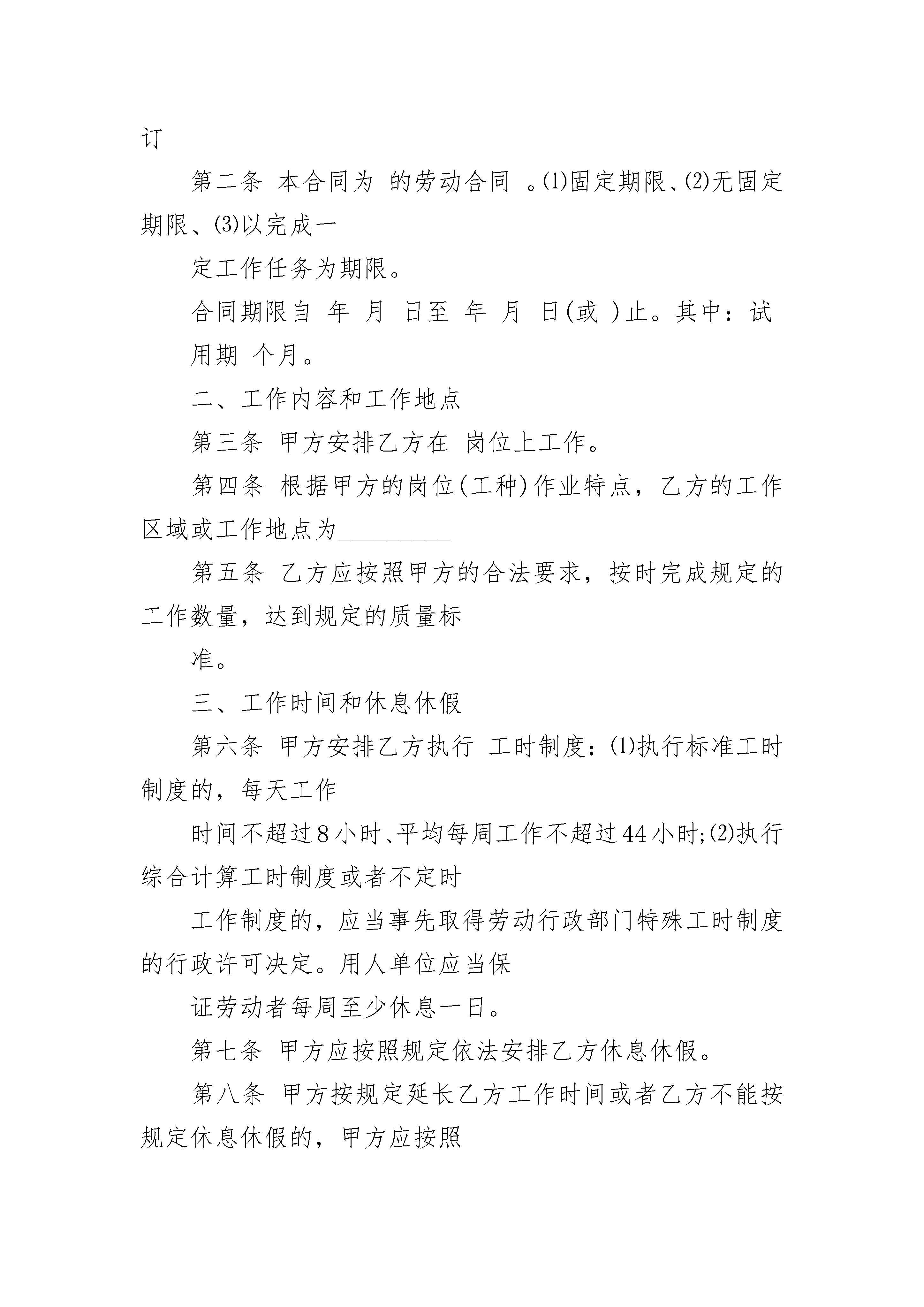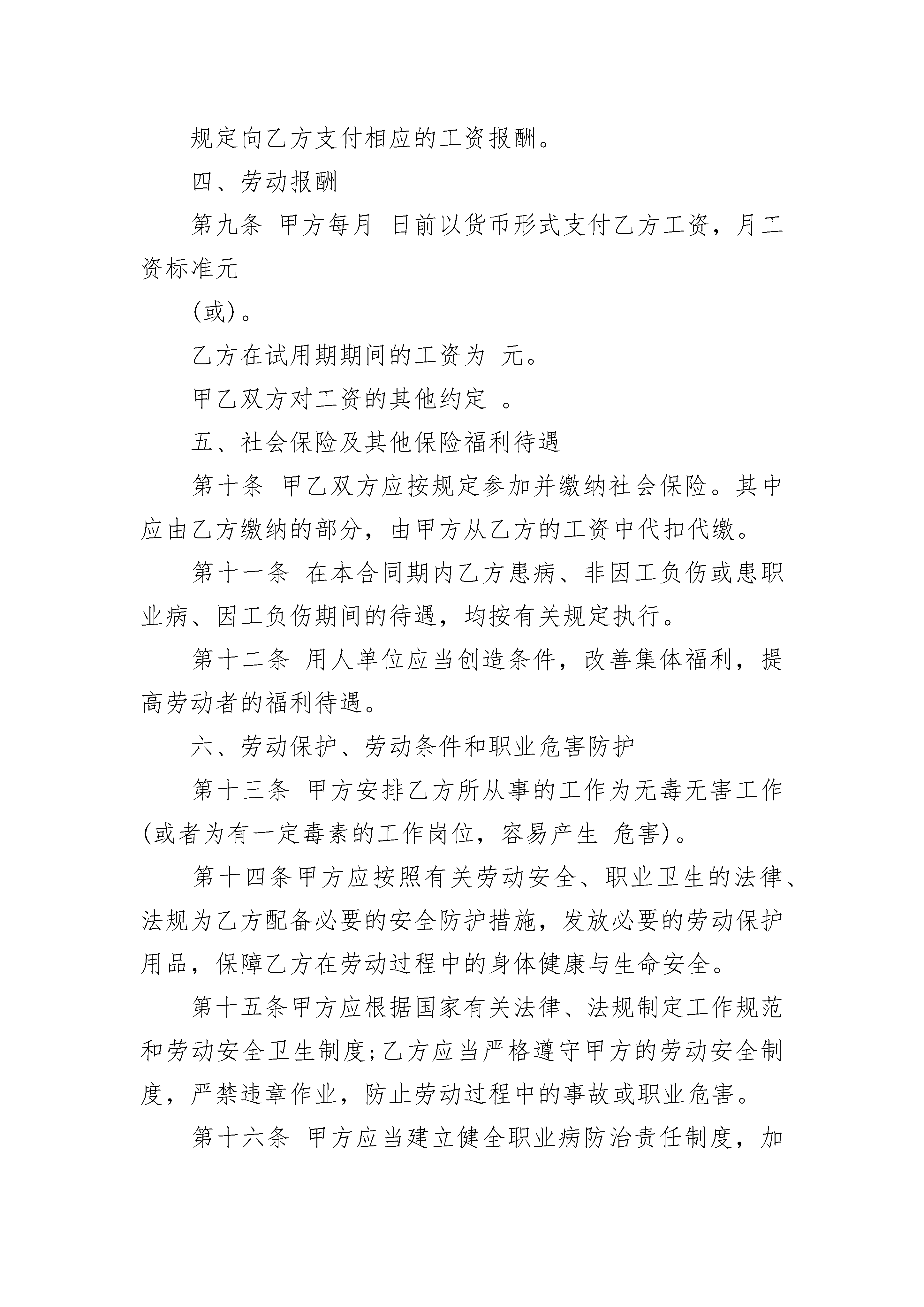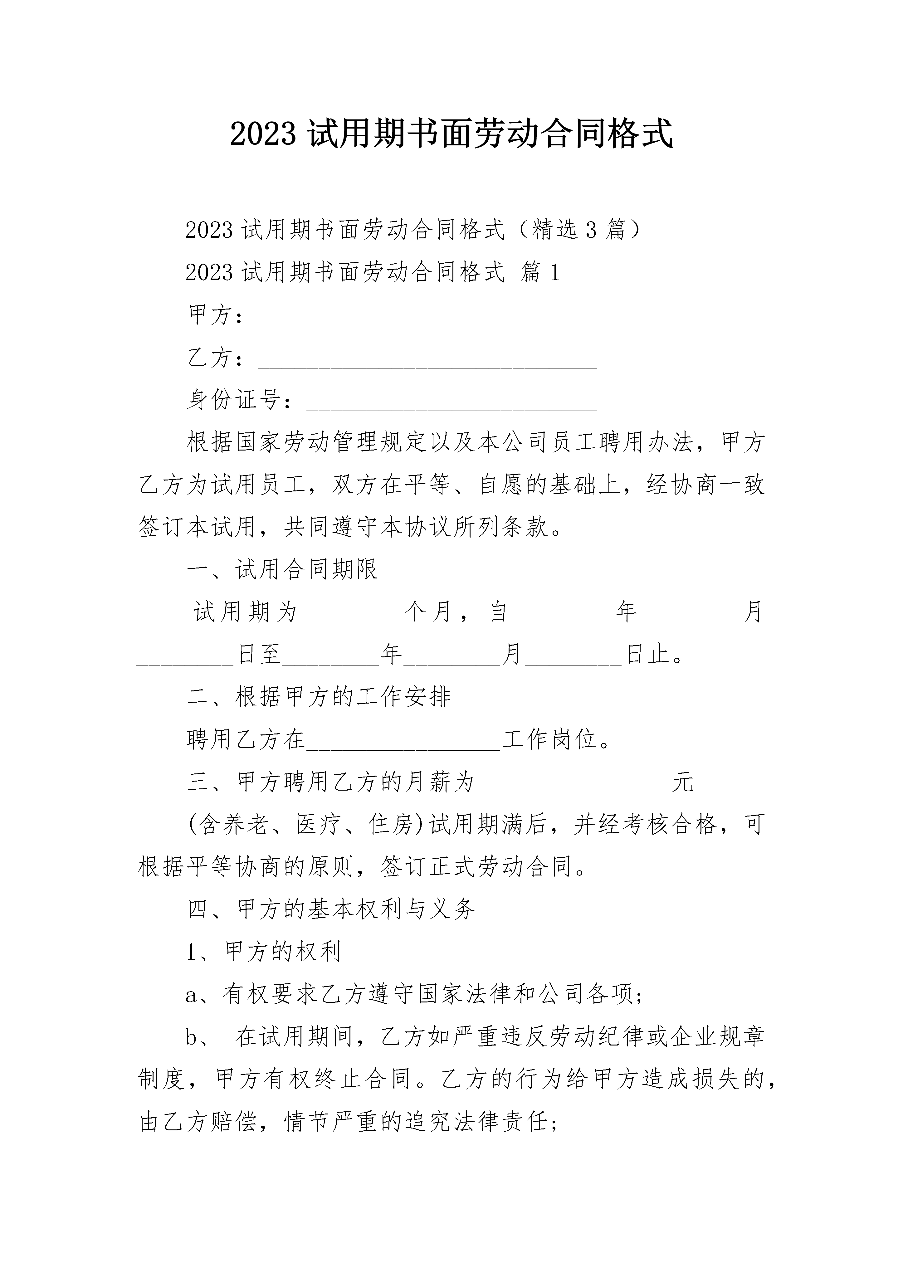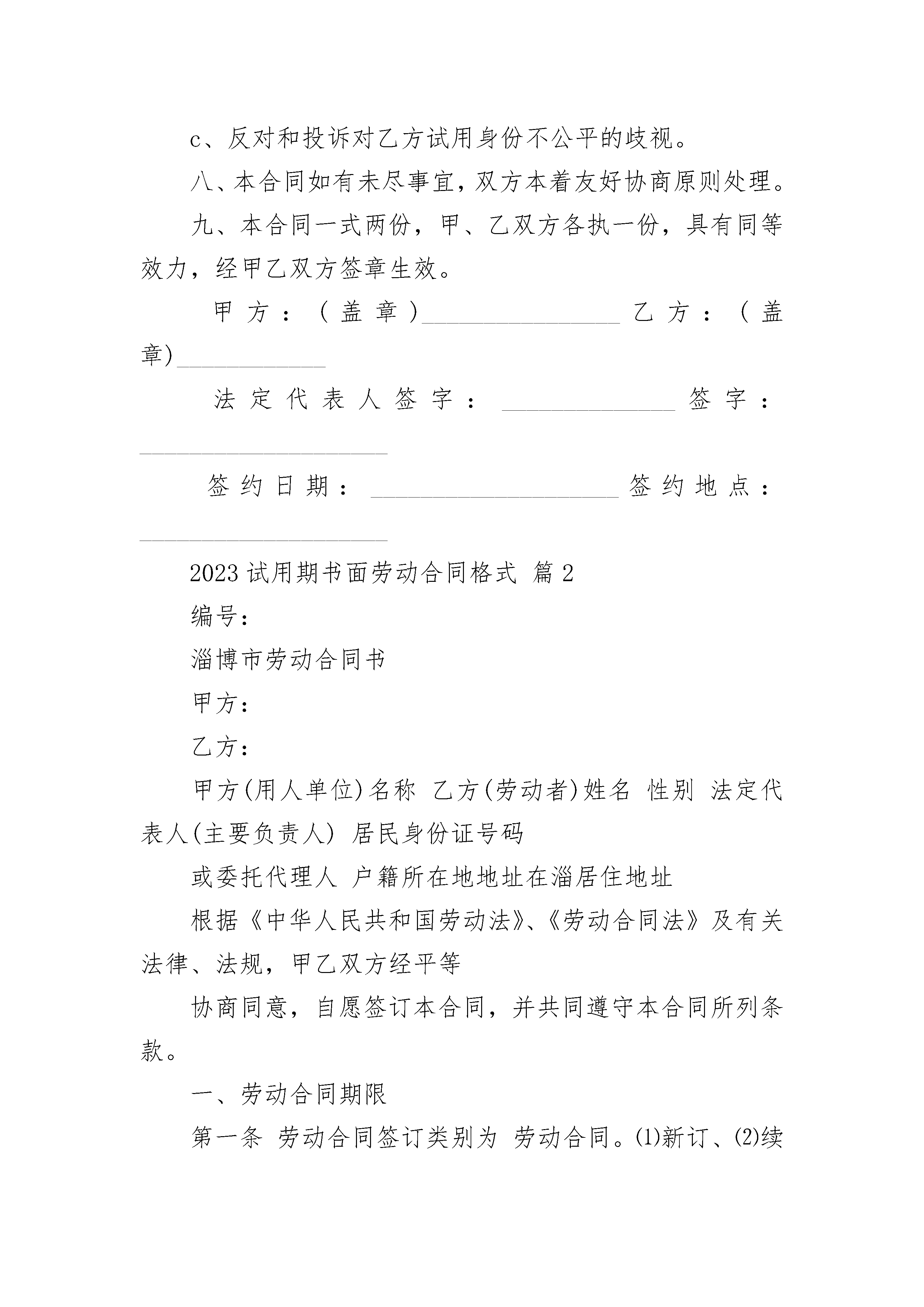 2023试用期书面劳动合同格式2023试用期书面劳动合同格式(精选3篇)2023试用期书面劳动合同格式篇1甲方:____________________________乙方:____________________________身份证号:________________________根据国家劳动管理规定以及本公司员工聘用办法,甲方乙方为试用员工,双方在平等、自愿的基础上,经协商一致签订本试用,共同遵守本协议所列条款。一、试用合同期限试用期为________个月,自________年________月________日至________年________月________日止。二、根据甲方的工作安排聘用乙方在________________工作岗位。三、甲方聘用乙方的月薪为________________元(含养老、医疗、住房)试用期满后,并经考核合格,可根据平等协商的原则,签订正式劳动合同。四、甲方的基本权利与义务1、甲方的权利a、有权要求乙方遵守国家法律和公司各项;b、在试用期间,乙方如严重违反劳动纪律或企业规章制度,甲方有权终止合同。乙方的行为给甲方造成损失的,由乙方赔偿,情节严重的追究法律责任;c、试用期间,乙方由于个人原因所发生的疾病以及伤残等意外事故,乙方自行负责;2、甲方的义务a、为乙方提供必要的工作条件;b、负责对乙方进行职业道德、业务技能及公司规章制度的和培训;五、乙方的基本权利和义务1、乙方的权利a、享有国家赋予的一切公民权利;b、享有公司规章制度规定可以享有的福利待遇的权利;c、试用期间如变更单位,须提前一个月甲方,双方协商终止试用合同;2、乙方的义务a、遵守国家法律法规、当地政府规定的公民义务;b、遵守公司的各项规章制度、行为规范的义务;c、维护公司的声誉、利益的义务。六、甲方的其他权利、义务a、试用期间,乙方不能胜任工作或弄虚作假不符合录用条件,甲方有权提前解除本合同;b、乙方有突出表现,甲方可提前结束试用,与乙方签订正式劳动合同;七、乙方的其他权利、义务a、试用期满,有权决定是否签订正式劳动合同;b、具有参与公司民主管理、提出合理化建议的权利;c、反对和投诉对乙方试用身份不公平的歧视。八、本合同如有未尽事宜,双方本着友好协商原则处理。九、本合同一式两份,甲、乙双方各执一份,具有同等效力,经甲乙双方签章生效。甲方:(盖章)________________乙方:(盖章)____________法定代表人签字:______________签字:____________________签约日期:____________________签约地点:____________________2023试用期书面劳动合同格式篇2编号:淄博市劳动合同书甲方:乙方:甲方(用人单位)名称乙方(劳动者)姓名性别法定代表人(主要负责人)居民身份证号码或委托代理人户籍所在地地址在淄居住地址根据《中华人民共和国劳动法》、《劳动合同法》及有关法律、法规,甲乙双方经平等协商同意,自愿签订本合同,并共同遵守本合同所列条款。一、劳动合同期限第一条劳动合同签订类别为劳动合同。⑴新订、⑵续订第二条本合同为的劳动合同。⑴固定期限、⑵无固定期限、⑶以完成一定工作任务为期限。合同期限自年月日至年月日(或)止。其中:试用期个月。二、工作内容和工作地点第三条甲方安排乙方在岗位上工作。第四条根据甲方的岗位(工种)作业特点,乙方的工作区域或工作地点为_________第五条乙方应按照甲方的合法要求,按时完成规定的工作数量,达到规定的质量标准。三、工作时间和休息休假第六条甲方安排乙方执行工时制度:⑴执行标准工时制度的,每天工作时间不超过8小时、平均每周工作不超过44小时;⑵执行综合计算工时制度或者不定时工作制度的,应当事先取得劳动行政部门特殊工时制度的行政许可决定。用人单位应当保证劳动者每周至少休息一日。第七条甲方应按照规定依法安排乙方休息休假。第八条甲方按规定延长乙方工作时间或者乙方不能按规定休息休假的,甲方应按照规定向乙方支付相应的工资报酬。四、劳动报酬第九条甲方每月日前以货币形式支付乙方工资,月工资标准元(或)。乙方在试用期期间的工资为元。甲乙双方对工资的其他约定。五、社会保险及其他保险福利待遇第十条甲乙双方应按规定参加并缴纳社会保险。其中应由乙方缴纳的部分,由甲方从乙方的工资中代扣代缴。第十一条在本合同期内乙方患病、非因工负伤或患职业病、因工负伤期间的待遇,均按有关规定执行。第十二条用人单位应当创造条件,改善集体福利,提高劳动者的福利待遇。六、劳动保护、劳动条件和职业危害防护第十三条甲方安排乙方所从事的工作为无毒无害工作(或者为有一定毒素的工作岗位,容易产生危害)。第十四条甲方应按照有关劳动安全、职业卫生的法律、法规为乙方配备必要的安全防护措施,