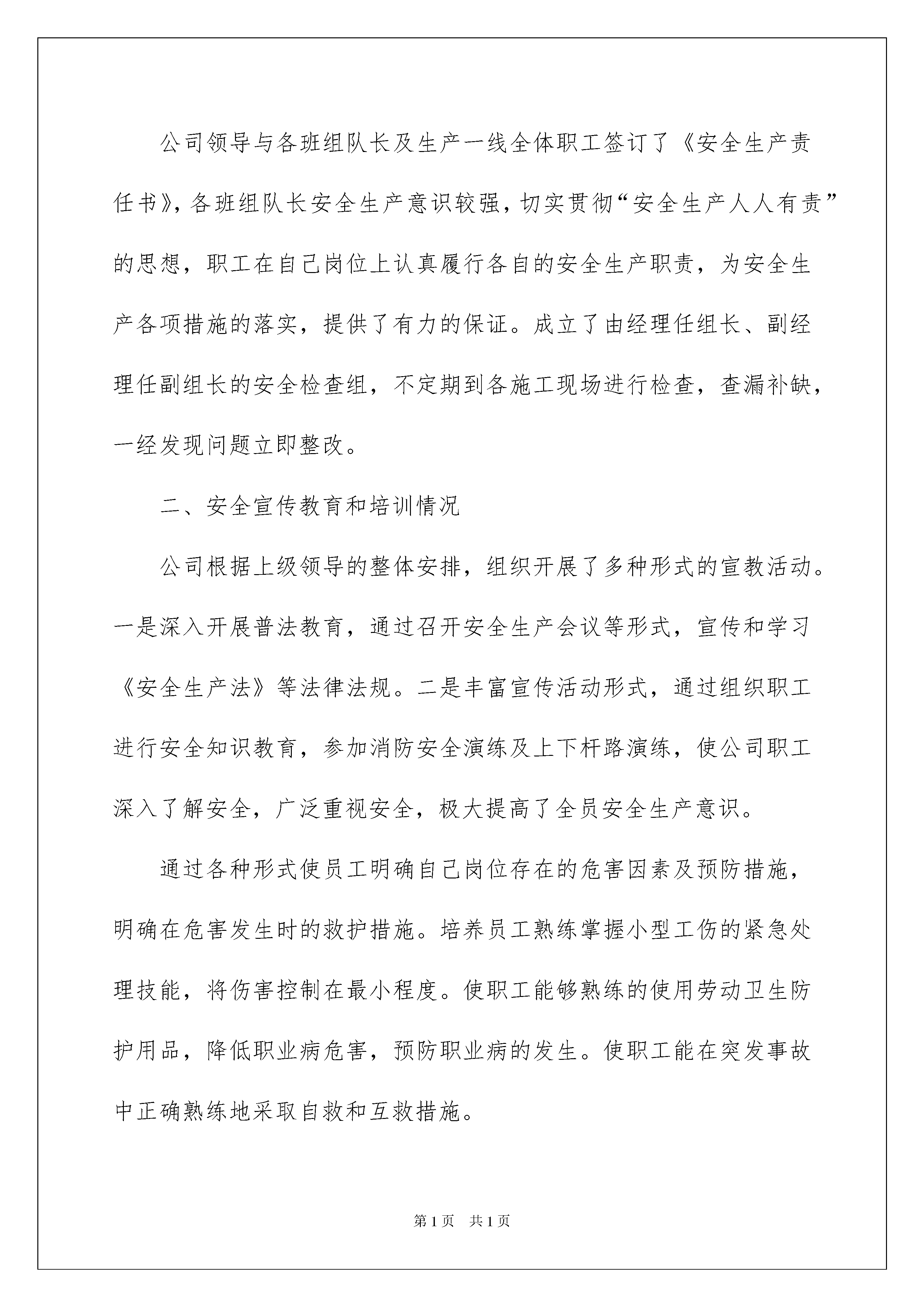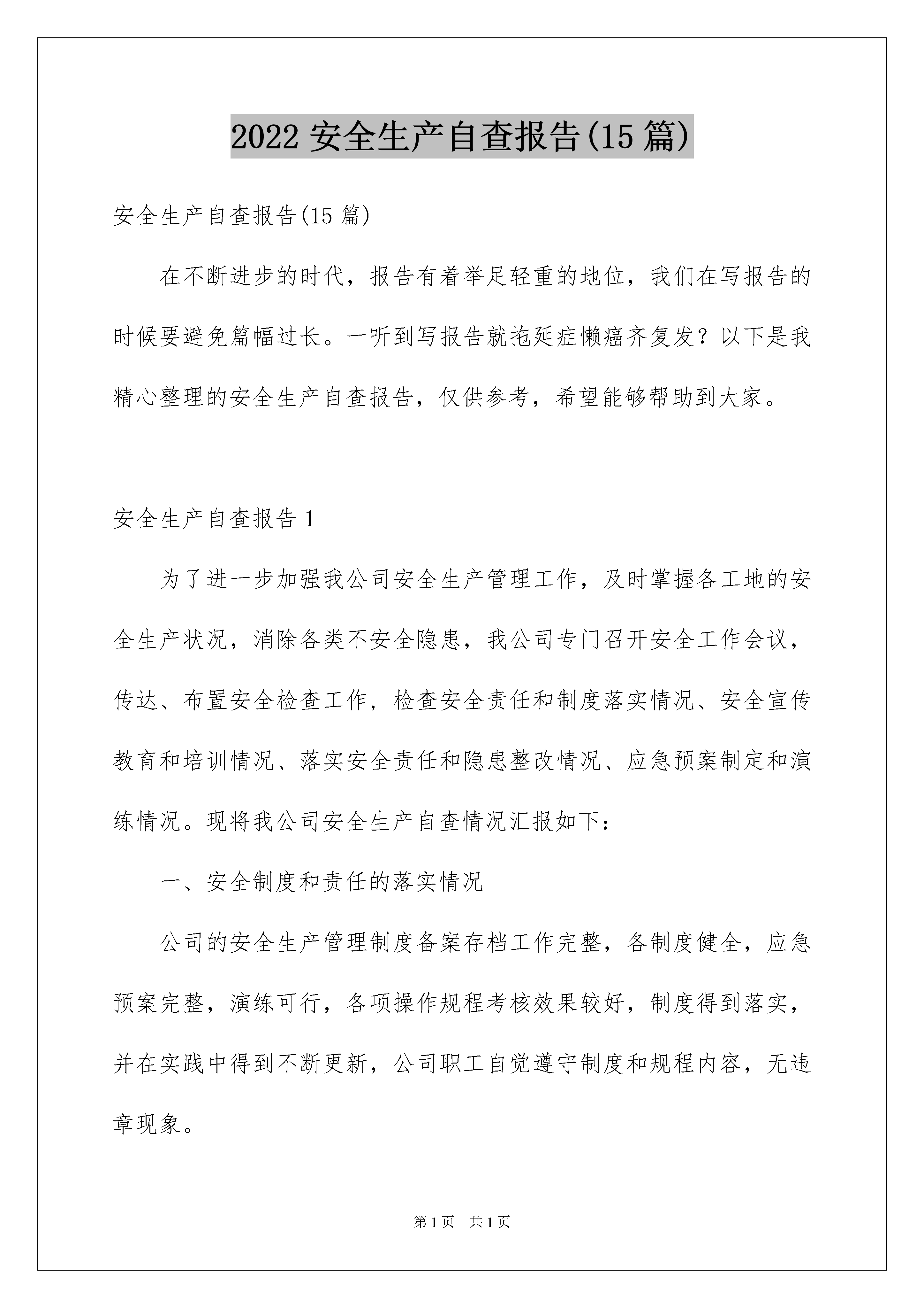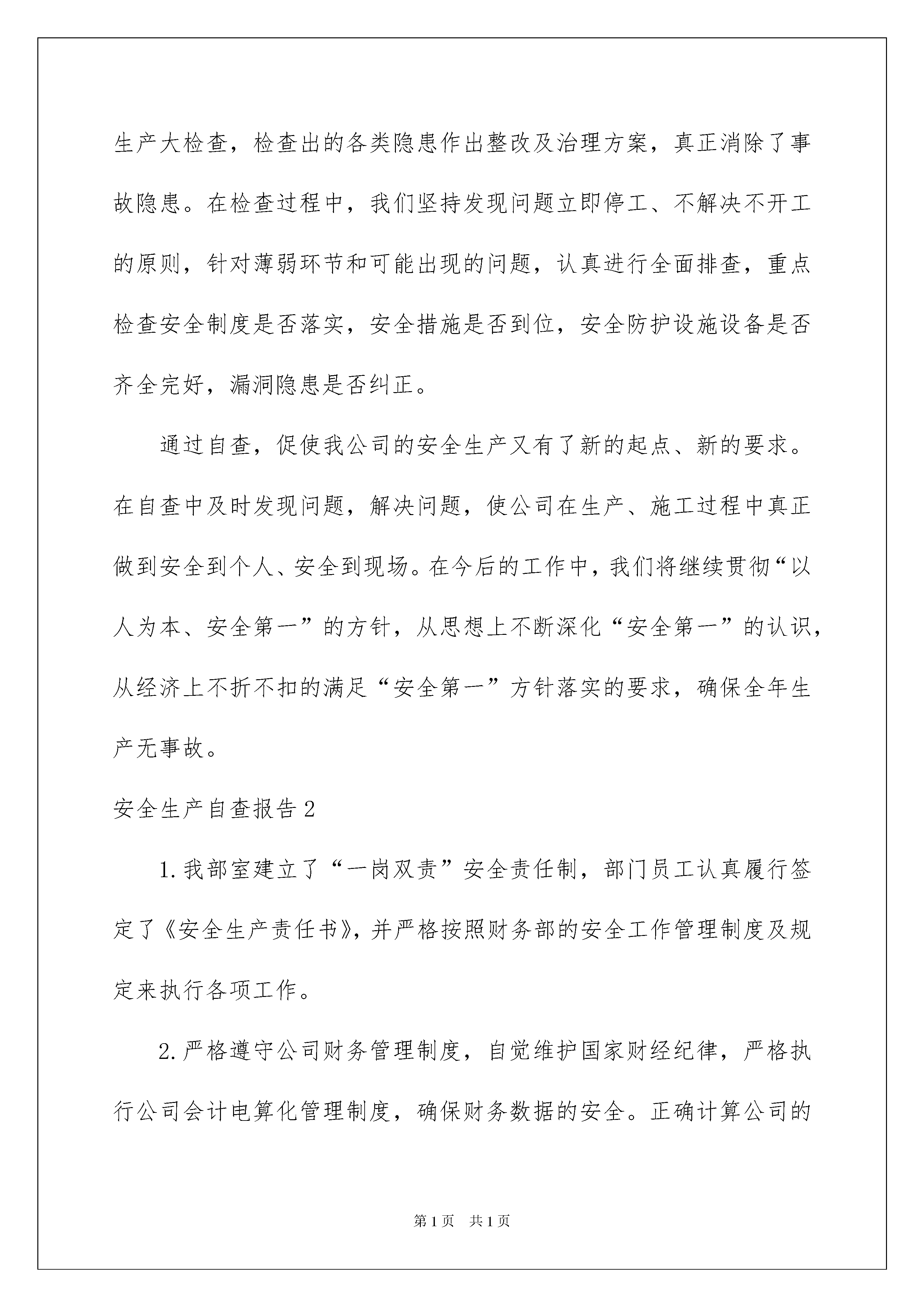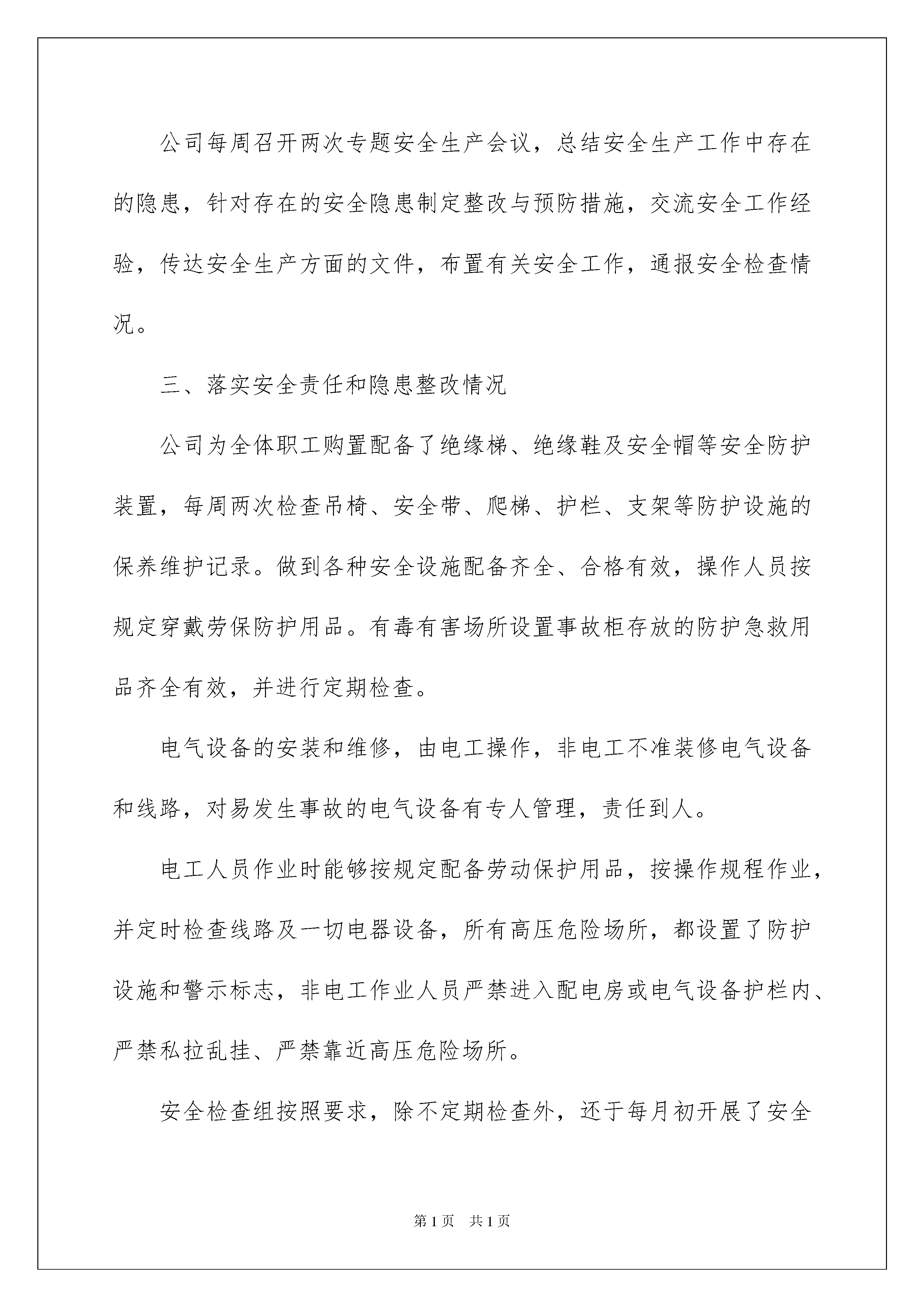 2022安全生产自查报告(15篇)安全生产自查报告(15篇)在不断进步的时代,报告有着举足轻重的地位,我们在写报告的时候要避免篇幅过长。一听到写报告就拖延症懒癌齐复发?以下是我精心整理的安全生产自查报告,仅供参考,希望能够帮助到大家。安全生产自查报告1为了进一步加强我公司安全生产管理工作,及时掌握各工地的安全生产状况,消除各类不安全隐患,我公司专门召开安全工作会议,传达、布置安全检查工作,检查安全责任和制度落实情况、安全宣传教育和培训情况、落实安全责任和隐患整改情况、应急预案制定和演练情况。现将我公司安全生产自查情况汇报如下:一、安全制度和责任的落实情况公司的安全生产管理制度备案存档工作完整,各制度健全,应急预案完整,演练可行,各项操作规程考核效果较好,制度得到落实,并在实践中得到不断更新,公司职工自觉遵守制度和规程内容,无违章现象。公司领导与各班组队长及生产一线全体职工签订了《安全生产责任书》,各班组队长安全生产意识较强,切实贯彻“安全生产人人有责”的思想,职工在自己岗位上认真履行各自的安全生产职责,为安全生产各项措施的落实,提供了有力的保证。成立了由经理任组长、副经理任副组长的安全检查组,不定期到各施工现场进行检查,查漏补缺,一经发现问题立即整改。二、安全宣传教育和培训情况公司根据上级领导的整体安排,组织开展了多种形式的宣教活动。一是深入开展普法教育,通过召开安全生产会议等形式,宣传和学习《安全生产法》等法律法规。二是丰富宣传活动形式,通过组织职工进行安全知识教育,参加消防安全演练及上下杆路演练,使公司职工深入了解安全,广泛重视安全,极大提高了全员安全生产意识。通过各种形式使员工明确自己岗位存在的危害因素及预防措施,明确在危害发生时的救护措施。培养员工熟练掌握小型工伤的紧急处理技能,将伤害控制在最小程度。使职工能够熟练的使用劳动卫生防护用品,降低职业病危害,预防职业病的发生。使职工能在突发事故中正确熟练地采取自救和互救措施。公司每周召开两次专题安全生产会议,总结安全生产工作中存在的隐患,针对存在的安全隐患制定整改与预防措施,交流安全工作经验,传达安全生产方面的文件,布置有关安全工作,通报安全检查情况。三、落实安全责任和隐患整改情况公司为全体职工购置配备了绝缘梯、绝缘鞋及安全帽等安全防护装置,每周两次检查吊椅、安全带、爬梯、护栏、支架等防护设施的保养维护记录。做到各种安全设施配备齐全、合格有效,操作人员按规定穿戴劳保防护用品。有毒有害场所设置事故柜存放的防护急救用品齐全有效,并进行定期检查。电气设备的安装和维修,由电工操作,非电工不准装修电气设备和线路,对易发生事故的电气设备有专人管理,责任到人。电工人员作业时能够按规定配备劳动保护用品,按操作规程作业,并定时检查线路及一切电器设备,所有高压危险场所,都设置了防护设施和警示标志,非电工作业人员严禁进入配电房或电气设备护栏内、严禁私拉乱挂、严禁靠近高压危险场所。安全检查组按照要求,除不定期检查外,还于每月初开展了安全生产大检查,检查出的各类隐患作出整改及治理方案,真正消除了事故隐患。在检查过程中,我们坚持发现问题立即停工、不解决不开工的原则,针对薄弱环节和可能出现的问题,认真进行全面排查,重点检查安全制度是否落实,安全措施是否到位,安全防护设施设备是否齐全完好,漏洞隐患是否纠正。通过自查,促使我公司的安全生产又有了新的起点、新的要求。在自查中及时发现问题,解决问题,使公司在生产、施工过程中真正做到安全到个人、安全到现场。在今后的工作中,我们将继续贯彻“以人为本、安全第一”的方针,从思想上不断深化“安全第一”的认识,从经济上不折不扣的满足“安全第一”方针落实的要求,确保全年生产无事故。安全生产自查报告21.我部室建立了“一岗双责”安全责任制,部门员工认真履行签定了《安全生产责任书》,并严格按照财务部的安全工作管理制度及规定来执行各项工作。2.严格遵守公司财务管理制度,自觉维护国家财经纪律,严格执行公司会计电算化管理制度,确保财务数据的安全。正确计算公司的收入、成本、费用,保证财务数据的准确、真实、及时,确保公司各种资金存放按财务管理制度规定办理。计算机及财务设备的启动和关闭要按照操作规程进行,对外来移动盘使用之前,要进行病毒检测,以免带进计算机病毒。发现病毒,应采取隔离、控制措施,及时清除。及时更新病毒查杀软件,保持良好的防毒状态。每台计算机应设置开机密码,并不得泄露给他人,重要数据要及时备份。3.定期检查电线、电器有无损坏或安全隐患,如有损坏的及时通知后勤部进行维修、维护,部门员工正确、安全地使用电器,下班时认真检查,全部