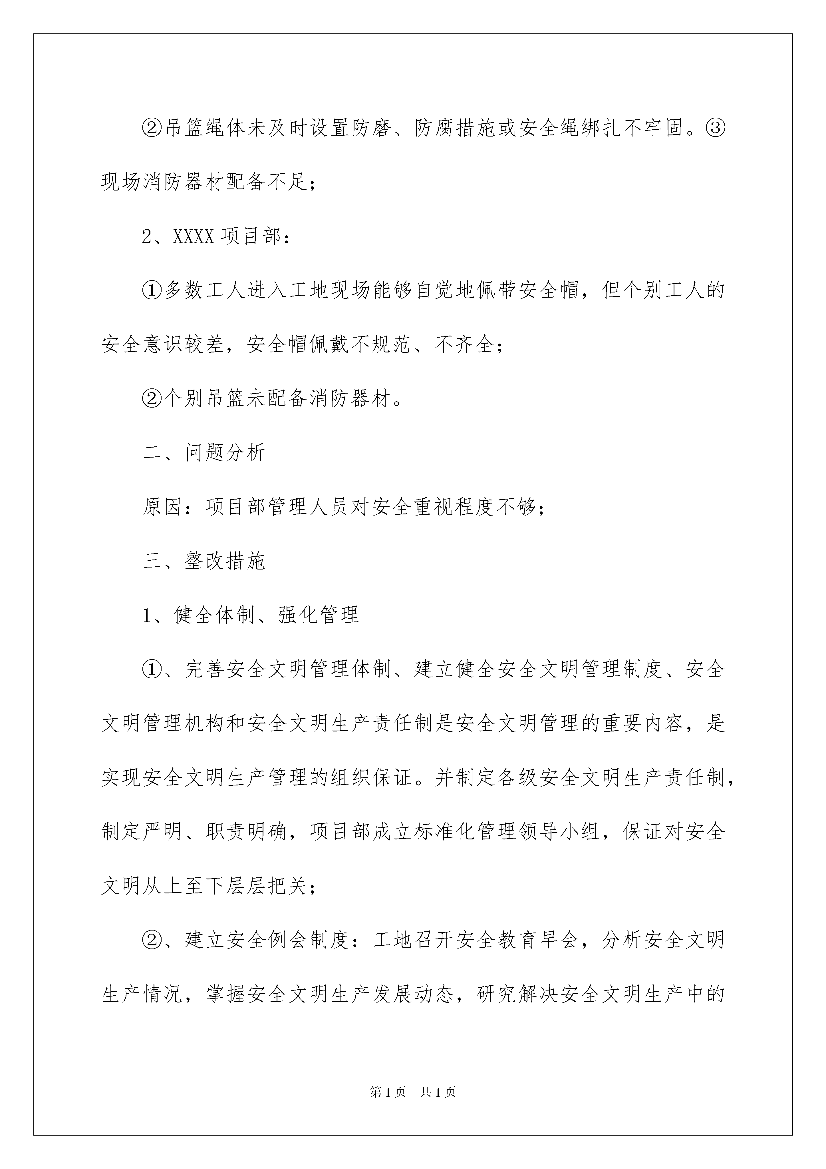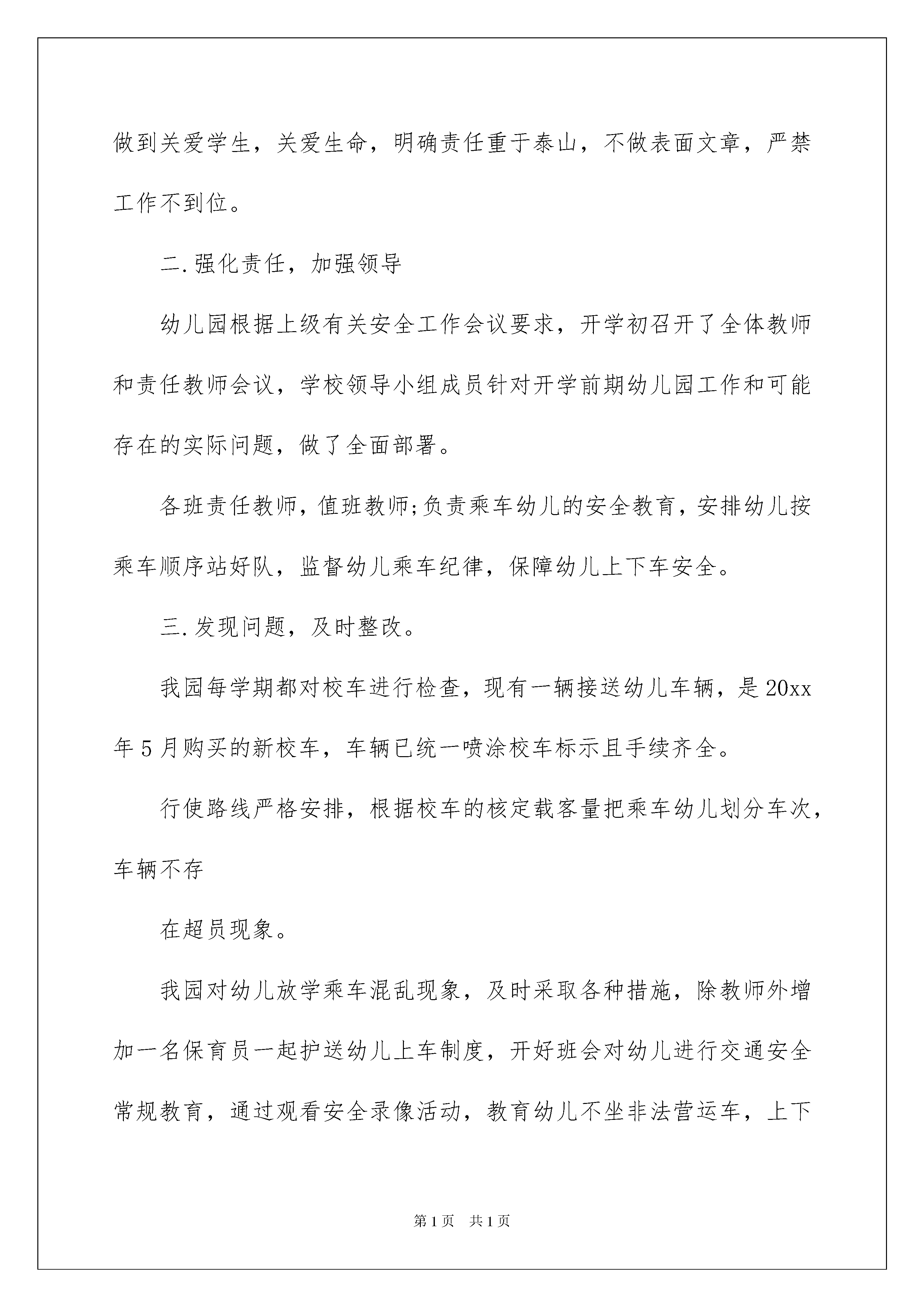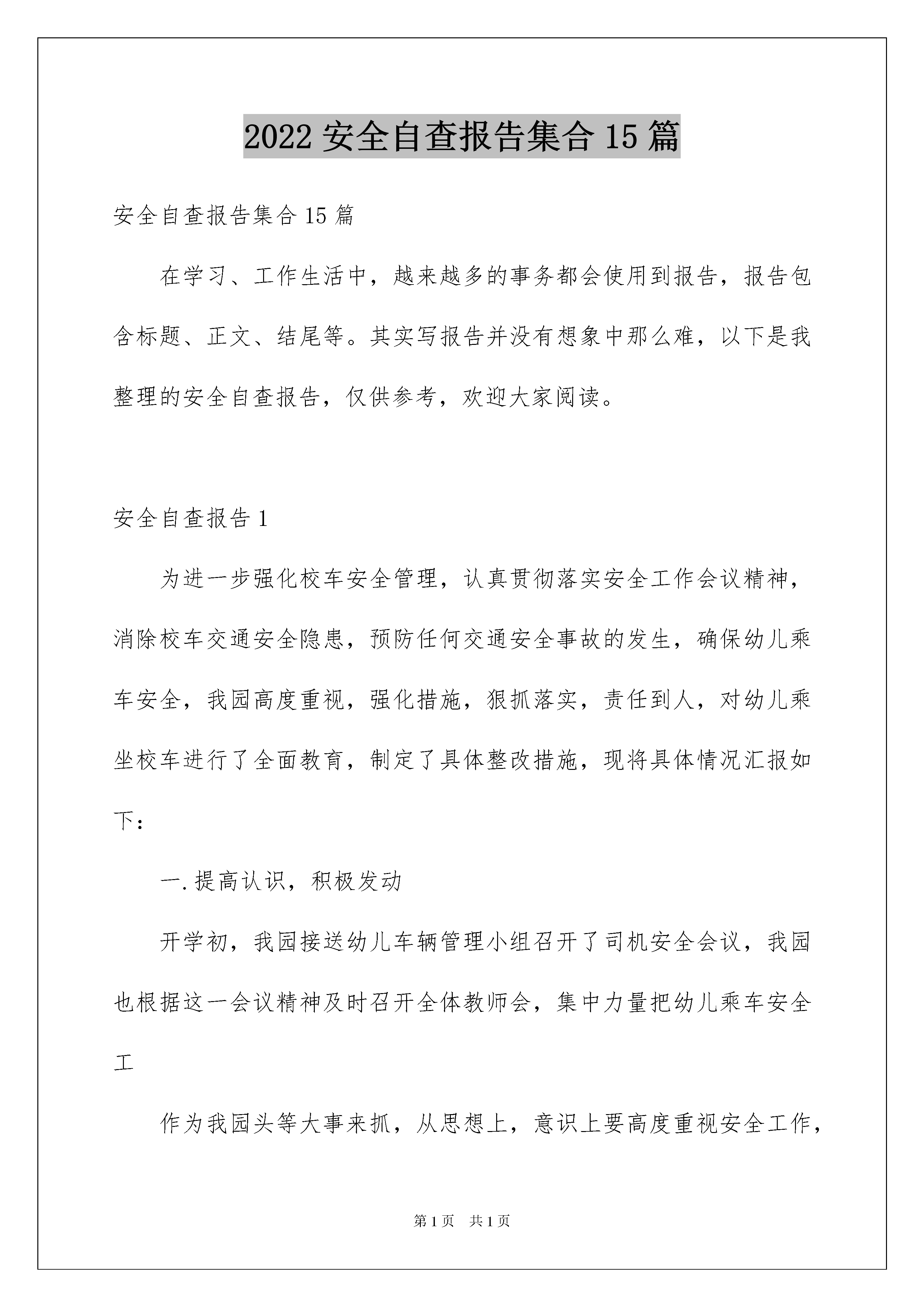 2022安全自查报告集合15篇安全自查报告集合15篇在学习、工作生活中,越来越多的事务都会使用到报告,报告包含标题、正文、结尾等。其实写报告并没有想象中那么难,以下是我整理的安全自查报告,仅供参考,欢迎大家阅读。安全自查报告1为进一步强化校车安全管理,认真贯彻落实安全工作会议精神,消除校车交通安全隐患,预防任何交通安全事故的发生,确保幼儿乘车安全,我园高度重视,强化措施,狠抓落实,责任到人,对幼儿乘坐校车进行了全面教育,制定了具体整改措施,现将具体情况汇报如下:一.提高认识,积极发动开学初,我园接送幼儿车辆管理小组召开了司机安全会议,我园也根据这一会议精神及时召开全体教师会,集中力量把幼儿乘车安全工作为我园头等大事来抓,从思想上,意识上要高度重视安全工作,做到关爱学生,关爱生命,明确责任重于泰山,不做表面文章,严禁工作不到位。二.强化责任,加强领导幼儿园根据上级有关安全工作会议要求,开学初召开了全体教师和责任教师会议,学校领导小组成员针对开学前期幼儿园工作和可能存在的实际问题,做了全面部署。各班责任教师,值班教师;负责乘车幼儿的安全教育,安排幼儿按乘车顺序站好队,监督幼儿乘车纪律,保障幼儿上下车安全。三.发现问题,及时整改。我园每学期都对校车进行检查,现有一辆接送幼儿车辆,是20xx年5月购买的新校车,车辆已统一喷涂校车标示且手续齐全。行使路线严格安排,根据校车的核定载客量把乘车幼儿划分车次,车辆不存在超员现象。我园对幼儿放学乘车混乱现象,及时采取各种措施,除教师外增加一名保育员一起护送幼儿上车制度,开好班会对幼儿进行交通安全常规教育,通过观看安全录像活动,教育幼儿不坐非法营运车,上下车排好队,不拥挤,不打闹;与接送老师签订了接送安全责任书;与接送幼儿车辆驾驶人签订安全驾驶责任状;对校车驾驶人资格审查和安全教育;对不负责任,玩忽职守的教师和相关人员进行严厉批评,并追究相关责任。四.引以为戒,吸取教育,常抓不懈。吸取其他幼儿园校车的事故,引以为戒,我园各项安全工作对照要求落到实处,并制定了整改措施,严格执行各项制度,确保学校教育教学工作的顺利开展。安全自查报告2为进一步加强施工管理,切实消除安全隐患,预防和减少安全事故的发生,按照施工安全规范规定的要求,我公司对4月29日组织全体员工开展安全活动。于4月29日项目部组织对施工现场全面认真的安全隐患检查,现就自查结果总结如下:一、发现问题1、XXXX项目部:①多数工人进入工地现场能够自觉地佩带安全帽、安全绳,但个别工人的安全意识较差,安全帽、安全绳佩戴不规范、不齐全;②吊篮绳体未及时设置防磨、防腐措施或安全绳绑扎不牢固。③现场消防器材配备不足;2、XXXX项目部:①多数工人进入工地现场能够自觉地佩带安全帽,但个别工人的安全意识较差,安全帽佩戴不规范、不齐全;②个别吊篮未配备消防器材。二、问题分析原因:项目部管理人员对安全重视程度不够;三、整改措施1、健全体制、强化管理①、完善安全文明管理体制、建立健全安全文明管理制度、安全文明管理机构和安全文明生产责任制是安全文明管理的重要内容,是实现安全文明生产管理的组织保证。并制定各级安全文明生产责任制,制定严明、职责明确,项目部成立标准化管理领导小组,保证对安全文明从上至下层层把关;②、建立安全例会制度:工地召开安全教育早会,分析安全文明生产情况,掌握安全文明生产发展动态,研究解决安全文明生产中的突出问题,确保安全文明生产;③、目标管理:实行目标管理是强化管理者的安全文明思想意识,提高安全文明管理水平和施工水平,确保建设项目安全、高效、文明施工的有力措施,按上级有关条文规定,结合项目的实际情况,逐级制定安全管理目标。项目部全体员工及施工队伍将紧紧围绕这一目标,严谨的展开各自的工作;④注重安全资料的整理,要求做到及时性、准确性、完整性。2、加强安全教育提高安全意识①、牢牢把握“安全第一、预防为主、综合治理”的方针,任何情况下不能放松思想,目标不能变。坚持安全思想教育常抓不懈,结合项目部实际情况,利用各种渠道宣传有关国家的安全生产方针、政策,提高全员安全意识。②、对施工人员坚持定期进行安全生产技术培训,并建立安全教育培训记录。作业人员未经主管部门培训、发证,均不得从事特种作业。施工作业前坚持有针对性、指导性的安全技术交底,安全技术交底由施工员、技术负责人进行编制,专职安全员参加审定,各级安全技术交底后,均办理签字手续。③、项目部安全员加大安全检查次数,各部门每日进行安全隐患排查,加强沟通,如发现问题及时将检查情况向上级报告,以便更好的指导安全生产工作。XXXXXXXX工程有限公司20xx.4