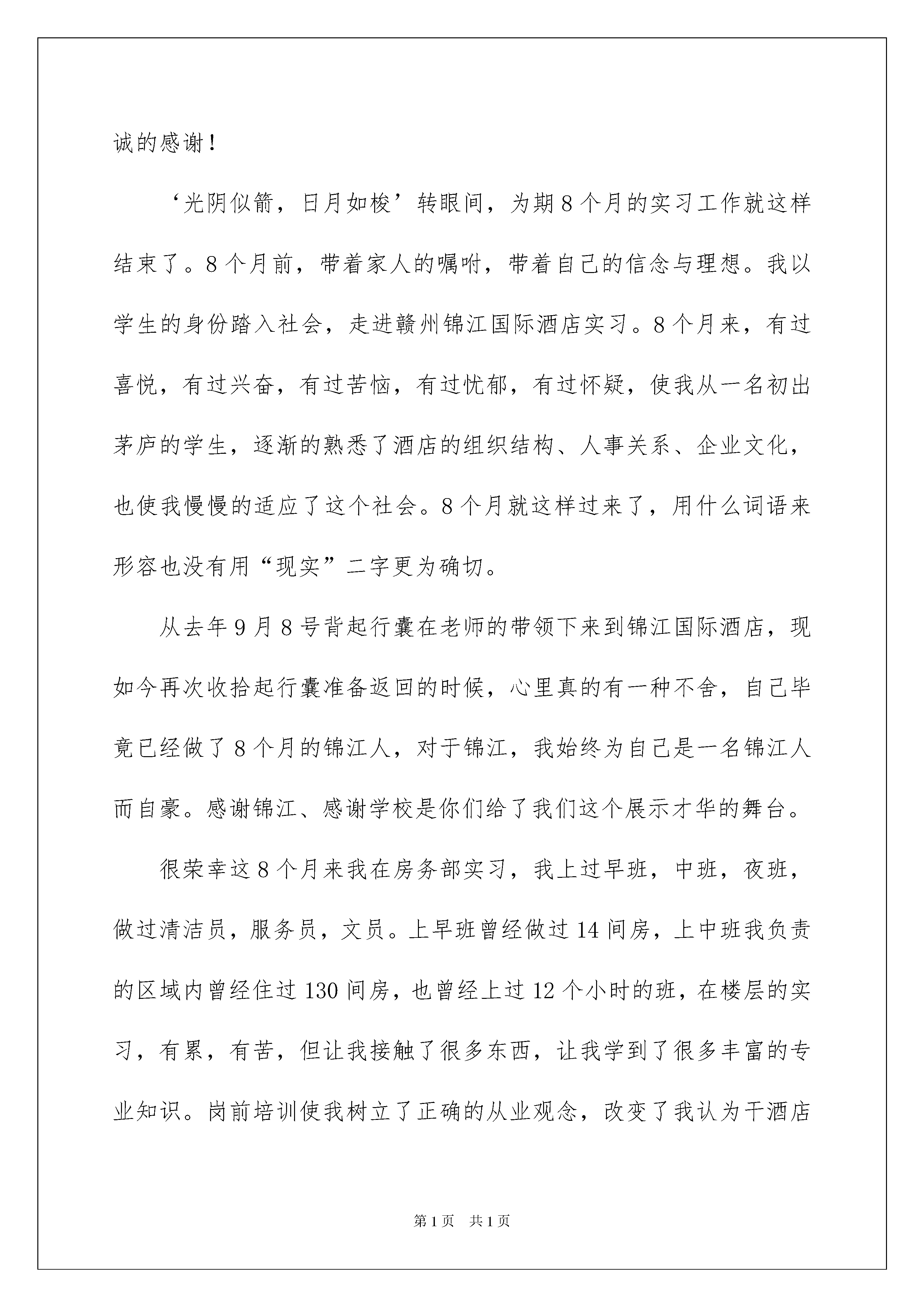 2022实习欢送会发言稿实习欢送会发言稿在学习、工作生活中,越来越多地方需要用到发言稿,发言稿是作为在特定的情境中供口语表达使用的文稿。相信许多人会觉得发言稿很难写吧,以下是我整理的实习欢送会发言稿,仅供参考,欢迎大家阅读。实习欢送会发言稿1开篇致辞:一袭桂花的清香,你走进了校园;一付腼腆的笑容,你走进了教室;一腔火热的激情,感受师生的对话;一颗忐忑的心,开始人生的第一课;一付自信的神情,驾驭着课堂。当万老师要和你互换角色时,当学生们与你感情灼热时,你的实习生活满了,你要回到学校继续完成你的学业。秋风丰硕了大地,实习成功了自己。依依别情,别情依依。今天就在这个教室,我们以最简单的方式欢送你!今天的议程有七项:这次欢送会:献歌、献诗、心声、祝福、节目献花、再献歌。结束致辞:你虽未毕业,但你是一位准老师;你虽未当过班主任,但你已是一个准班主任。你在学生的心目中,是“真的种子,善的信使,美的旗帜”。三个月,你留给我们的是甜甜的回忆:你的文静让老师欣慰;你的微笑让学生快乐;你的文笔让我们叹服。今天没有美酒共举欢庆,没有佳肴共赏欢乐,但我们在用真情为你而歌,在用诚心为你祝福。离别后,漫长的岁月,你的声音,会在我们耳畔响起;你的身影,也会在我们的眼前浮现;你的教诲,更会常驻在我们的心田。我们相信你在教育这块园地里,你定会是奇葩一朵。最后,让我们再把美好的祝福融进歌声里。实习欢送会发言稿2尊敬的各位领导,老师,亲爱的同学们,大家下午好!我是客房部实习生—陈冬冬,环院09级酒店班班长,很高兴作为房务部实习生代表站在这里发言。首先非常感谢各位学校领导和锦江国际酒店的各位领导在百忙的工作之余为我们举办实习生欢送会,我代表全班46名同学,表示最真诚的感谢!‘光阴似箭,日月如梭’转眼间,为期8个月的实习工作就这样结束了。8个月前,带着家人的嘱咐,带着自己的信念与理想。我以学生的身份踏入社会,走进赣州锦江国际酒店实习。8个月来,有过喜悦,有过兴奋,有过苦恼,有过忧郁,有过怀疑,使我从一名初出茅庐的学生,逐渐的熟悉了酒店的组织结构、人事关系、企业文化,也使我慢慢的适应了这个社会。8个月就这样过来了,用什么词语来形容也没有用“现实”二字更为确切。从去年9月8号背起行囊在老师的带领下来到锦江国际酒店,现如今再次收拾起行囊准备返回的时候,心里真的有一种不舍,自己毕竟已经做了8个月的锦江人,对于锦江,我始终为自己是一名锦江人而自豪。感谢锦江、感谢学校是你们给了我们这个展示才华的舞台。很荣幸这8个月来我在房务部实习,我上过早班,中班,夜班,做过清洁员,服务员,文员。上早班曾经做过14间房,上中班我负责的区域内曾经住过130间房,也曾经上过12个小时的班,在楼层的实习,有累,有苦,但让我接触了很多东西,让我学到了很多丰富的专业知识。岗前培训使我树立了正确的从业观念,改变了我认为干酒店是没有前途的消极想法,树立了干一行,爱一行的思想,明白了一个人是否有所作为,不在于他从事何种职业,而是在于他是否尽心尽力把所从事的工作做好。这让我具备了我的从业意志和端正了我的工作态度,知道了一个优秀员工应有良好的职业素质,从而增强我的从业意识,立志做一名五星级酒店的优秀员工。正式上岗后我学会了客房清洁程序,开夜床服务,对客方法,查房步骤,文员职责,电话礼仪等等。我还记得自己刚踏入社会,走进锦江门槛的时候,总认为在学校里学一点书本里的知识就可以在酒店里得心应手,而不明白最大的学问其实源于生活中,最真实的文章却是在书本之外,现在我懂了,是锦江告诉了我们‘年光似鸟翩翩过,世事如棋局局新’的道理。在学校里,我们只走得平路,上不得峭壁,更过不得险滩。离开了学校、离开了家,来到了这里。有时候,遇到失落就想轻言放弃,甚至自甘沉沦,而不明白人生有起伏才有真趣、有波折才有滋味。现在我懂了,是锦江告诉了我们‘凡人为善,不自誉而人誉之;凡人为恶,不自毁而人毁之’的道理。作为一名实习生,在实习过程中,会有埋怨,会有委屈。因为我们总认为只要自己以诚待人、与人为善,公道就会自在人心,而不明白有时自己做好未必能达到效果,甚至是好心办了坏事。之所以懂得这么多的道理,是因为锦江,是锦江人言传身教告诉了我们。我们才让自己更加的有信心,也坚信我们可以为自己喜欢的工作而奋斗。我热爱自己从事的工作,因为我在这份工作中找到了自我,当我与我们熟悉的客人打招呼时,我会感到这是我们最大的满足。我始终以自己能够去做一名专业的服务人员而骄傲,因为我们每天都在帮助别人,而客人在我们这里得到的是惊喜,而我们也在客人的惊喜中找到了富有的'人生。我们未必会有大笔的金钱,但是我们一定不会贫穷,