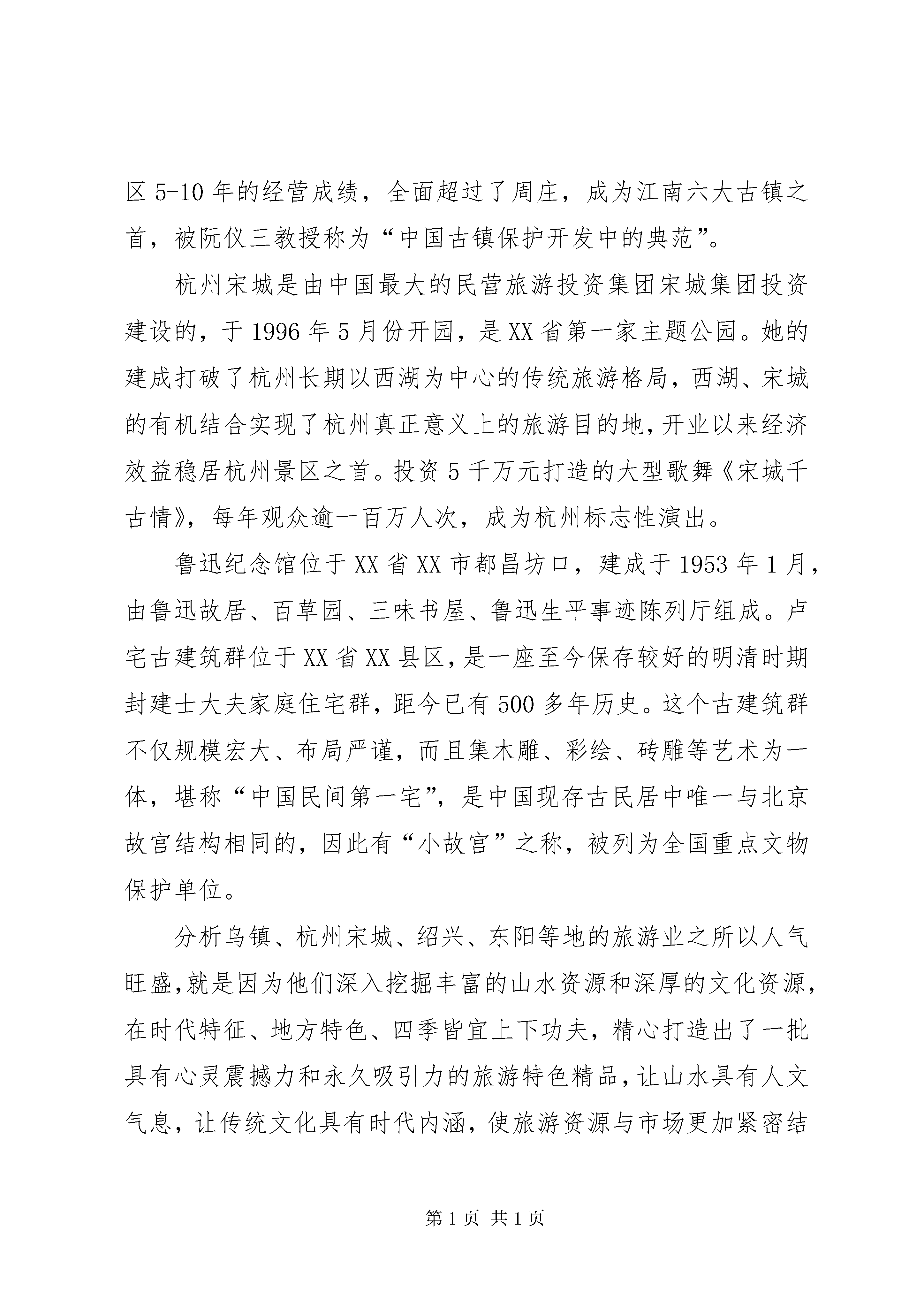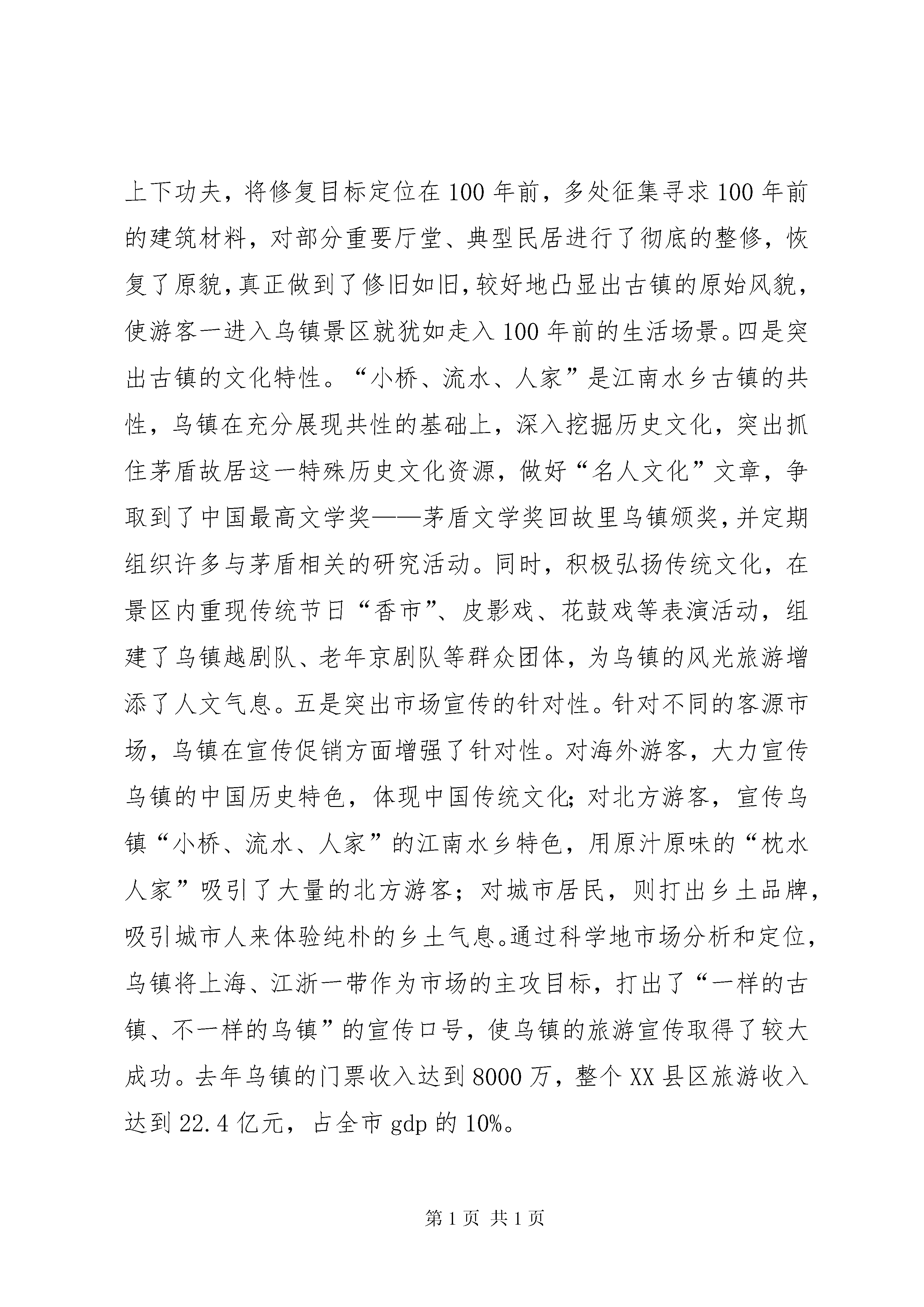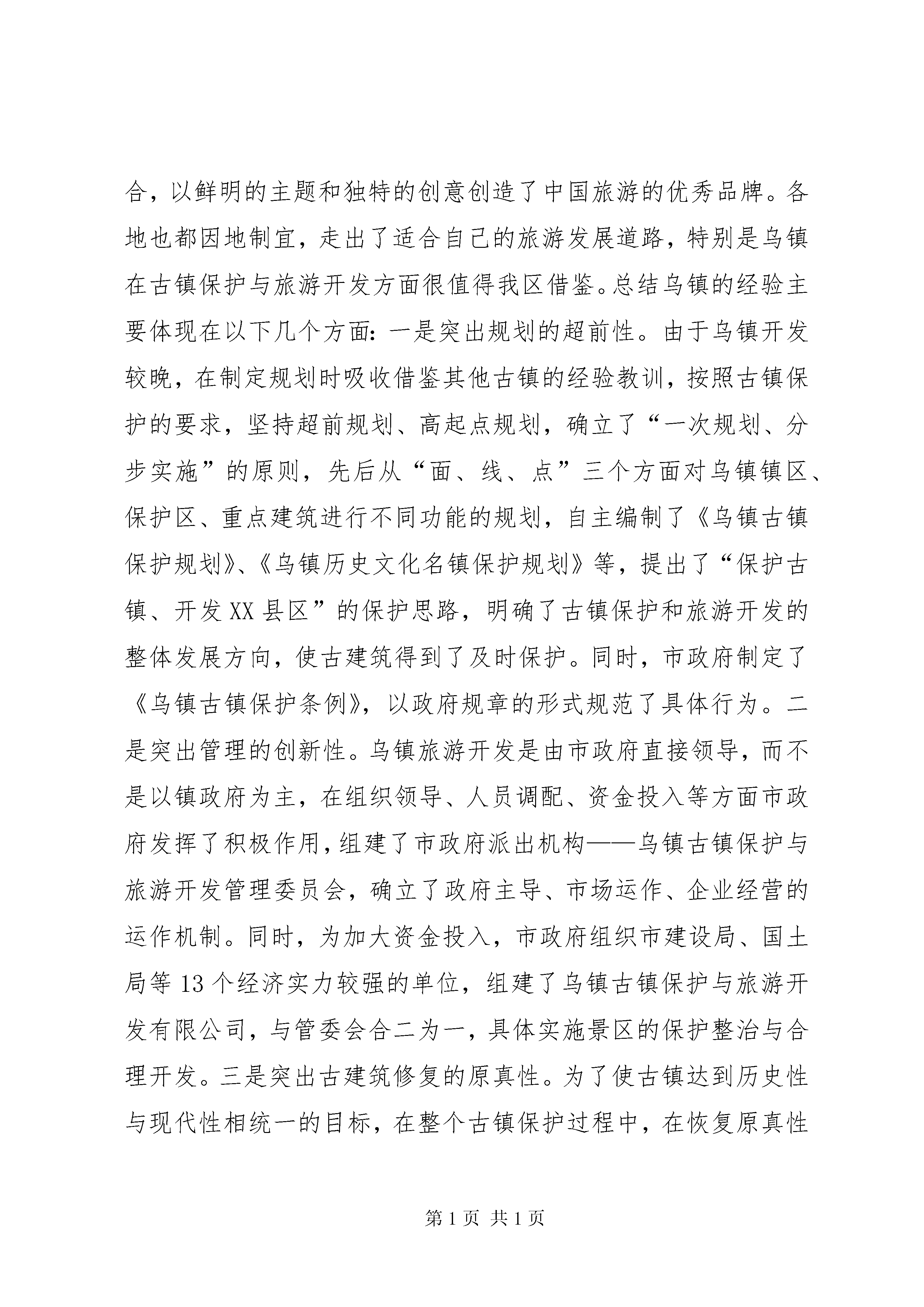 关于赴乌镇等地参观考察的报告7月21日至24日,区政协主席张德业、区政府副区长解翠红带领区房管局、大街开发保护办公室负责人赴XX省乌镇、杭州、绍兴、东阳等地进行了参观学习。期间,与XX县区政府、市政协、市旅游局分管负责人座谈交流了乌镇古镇保护与旅游开发情况,参观了乌镇景区、杭州宋城、绍兴鲁迅纪念馆及东阳卢宅。参观学习行程虽短,但收获颇丰,几个城市尤其是乌镇在旅游开发方面的好经验、好做法非常值得我们学习借鉴。一、乌镇等地的基本情况和主要做法乌镇地处浙北地区两省三市交界之处,隶属于XX县区,是江南著名的六大古镇之一。乌镇的旅游开发在江南六大古镇中起步最晚,过去只有茅盾故居一个景点,每年游客接待量只有3万人次,一年的门票收入只有18万元。面对“古镇热”的旅游大背景,XX县区委、市政府确立了“高起点、高标准、求精品”的思路,并且树立了“赶超周庄”的信心和决心。1999年开始对乌镇古镇实施保护与旅游开发,2001年正式对外开放,当年接待游客180万人,今年上半年接待游客达到130万人。乌镇古镇一期工程以观光为主,投资1.2亿元,于2003年全部收回,目前正投资6亿元实施二期工程,以休闲娱乐为主,今年年底对外开放,最终实现旅游目的地的建设目标。乌镇用短短两年的时间,创造了传统文化与现代文化结合的最佳极品,取得了一般景区5-10年的经营成绩,全面超过了周庄,成为江南六大古镇之首,被阮仪三教授称为“中国古镇保护开发中的典范”。杭州宋城是由中国最大的民营旅游投资集团宋城集团投资建设的,于1996年5月份开园,是XX省第一家主题公园。她的建成打破了杭州长期以西湖为中心的传统旅游格局,西湖、宋城的有机结合实现了杭州真正意义上的旅游目的地,开业以来经济效益稳居杭州景区之首。投资5千万元打造的大型歌舞《宋城千古情》,每年观众逾一百万人次,成为杭州标志性演出。鲁迅纪念馆位于XX省XX市都昌坊口,建成于1953年1月,由鲁迅故居、百草园、三味书屋、鲁迅生平事迹陈列厅组成。卢宅古建筑群位于XX省XX县区,是一座至今保存较好的明清时期封建士大夫家庭住宅群,距今已有500多年历史。这个古建筑群不仅规模宏大、布局严谨,而且集木雕、彩绘、砖雕等艺术为一体,堪称“中国民间第一宅”,是中国现存古民居中唯一与北京故宫结构相同的,因此有“小故宫”之称,被列为全国重点文物保护单位。分析乌镇、杭州宋城、绍兴、东阳等地的旅游业之所以人气旺盛,就是因为他们深入挖掘丰富的山水资源和深厚的文化资源,在时代特征、地方特色、四季皆宜上下功夫,精心打造出了一批具有心灵震撼力和永久吸引力的旅游特色精品,让山水具有人文气息,让传统文化具有时代内涵,使旅游资源与市场更加紧密结合,以鲜明的主题和独特的创意创造了中国旅游的优秀品牌。各地也都因地制宜,走出了适合自己的旅游发展道路,特别是乌镇在古镇保护与旅游开发方面很值得我区借鉴。总结乌镇的经验主要体现在以下几个方面:一是突出规划的超前性。由于乌镇开发较晚,在制定规划时吸收借鉴其他古镇的经验教训,按照古镇保护的要求,坚持超前规划、高起点规划,确立了“一次规划、分步实施”的原则,先后从“面、线、点”三个方面对乌镇镇区、保护区、重点建筑进行不同功能的规划,自主编制了《乌镇古镇保护规划》、《乌镇历史文化名镇保护规划》等,提出了“保护古镇、开发XX县区”的保护思路,明确了古镇保护和旅游开发的整体发展方向,使古建筑得到了及时保护。同时,市政府制定了《乌镇古镇保护条例》,以政府规章的形式规范了具体行为。二是突出管理的创新性。乌镇旅游开发是由市政府直接领导,而不是以镇政府为主,在组织领导、人员调配、资金投入等方面市政府发挥了积极作用,组建了市政府派出机构——乌镇古镇保护与旅游开发管理委员会,确立了政府主导、市场运作、企业经营的运作机制。同时,为加大资金投入,市政府组织市建设局、国土局等13个经济实力较强的单位,组建了乌镇古镇保护与旅游开发有限公司,与管委会合二为一,具体实施景区的保护整治与合理开发。三是突出古建筑修复的原真性。为了使古镇达到历史性与现代性相统一的目标,在整个古镇保护过程中,在恢复原真性上下功夫,将修复目标定位在100年前,多处征集寻求100年前的建筑材料,对部分重要厅堂、典型民居进行了彻底的整修,恢复了原貌,真正做到了修旧如旧,较好地凸显出古镇的原始风貌,使游客一进入乌镇景区就犹如走入100年前的生活场景。四是突出古镇的文化特性。“小桥、流水、人家”是江南水乡古镇的共性,乌镇在充分展现共性的基础上,深入挖掘历史文化,突出抓住茅盾故居这一特殊历史文化资源,做好“名人文化”文章,争取到了中国最高文学奖——茅盾文学奖回故里乌镇颁奖,并定期组织许多与茅盾相关的研究活动。同时,积极弘扬传统文化,在景区内重现传统节日“香市”、皮影戏、花鼓