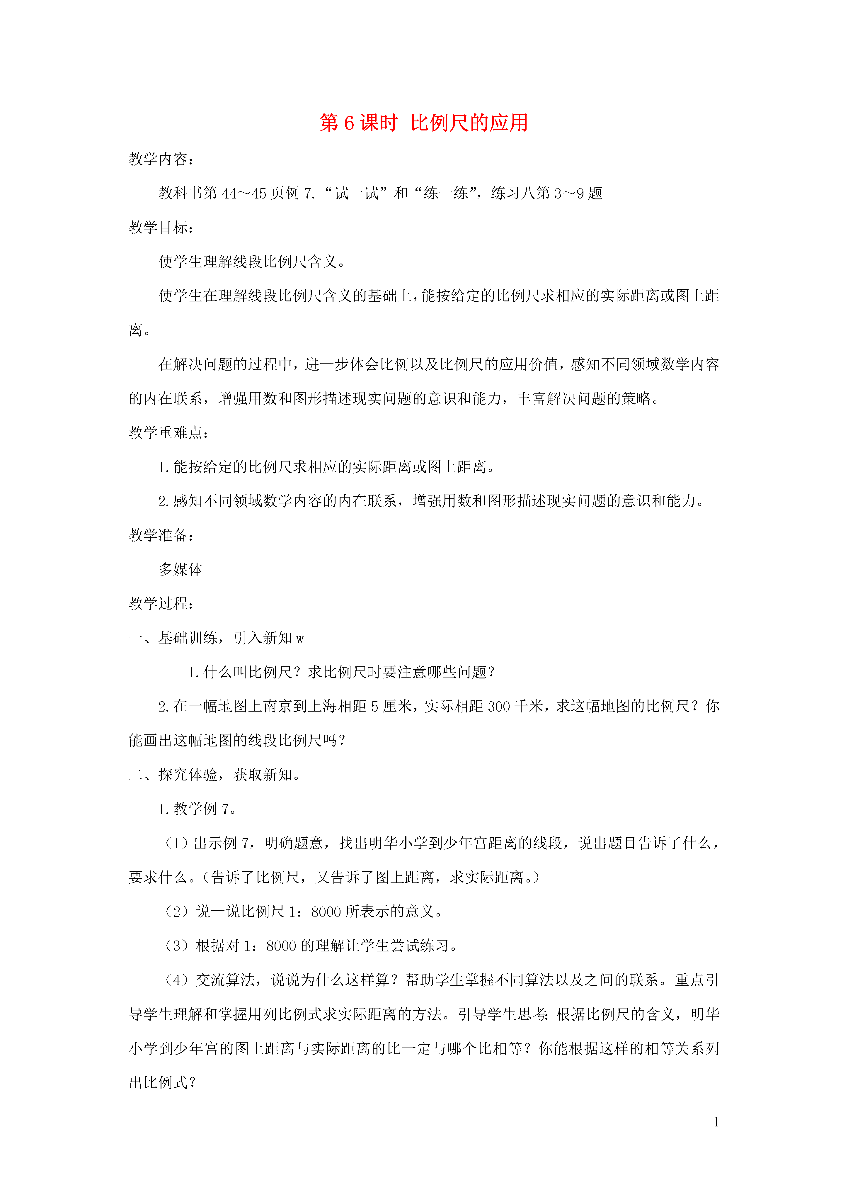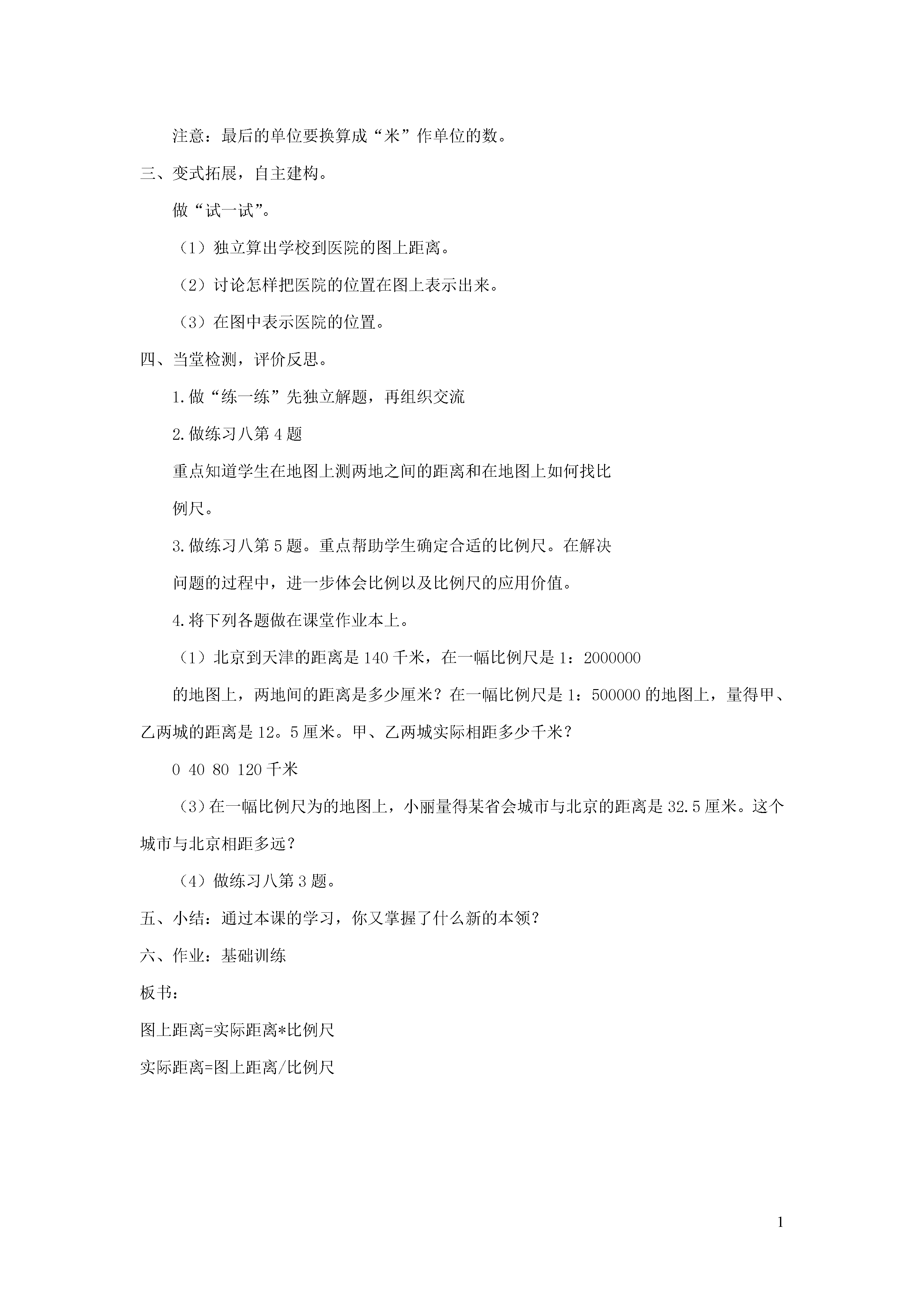 1第6课时比例尺的应用教学内容:教科书第44~45页例7.“试一试”和“练一练”,练习八第3~9题教学目标:使学生理解线段比例尺含义。使学生在理解线段比例尺含义的基础上,能按给定的比例尺求相应的实际距离或图上距离。在解决问题的过程中,进一步体会比例以及比例尺的应用价值,感知不同领域数学内容的内在联系,增强用数和图形描述现实问题的意识和能力,丰富解决问题的策略。教学重难点:1.能按给定的比例尺求相应的实际距离或图上距离。2.感知不同领域数学内容的内在联系,增强用数和图形描述现实问题的意识和能力。教学准备:多媒体教学过程:一、基础训练,引入新知w1.什么叫比例尺?求比例尺时要注意哪些问题?2.在一幅地图上南京到上海相距5厘米,实际相距300千米,求这幅地图的比例尺?你能画出这幅地图的线段比例尺吗?二、探究体验,获取新知。1.教学例7。(1)出示例7,明确题意,找出明华小学到少年宫距离的线段,说出题目告诉了什么,要求什么。(告诉了比例尺,又告诉了图上距离,求实际距离。)(2)说一说比例尺1:8000所表示的意义。(3)根据对1:8000的理解让学生尝试练习。(4)交流算法,说说为什么这样算?帮助学生掌握不同算法以及之间的联系。重点引导学生理解和掌握用列比例式求实际距离的方法。引导学生思考:根据比例尺的含义,明华小学到少年宫的图上距离与实际距离的比一定与哪个比相等?你能根据这样的相等关系列出比例式?注意:最后的单位要换算成“米”作单位的数。三、变式拓展,自主建构。做“试一试”。(1)独立算出学校到医院的图上距离。(2)讨论怎样把医院的位置在图上表示出来。(3)在图中表示医院的位置。四、当堂检测,评价反思。1.做“练一练”先独立解题,再组织交流2.做练习八第4题重点知道学生在地图上测两地之间的距离和在地图上如何找比例尺。3.做练习八第5题。重点帮助学生确定合适的比例尺。在解决问题的过程中,进一步体会比例以及比例尺的应用价值。4.将下列各题做在课堂作业本上。(1)北京到天津的距离是140千米,在一幅比例尺是1:2000000的地图上,两地间的距离是多少厘米?在一幅比例尺是1:500000的地图上,量得甲、乙两城的距离是12。5厘米。甲、乙两城实际相距多少千米?04080120千米(3)在一幅比例尺为的地图上,小丽量得某省会城市与北京的距离是32.5厘米。这个城市与北京相距多远?(4)做练习八第3题。五、小结:通过本课的学习,你又掌握了什么新的本领?六、作业:基础训练板书:图上距离=实际距离*比例尺实际距离=图上距离/比例尺