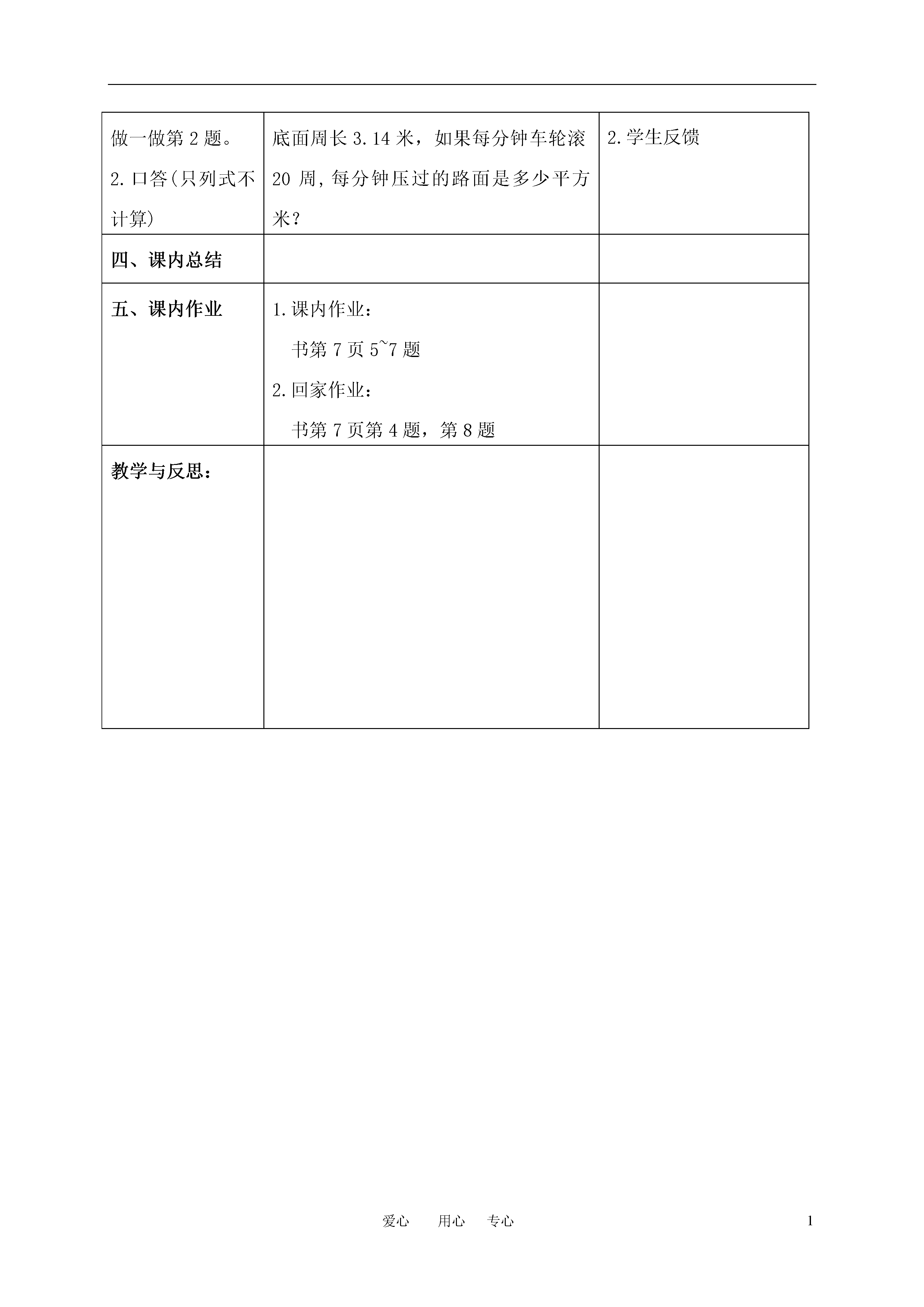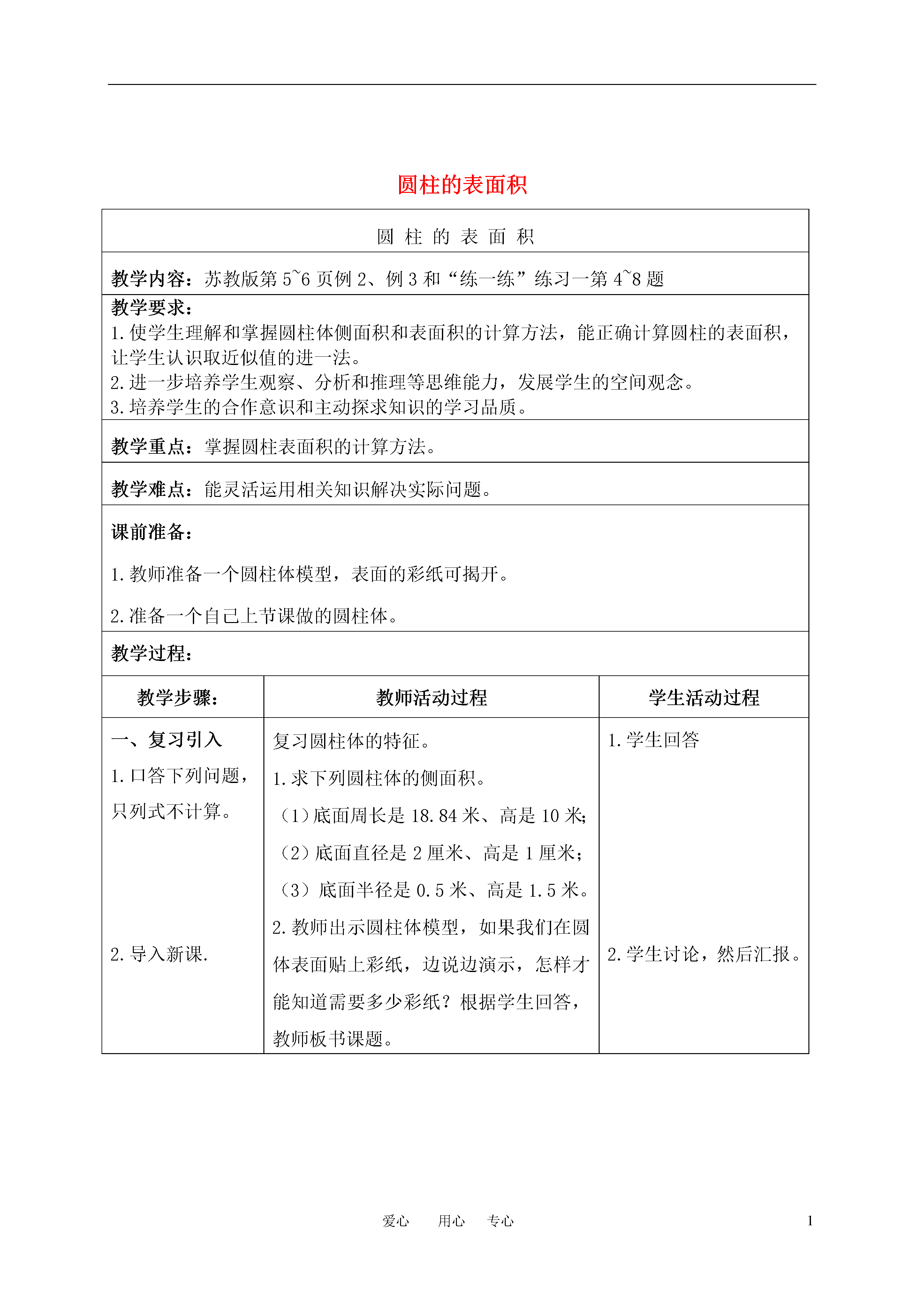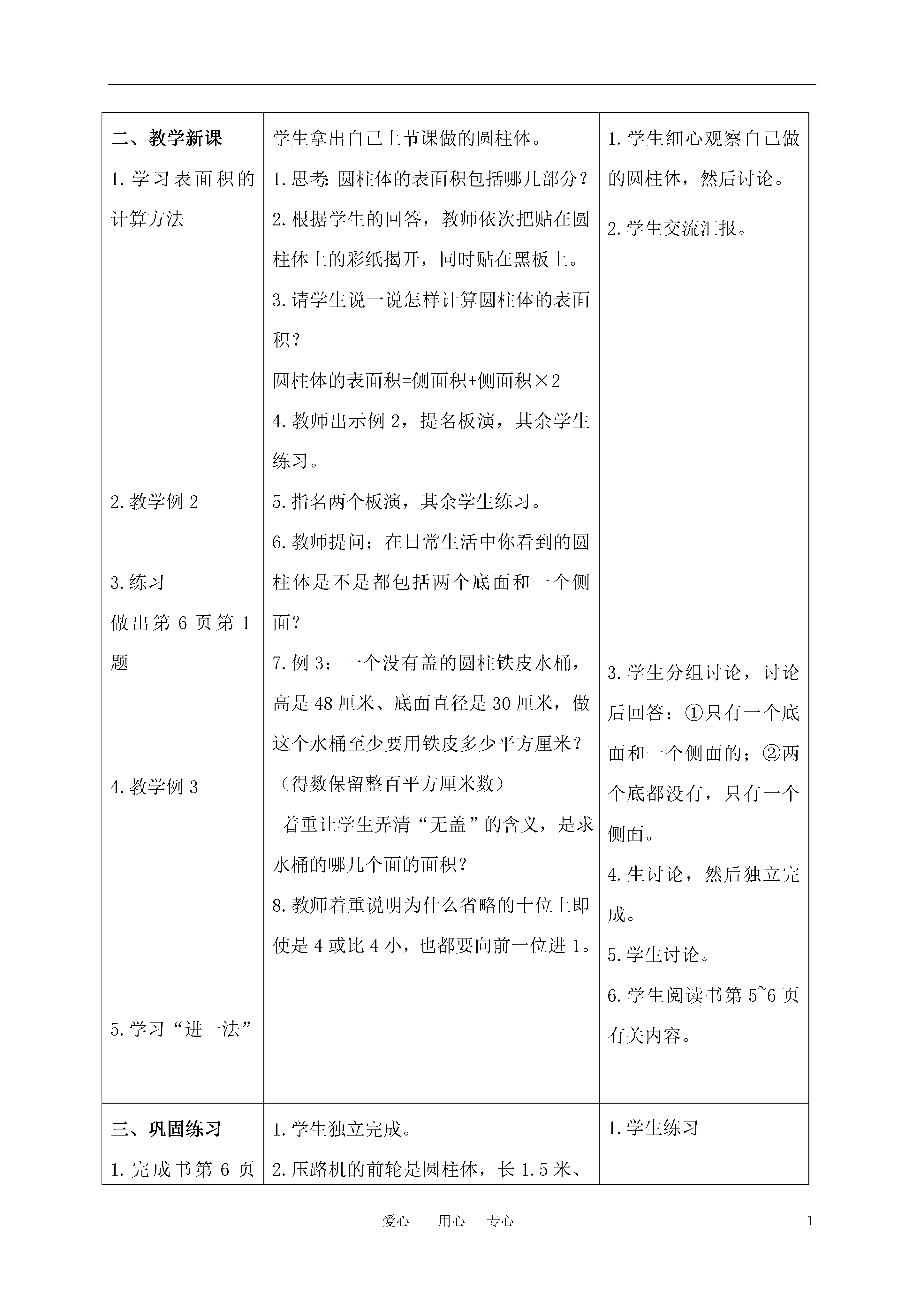 1爱心用心专心圆柱的表面积圆柱的表面积教学内容:苏教版第5~6页例2、例3和“练一练”练习一第4~8题教学要求:1.使学生理解和掌握圆柱体侧面积和表面积的计算方法,能正确计算圆柱的表面积,让学生认识取近似值的进一法。2.进一步培养学生观察、分析和推理等思维能力,发展学生的空间观念。3.培养学生的合作意识和主动探求知识的学习品质。教学重点:掌握圆柱表面积的计算方法。教学难点:能灵活运用相关知识解决实际问题。课前准备:1.教师准备一个圆柱体模型,表面的彩纸可揭开。2.准备一个自己上节课做的圆柱体。教学过程:教学步骤:教师活动过程学生活动过程一、复习引入1.口答下列问题,只列式不计算。2.导入新课.复习圆柱体的特征。1.求下列圆柱体的侧面积。(1)底面周长是18.84米、高是10米;(2)底面直径是2厘米、高是1厘米;(3)底面半径是0.5米、高是1.5米。2.教师出示圆柱体模型,如果我们在圆体表面贴上彩纸,边说边演示,怎样才能知道需要多少彩纸?根据学生回答,教师板书课题。1.学生回答2.学生讨论,然后汇报。二、教学新课1.学习表面积的计算方法2.教学例23.练习做出第1题4.教学例35.学习“进一法”学生拿出自己上节课做的圆柱体。1.思考:圆柱体的表面积包括哪几部分?2.根据学生的回答,教师依次把贴在圆柱体上的彩纸揭开,同时贴在黑板上。3.请学生说一说怎样计算圆柱体的表面积?圆柱体的表面积=侧面积+侧面积×24.教师出示例2,提名板演,其余学生练习。5.指名两个板演,其余学生练习。6.教师提问:在日常生活中你看到的圆柱体是不是都包括两个底面和一个侧面?7.例3:一个没有盖的圆柱铁皮水桶,高是48厘米、底面直径是30厘米,做这个水桶至少要用铁皮多少平方厘米?(得数保留整百平方厘米数)着重让学生弄清“无盖”的含义,是求水桶的哪几个面的面积?8.教师着重说明为什么省略的十位上即使是4或比4小,也都要向前一位进1。1.学生细心观察自己做的圆柱体,然后讨论。2.学生交流汇报。3.学生分组讨论,讨论后回答:①只有一个底面和一个侧面的;②两个底都没有,只有一个侧面。4.生讨论,然后独立完成。5.学生讨论。6.学生阅读书第5~6页有关内容。三、巩固练习1.完成书做一做第2题。2.口答(只列式不计算)1.学生独立完成。2.压路机的前轮是圆柱体,长1.5米、底面周长3.14米,如果每分钟车轮滚20周,每分钟压过的路面是多少平方米?1.学生练习2.学生反馈四、课内总结五、课内作业1.课内作业:书5~7题2.回家作业:书第4题,第8题教学与反思: