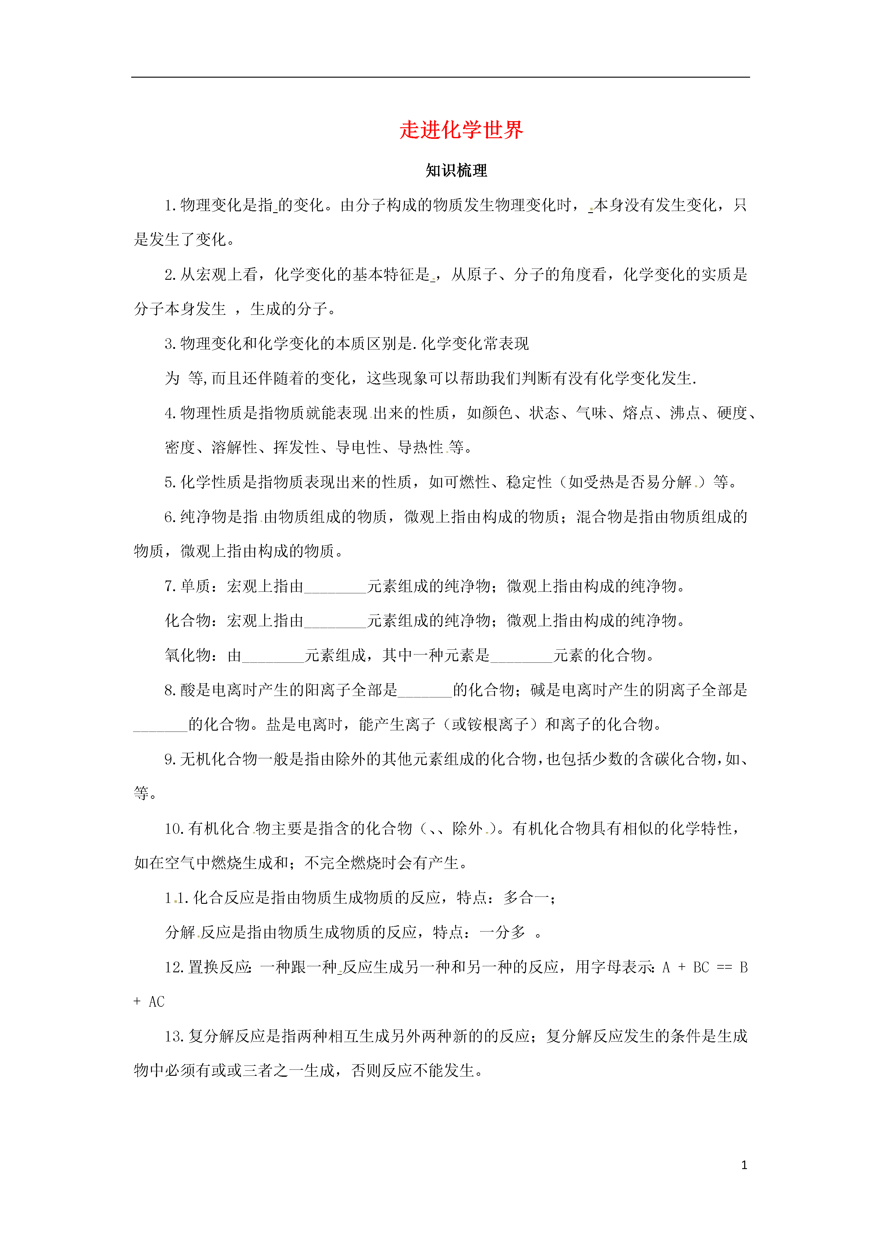 1走进化学世界知识梳理1.物理变化是指的变化。由分子构成的物质发生物理变化时,本身没有发生变化,只是发生了变化。2.从宏观上看,化学变化的基本特征是,从原子、分子的角度看,化学变化的实质是分子本身发生,生成的分子。3.物理变化和化学变化的本质区别是.化学变化常表现为等,而且还伴随着的变化,这些现象可以帮助我们判断有没有化学变化发生.4.物理性质是指物质就能表现出来的性质,如颜色、状态、气味、熔点、沸点、硬度、密度、溶解性、挥发性、导电性、导热性等。5.化学性质是指物质表现出来的性质,如可燃性、稳定性(如受热是否易分解)等。6.纯净物是指由物质组成的物质,微观上指由构成的物质;混合物是指由物质组成的物质,微观上指由构成的物质。7.单质:宏观上指由________元素组成的纯净物;微观上指由构成的纯净物。化合物:宏观上指由________元素组成的纯净物;微观上指由构成的纯净物。氧化物:由________元素组成,其中一种元素是________元素的化合物。8.酸是电离时产生的阳离子全部是_______的化合物;碱是电离时产生的阴离子全部是_______的化合物。盐是电离时,能产生离子(或铵根离子)和离子的化合物。9.无机化合物一般是指由除外的其他元素组成的化合物,也包括少数的含碳化合物,如、等。10.有机化合物主要是指含的化合物(、、除外)。有机化合物具有相似的化学特性,如在空气中燃烧生成和;不完全燃烧时会有产生。11.化合反应是指由物质生成物质的反应,特点:多合一;分解反应是指由物质生成物质的反应,特点:一分多。12.置换反应:一种跟一种反应生成另一种和另一种的反应,用字母表示:A+BC==B+AC13.复分解反应是指两种相互生成另外两种新的的反应;复分解反应发生的条件是生成物中必须有或或三者之一生成,否则反应不能发生。