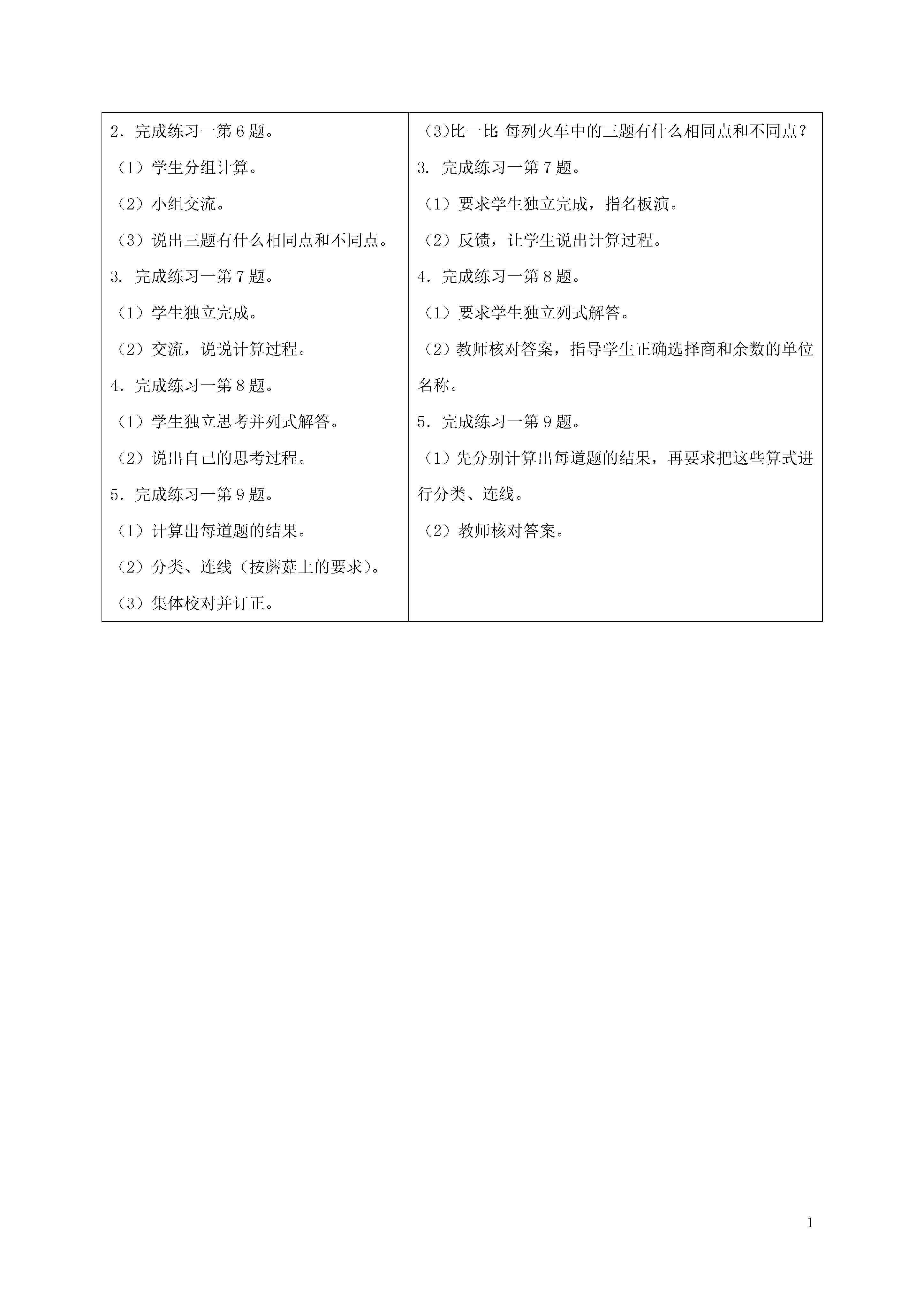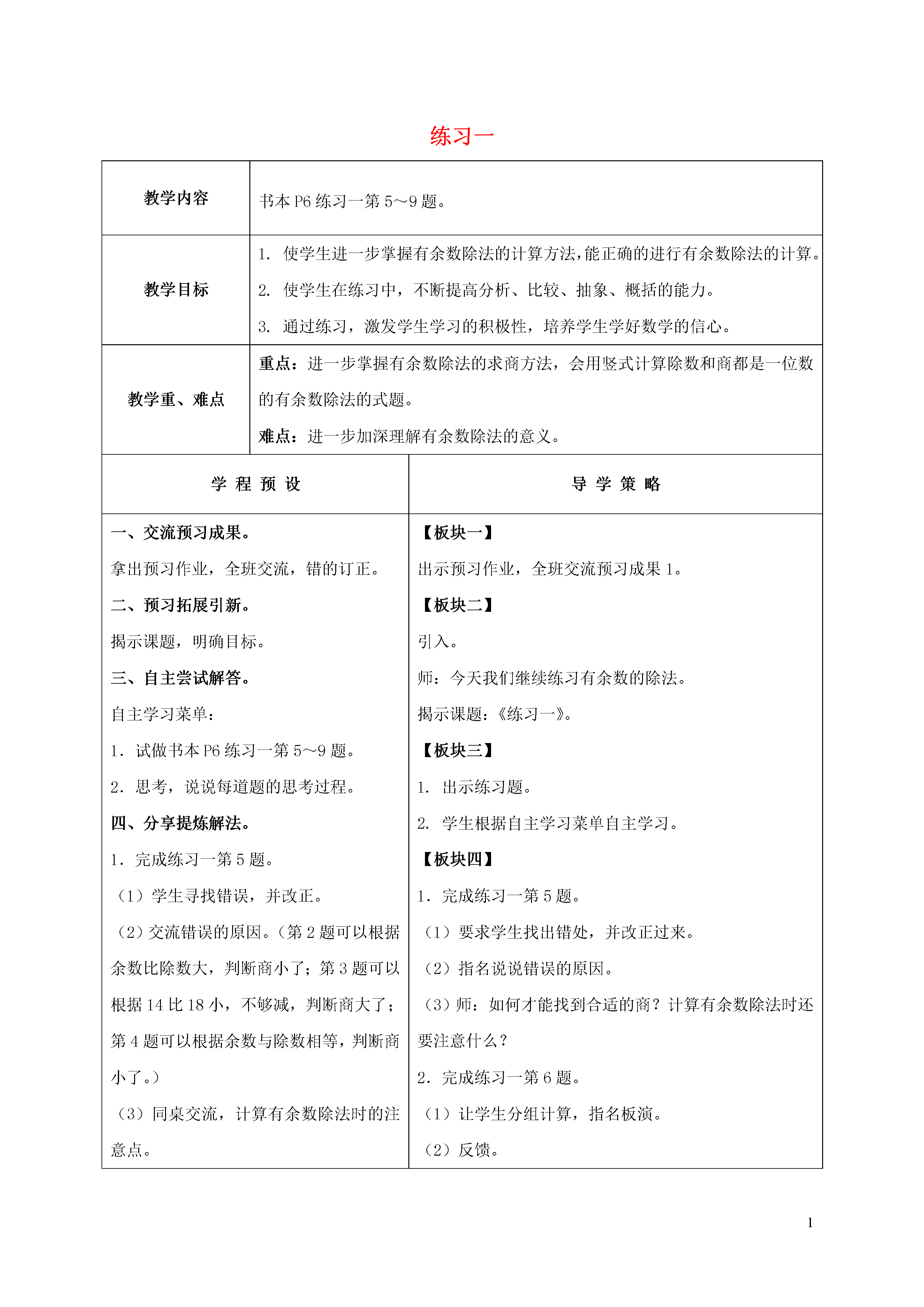 1练习一教学内容书本P6练习一第5~9题。教学目标1.使学生进一步掌握有余数除法的计算方法,能正确的进行有余数除法的计算。2.使学生在练习中,不断提高分析、比较、抽象、概括的能力。3.通过练习,激发学生学习的积极性,培养学生学好数学的信心。教学重、难点重点:进一步掌握有余数除法的求商方法,会用竖式计算除数和商都是一位数的有余数除法的式题。难点:进一步加深理解有余数除法的意义。学程预设导学策略一、交流预习成果。拿出预习作业,全班交流,错的订正。二、预习拓展引新。揭示课题,明确目标。三、自主尝试解答。自主学习菜单:1.试做书本P6练习一第5~9题。2.思考,说说每道题的思考过程。四、分享提炼解法。1.完成练习一第5题。(1)学生寻找错误,并改正。(2)交流错误的原因。(第2题可以根据余数比除数大,判断商小了;第3题可以根据14比18小,不够减,判断商大了;第4题可以根据余数与除数相等,判断商小了。)(3)同桌交流,计算有余数除法时的注意点。2.完成练习一第6题。(1)学生分组计算。(2)小组交流。(3)说出三题有什么相同点和不同点。3.完成练习一第7题。(1)学生独立完成。(2)交流,说说计算过程。4.完成练习一第8题。(1)学生独立思考并列式解答。(2)说出自己的思考过程。5.完成练习一第9题。(1)计算出每道题的结果。(2)分类、连线(按蘑菇上的要求)。(3)集体校对并订正。【板块一】出示预习作业,全班交流预习成果1。【板块二】引入。师:今天我们继续练习有余数的除法。揭示课题:《练习一》。【板块三】1.出示练习题。2.学生根据自主学习菜单自主学习。【板块四】1.完成练习一第5题。(1)要求学生找出错处,并改正过来。(2)指名说说错误的原因。(3)师:如何才能找到合适的商?计算有余数除法时还要注意什么?2.完成练习一第6题。(1)让学生分组计算,指名板演。(2)反馈。(3)比一比:每列火车中的三题有什么相同点和不同点?3.完成练习一第7题。(1)要求学生独立完成,指名板演。(2)反馈,让学生说出计算过程。4.完成练习一第8题。(1)要求学生独立列式解答。(2)教师核对答案,指导学生正确选择商和余数的单位名称。5.完成练习一第9题。(1)先分别计算出每道题的结果,再要求把这些算式进行分类、连线。(2)教师核对答案。