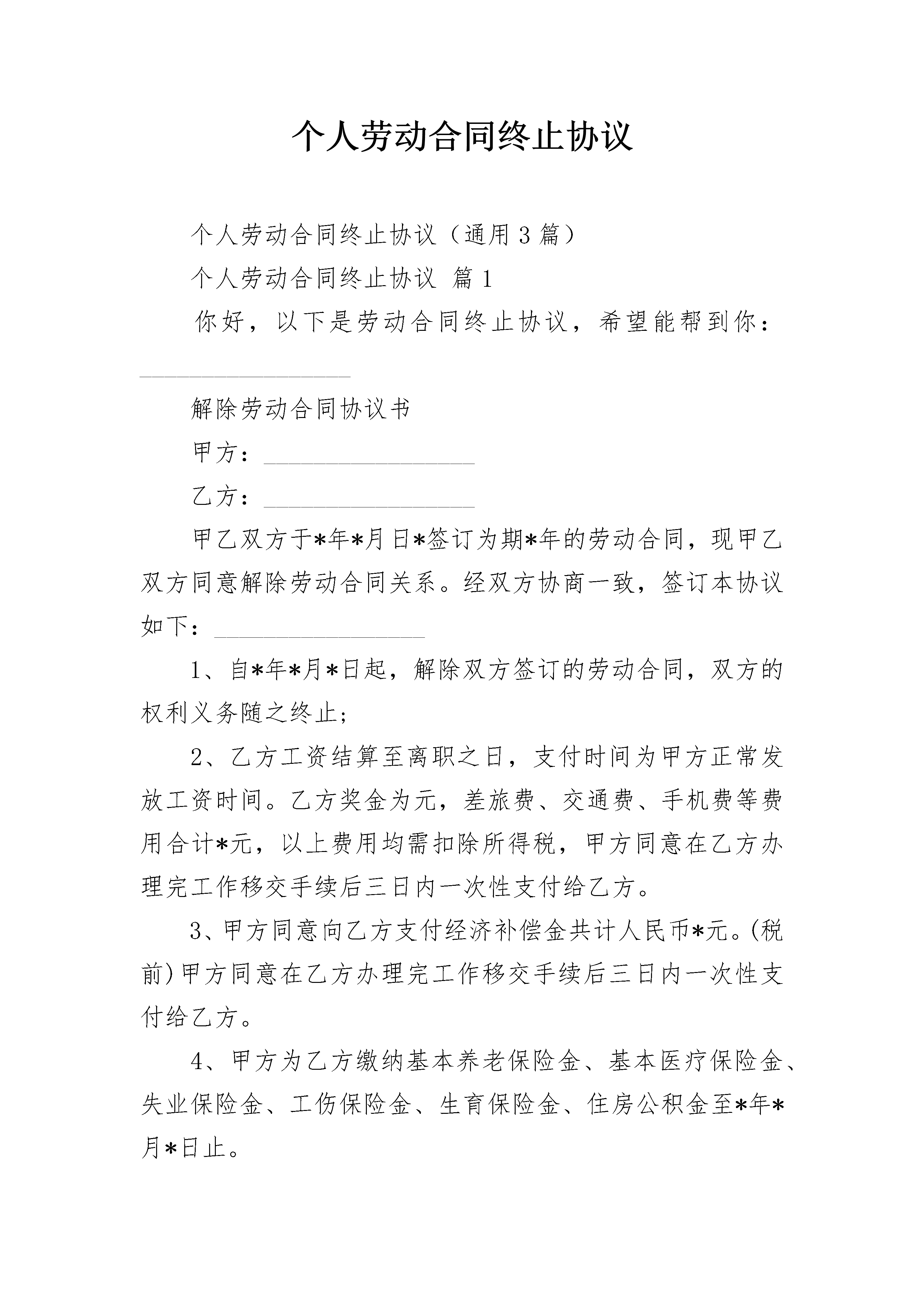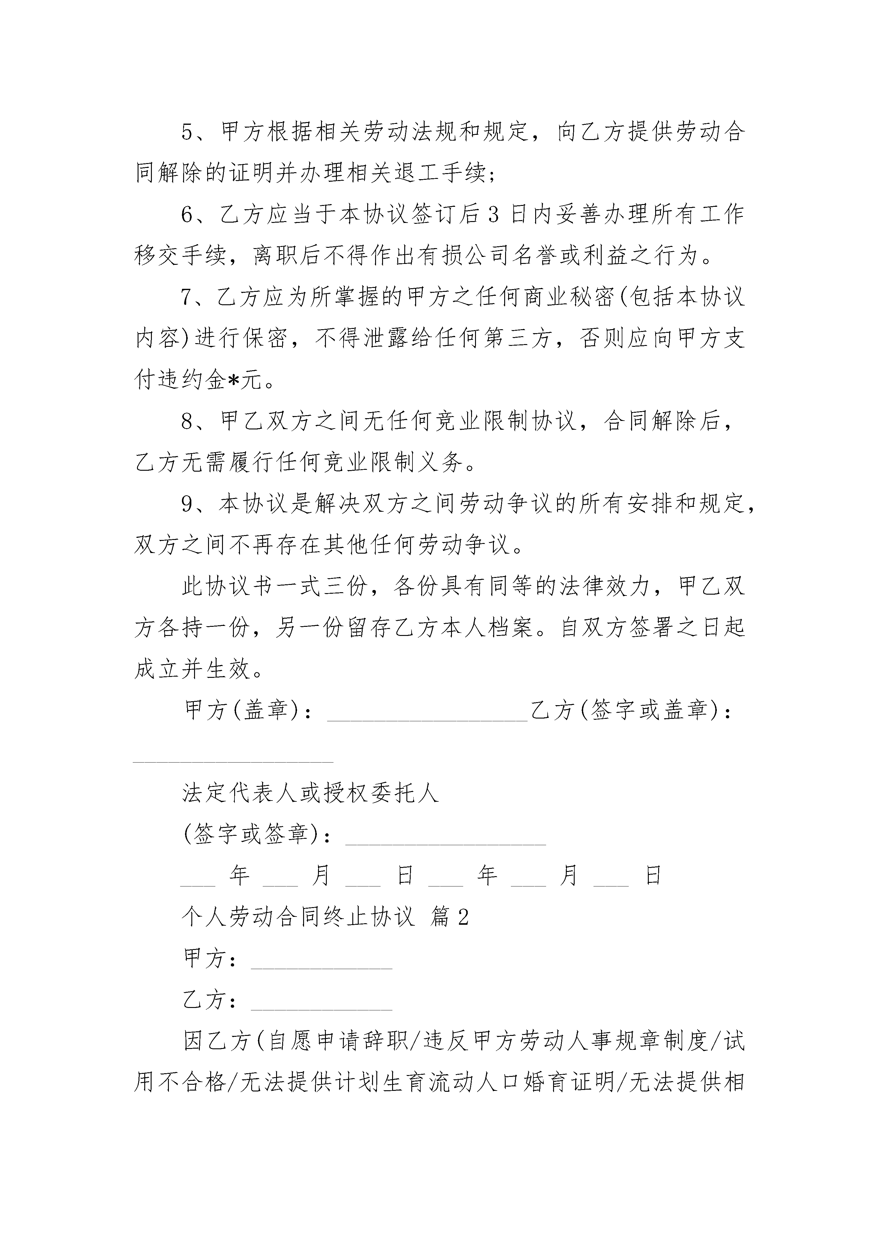 个人劳动合同终止协议个人劳动合同终止协议(通用3篇)个人劳动合同终止协议篇1你好,以下是劳动合同终止协议,希望能帮到你:_________________解除劳动合同协议书甲方:_________________乙方:_________________甲乙双方于*年*月日*签订为期*年的劳动合同,现甲乙双方同意解除劳动合同关系。经双方协商一致,签订本协议如下:_________________1、自*年*月*日起,解除双方签订的劳动合同,双方的权利义务随之终止;2、乙方工资结算至离职之日,支付时间为甲方正常发放工资时间。乙方奖金为元,差旅费、交通费、手机费等费用合计*元,以上费用均需扣除所得税,甲方同意在乙方办理完工作移交手续后三日内一次性支付给乙方。3、甲方同意向乙方支付经济补偿金共计人民币*元。(税前)甲方同意在乙方办理完工作移交手续后三日内一次性支付给乙方。4、甲方为乙方缴纳基本养老保险金、基本医疗保险金、失业保险金、工伤保险金、生育保险金、住房公积金至*年*月*日止。5、甲方根据相关劳动法规和规定,向乙方提供劳动合同解除的证明并办理相关退工手续;6、乙方应当于本协议签订后3日内妥善办理所有工作移交手续,离职后不得作出有损公司名誉或利益之行为。7、乙方应为所掌握的甲方之任何商业秘密(包括本协议内容)进行保密,不得泄露给任何第三方,否则应向甲方支付违约金*元。8、甲乙双方之间无任何竞业限制协议,合同解除后,乙方无需履行任何竞业限制义务。9、本协议是解决双方之间劳动争议的所有安排和规定,双方之间不再存在其他任何劳动争议。此协议书一式三份,各份具有同等的法律效力,甲乙双方各持一份,另一份留存乙方本人档案。自双方签署之日起成立并生效。甲方(盖章):_________________乙方(签字或盖章):_________________法定代表人或授权委托人(签字或签章):____________________年___月___日___年___月___日个人劳动合同终止协议篇2甲方:____________乙方:____________因乙方(自愿申请辞职/违反甲方劳动人事规章制度/试用不合格/无法提供计划生育流动人口婚育证明/无法提供相关岗位从业资格证/身份证过期/)(或因甲乙双方劳动合同期满),经双方协商一致,解除劳动合同,中止劳动关系,达成协议如下:一、______年______月______日为双方劳动关系终止日,从次日起原双方所签订的劳动合同自动失效,甲乙双方均不再为对方承担或履行任何责任义务。二、______年______月______日下午办理工作交接,并于交接完成后立即结清工资及相关福利待遇。三、______年______月______日乙方需交出宿舍甲方财物,并结清乙方承担的相关住宿费用(如水电费、卫生费等),否则,甲方有权在结算其工资福利待遇时代扣。四、乙方移交工作需写出明细清单,移交后若涉及到第三方利益的移交遗漏,虽双方已乙方也需协助甲方解决。五、双方解除劳动关系后,若在原劳动合同期间涉及到的法律问题,双方均有责任和义务配合解决。六、在解除劳动合同及劳动关系后一年内,双方须保证以下之一有效通讯方式能与之联系:七、______年______月______日前,甲方将停交乙方社保,同时甲方将中止乙方的人身意外伤害保险。甲方:____________乙方:____________日期:____________个人劳动合同终止协议篇3甲方:上海名正企业管理有限公司乙方:身份证号:__________________________________(附派遣员工登记表)甲方聘用乙方为甲方人才派遣员工,乙方已经了解并同意甲方与本合同首次的用工单位合作协议的合作条款。根据《中华人民共和国劳动合同法》(以下简称《劳动法》)及其它有关法律、法规,甲、乙双方在自愿、平等、协商一致的基础上,签订本合同。第一条合同期限:1、依照劳动合同法中关于人才派遣的有关的规定,本合同期限自签署日起两年有效,首次用工单位为:______________________________,工作岗位为:___________,工作期限为2年,试用期为2个月。2、如乙方被用工单位退回,甲方有义务另行将乙方派遣到类似岗位就职,如乙方未被甲方派往其他用工单位就职,须按时在甲指定地点进行政治学习、上岗培训等业务学习,同时,甲方应按乙方工作地政府公布的最低月工资数发给乙方,直至乙方被派遣工作或本合同终止为止。3、如乙方拒绝上岗培训、学习或执行其他派遣义务,甲方可依据员工代表大会和工会的有关规定,确定乙方拒绝派遣或学习的行为,脱离了甲方管理,属于单方解除与甲方的劳动关系,甲方应同意乙方的协商解除行为,本合同可以依法解除,甲乙双方均无任何经济承担责任。第二条工作岗