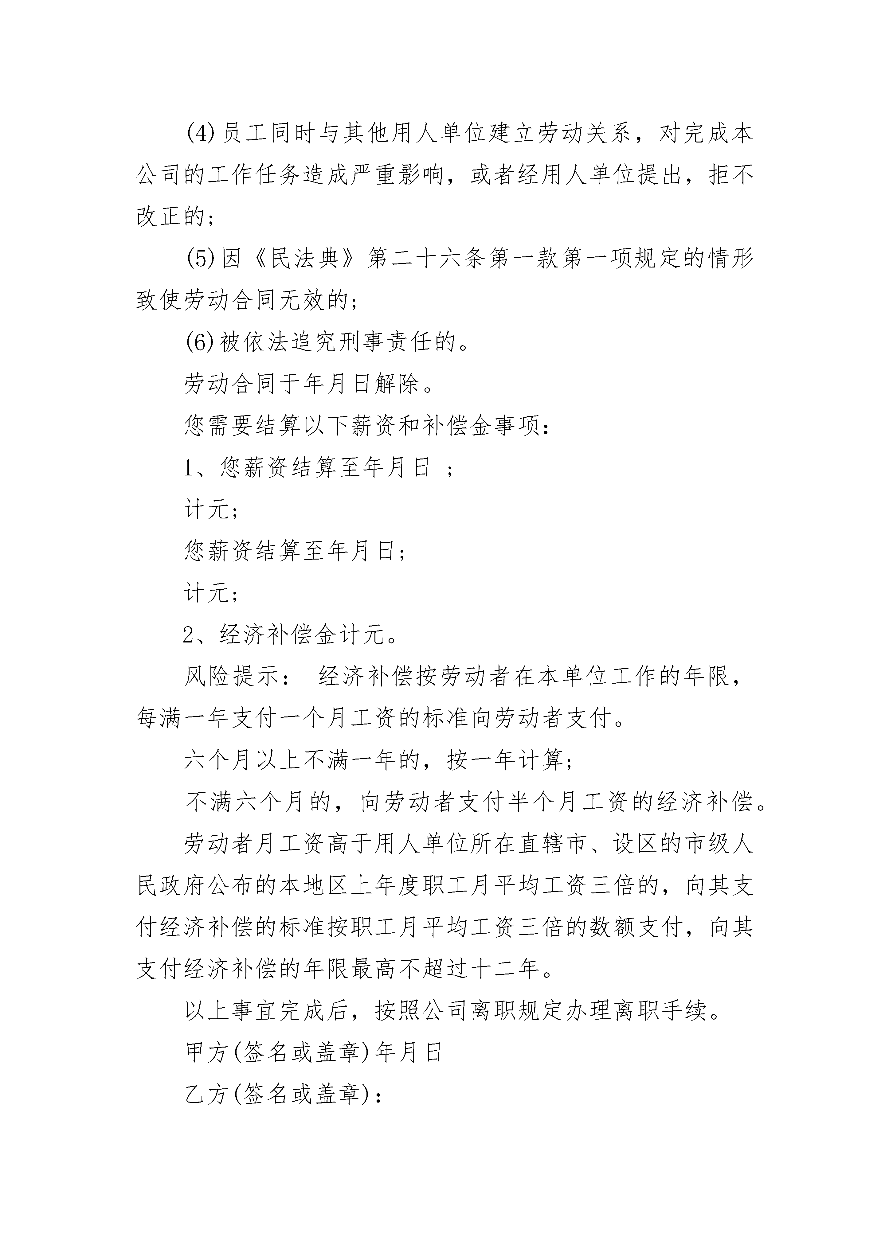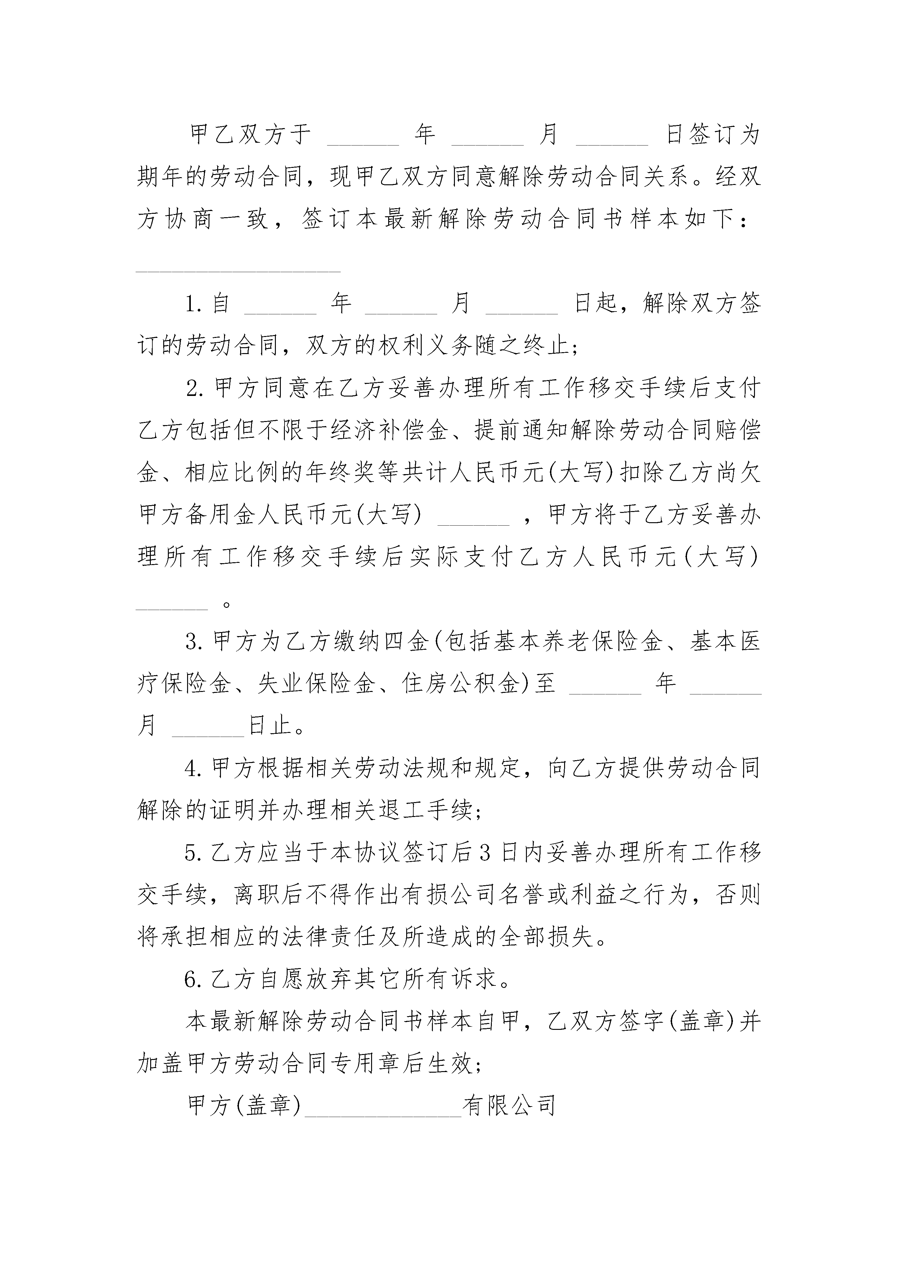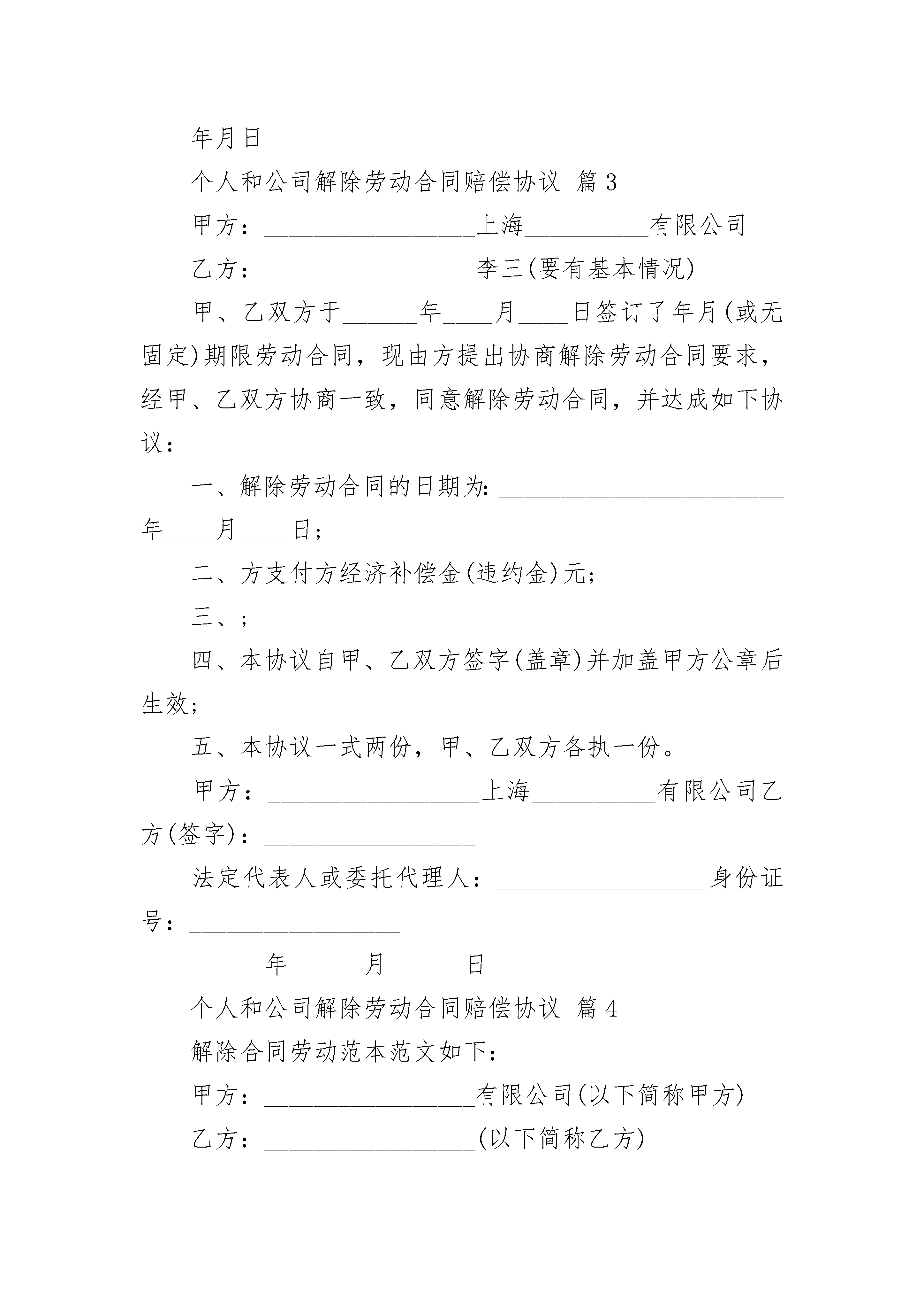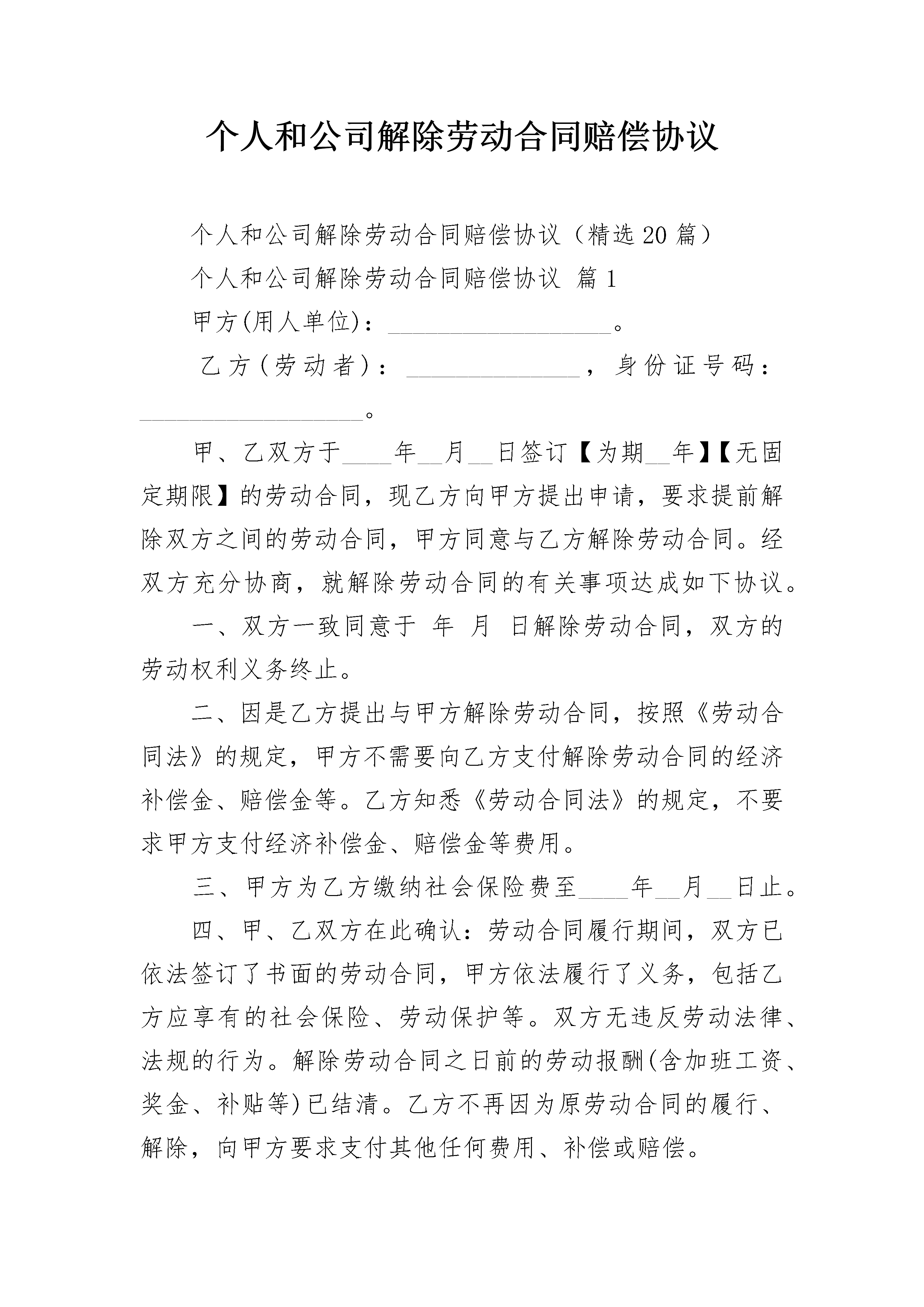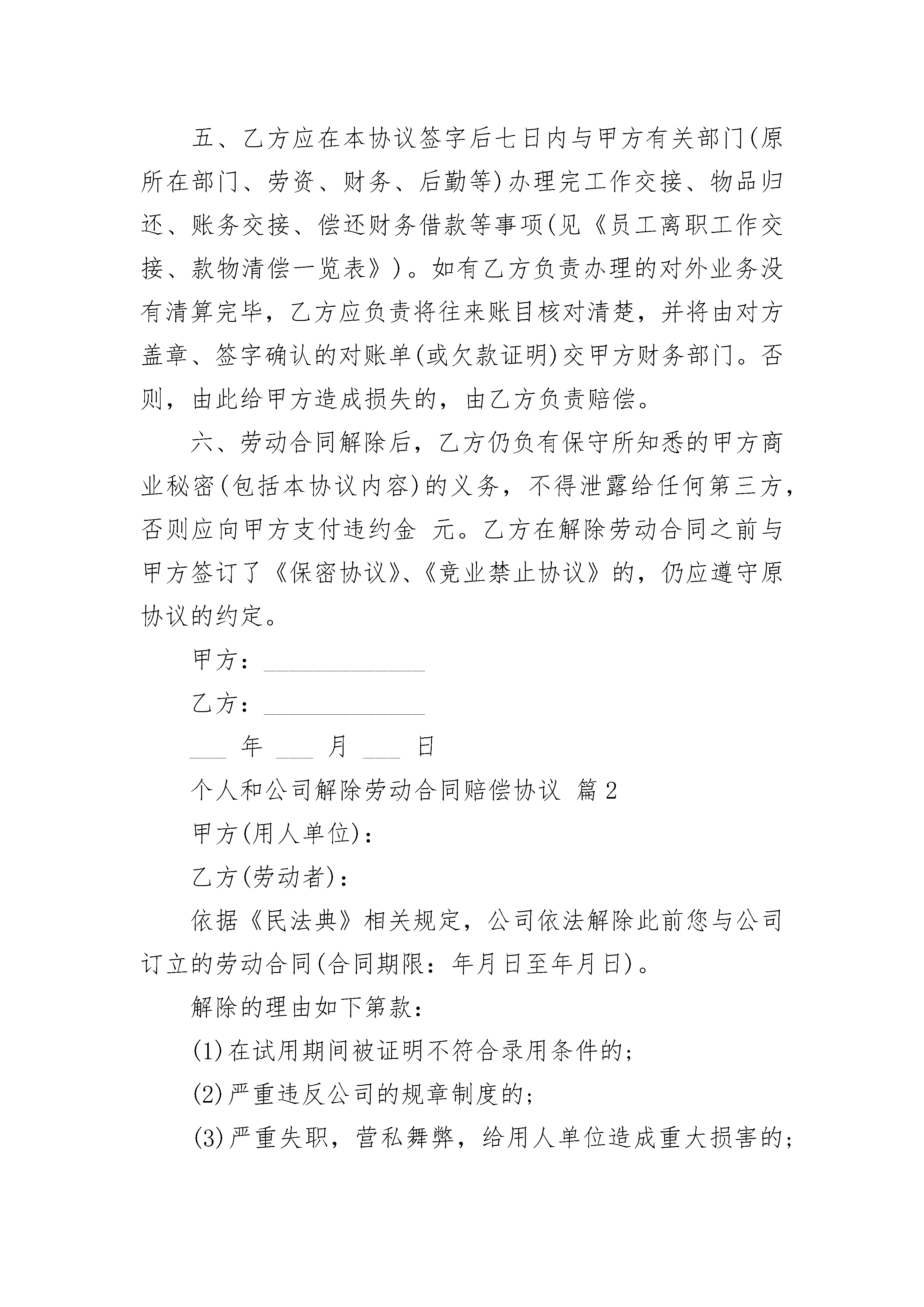 个人和公司解除劳动合同赔偿协议个人和公司解除劳动合同赔偿协议(精选20篇)个人和公司解除劳动合同赔偿协议篇1甲方(用人单位):__________________。乙方(劳动者):______________,身份证号码:__________________。甲、乙双方于____年__月__日签订【为期__年】【无固定期限】的劳动合同,现乙方向甲方提出申请,要求提前解除双方之间的劳动合同,甲方同意与乙方解除劳动合同。经双方充分协商,就解除劳动合同的有关事项达成如下协议。一、双方一致同意于年月日解除劳动合同,双方的劳动权利义务终止。二、因是乙方提出与甲方解除劳动合同,按照《劳动合同法》的规定,甲方不需要向乙方支付解除劳动合同的经济补偿金、赔偿金等。乙方知悉《劳动合同法》的规定,不要求甲方支付经济补偿金、赔偿金等费用。三、甲方为乙方缴纳社会保险费至____年__月__日止。四、甲、乙双方在此确认:劳动合同履行期间,双方已依法签订了书面的劳动合同,甲方依法履行了义务,包括乙方应享有的社会保险、劳动保护等。双方无违反劳动法律、法规的行为。解除劳动合同之日前的劳动报酬(含加班工资、奖金、补贴等)已结清。乙方不再因为原劳动合同的履行、解除,向甲方要求支付其他任何费用、补偿或赔偿。五、乙方应在本协议签字后七日内与甲方有关部门(原所在部门、劳资、财务、后勤等)办理完工作交接、物品归还、账务交接、偿还财务借款等事项(见《员工离职工作交接、款物清偿一览表》)。如有乙方负责办理的对外业务没有清算完毕,乙方应负责将往来账目核对清楚,并将由对方盖章、签字确认的对账单(或欠款证明)交甲方财务部门。否则,由此给甲方造成损失的,由乙方负责赔偿。六、劳动合同解除后,乙方仍负有保守所知悉的甲方商业秘密(包括本协议内容)的义务,不得泄露给任何第三方,否则应向甲方支付违约金元。乙方在解除劳动合同之前与甲方签订了《保密协议》、《竞业禁止协议》的,仍应遵守原协议的约定。甲方:_____________乙方:________________年___月___日个人和公司解除劳动合同赔偿协议篇2甲方(用人单位):乙方(劳动者):依据《民法典》相关规定,公司依法解除此前您与公司订立的劳动合同(合同期限:年月日至年月日)。解除的理由如下第款:(1)在试用期间被证明不符合录用条件的;(2)严重违反公司的规章制度的;(3)严重失职,营私舞弊,给用人单位造成重大损害的;(4)员工同时与其他用人单位建立劳动关系,对完成本公司的工作任务造成严重影响,或者经用人单位提出,拒不改正的;(5)因《民法典》第二十六条第一款第一项规定的情形致使劳动合同无效的;(6)被依法追究刑事责任的。劳动合同于年月日解除。您需要结算以下薪资和补偿金事项:1、您薪资结算至年月日;计元;您薪资结算至年月日;计元;2、经济补偿金计元。风险提示:经济补偿按劳动者在本单位工作的年限,每满一年支付一个月工资的标准向劳动者支付。六个月以上不满一年的,按一年计算;不满六个月的,向劳动者支付半个月工资的经济补偿。劳动者月工资高于用人单位所在直辖市、设区的市级人民政府公布的本地区上年度职工月平均工资三倍的,向其支付经济补偿的标准按职工月平均工资三倍的数额支付,向其支付经济补偿的年限最高不超过十二年。以上事宜完成后,按照公司离职规定办理离职手续。甲方(签名或盖章)年月日乙方(签名或盖章):年月日个人和公司解除劳动合同赔偿协议篇3甲方:_________________上海__________有限公司乙方:_________________李三(要有基本情况)甲、乙双方于______年____月____日签订了年月(或无固定)期限劳动合同,现由方提出协商解除劳动合同要求,经甲、乙双方协商一致,同意解除劳动合同,并达成如下协议:一、解除劳动合同的日期为:_______________________年____月____日;二、方支付方经济补偿金(违约金)元;三、;四、本协议自甲、乙双方签字(盖章)并加盖甲方公章后生效;五、本协议一式两份,甲、乙双方各执一份。甲方:_________________上海__________有限公司乙方(签字):_________________法定代表人或委托代理人:_________________身份证号:_______________________年______月______日个人和公司解除劳动合同赔偿协议篇4解除合同劳动范本范文如下:_________________甲方:_________________有限公司(以下简称甲方)乙方:_________________(以下简称乙方)甲乙双方于______年______月______日签订为期年的劳动合同,现甲乙双方同意解除劳动合同关系。经双