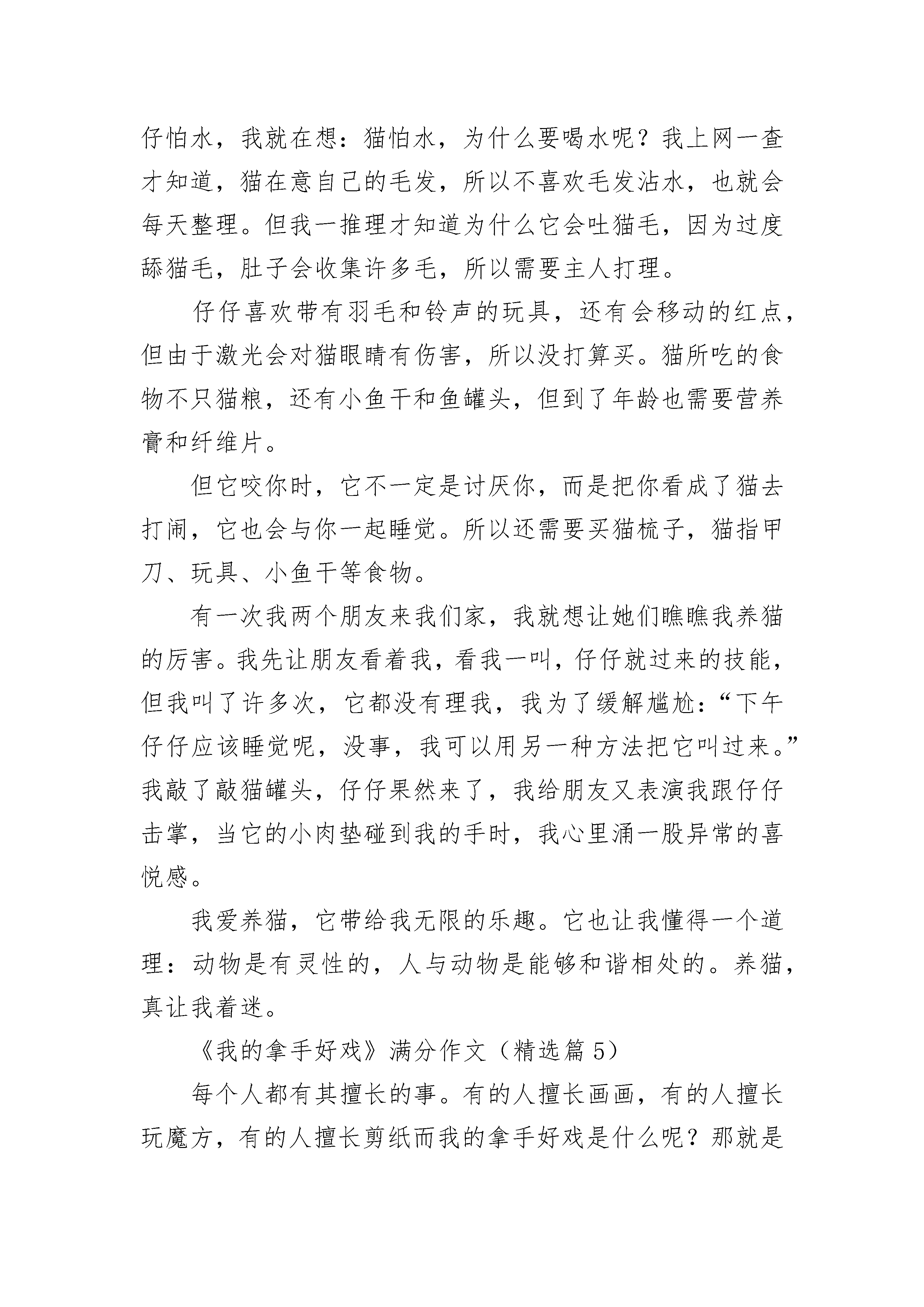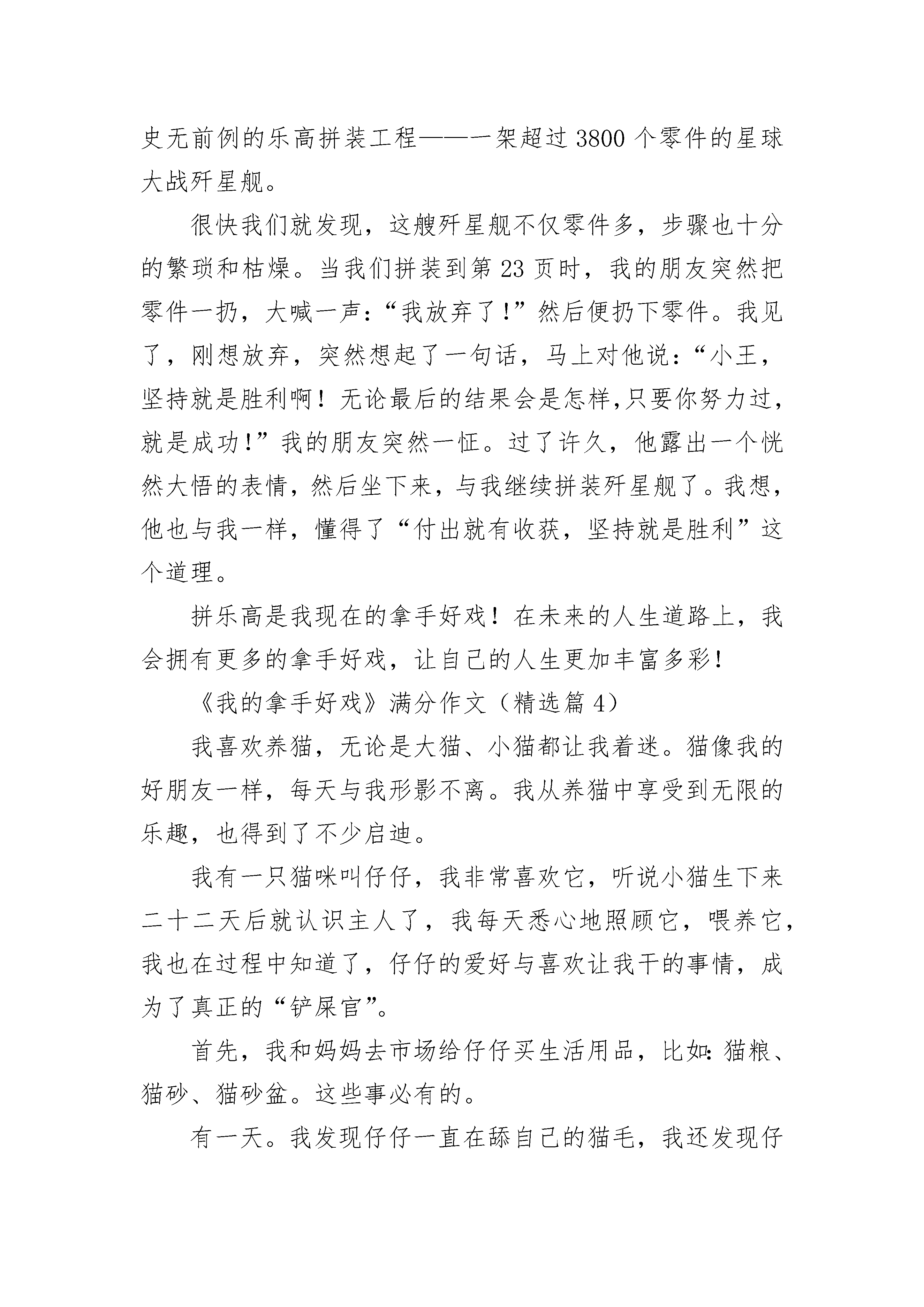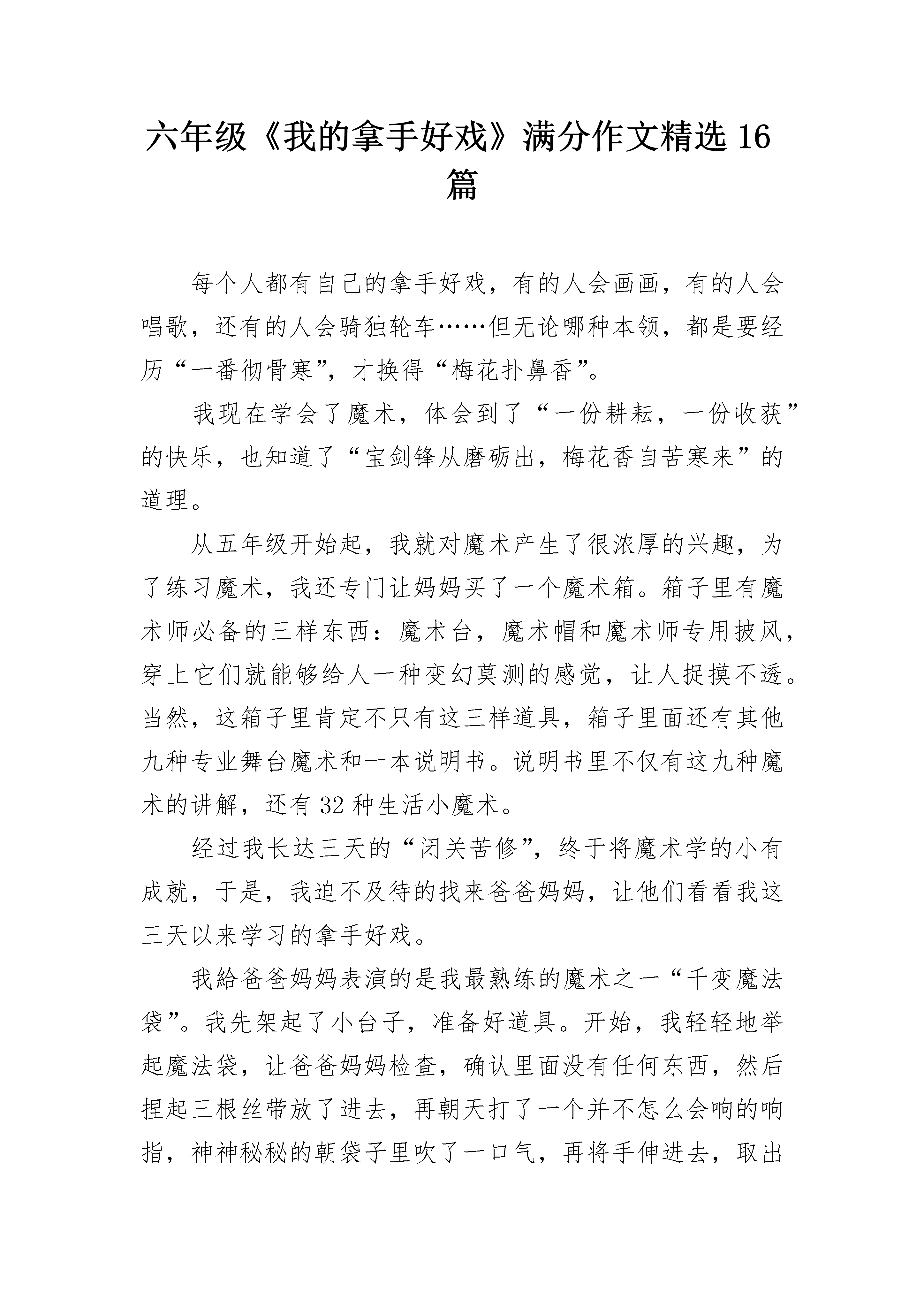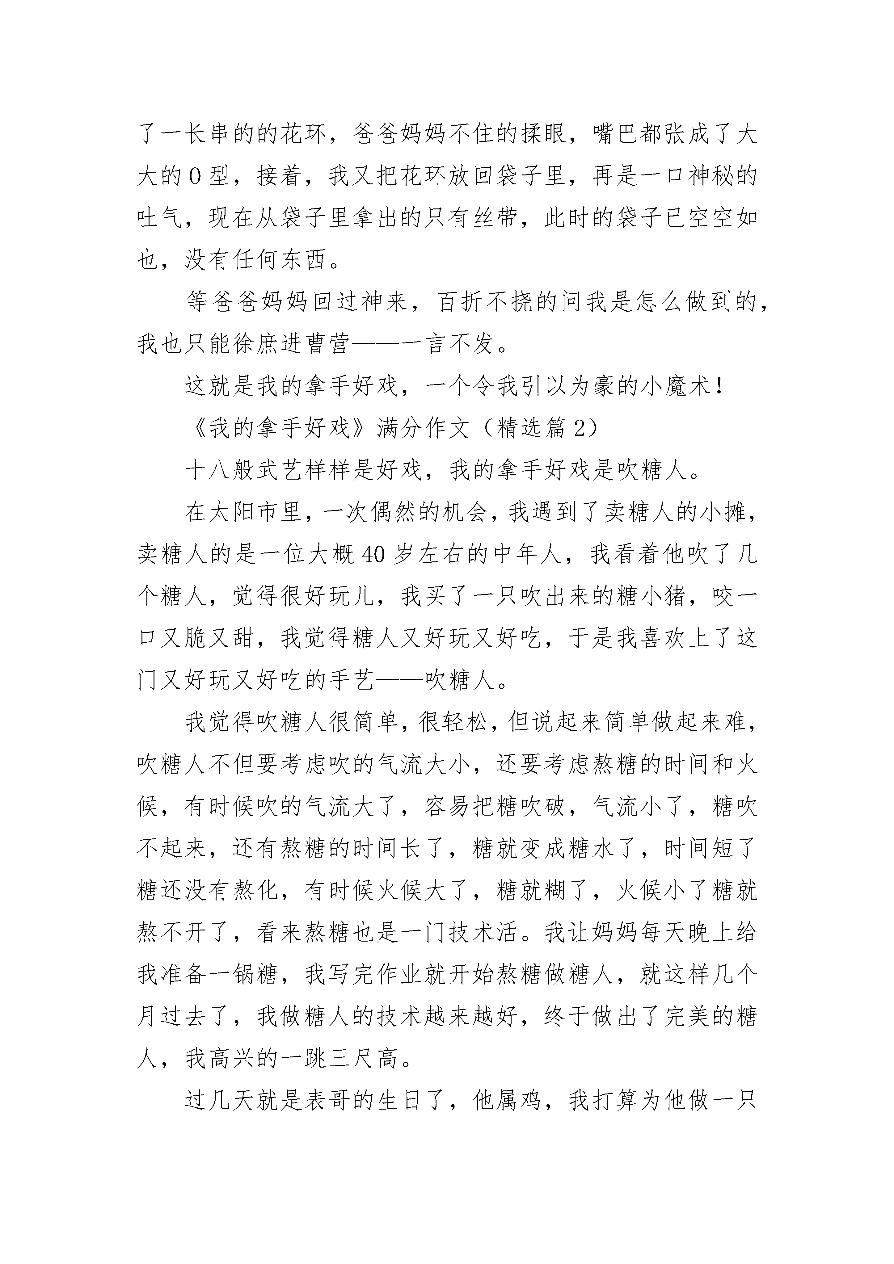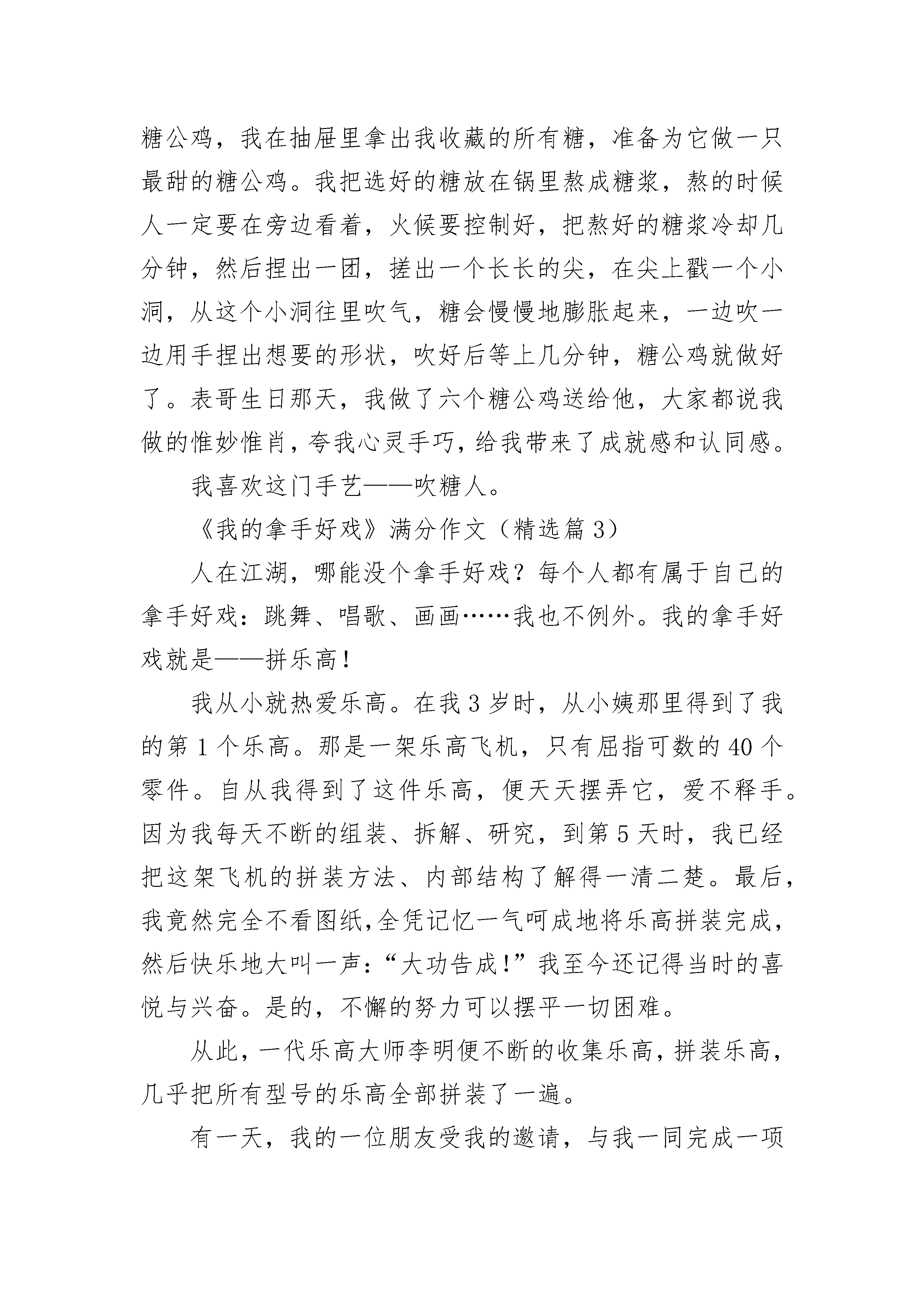 六年级《我的拿手好戏》满分作文精选16篇每个人都有自己的拿手好戏,有的人会画画,有的人会唱歌,还有的人会骑独轮车……但无论哪种本领,都是要经历“一番彻骨寒”,才换得“梅花扑鼻香”。我现在学会了魔术,体会到了“一份耕耘,一份收获”的快乐,也知道了“宝剑锋从磨砺出,梅花香自苦寒来”的道理。从五年级开始起,我就对魔术产生了很浓厚的兴趣,为了练习魔术,我还专门让妈妈买了一个魔术箱。箱子里有魔术师必备的三样东西:魔术台,魔术帽和魔术师专用披风,穿上它们就能够给人一种变幻莫测的感觉,让人捉摸不透。当然,这箱子里肯定不只有这三样道具,箱子里面还有其他九种专业舞台魔术和一本说明书。说明书里不仅有这九种魔术的讲解,还有32种生活小魔术。经过我长达三天的“闭关苦修”,终于将魔术学的小有成就,于是,我迫不及待的找来爸爸妈妈,让他们看看我这三天以来学习的拿手好戏。我給爸爸妈妈表演的是我最熟练的魔术之一“千变魔法袋”。我先架起了小台子,准备好道具。开始,我轻轻地举起魔法袋,让爸爸妈妈检查,确认里面没有任何东西,然后捏起三根丝带放了进去,再朝天打了一个并不怎么会响的响指,神神秘秘的朝袋子里吹了一口气,再将手伸进去,取出了一长串的的花环,爸爸妈妈不住的揉眼,嘴巴都张成了大大的O型,接着,我又把花环放回袋子里,再是一口神秘的吐气,现在从袋子里拿出的只有丝带,此时的袋子已空空如也,没有任何东西。等爸爸妈妈回过神来,百折不挠的问我是怎么做到的,我也只能徐庶进曹营——一言不发。这就是我的拿手好戏,一个令我引以为豪的小魔术!《我的拿手好戏》满分作文(精选篇2)十八般武艺样样是好戏,我的拿手好戏是吹糖人。在太阳市里,一次偶然的机会,我遇到了卖糖人的小摊,卖糖人的是一位大概40岁左右的中年人,我看着他吹了几个糖人,觉得很好玩儿,我买了一只吹出来的糖小猪,咬一口又脆又甜,我觉得糖人又好玩又好吃,于是我喜欢上了这门又好玩又好吃的手艺——吹糖人。我觉得吹糖人很简单,很轻松,但说起来简单做起来难,吹糖人不但要考虑吹的气流大小,还要考虑熬糖的时间和火候,有时候吹的气流大了,容易把糖吹破,气流小了,糖吹不起来,还有熬糖的时间长了,糖就变成糖水了,时间短了糖还没有熬化,有时候火候大了,糖就糊了,火候小了糖就熬不开了,看来熬糖也是一门技术活。我让妈妈每天晚上给我准备一锅糖,我写完作业就开始熬糖做糖人,就这样几个月过去了,我做糖人的技术越来越好,终于做出了完美的糖人,我高兴的一跳三尺高。过几天就是表哥的生日了,他属鸡,我打算为他做一只糖公鸡,我在抽屉里拿出我收藏的所有糖,准备为它做一只最甜的糖公鸡。我把选好的糖放在锅里熬成糖浆,熬的时候人一定要在旁边看着,火候要控制好,把熬好的糖浆冷却几分钟,然后捏出一团,搓出一个长长的尖,在尖上戳一个小洞,从这个小洞往里吹气,糖会慢慢地膨胀起来,一边吹一边用手捏出想要的形状,吹好后等上几分钟,糖公鸡就做好了。表哥生日那天,我做了六个糖公鸡送给他,大家都说我做的惟妙惟肖,夸我心灵手巧,给我带来了成就感和认同感。我喜欢这门手艺——吹糖人。《我的拿手好戏》满分作文(精选篇3)人在江湖,哪能没个拿手好戏?每个人都有属于自己的拿手好戏:跳舞、唱歌、画画……我也不例外。我的拿手好戏就是——拼乐高!我从小就热爱乐高。在我3岁时,从小姨那里得到了我的第1个乐高。那是一架乐高飞机,只有屈指可数的40个零件。自从我得到了这件乐高,便天天摆弄它,爱不释手。因为我每天不断的组装、拆解、研究,到第5天时,我已经把这架飞机的拼装方法、内部结构了解得一清二楚。最后,我竟然完全不看图纸,全凭记忆一气呵成地将乐高拼装完成,然后快乐地大叫一声:“大功告成!”我至今还记得当时的喜悦与兴奋。是的,不懈的努力可以摆平一切困难。从此,一代乐高大师李明便不断的收集乐高,拼装乐高,几乎把所有型号的乐高全部拼装了一遍。有一天,我的一位朋友受我的邀请,与我一同完成一项史无前例的乐高拼装工程——一架超过3800个零件的星球大战歼星舰。很快我们就发现,这艘歼星舰不仅零件多,步骤也十分的繁琐和枯燥。当我们拼装到时,我的朋友突然把零件一扔,大喊一声:“我放弃了!”然后便扔下零件。我见了,刚想放弃,突然想起了一句话,马上对他说:“小王,坚持就是胜利啊!无论最后的结果会是怎样,只要你努力过,就是成功!”我的朋友突然一怔。过了许久,他露出一个恍然大悟的表情,然后坐下来,与我继续拼装歼星舰了。我想,他也与我一样,懂得了“付出就有收获,坚持就是胜利”这个道理。拼乐高是我现在的拿手好戏!在未来的人生道路上,我会拥有更多的拿手好戏,让自己的人生更加丰富多彩!《我的拿手好戏》满分作文(精选篇4)我喜欢养猫,无论是大猫、小猫都让我着迷。猫像我的好朋友一样,每天与我形影不离。我从养猫中享受到无限的乐趣,也得到了不少启迪