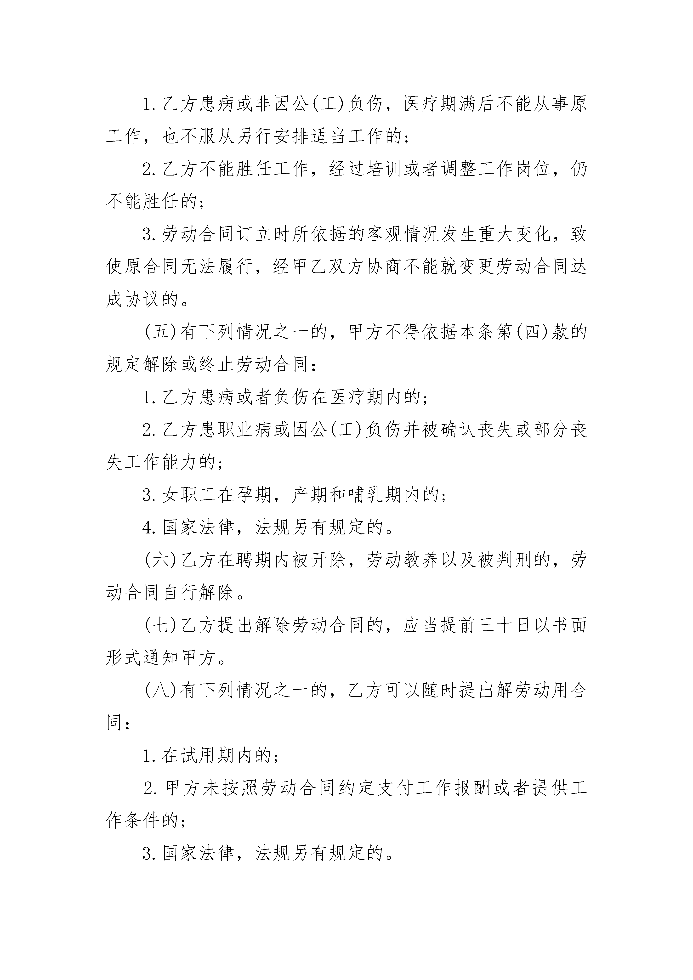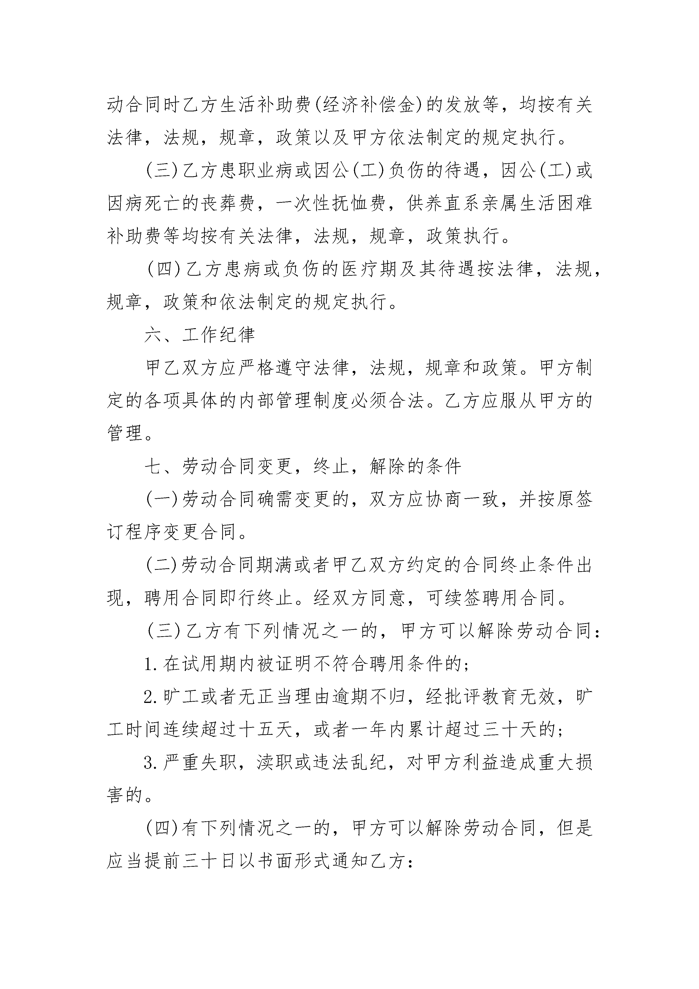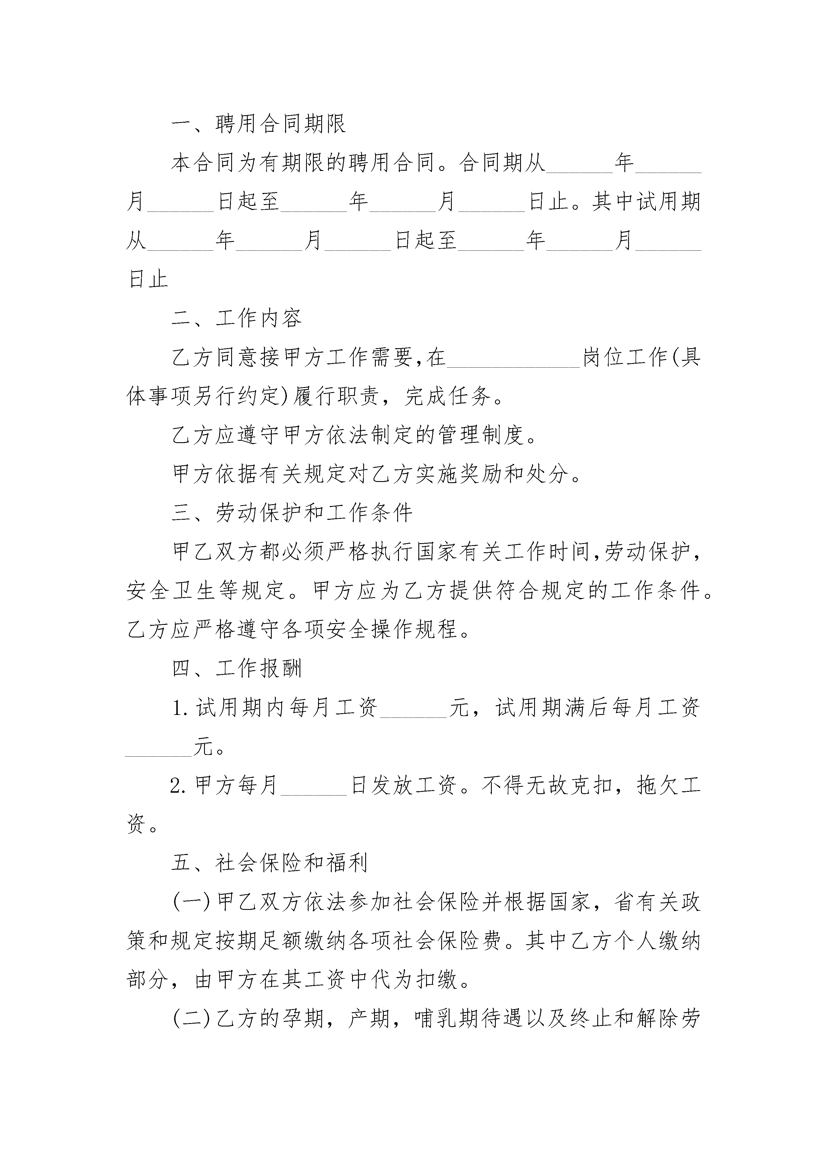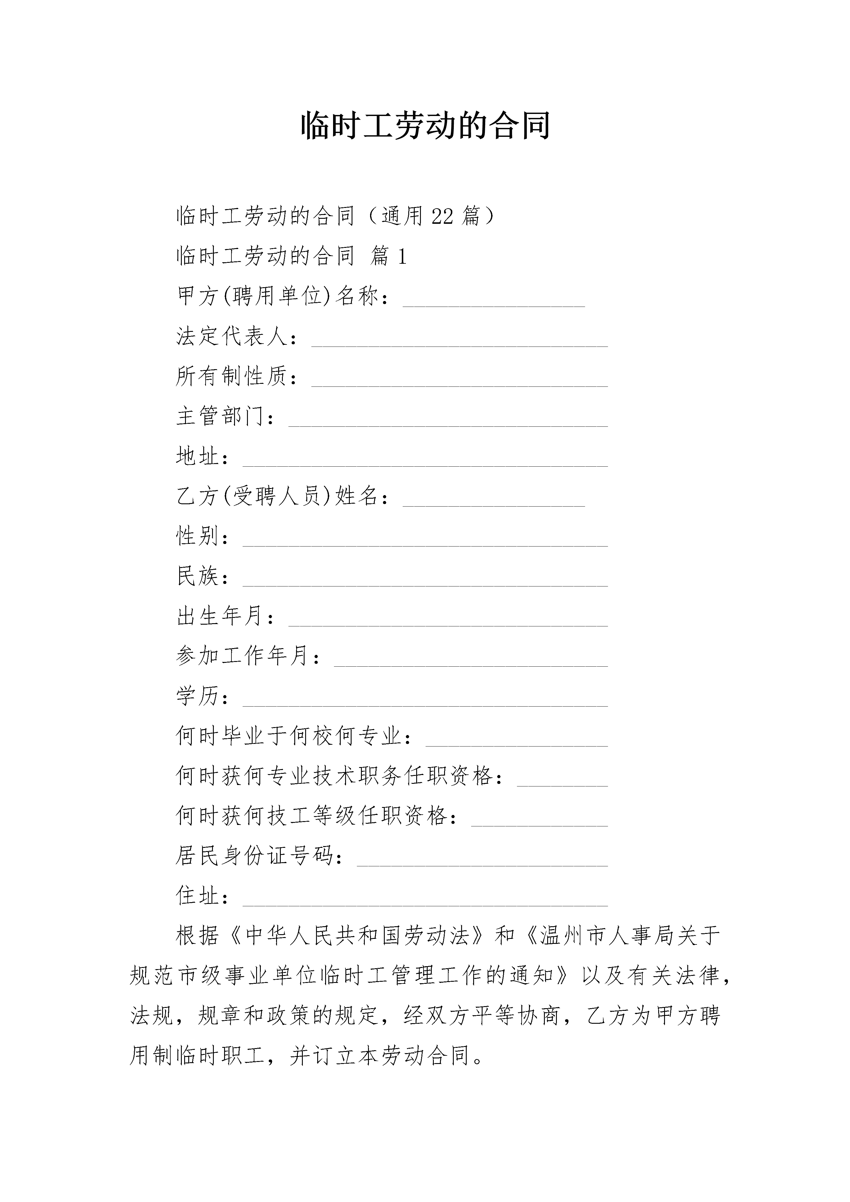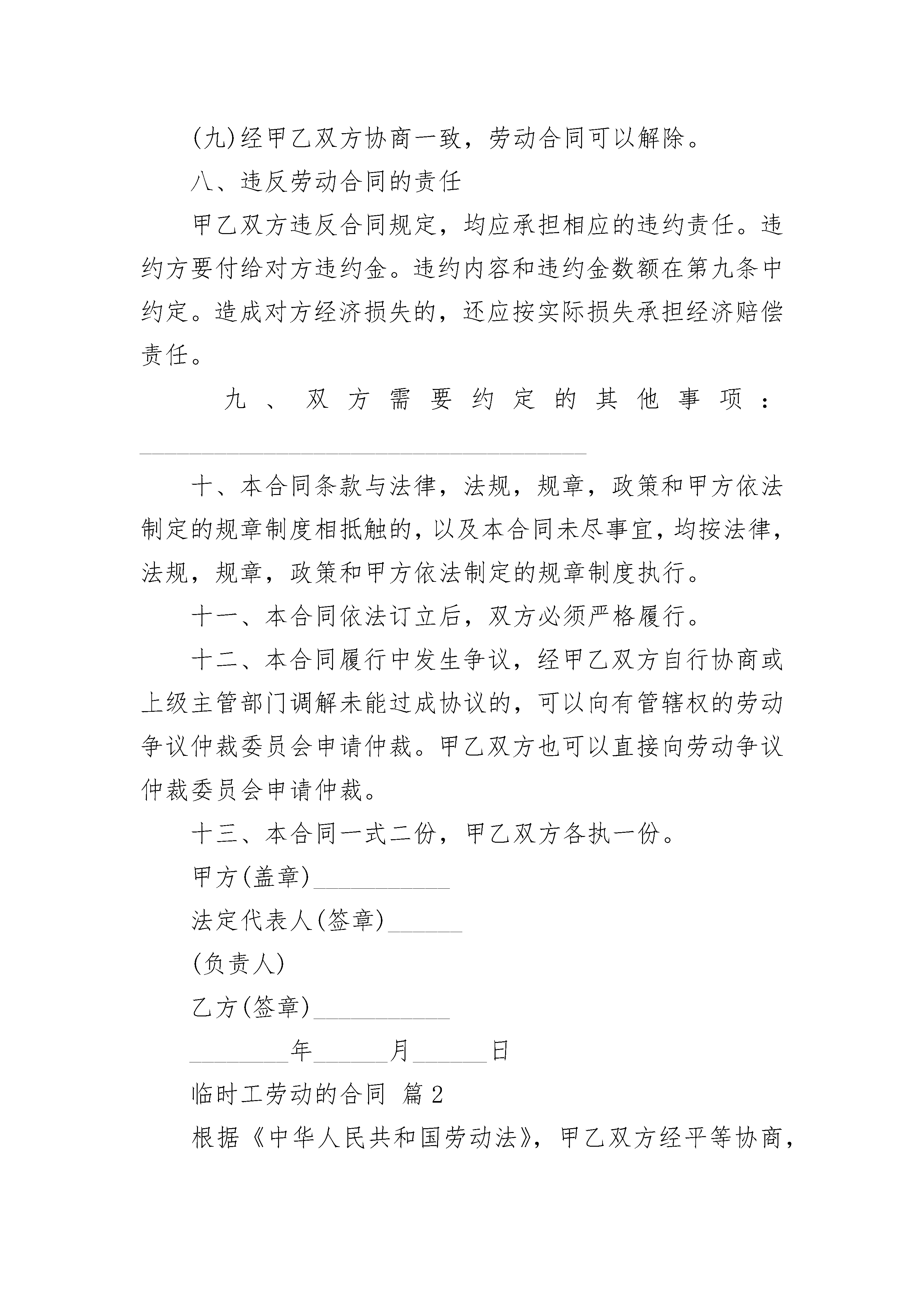 临时工劳动的合同临时工劳动的合同(通用22篇)临时工劳动的合同篇1甲方(聘用单位)名称:________________法定代表人:__________________________所有制性质:__________________________主管部门:____________________________地址:________________________________乙方(受聘人员)姓名:________________性别:________________________________民族:________________________________出生年月:____________________________参加工作年月:________________________学历:________________________________何时毕业于何校何专业:________________何时获何专业技术职务任职资格:________何时获何技工等级任职资格:____________居民身份证号码:______________________住址:________________________________根据《中华人民共和国劳动法》和《温州市人事局关于规范市级事业单位临时工管理工作的通知》以及有关法律,法规,规章和政策的规定,经双方平等协商,乙方为甲方聘用制临时职工,并订立本劳动合同。一、聘用合同期限本合同为有期限的聘用合同。合同期从______年______月______日起至______年______月______日止。其中试用期从______年______月______日起至______年______月______日止二、工作内容乙方同意接甲方工作需要,在____________岗位工作(具体事项另行约定)履行职责,完成任务。乙方应遵守甲方依法制定的管理制度。甲方依据有关规定对乙方实施奖励和处分。三、劳动保护和工作条件甲乙双方都必须严格执行国家有关工作时间,劳动保护,安全卫生等规定。甲方应为乙方提供符合规定的工作条件。乙方应严格遵守各项安全操作规程。四、工作报酬1.试用期内每月工资______元,试用期满后每月工资______元。2.甲方每月______日发放工资。不得无故克扣,拖欠工资。五、社会保险和福利(一)甲乙双方依法参加社会保险并根据国家,省有关政策和规定按期足额缴纳各项社会保险费。其中乙方个人缴纳部分,由甲方在其工资中代为扣缴。(二)乙方的孕期,产期,哺乳期待遇以及终止和解除劳动合同时乙方生活补助费(经济补偿金)的发放等,均按有关法律,法规,规章,政策以及甲方依法制定的规定执行。(三)乙方患职业病或因公(工)负伤的待遇,因公(工)或因病死亡的丧葬费,一次性抚恤费,供养直系亲属生活困难补助费等均按有关法律,法规,规章,政策执行。(四)乙方患病或负伤的医疗期及其待遇按法律,法规,规章,政策和依法制定的规定执行。六、工作纪律甲乙双方应严格遵守法律,法规,规章和政策。甲方制定的各项具体的内部管理制度必须合法。乙方应服从甲方的管理。七、劳动合同变更,终止,解除的条件(一)劳动合同确需变更的,双方应协商一致,并按原签订程序变更合同。(二)劳动合同期满或者甲乙双方约定的合同终止条件出现,聘用合同即行终止。经双方同意,可续签聘用合同。(三)乙方有下列情况之一的,甲方可以解除劳动合同:1.在试用期内被证明不符合聘用条件的;2.旷工或者无正当理由逾期不归,经批评教育无效,旷工时间连续超过十五天,或者一年内累计超过三十天的;3.严重失职,渎职或违法乱纪,对甲方利益造成重大损害的。(四)有下列情况之一的,甲方可以解除劳动合同,但是应当提前三十日以书面形式通知乙方:1.乙方患病或非因公(工)负伤,医疗期满后不能从事原工作,也不服从另行安排适当工作的;2.乙方不能胜任工作,经过培训或者调整工作岗位,仍不能胜任的;3.劳动合同订立时所依据的客观情况发生重大变化,致使原合同无法履行,经甲乙双方协商不能就变更劳动合同达成协议的。(五)有下列情况之一的,甲方不得依据本条第(四)款的规定解除或终止劳动合同:1.乙方患病或者负伤在医疗期内的;2.乙方患职业病或因公(工)负伤并被确认丧失或部分丧失工作能力的;3.女职工在孕期,产期和哺乳期内的;4.国家法律,法规另有规定的。(六)乙方在聘期内被开除,劳动教养以及被判刑的,劳动合同自行解除。(七)乙方提出解除劳动合同的,应当提前三十日以书面形式通知甲方。(八)有下列情况之一的,乙方可以随时提出解劳动用合同:1.在试用期内的;2.甲方未按照劳动合同约定支付工作报酬或者提供工作条件的;3.国家法律,法规另有规定的。(九)经甲乙双方协商一致,劳动合同可以解除。八、违反劳动