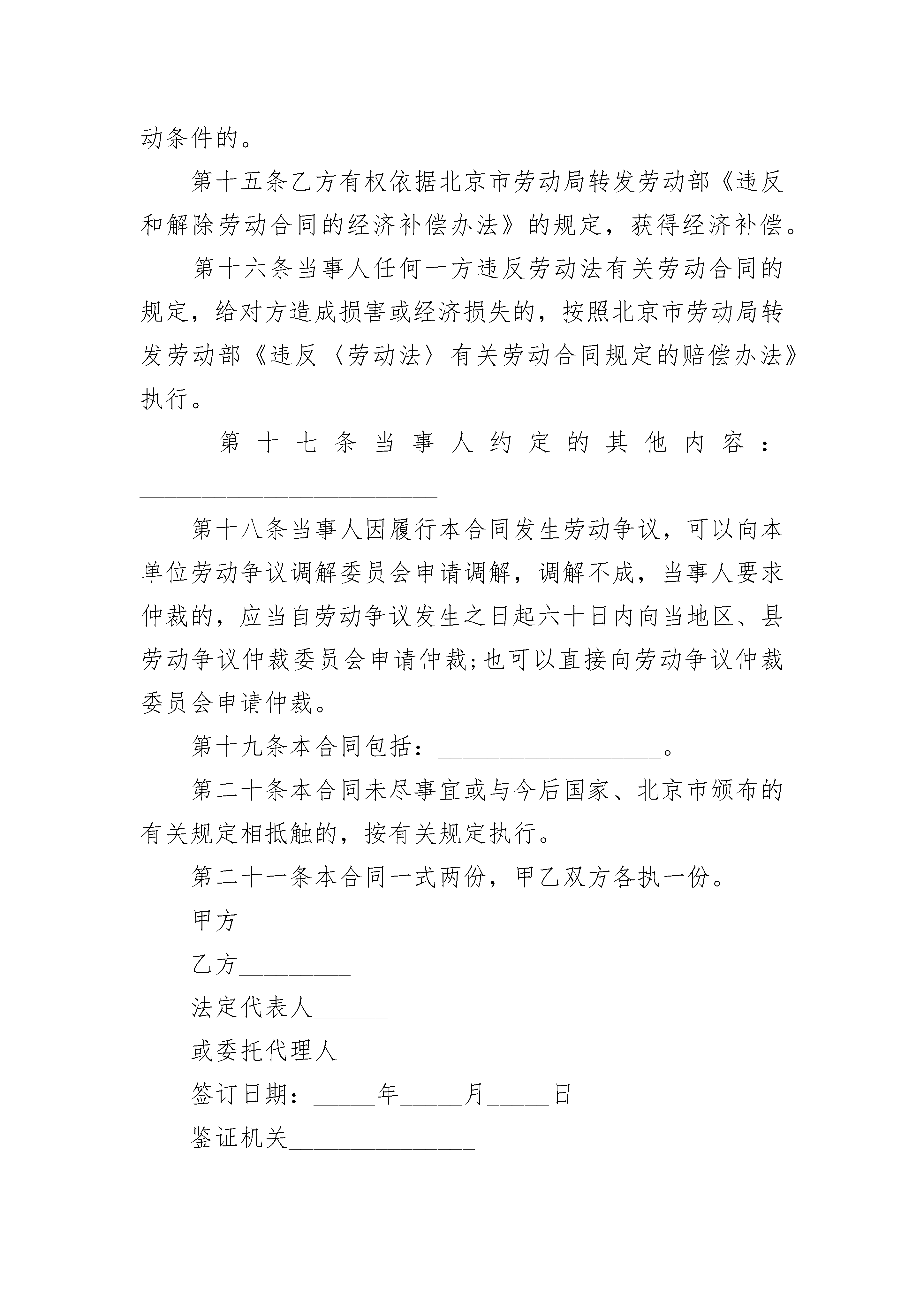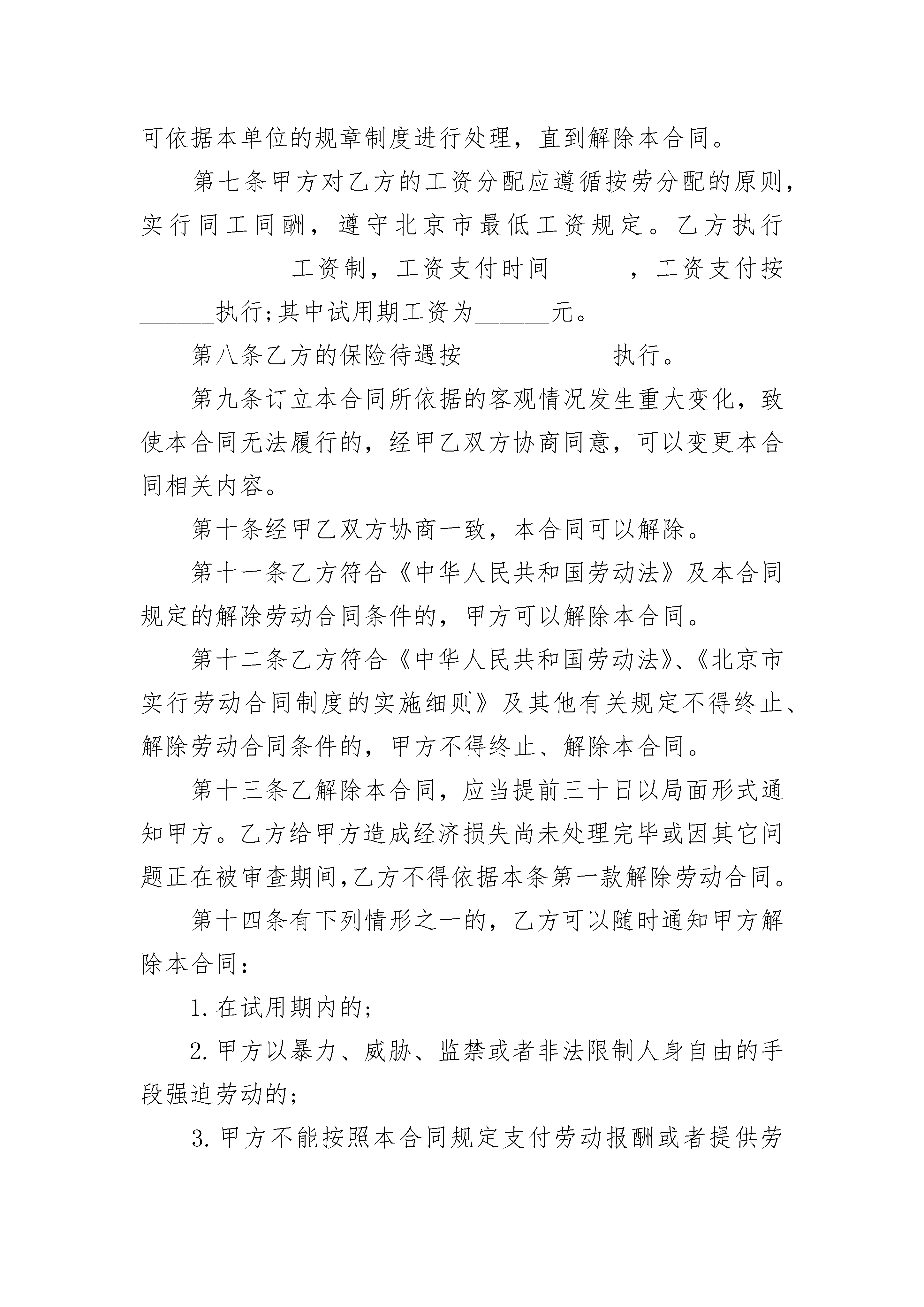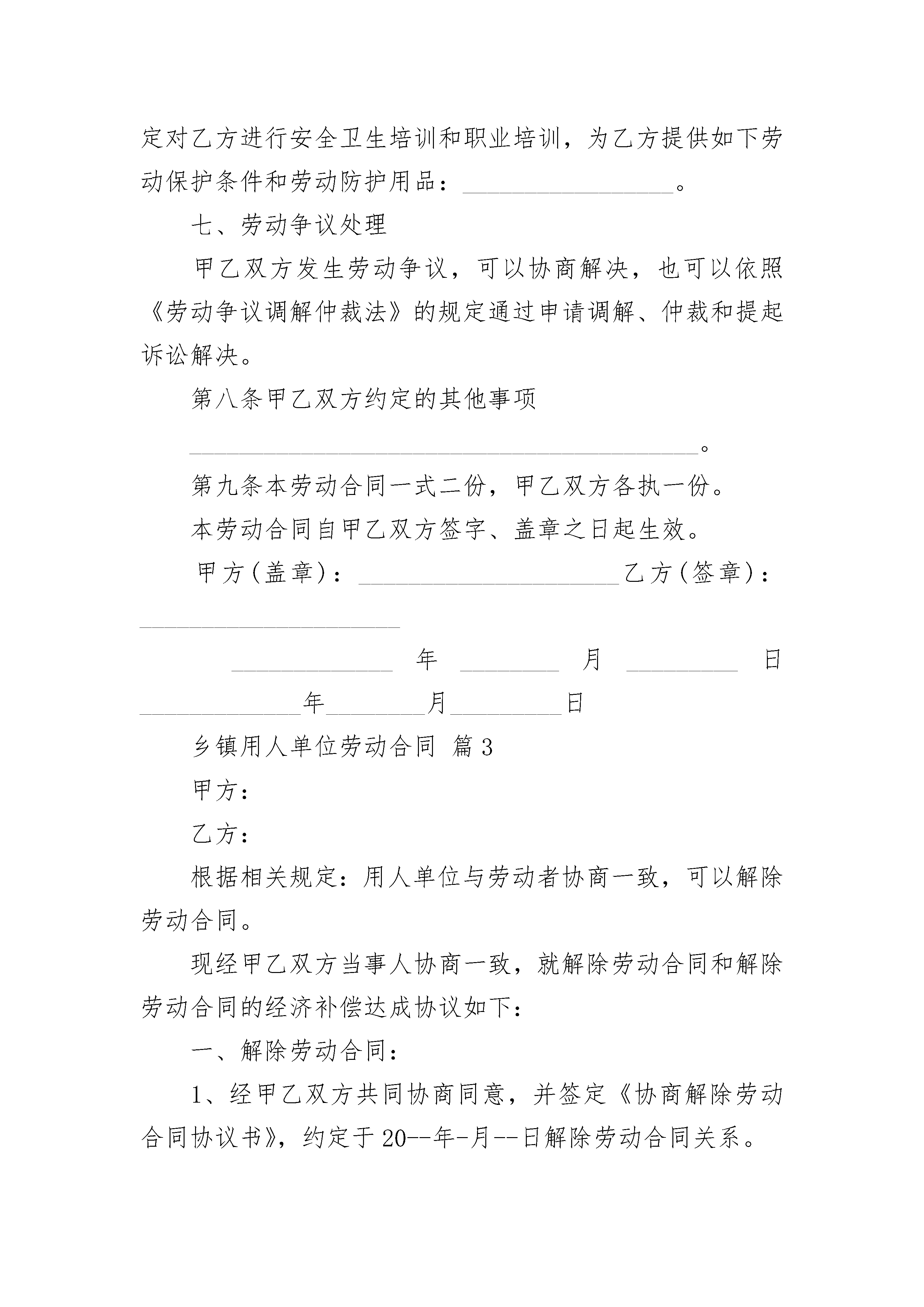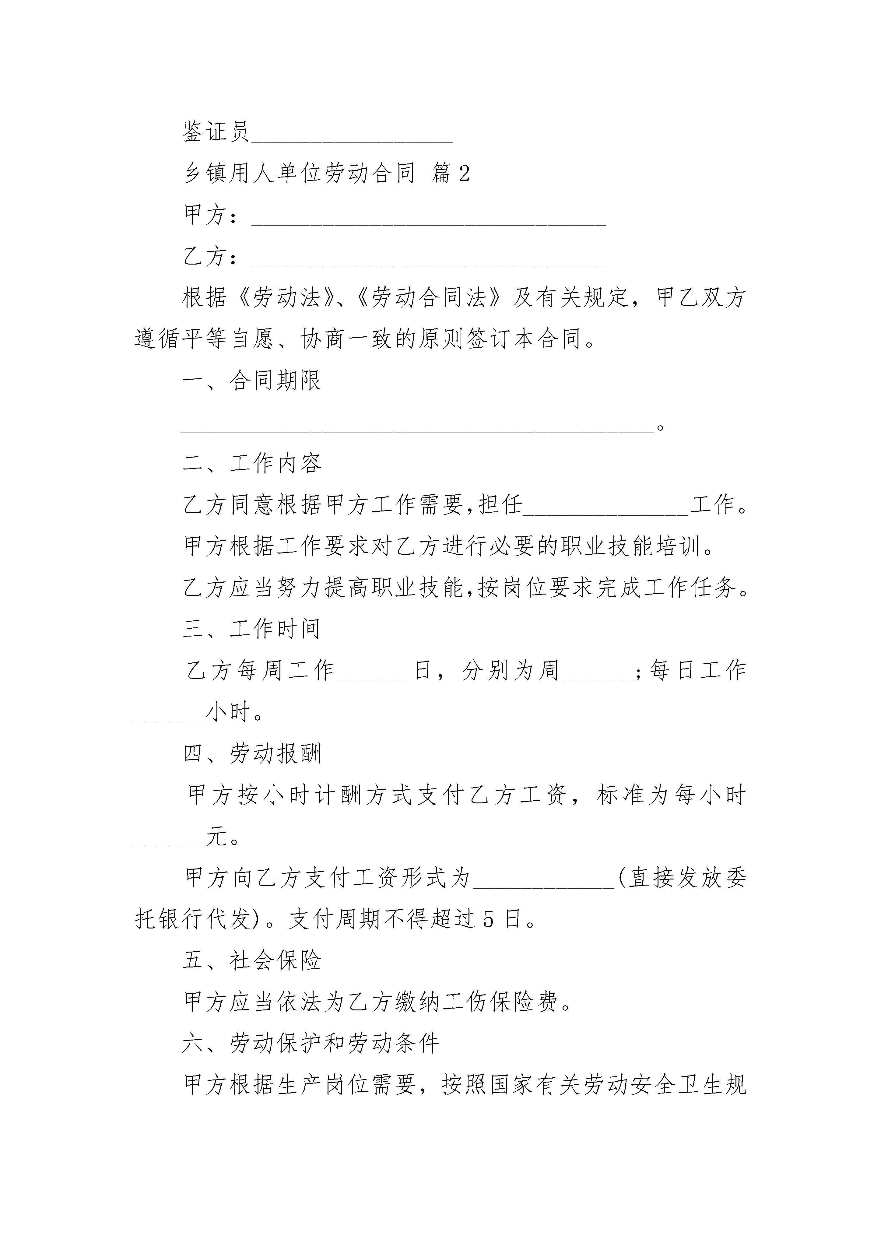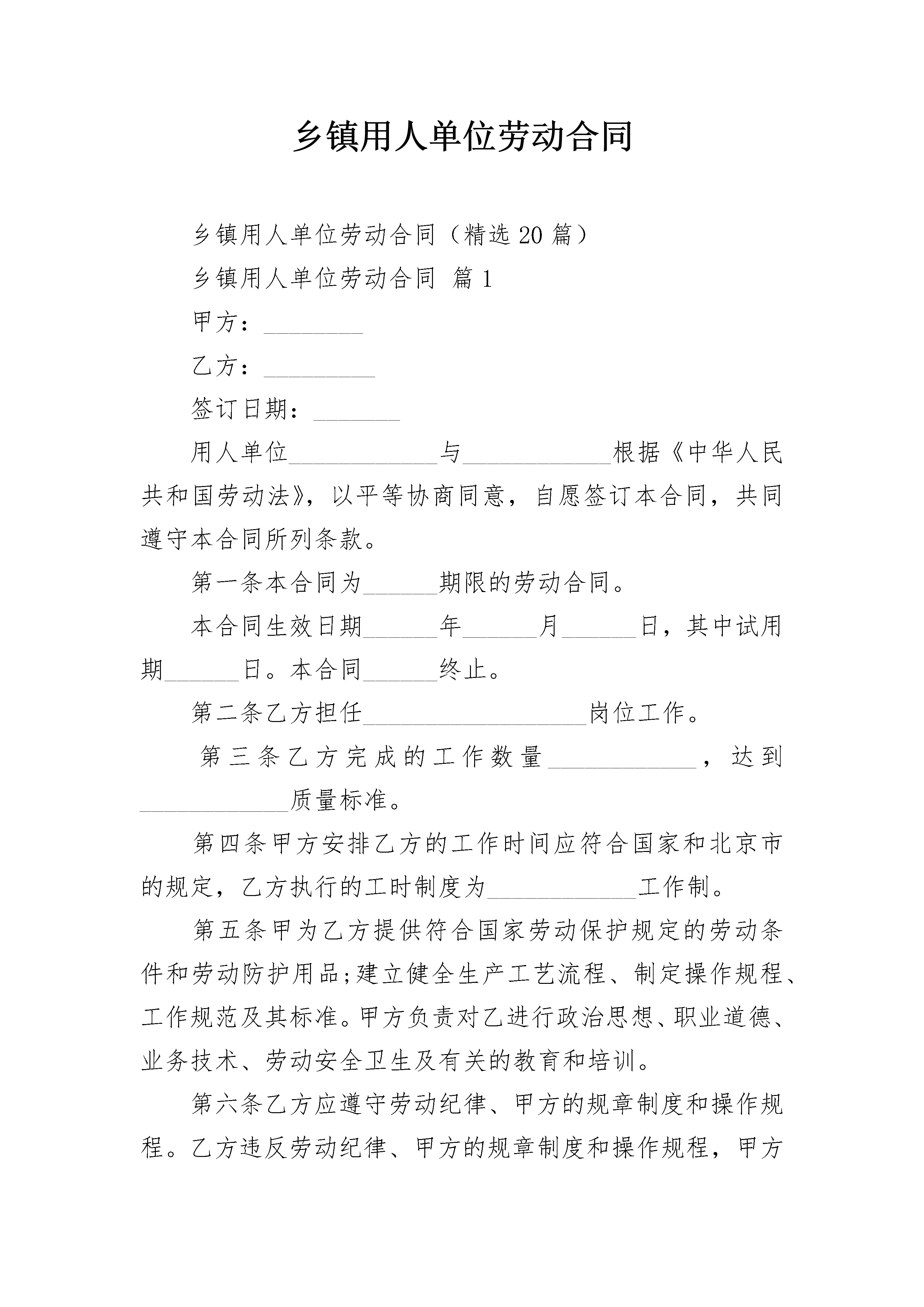 乡镇用人单位劳动合同乡镇用人单位劳动合同(精选20篇)乡镇用人单位劳动合同篇1甲方:________乙方:_________签订日期:_______用人单位____________与____________根据《中华人民共和国劳动法》,以平等协商同意,自愿签订本合同,共同遵守本合同所列条款。第一条本合同为______期限的劳动合同。本合同生效日期______年______月______日,其中试用期______日。本合同______终止。第二条乙方担任__________________岗位工作。第三条乙方完成的工作数量____________,达到____________质量标准。第四条甲方安排乙方的工作时间应符合国家和北京市的规定,乙方执行的工时制度为____________工作制。第五条甲为乙方提供符合国家劳动保护规定的劳动条件和劳动防护用品;建立健全生产工艺流程、制定操作规程、工作规范及其标准。甲方负责对乙进行政治思想、职业道德、业务技术、劳动安全卫生及有关的教育和培训。第六条乙方应遵守劳动纪律、甲方的规章制度和操作规程。乙方违反劳动纪律、甲方的规章制度和操作规程,甲方可依据本单位的规章制度进行处理,直到解除本合同。第七条甲方对乙方的工资分配应遵循按劳分配的原则,实行同工同酬,遵守北京市最低工资规定。乙方执行____________工资制,工资支付时间______,工资支付按______执行;其中试用期工资为______元。第八条乙方的保险待遇按____________执行。第九条订立本合同所依据的客观情况发生重大变化,致使本合同无法履行的,经甲乙双方协商同意,可以变更本合同相关内容。第十条经甲乙双方协商一致,本合同可以解除。第十一条乙方符合《中华人民共和国劳动法》及本合同规定的解除劳动合同条件的,甲方可以解除本合同。第十二条乙方符合《中华人民共和国劳动法》、《北京市实行劳动合同制度的实施细则》及其他有关规定不得终止、解除劳动合同条件的,甲方不得终止、解除本合同。第十三条乙解除本合同,应当提前三十日以局面形式通知甲方。乙方给甲方造成经济损失尚未处理完毕或因其它问题正在被审查期间,乙方不得依据本条第一款解除劳动合同。第十四条有下列情形之一的,乙方可以随时通知甲方解除本合同:1.在试用期内的;2.甲方以暴力、威胁、监禁或者非法限制人身自由的手段强迫劳动的;3.甲方不能按照本合同规定支付劳动报酬或者提供劳动条件的。第十五条乙方有权依据北京市劳动局转发劳动部《违反和解除劳动合同的经济补偿办法》的规定,获得经济补偿。第十六条当事人任何一方违反劳动法有关劳动合同的规定,给对方造成损害或经济损失的,按照北京市劳动局转发劳动部《违反〈劳动法〉有关劳动合同规定的赔偿办法》执行。第十七条当事人约定的其他内容:________________________第十八条当事人因履行本合同发生劳动争议,可以向本单位劳动争议调解委员会申请调解,调解不成,当事人要求仲裁的,应当自劳动争议发生之日起六十日内向当地区、县劳动争议仲裁委员会申请仲裁;也可以直接向劳动争议仲裁委员会申请仲裁。第十九条本合同包括:__________________。第二十条本合同未尽事宜或与今后国家、北京市颁布的有关规定相抵触的,按有关规定执行。第二十一条本合同一式两份,甲乙双方各执一份。甲方____________乙方_________法定代表人______或委托代理人签订日期:_____年_____月_____日鉴证机关_______________鉴证员_________________乡镇用人单位劳动合同篇2甲方:______________________________乙方:______________________________根据《劳动法》、《劳动合同法》及有关规定,甲乙双方遵循平等自愿、协商一致的原则签订本合同。一、合同期限________________________________________。二、工作内容乙方同意根据甲方工作需要,担任______________工作。甲方根据工作要求对乙方进行必要的职业技能培训。乙方应当努力提高职业技能,按岗位要求完成工作任务。三、工作时间乙方每周工作______日,分别为周______;每日工作______小时。四、劳动报酬甲方按小时计酬方式支付乙方工资,标准为每小时______元。甲方向乙方支付工资形式为____________(直接发放委托银行代发)。支付周期不得超过5日。五、社会保险甲方应当依法为乙方缴纳工伤保险费。六、劳动保护和劳动条件甲方根据生产岗位需要,按照国家有关劳动安全卫生规定对乙方进行安全卫生培训和职业培训,为乙方提供如下劳动保护条件和劳动防护用品:_________________。