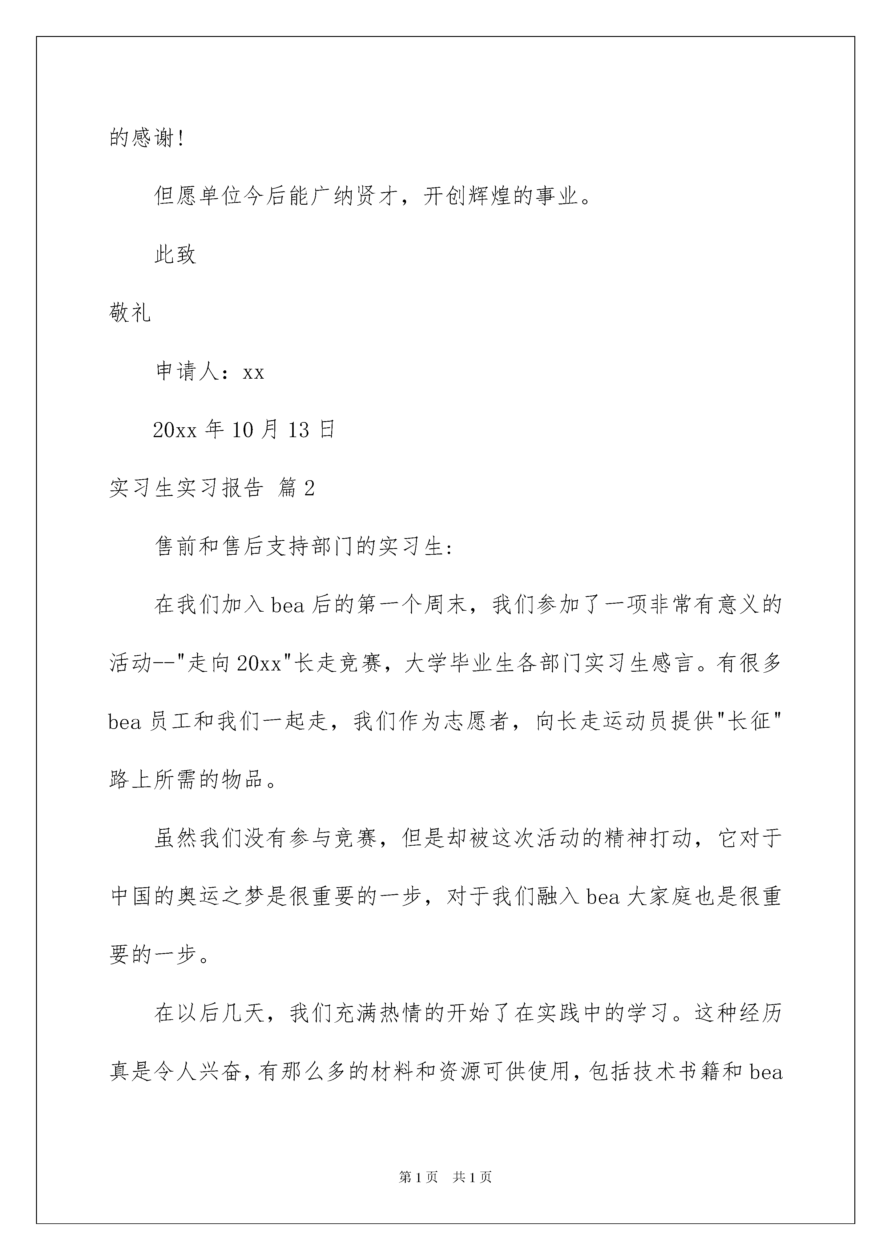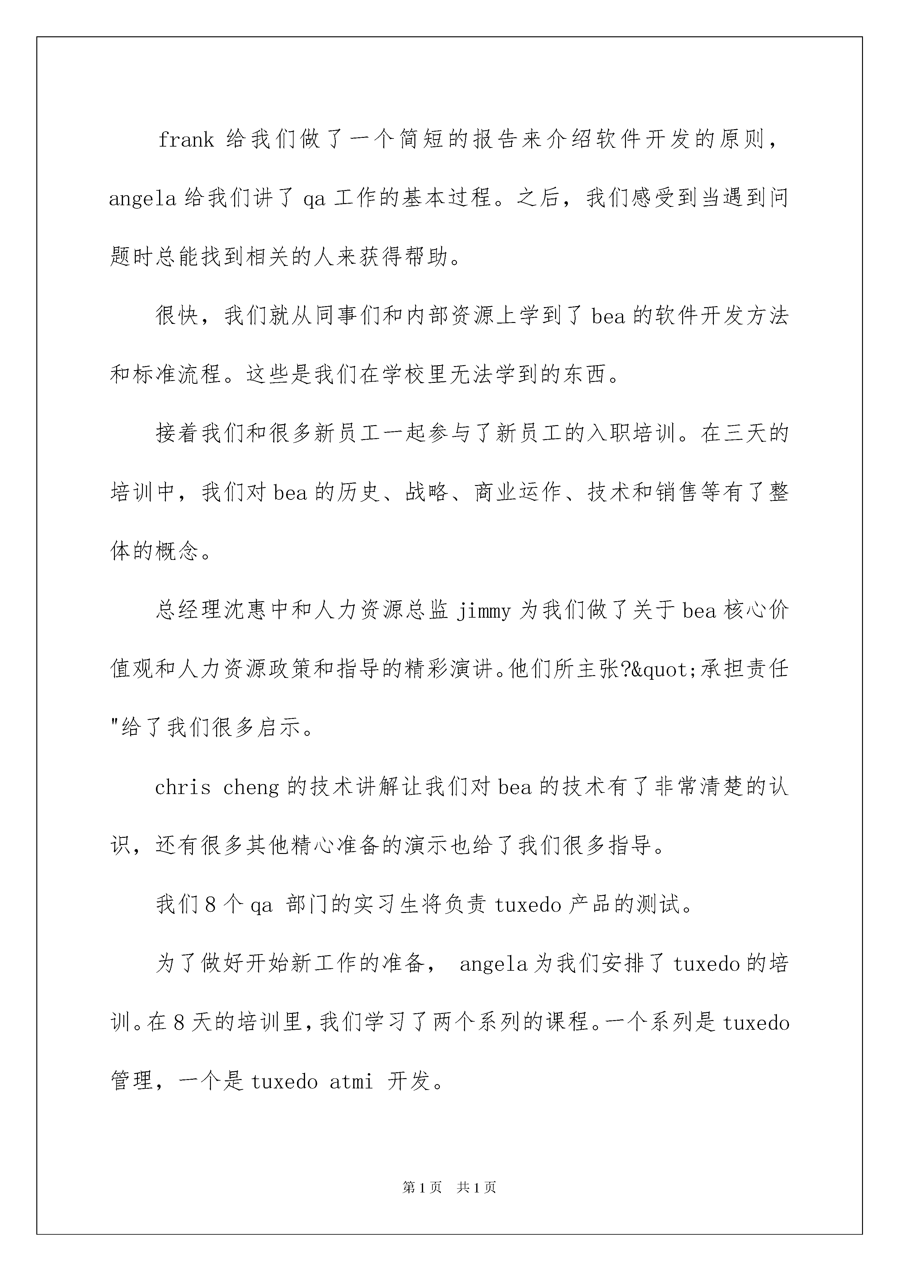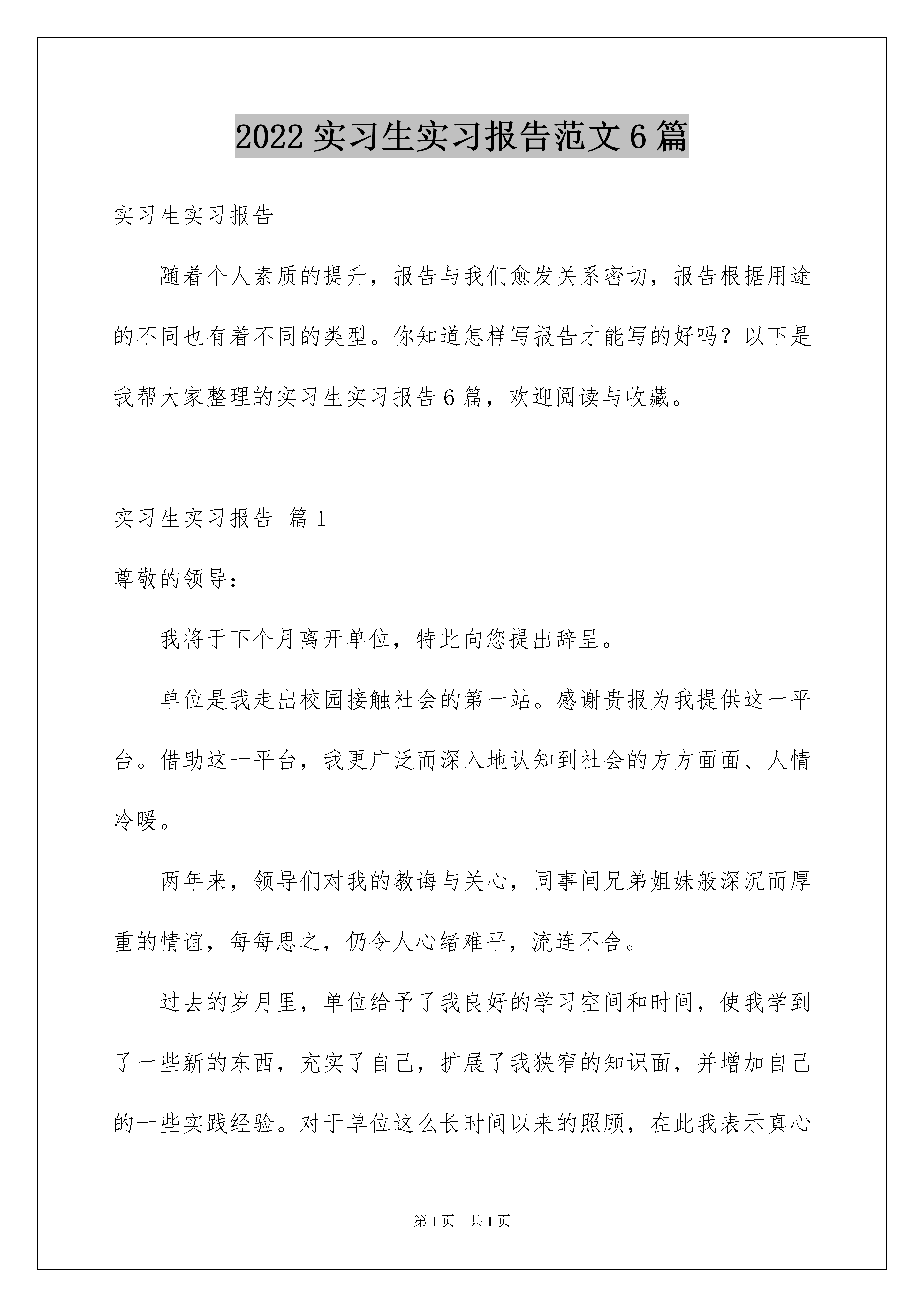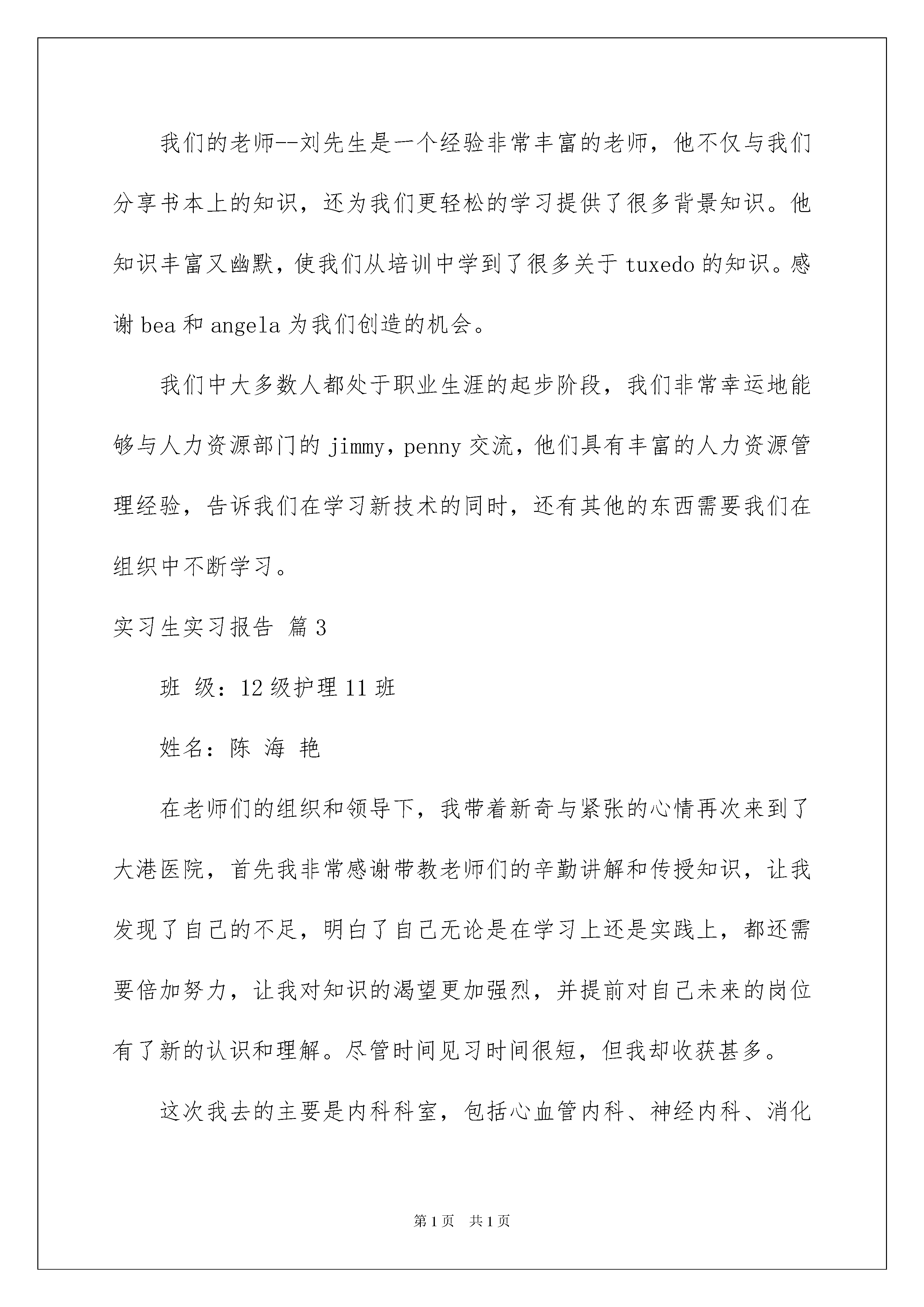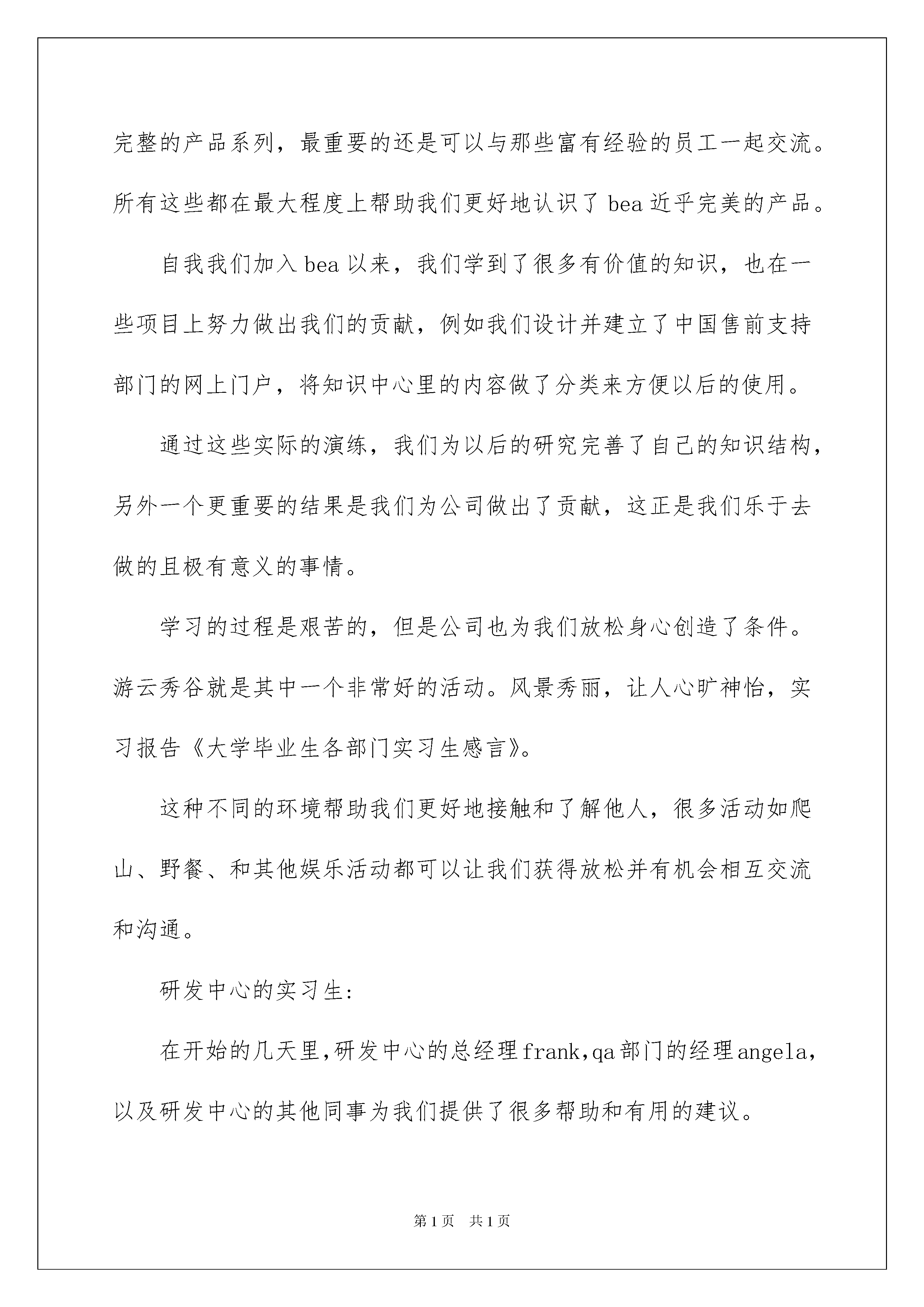 2022实习生实习报告范文6篇实习生实习报告随着个人素质的提升,报告与我们愈发关系密切,报告根据用途的不同也有着不同的类型。你知道怎样写报告才能写的好吗?以下是我帮大家整理的实习生实习报告6篇,欢迎阅读与收藏。实习生实习报告篇1尊敬的领导:我将于下个月离开单位,特此向您提出辞呈。单位是我走出校园接触社会的第一站。感谢贵报为我提供这一平台。借助这一平台,我更广泛而深入地认知到社会的方方面面、人情冷暖。两年来,领导们对我的教诲与关心,同事间兄弟姐妹般深沉而厚重的情谊,每每思之,仍令人心绪难平,流连不舍。过去的岁月里,单位给予了我良好的学习空间和时间,使我学到了一些新的东西,充实了自己,扩展了我狭窄的知识面,并增加自己的一些实践经验。对于单位这么长时间以来的照顾,在此我表示真心的感谢!但愿单位今后能广纳贤才,开创辉煌的事业。此致敬礼申请人:xx20xx年10月13日实习生实习报告篇2售前和售后支持部门的实习生:在我们加入bea后的第一个周末,我们参加了一项非常有意义的活动--"走向20xx"长走竞赛,大学毕业生各部门实习生感言。有很多bea员工和我们一起走,我们作为志愿者,向长走运动员提供"长征"路上所需的物品。虽然我们没有参与竞赛,但是却被这次活动的精神打动,它对于中国的奥运之梦是很重要的一步,对于我们融入bea大家庭也是很重要的一步。在以后几天,我们充满热情的开始了在实践中的学习。这种经历真是令人兴奋,有那么多的材料和资源可供使用,包括技术书籍和bea完整的产品系列,最重要的还是可以与那些富有经验的员工一起交流。所有这些都在最大程度上帮助我们更好地认识了bea近乎完美的产品。自我我们加入bea以来,我们学到了很多有价值的知识,也在一些项目上努力做出我们的贡献,例如我们设计并建立了中国售前支持部门的网上门户,将知识中心里的内容做了分类来方便以后的使用。通过这些实际的演练,我们为以后的研究完善了自己的知识结构,另外一个更重要的结果是我们为公司做出了贡献,这正是我们乐于去做的且极有意义的事情。学习的过程是艰苦的,但是公司也为我们放松身心创造了条件。游云秀谷就是其中一个非常好的活动。风景秀丽,让人心旷神怡,实习报告《大学毕业生各部门实习生感言》。这种不同的环境帮助我们更好地接触和了解他人,很多活动如爬山、野餐、和其他娱乐活动都可以让我们获得放松并有机会相互交流和沟通。研发中心的实习生:在开始的几天里,研发中心的总经理frank,qa部门的经理angela,以及研发中心的其他同事为我们提供了很多帮助和有用的建议。frank给我们做了一个简短的报告来介绍软件开发的原则,angela给我们讲了qa工作的基本过程。之后,我们感受到当遇到问题时总能找到相关的人来获得帮助。很快,我们就从同事们和内部资源上学到了bea的软件开发方法和标准流程。这些是我们在学校里无法学到的东西。接着我们和很多新员工一起参与了新员工的入职培训。在三天的培训中,我们对bea的历史、战略、商业运作、技术和销售等有了整体的概念。总经理沈惠中和人力资源总监jimmy为我们做了关于bea核心价值观和人力资源政策和指导的精彩演讲。他们所主张?"承担责任"给了我们很多启示。chrischeng的技术讲解让我们对bea的技术有了非常清楚的认识,还有很多其他精心准备的演示也给了我们很多指导。我们8个qa部门的实习生将负责tuxedo产品的测试。为了做好开始新工作的准备,angela为我们安排了tuxedo的培训。在8天的培训里,我们学习了两个系列的课程。一个系列是tuxedo管理,一个是tuxedoatmi开发。我们的老师--刘先生是一个经验非常丰富的老师,他不仅与我们分享书本上的知识,还为我们更轻松的学习提供了很多背景知识。他知识丰富又幽默,使我们从培训中学到了很多关于tuxedo的知识。感谢bea和angela为我们创造的机会。我们中大多数人都处于职业生涯的起步阶段,我们非常幸运地能够与人力资源部门的jimmy,penny交流,他们具有丰富的人力资源管理经验,告诉我们在学习新技术的同时,还有其他的东西需要我们在组织中不断学习。实习生实习报告篇3班级:12级护理11班姓名:陈海艳在老师们的组织和领导下,我带着新奇与紧张的心情再次来到了大港医院,首先我非常感谢带教老师们的辛勤讲解和传授知识,让我发现了自己的不足,明白了自己无论是在学习上还是实践上,都还需要倍加努力,让我对知识的渴望更加强烈,并提前对自己未来的岗位有了新的认识和理解。尽管时间见习时间很短,但我却收获甚多。这次我去的主要是内科科室,包括心血管内科、神经内科、消