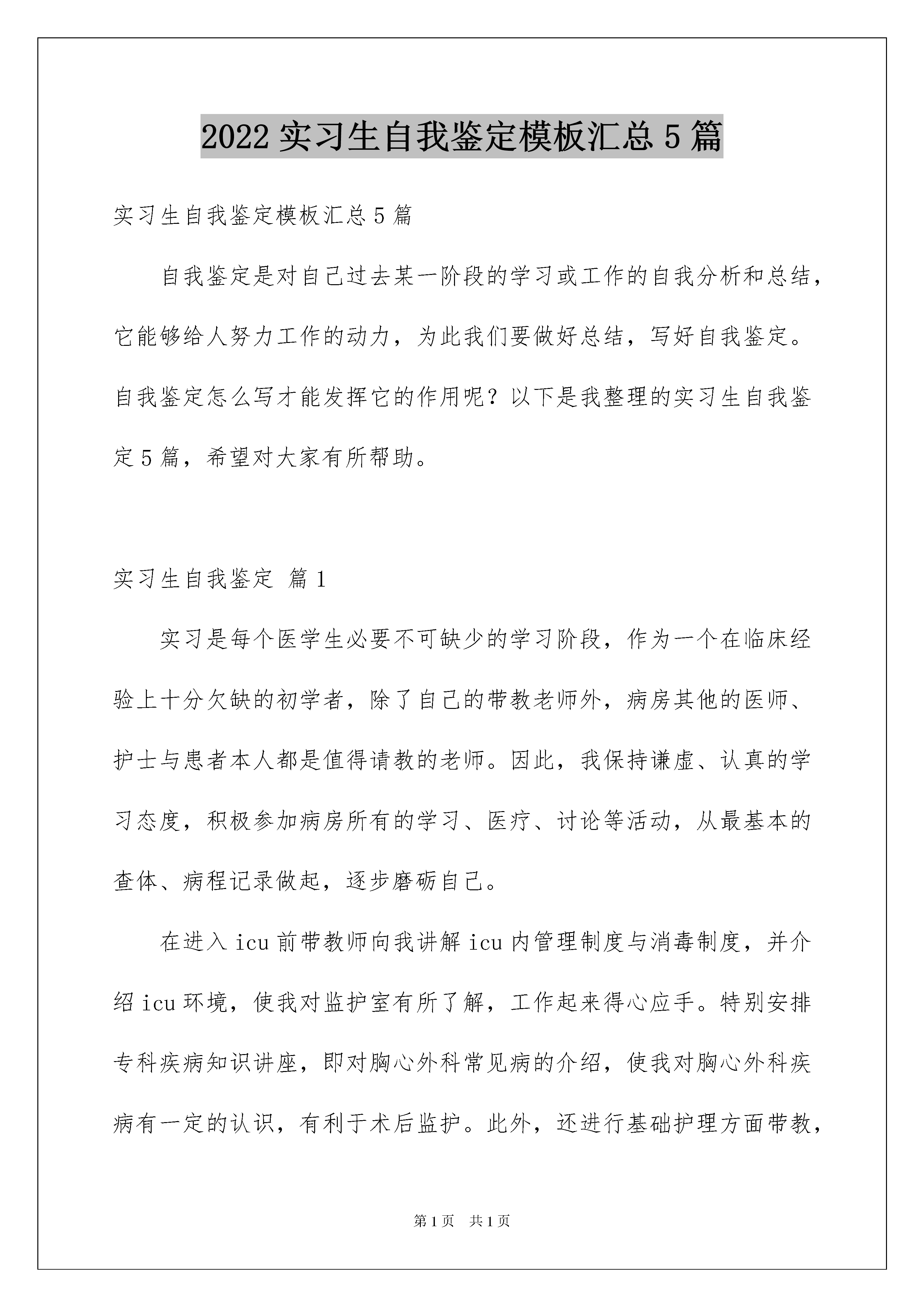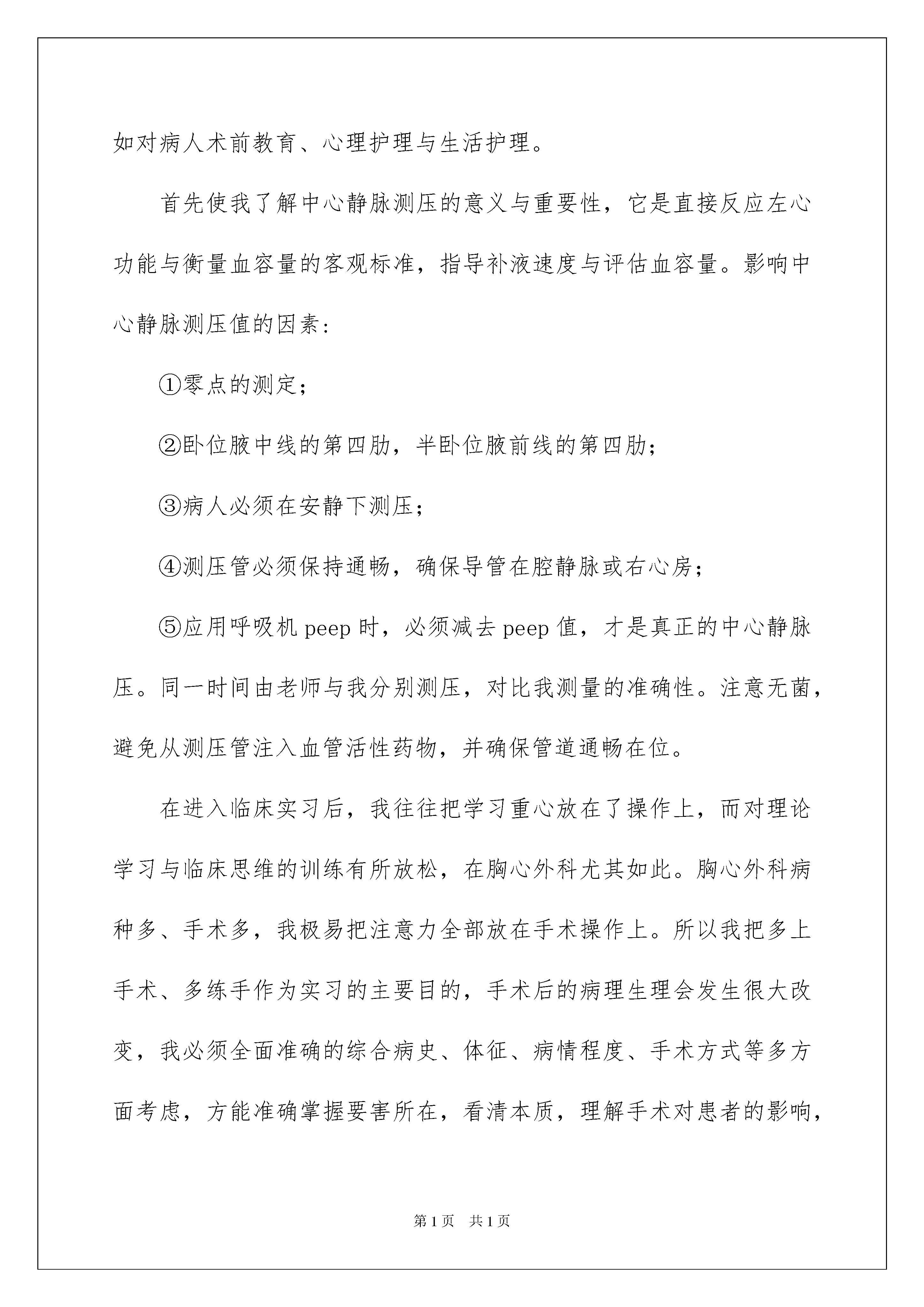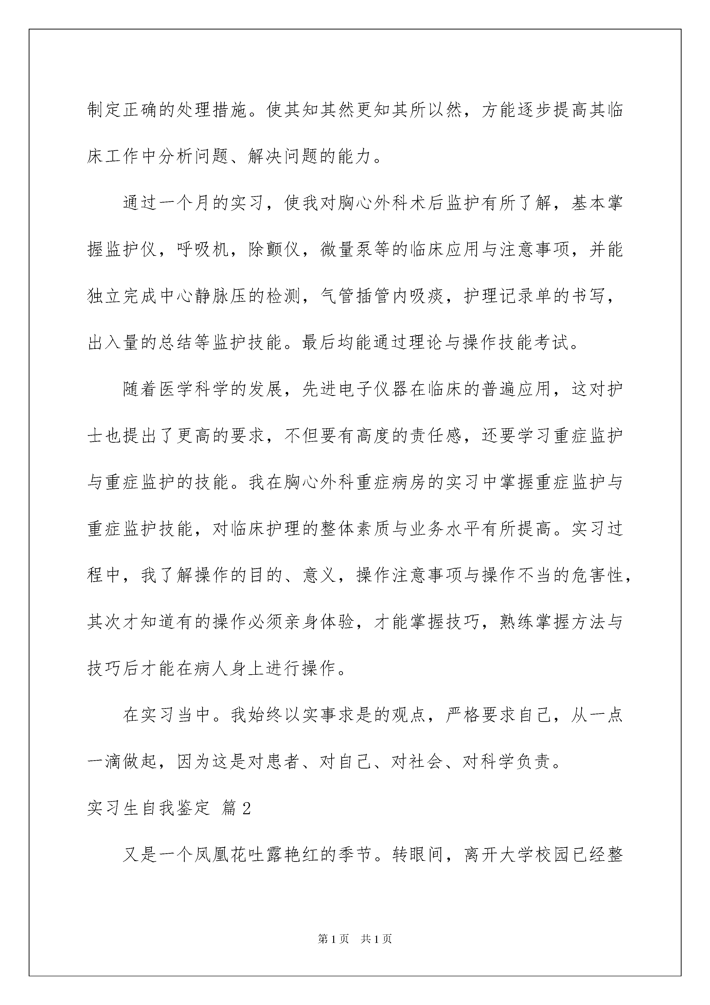 2022实习生自我鉴定模板汇总5篇实习生自我鉴定模板汇总5篇自我鉴定是对自己过去某一阶段的学习或工作的自我分析和总结,它能够给人努力工作的动力,为此我们要做好总结,写好自我鉴定。自我鉴定怎么写才能发挥它的作用呢?以下是我整理的实习生自我鉴定5篇,希望对大家有所帮助。实习生自我鉴定篇1实习是每个医学生必要不可缺少的学习阶段,作为一个在临床经验上十分欠缺的初学者,除了自己的带教老师外,病房其他的医师、护士与患者本人都是值得请教的老师。因此,我保持谦虚、认真的学习态度,积极参加病房所有的学习、医疗、讨论等活动,从最基本的查体、病程记录做起,逐步磨砺自己。在进入icu前带教师向我讲解icu内管理制度与消毒制度,并介绍icu环境,使我对监护室有所了解,工作起来得心应手。特别安排专科疾病知识讲座,即对胸心外科常见病的介绍,使我对胸心外科疾病有一定的认识,有利于术后监护。此外,还进行基础护理方面带教,如对病人术前教育、心理护理与生活护理。首先使我了解中心静脉测压的意义与重要性,它是直接反应左心功能与衡量血容量的客观标准,指导补液速度与评估血容量。影响中心静脉测压值的因素:①零点的测定;②卧位腋中线的第四肋,半卧位腋前线的第四肋;③病人必须在安静下测压;④测压管必须保持通畅,确保导管在腔静脉或右心房;⑤应用呼吸机peep时,必须减去peep值,才是真正的中心静脉压。同一时间由老师与我分别测压,对比我测量的准确性。注意无菌,避免从测压管注入血管活性药物,并确保管道通畅在位。在进入临床实习后,我往往把学习重心放在了操作上,而对理论学习与临床思维的训练有所放松,在胸心外科尤其如此。胸心外科病种多、手术多,我极易把注意力全部放在手术操作上。所以我把多上手术、多练手作为实习的主要目的,手术后的病理生理会发生很大改变,我必须全面准确的综合病史、体征、病情程度、手术方式等多方面考虑,方能准确掌握要害所在,看清本质,理解手术对患者的影响,制定正确的处理措施。使其知其然更知其所以然,方能逐步提高其临床工作中分析问题、解决问题的能力。通过一个月的实习,使我对胸心外科术后监护有所了解,基本掌握监护仪,呼吸机,除颤仪,微量泵等的临床应用与注意事项,并能独立完成中心静脉压的检测,气管插管内吸痰,护理记录单的书写,出入量的总结等监护技能。最后均能通过理论与操作技能考试。随着医学科学的发展,先进电子仪器在临床的普遍应用,这对护士也提出了更高的要求,不但要有高度的责任感,还要学习重症监护与重症监护的技能。我在胸心外科重症病房的实习中掌握重症监护与重症监护技能,对临床护理的整体素质与业务水平有所提高。实习过程中,我了解操作的目的、意义,操作注意事项与操作不当的危害性,其次才知道有的操作必须亲身体验,才能掌握技巧,熟练掌握方法与技巧后才能在病人身上进行操作。在实习当中。我始终以实事求是的观点,严格要求自己,从一点一滴做起,因为这是对患者、对自己、对社会、对科学负责。实习生自我鉴定篇2又是一个凤凰花吐露艳红的季节。转眼间,离开大学校园已经整整一年了,人生列车在不断地疾驰前行,学生时代的点滴记忆就像车窗外的风景,在我的脑海里渐渐模糊远去,迎接我的是一个又一个人生的十字路口。工作一年以来,在各级领导的教导和培养下,在同事们的关心和帮助下,自己的思想、工作、学习等各方面都取得了一定的成绩,个人综合素质也得到了一定的提高,现将本人这一年来的思想、工作、学习情况作简要总结汇报。当然,加强学习仍将是今后工作和生活中的一项主要的内容。不断加强学习,以适应社会发展的需要,不断的提高自己的政治理论素质,以适应社会经济发展的客观要求。四年的大学学习,学到的更多的是专业基础知识再就是一种自学能力,而实践经验、社会经验则十分匮乏。作为一个应届毕业生,初来公司,曾经很担心不知该怎么与人共处,该如何做好工作,但是公司宽松融洽的工作氛围、良好的学习发展机遇,让我很快完成了从学生到职员的转变。能够正确面对挫折,辨证的看待问题。工作中能够始终保持一种积极向上的心态,努力开展工作。过去的一年,是不断学习、不断充实的一年,是积极探索、逐步成长的一年。当然,初入职场,难免经验不足,在业务知识上,与自己本职工作要求还存在有一定的差距。但这些经历也让我不断成熟,在处理各种问题时考虑得更全面,专业技能也得到了加强。在此,我要特别感谢公司领导的悉心栽培以及同事对我的入职指引和帮助,感谢他们对我工作中出现的失误的提醒和指正。我也深知,毕业只是求学的一小步,社会才是一所真正的大学。在今后的工作中,我将努力找准自己的定位,尽自己的所能为公司作出贡献,为公司创造真正的财富,同时也